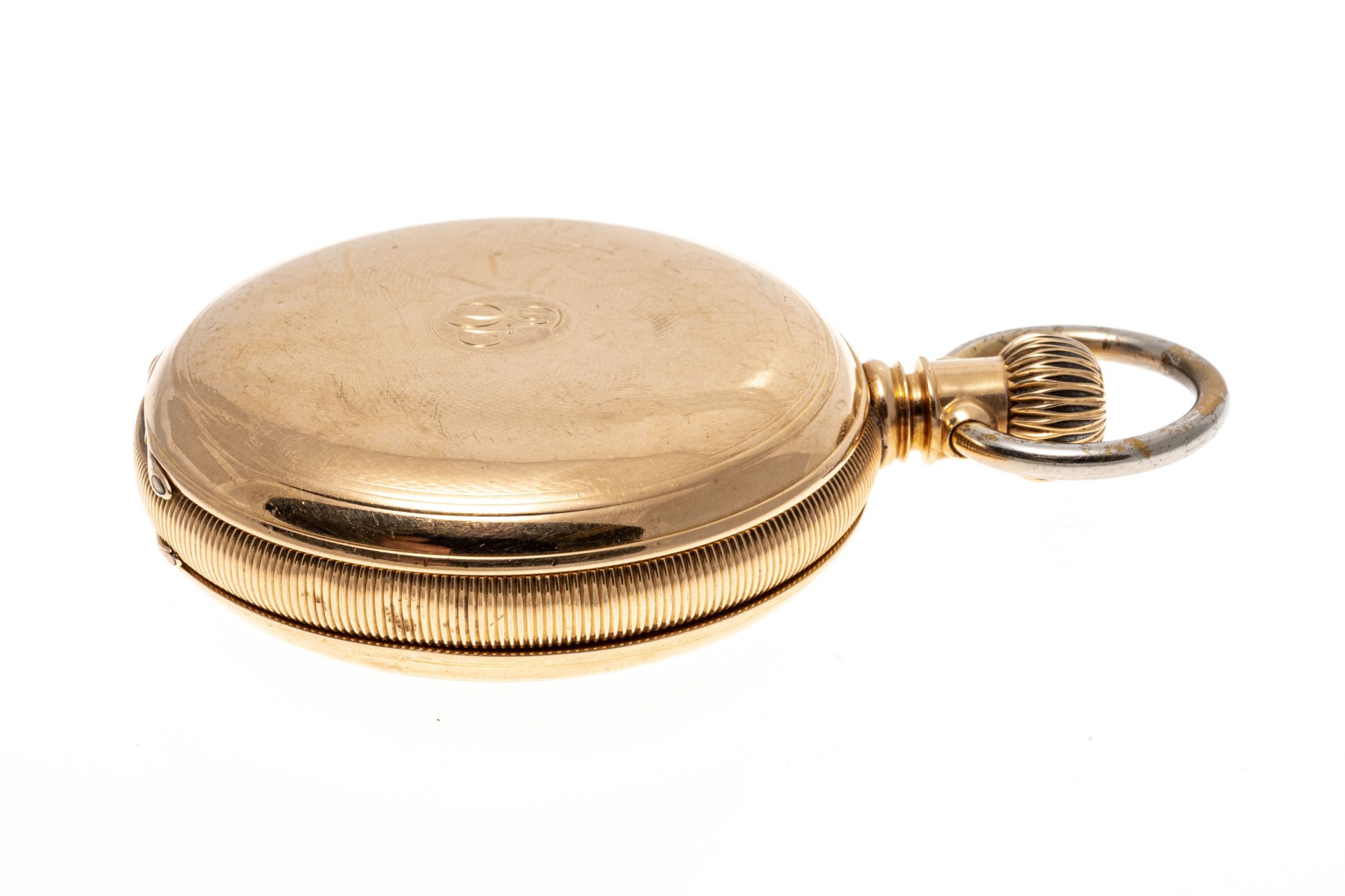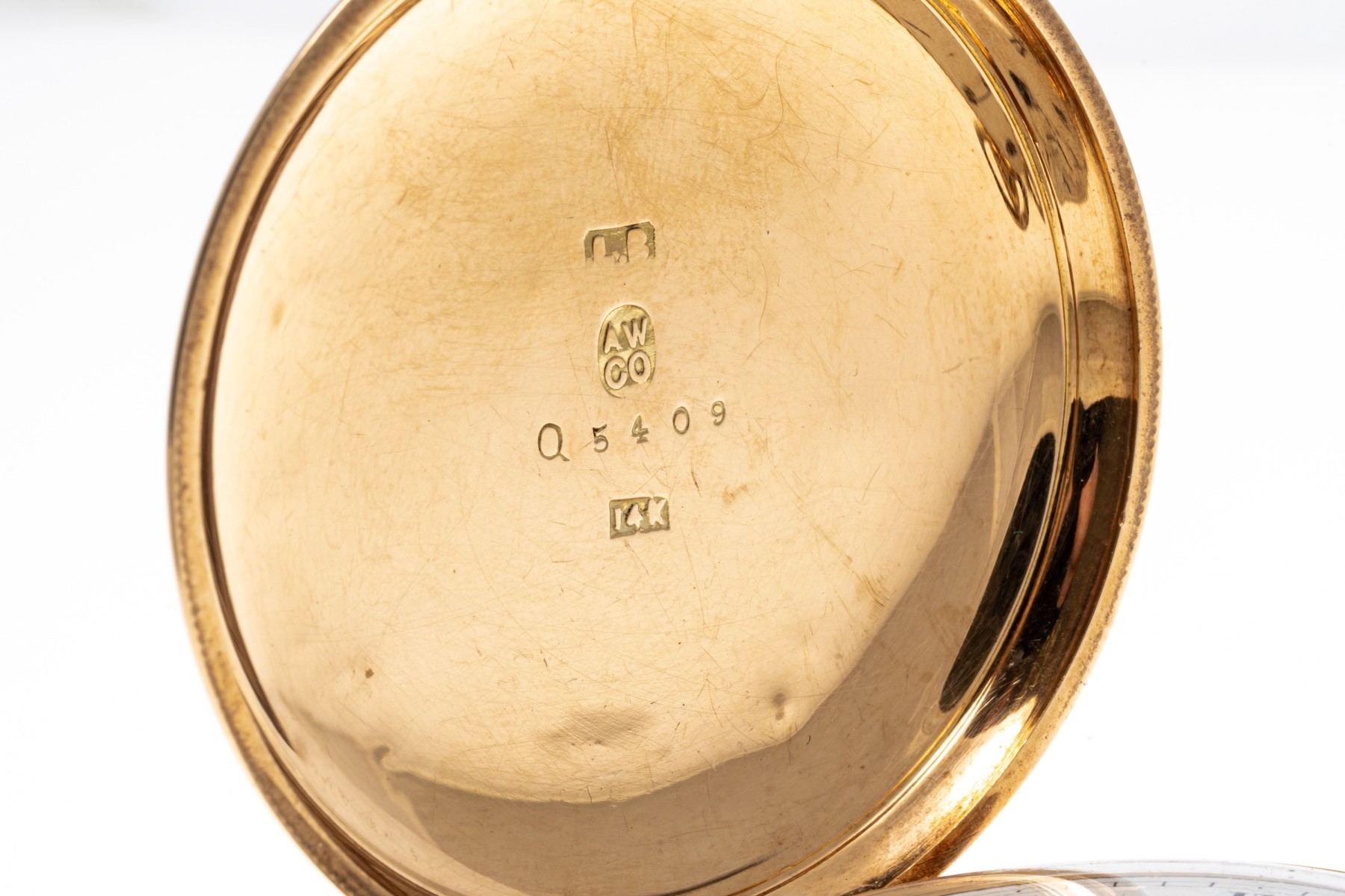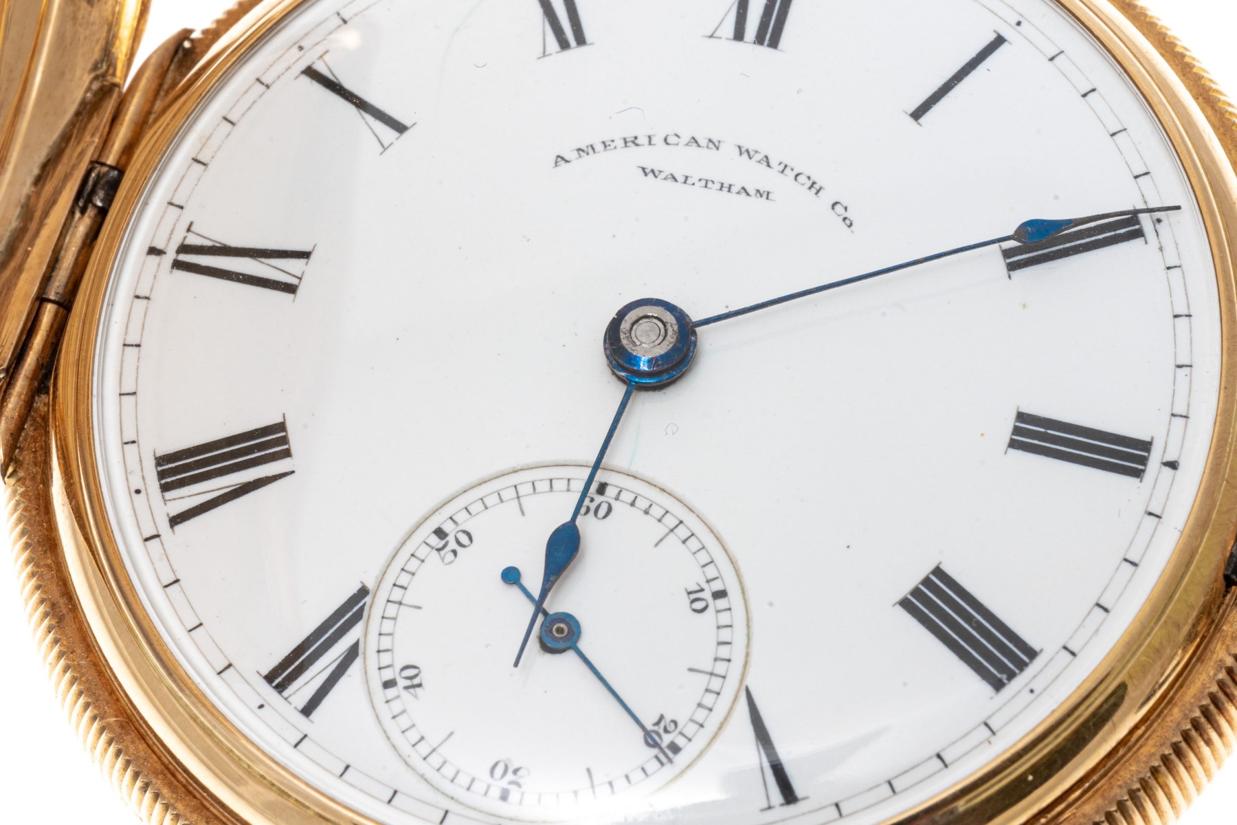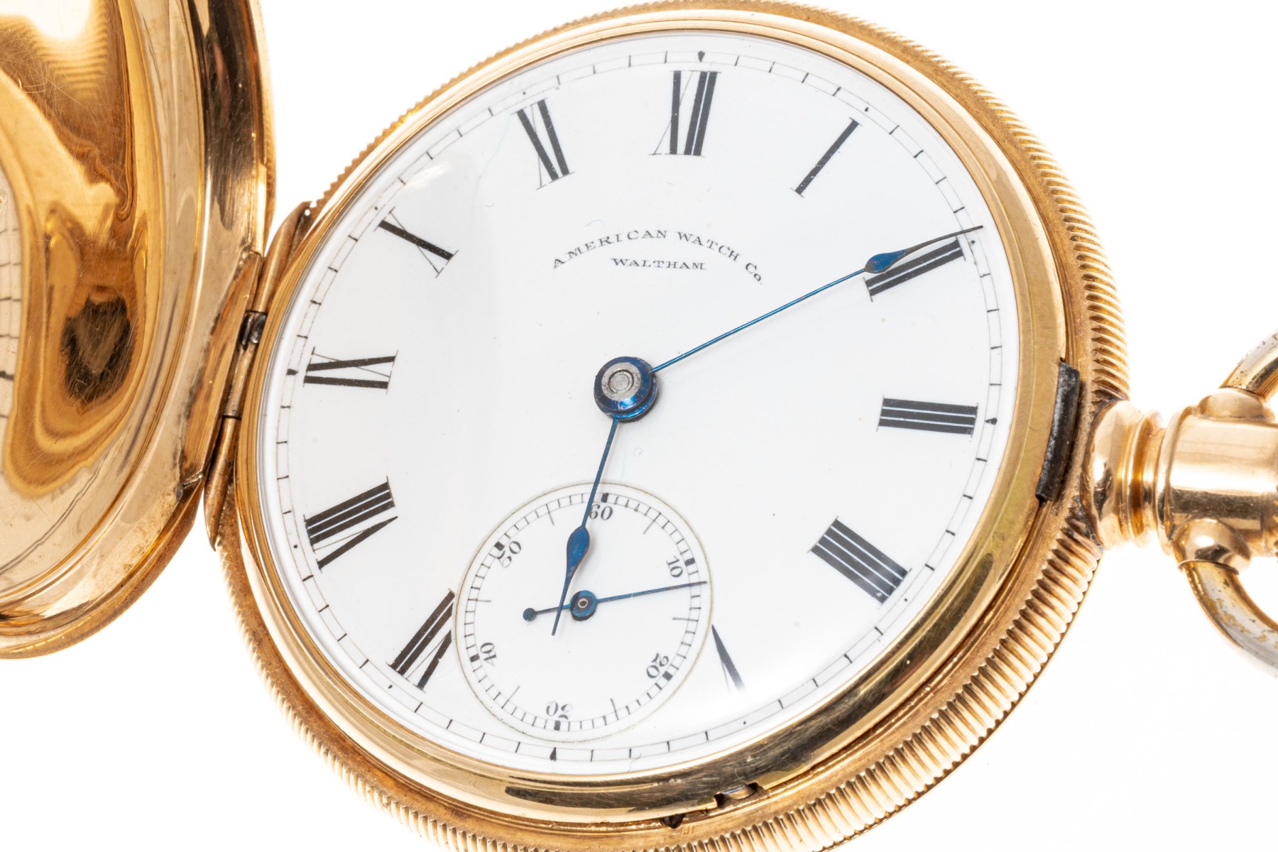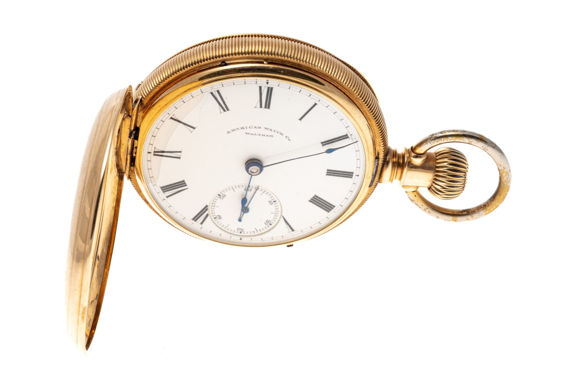 Antique 14K Waltham mechanical pocket watch. The watch as an engine tool case and a dial with Roman numeral indices, sub second dial at the 6:00 position. Circa 1883.