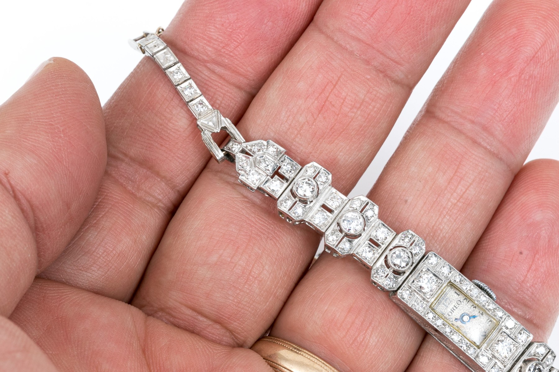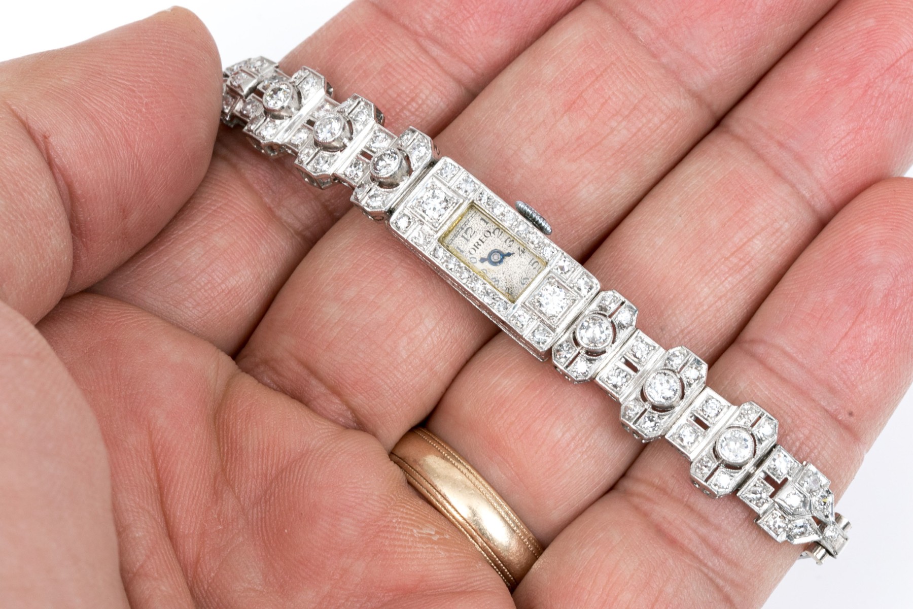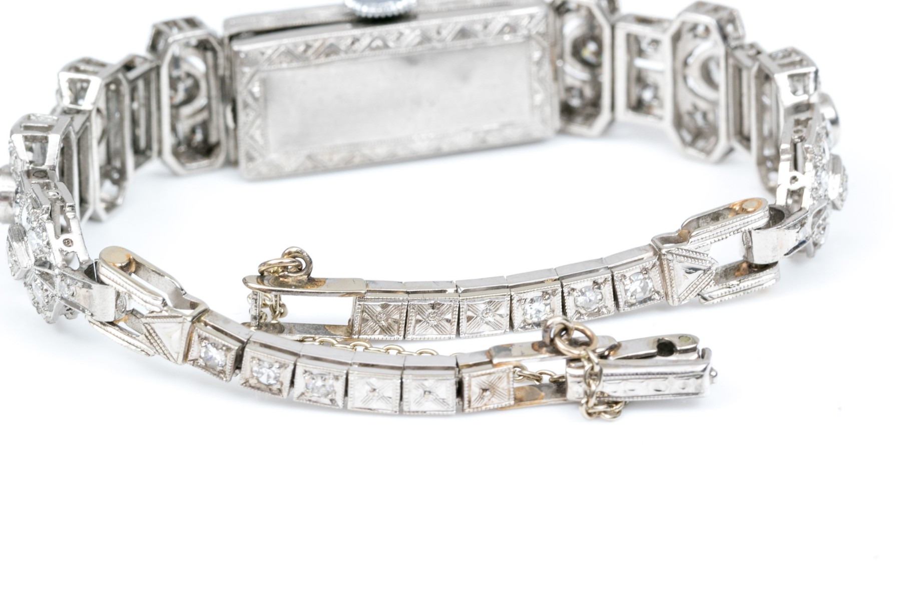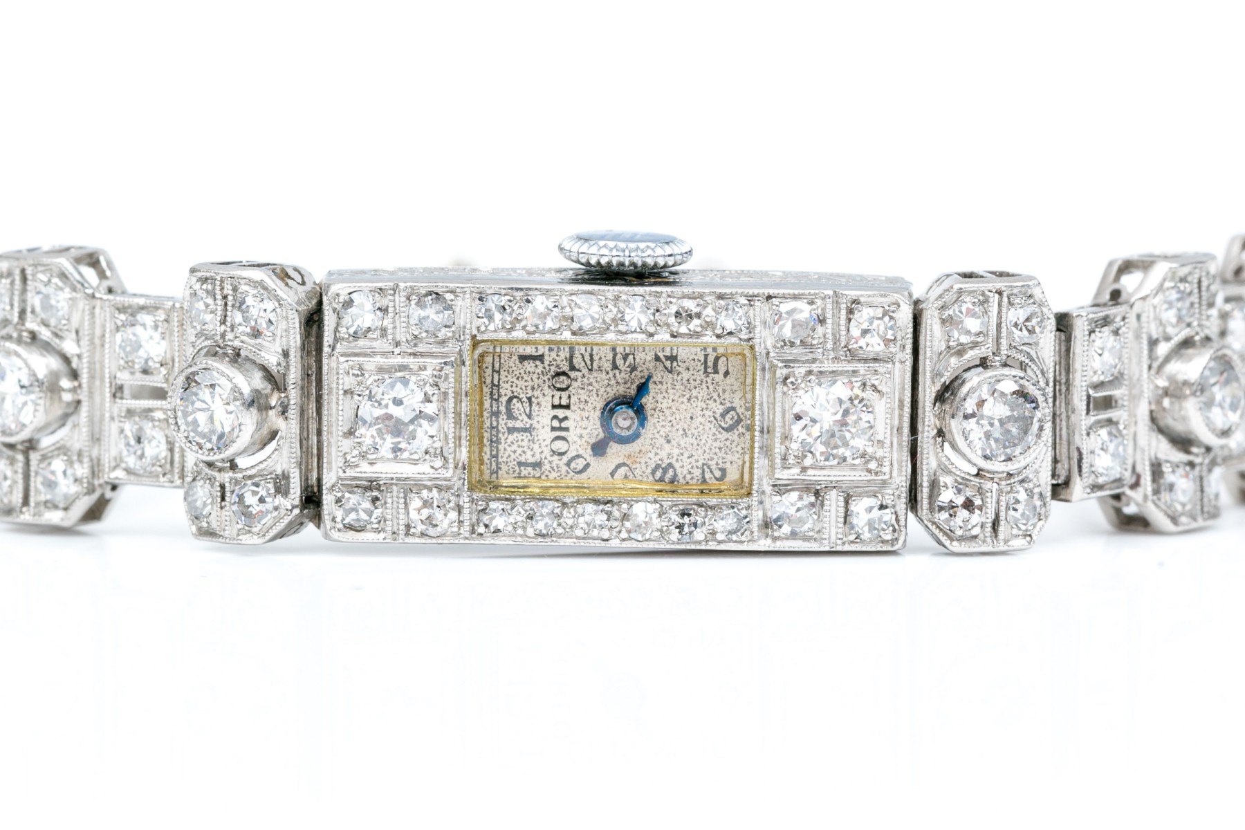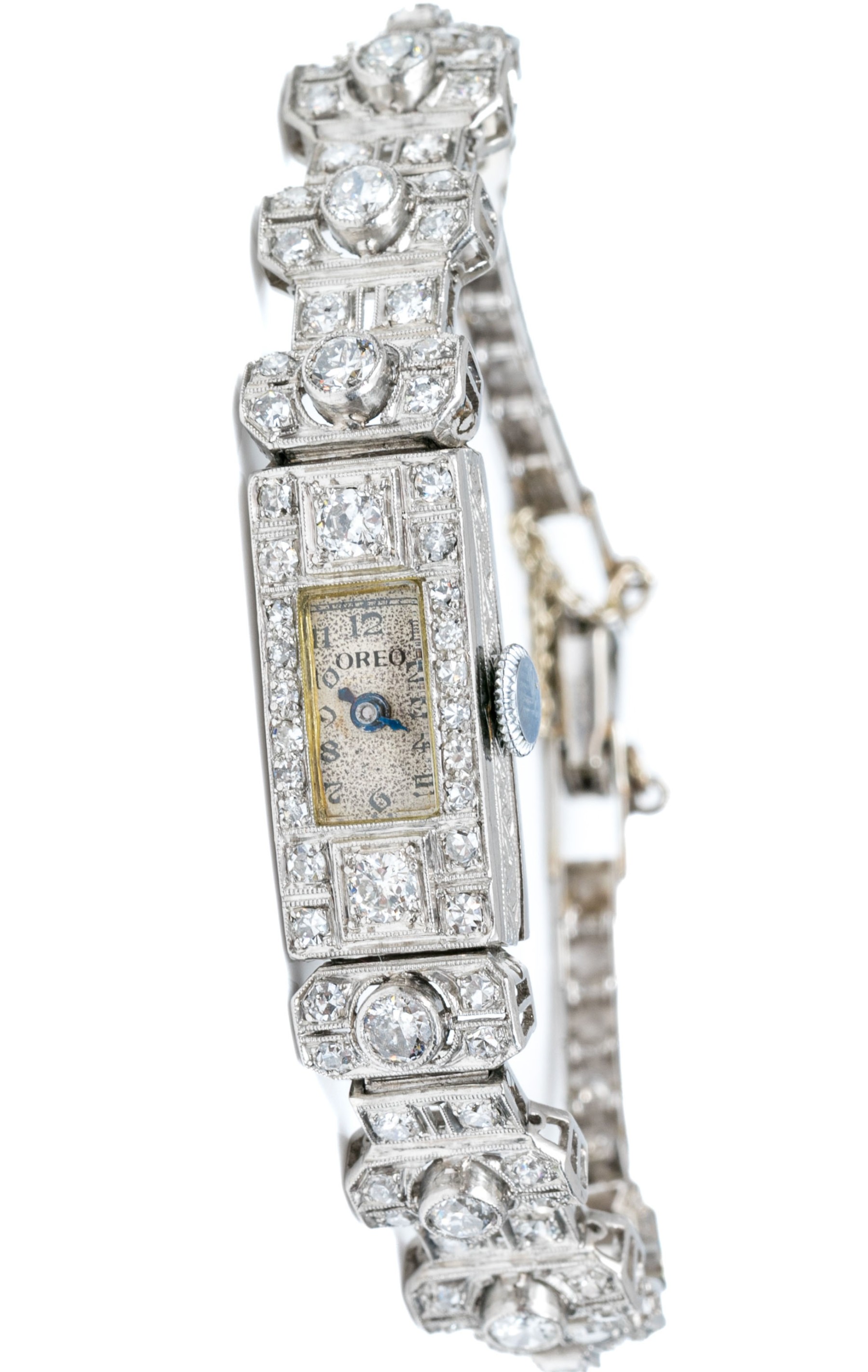 Antique 14K white gold mechanical watch by Oreo. This slim watch is set with an array of round faceted diamonds surrounding the dial and down the band. Delicate rectangular dial with Arabic numerals. The diamonds are approximately 3.08 TCW. Latch style clasp with safety chain.