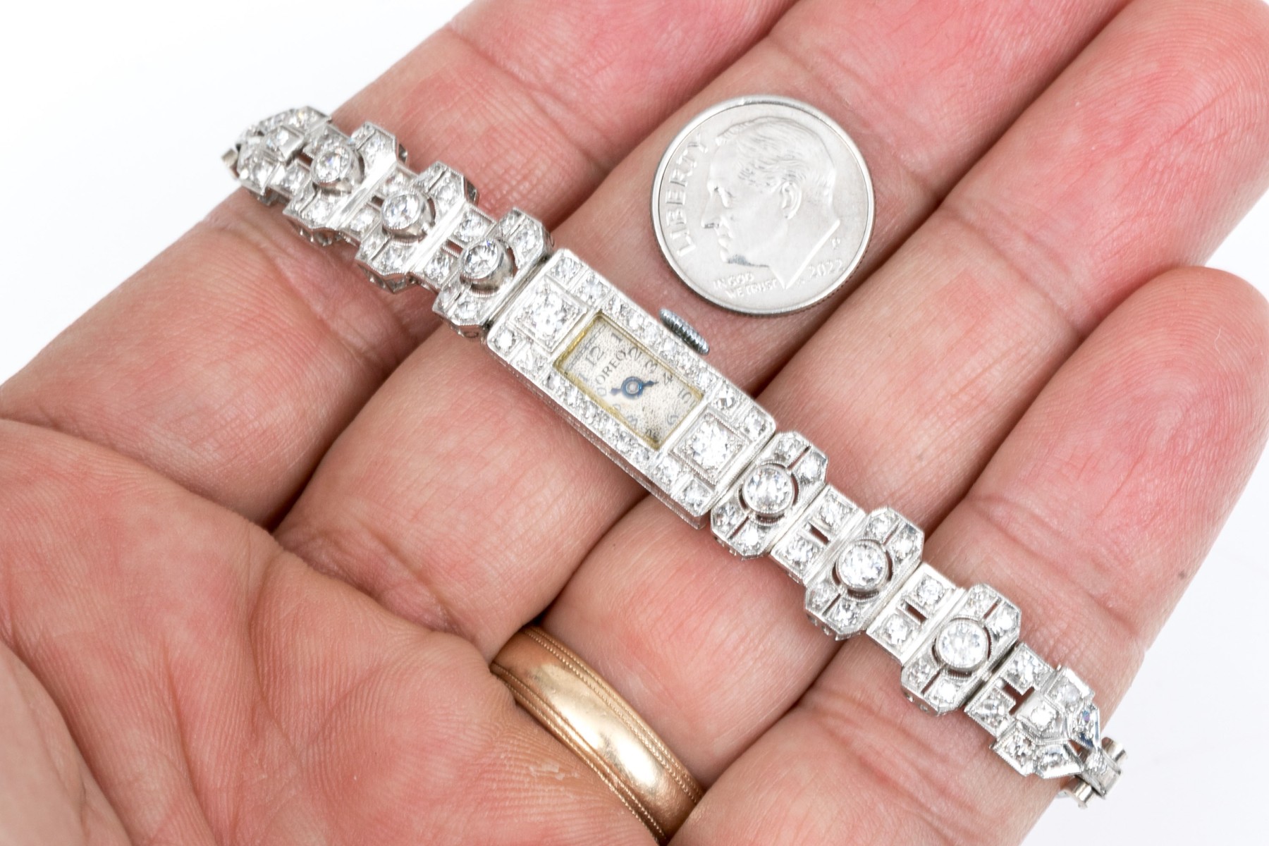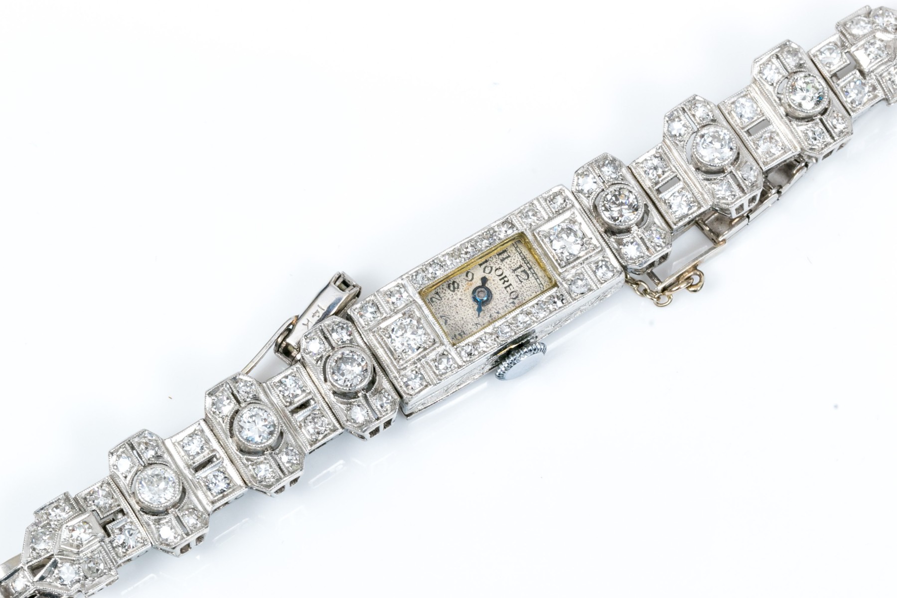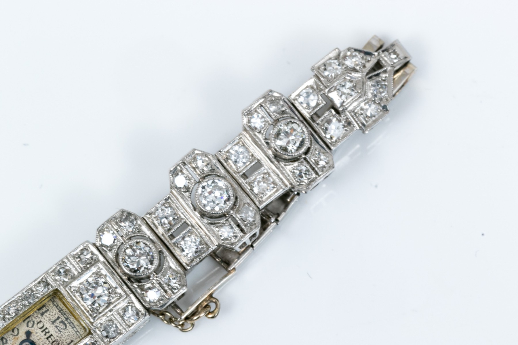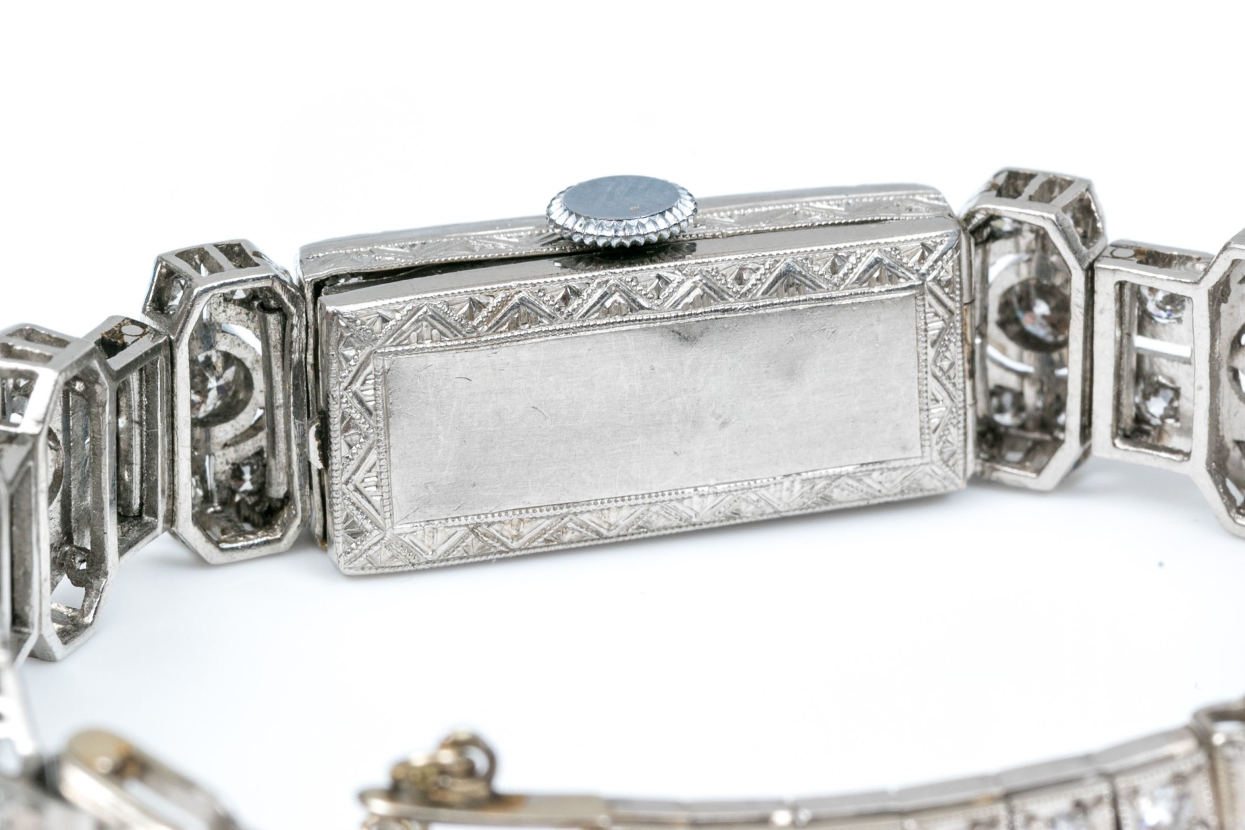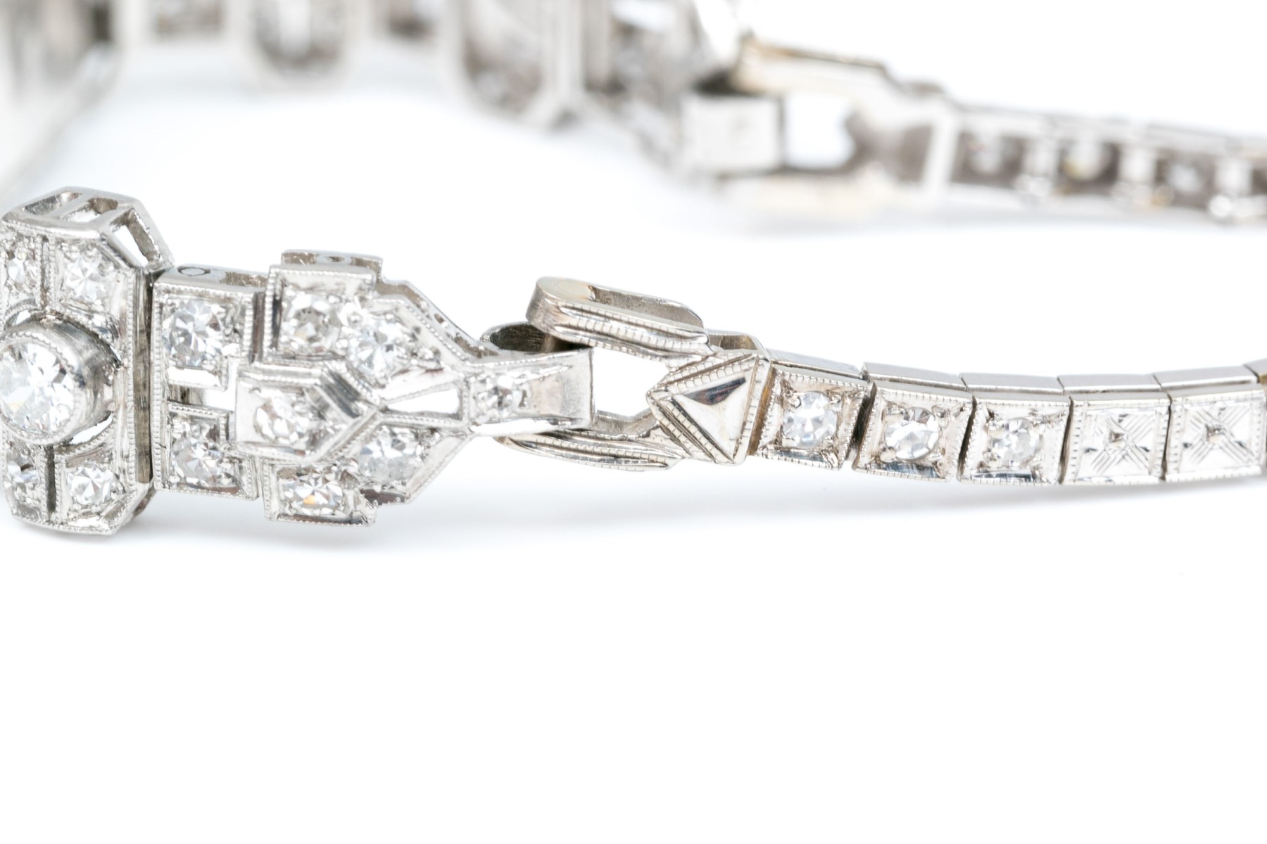 Antique 14K white gold mechanical watch by Oreo. This slim watch is set with an array of round faceted diamonds surrounding the dial and down the band. Delicate rectangular dial with Arabic numerals. The diamonds are approximately 3.08 TCW. Latch style clasp with safety chain.