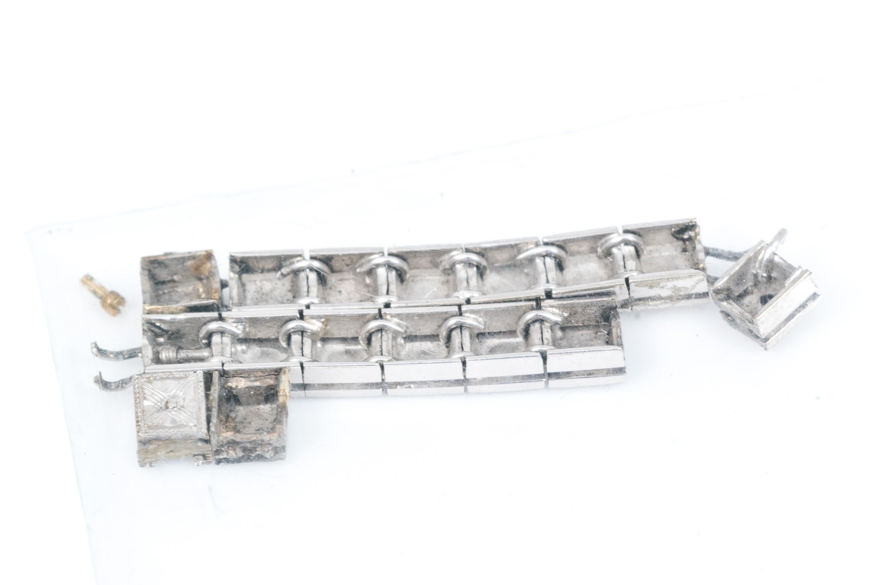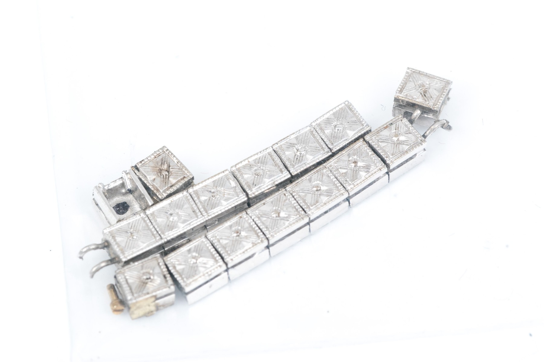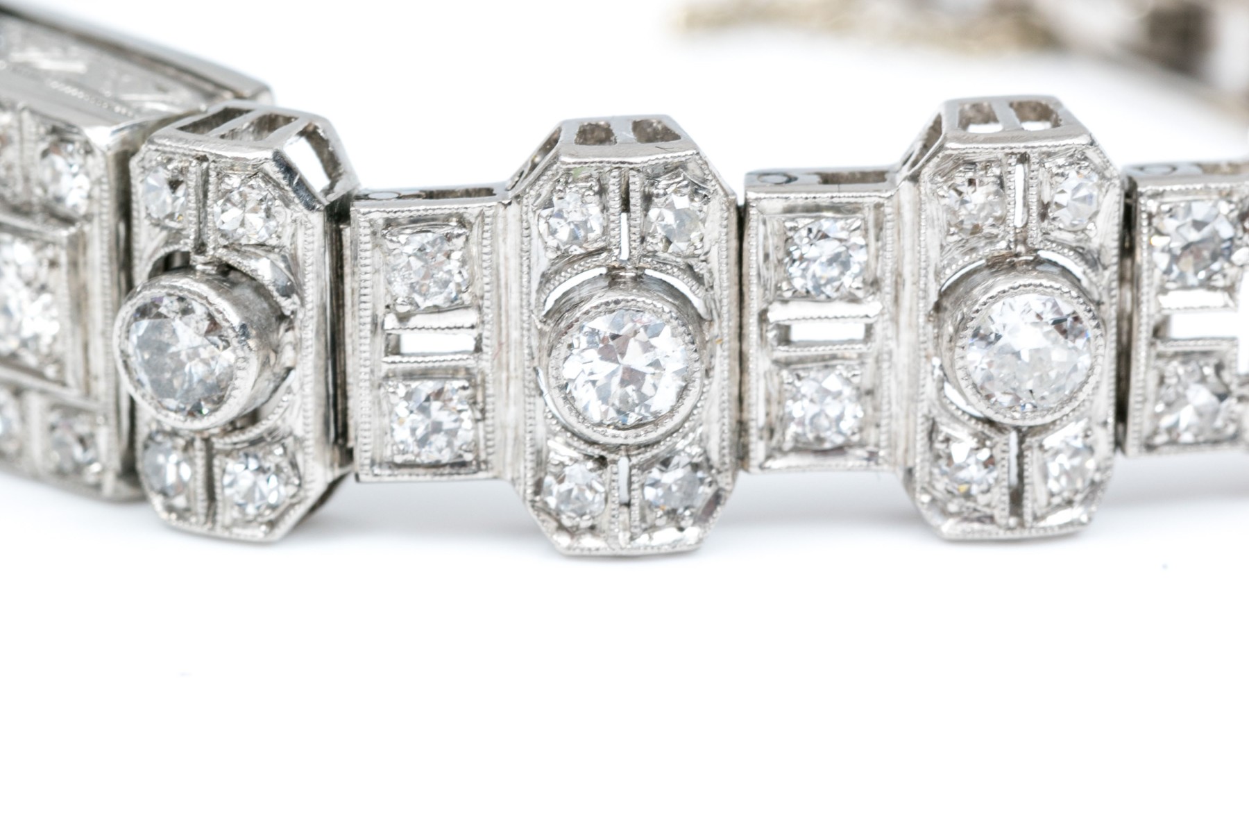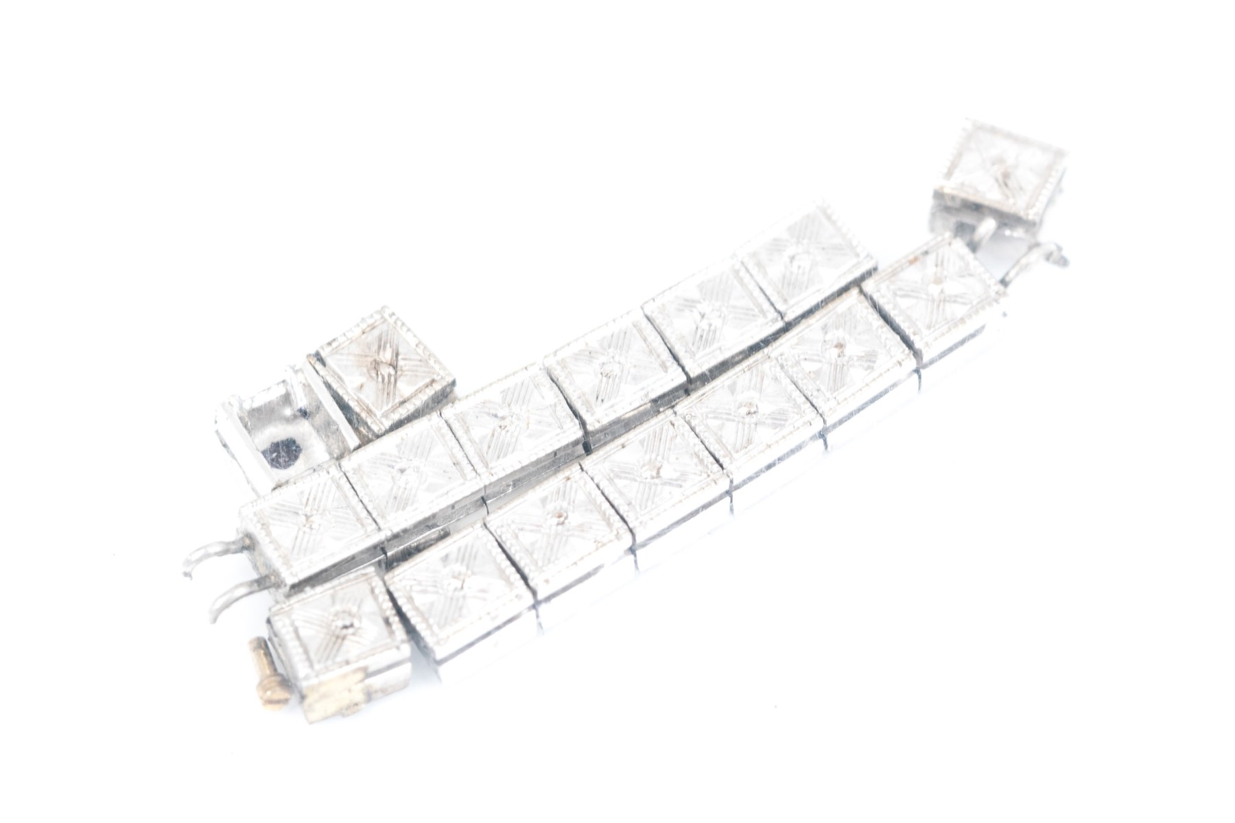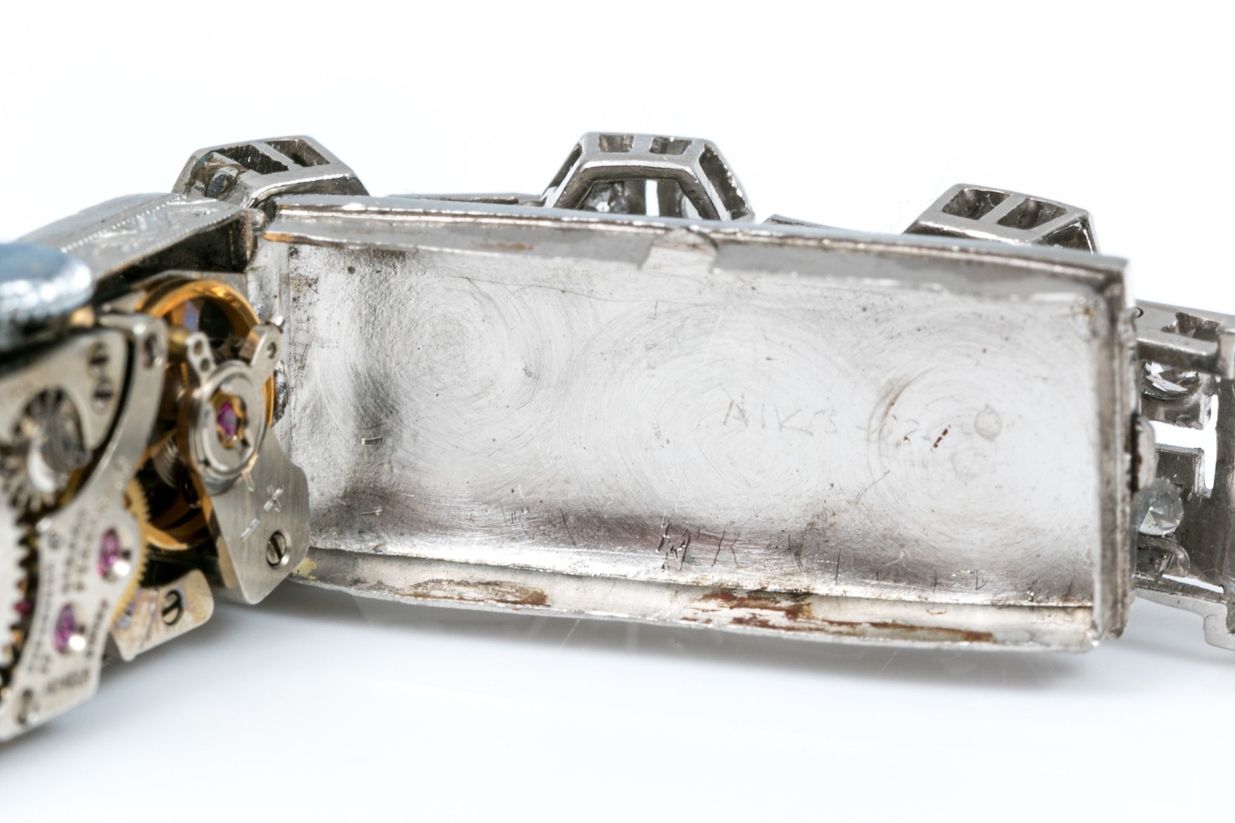 Antique 14K white gold mechanical watch by Oreo. This slim watch is set with an array of round faceted diamonds surrounding the dial and down the band. Delicate rectangular dial with Arabic numerals. The diamonds are approximately 3.08 TCW. Latch style clasp with safety chain.