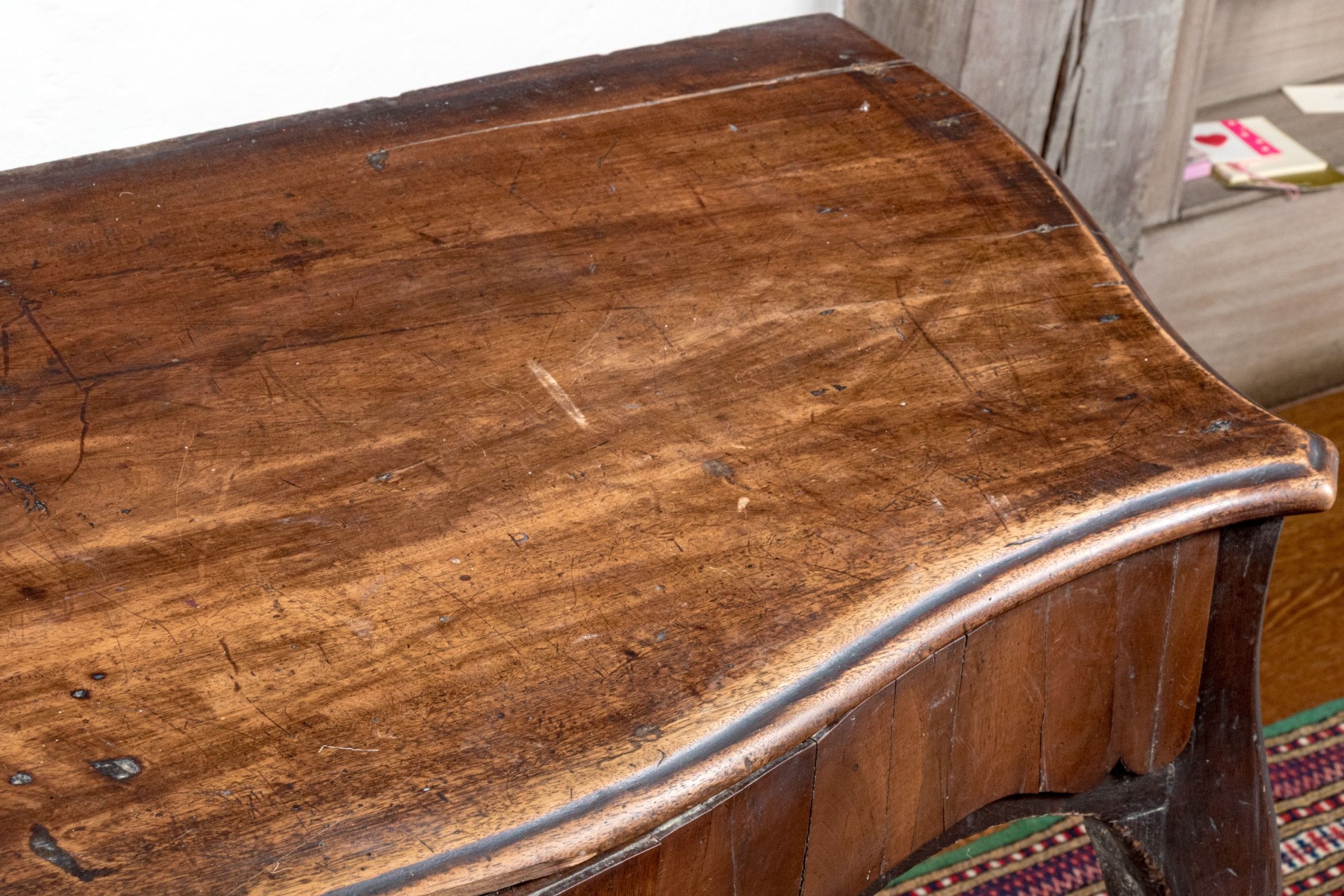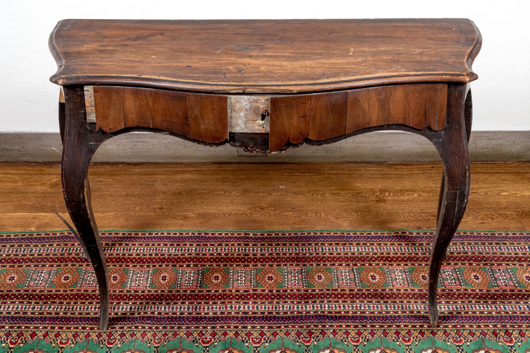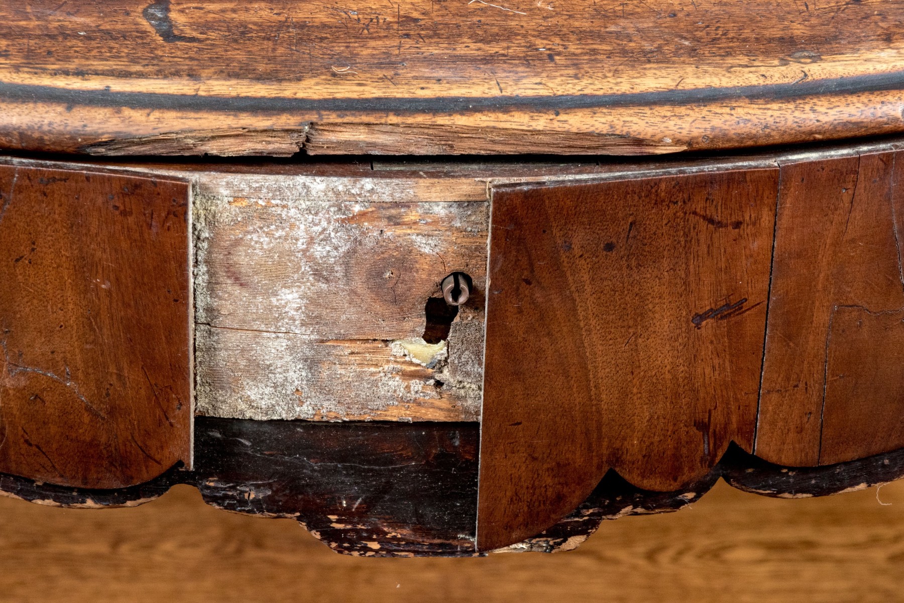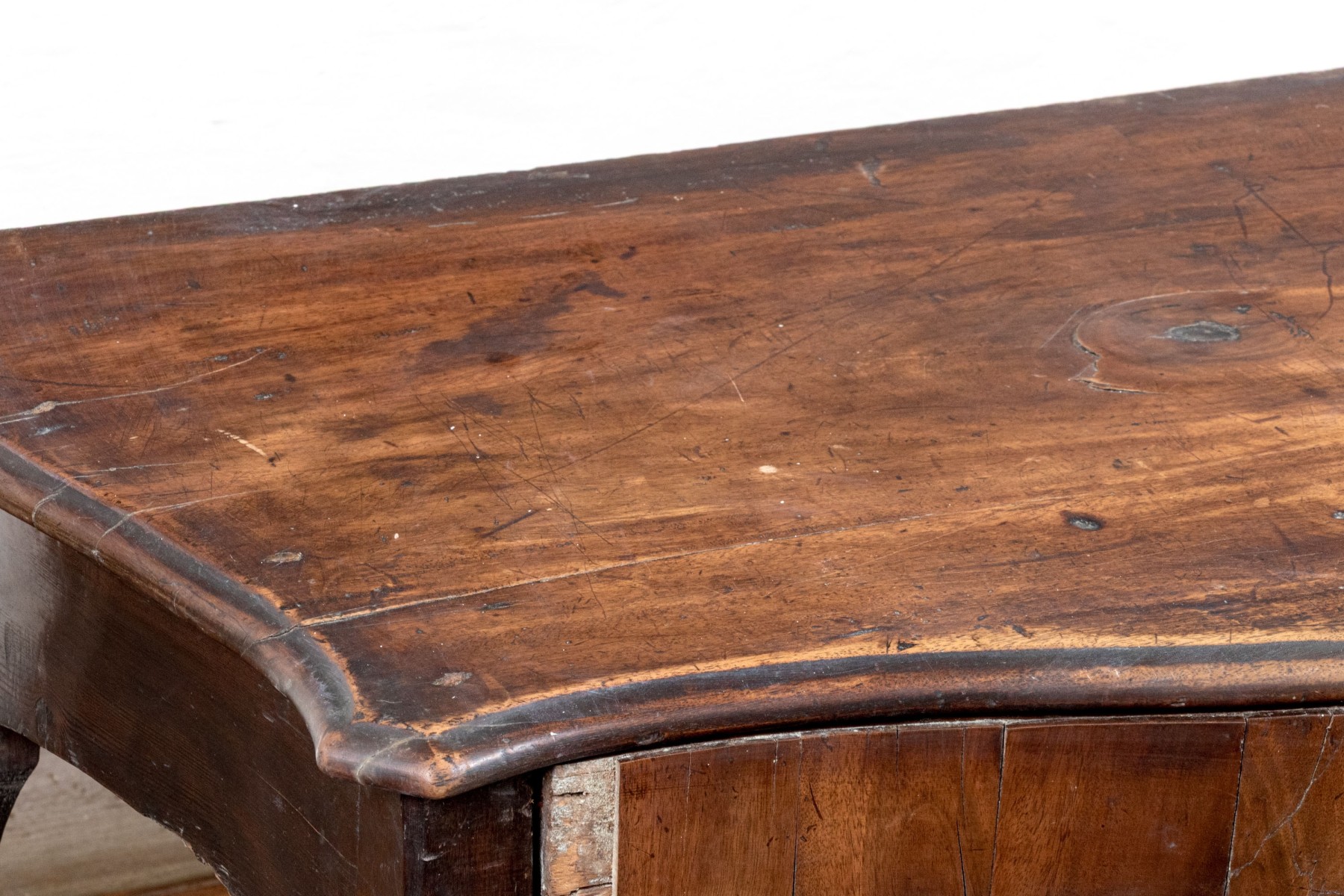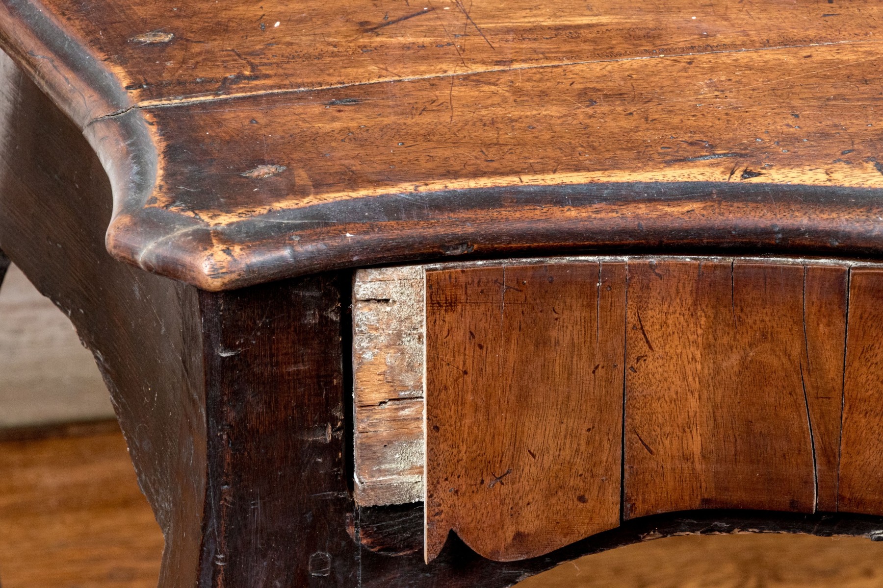 An antique 18th C. Italian console table. On four highly stylized cabriole legs with bold form supporting a upper case with single drawer and scalloped front trim.