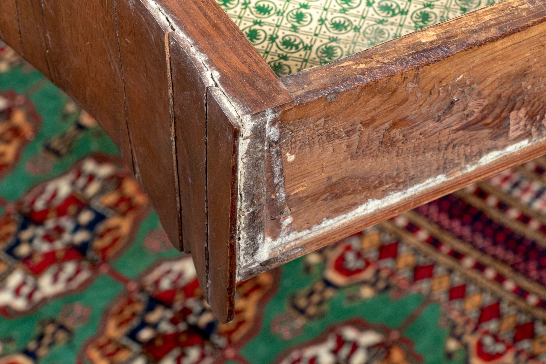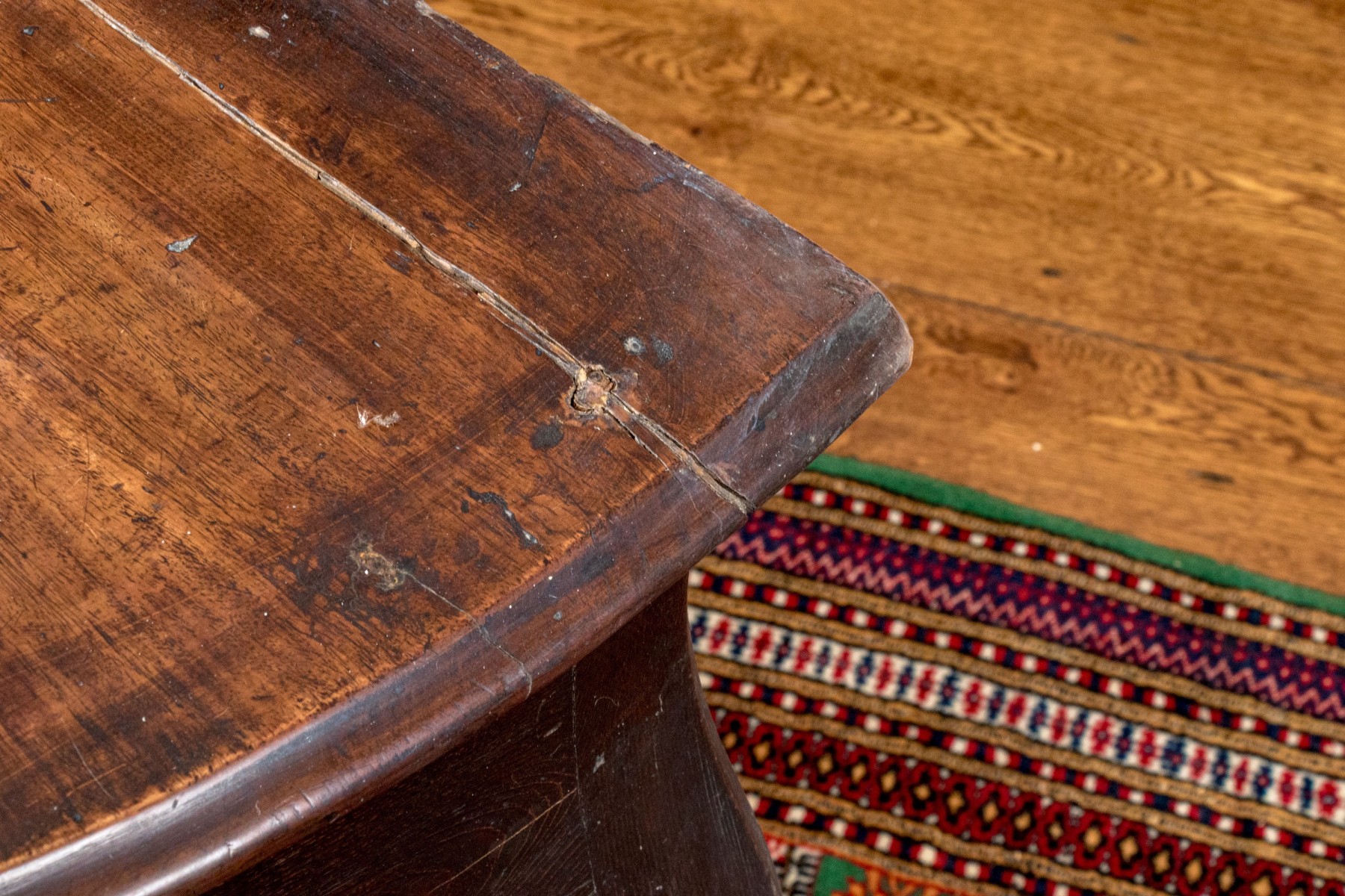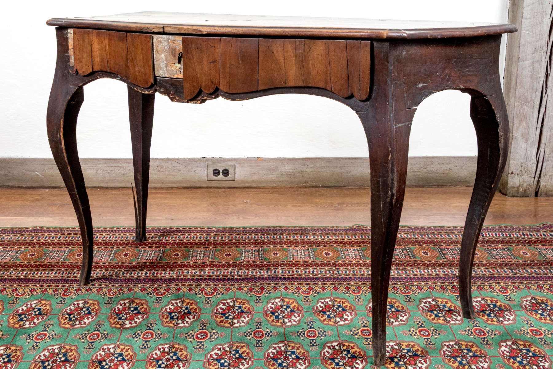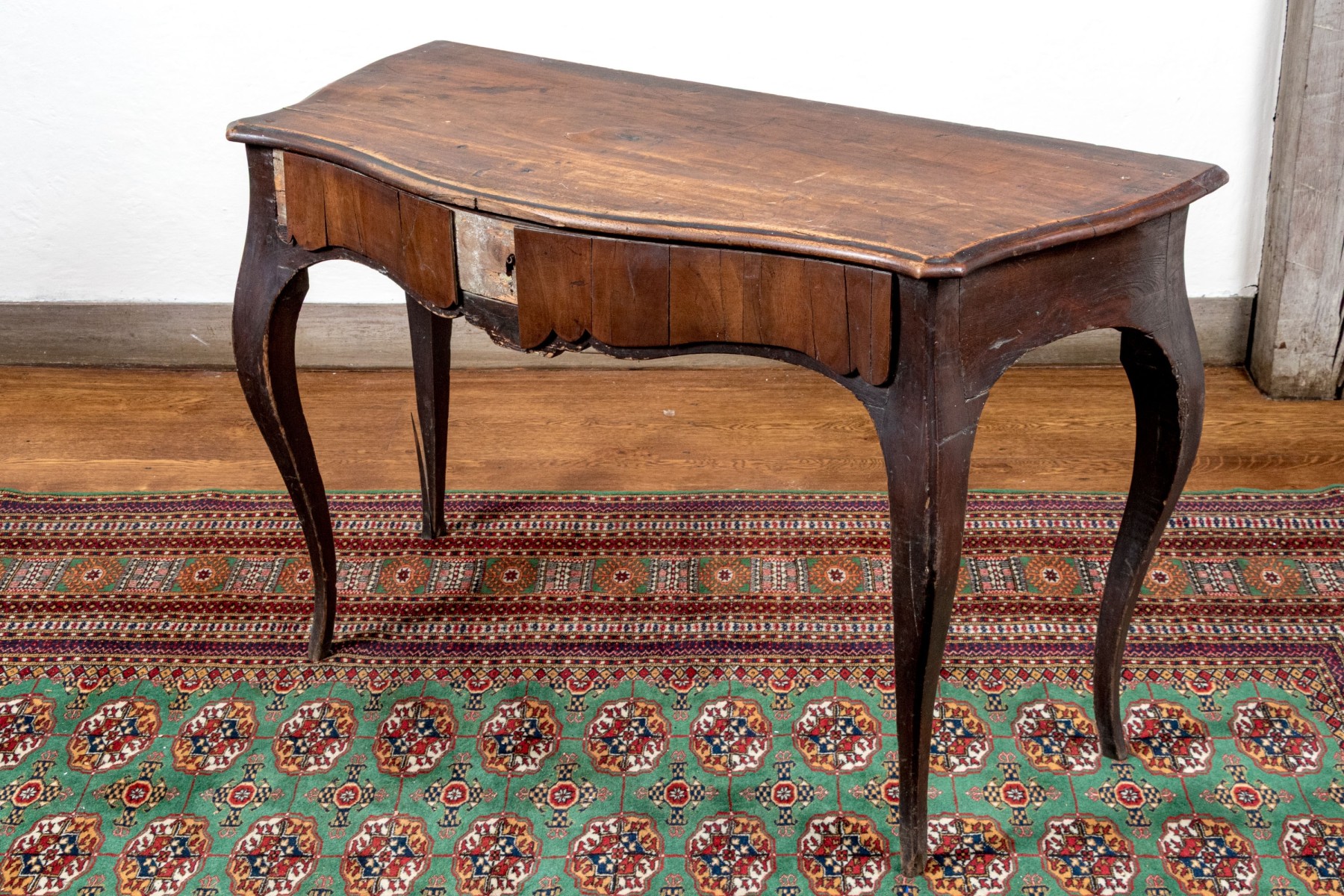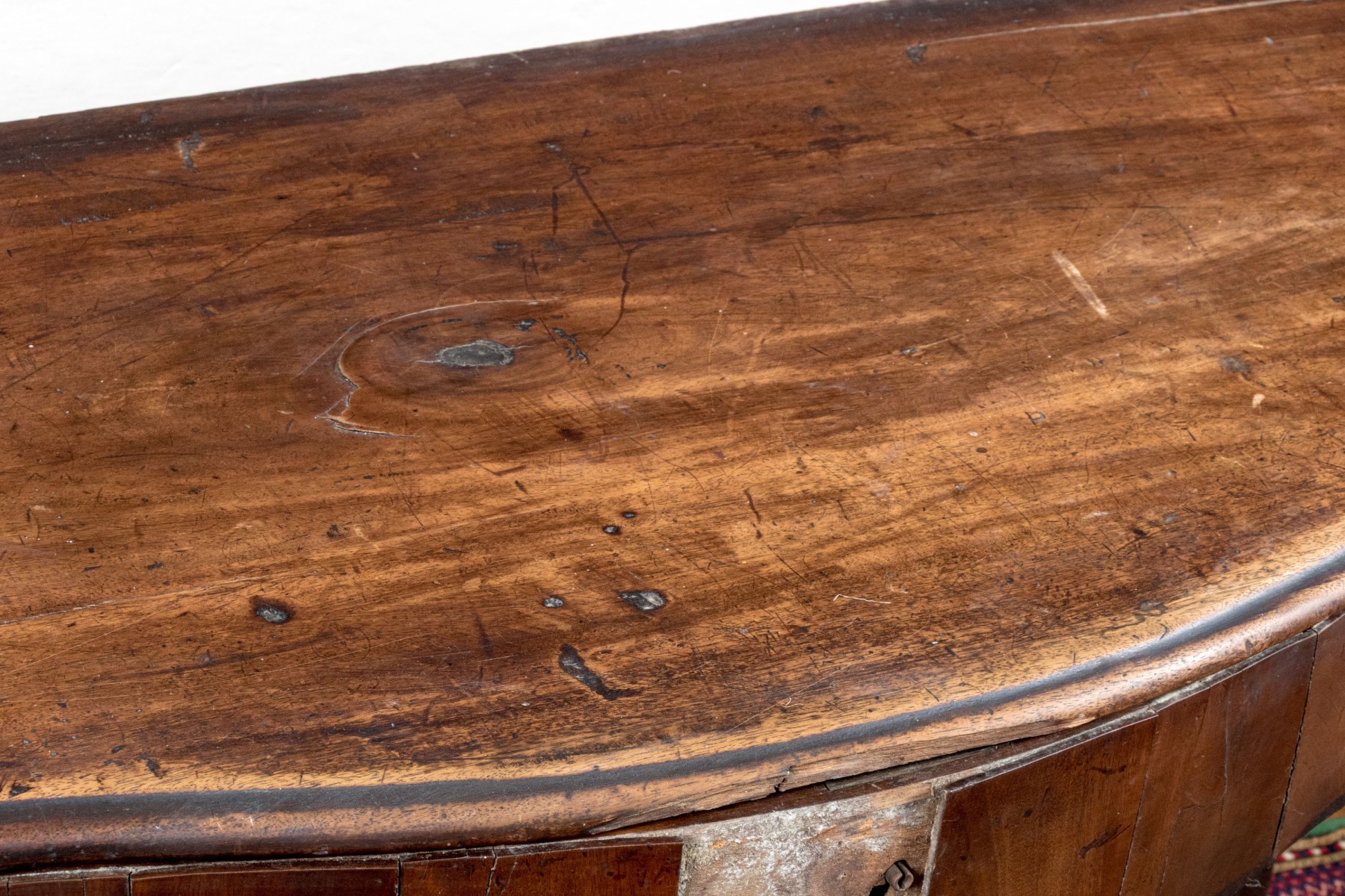 An antique 18th C. Italian console table. On four highly stylized cabriole legs with bold form supporting a upper case with single drawer and scalloped front trim.