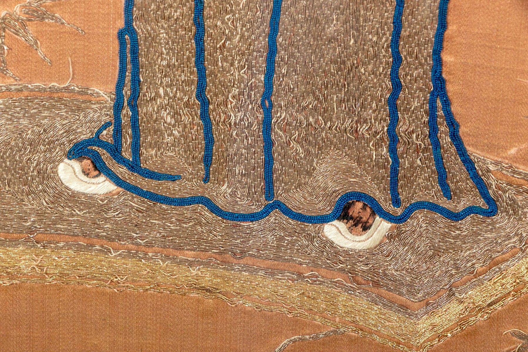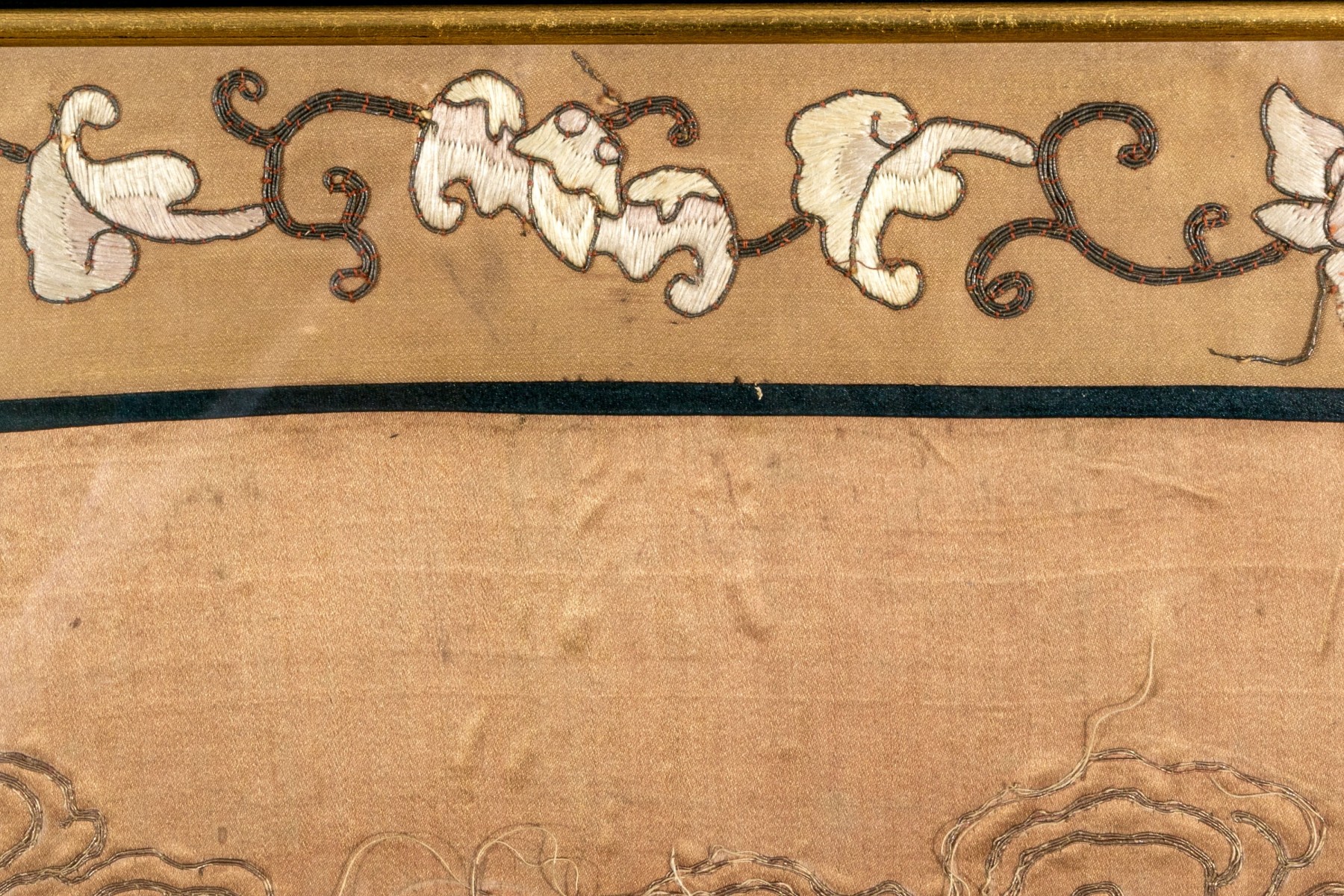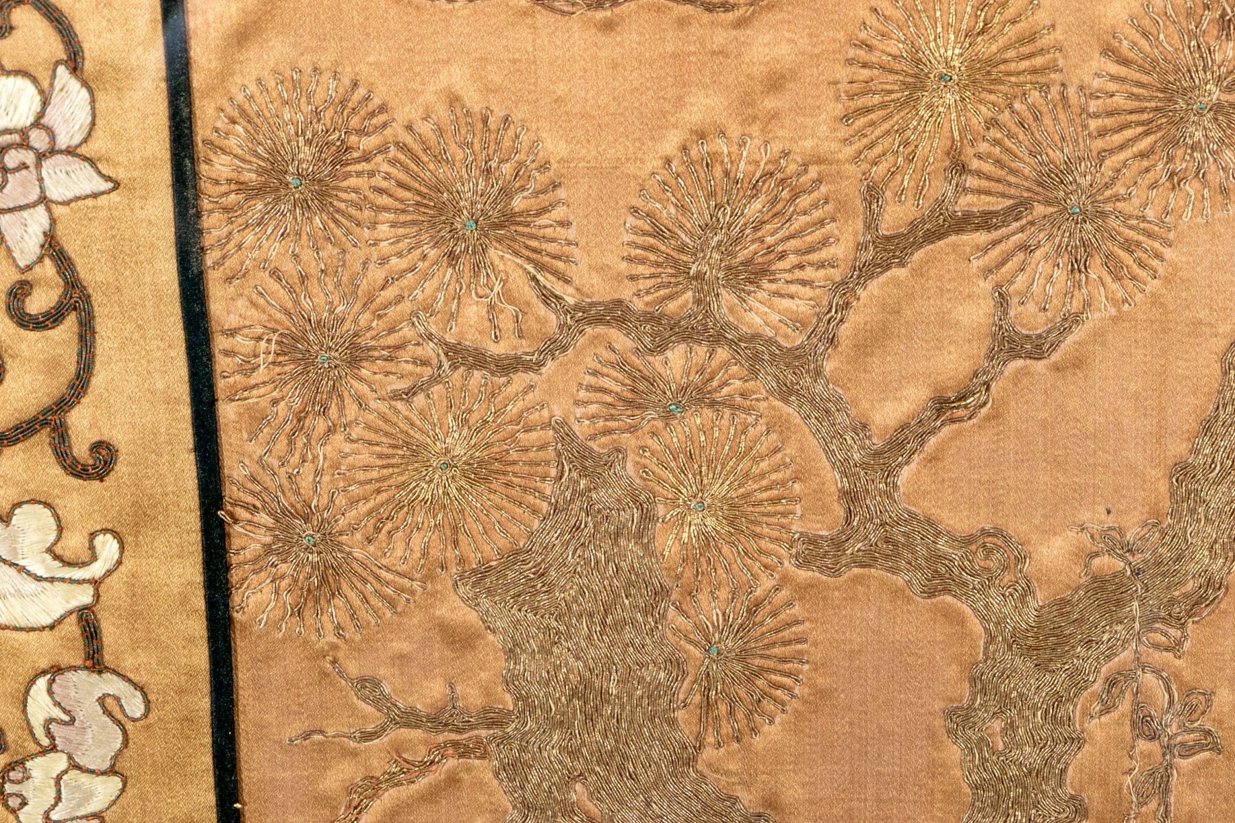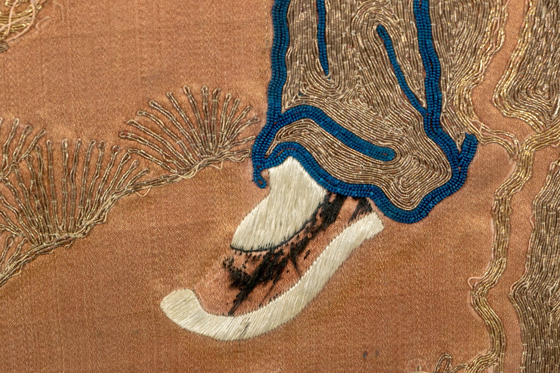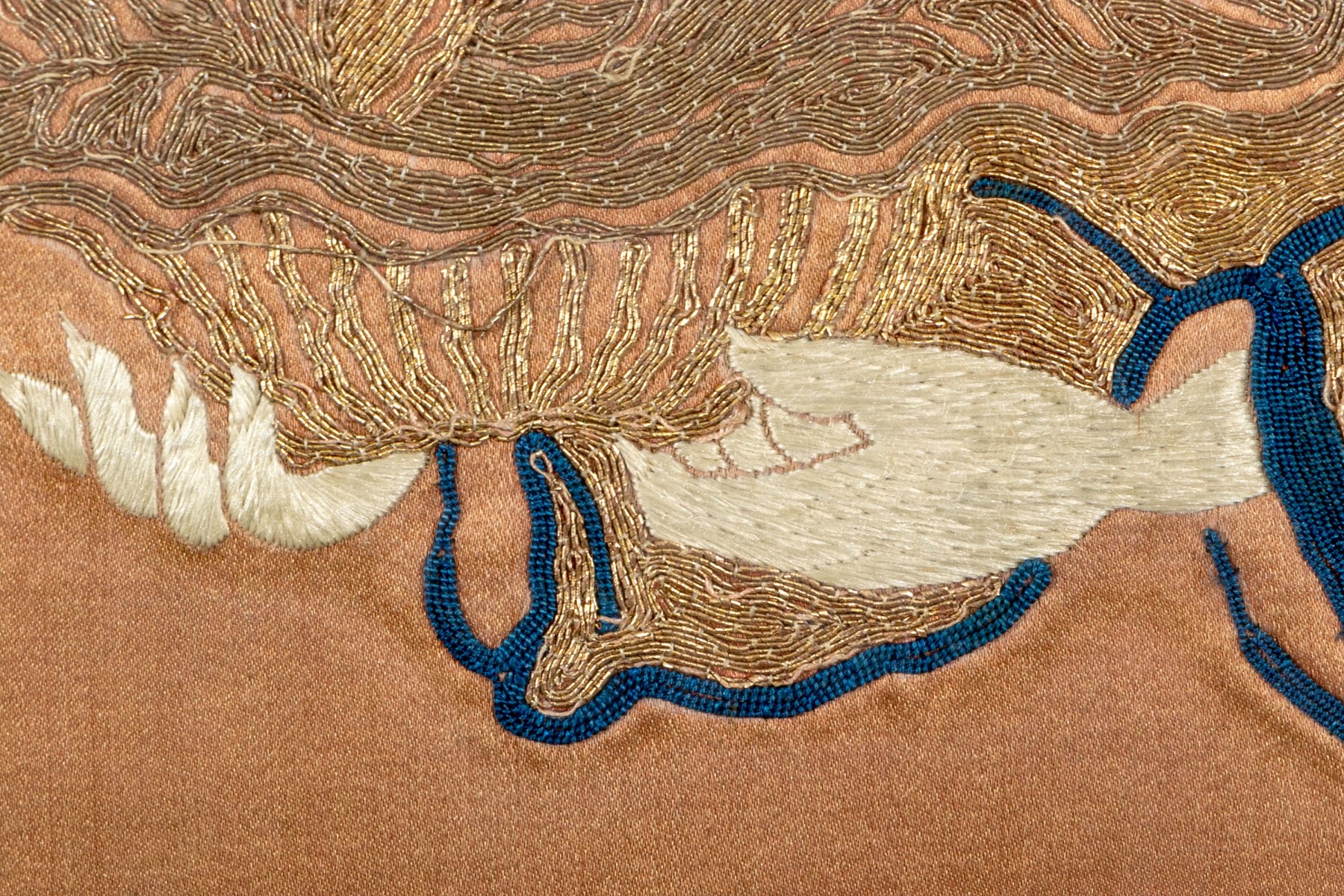 Some wear including broken and frayed embroidered strands with some wear to the silk backing all commensurate with age.