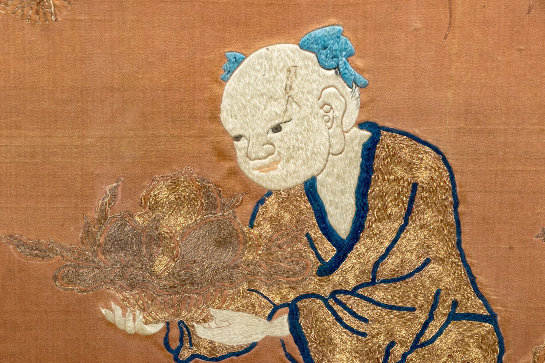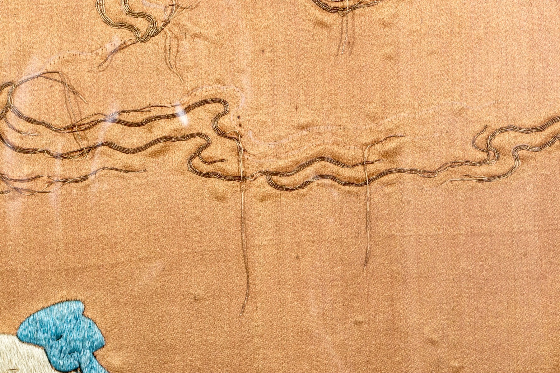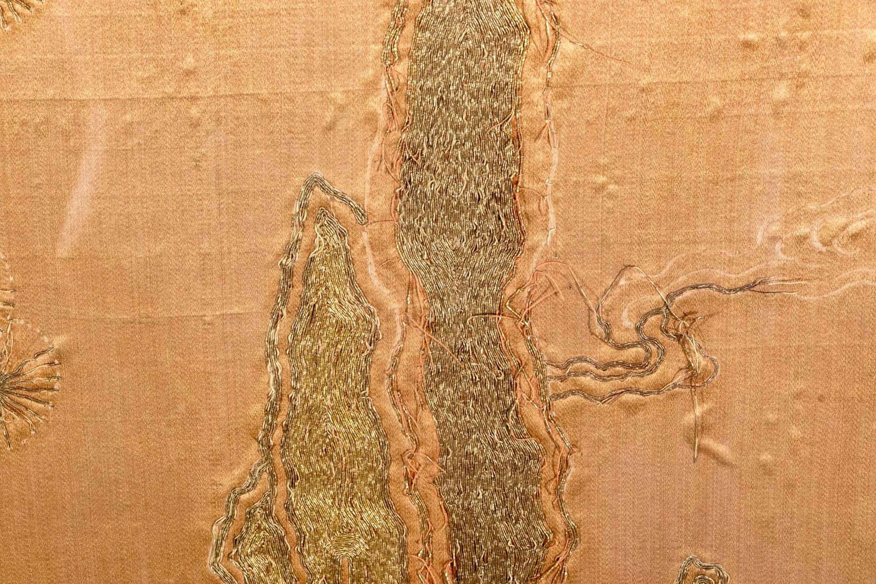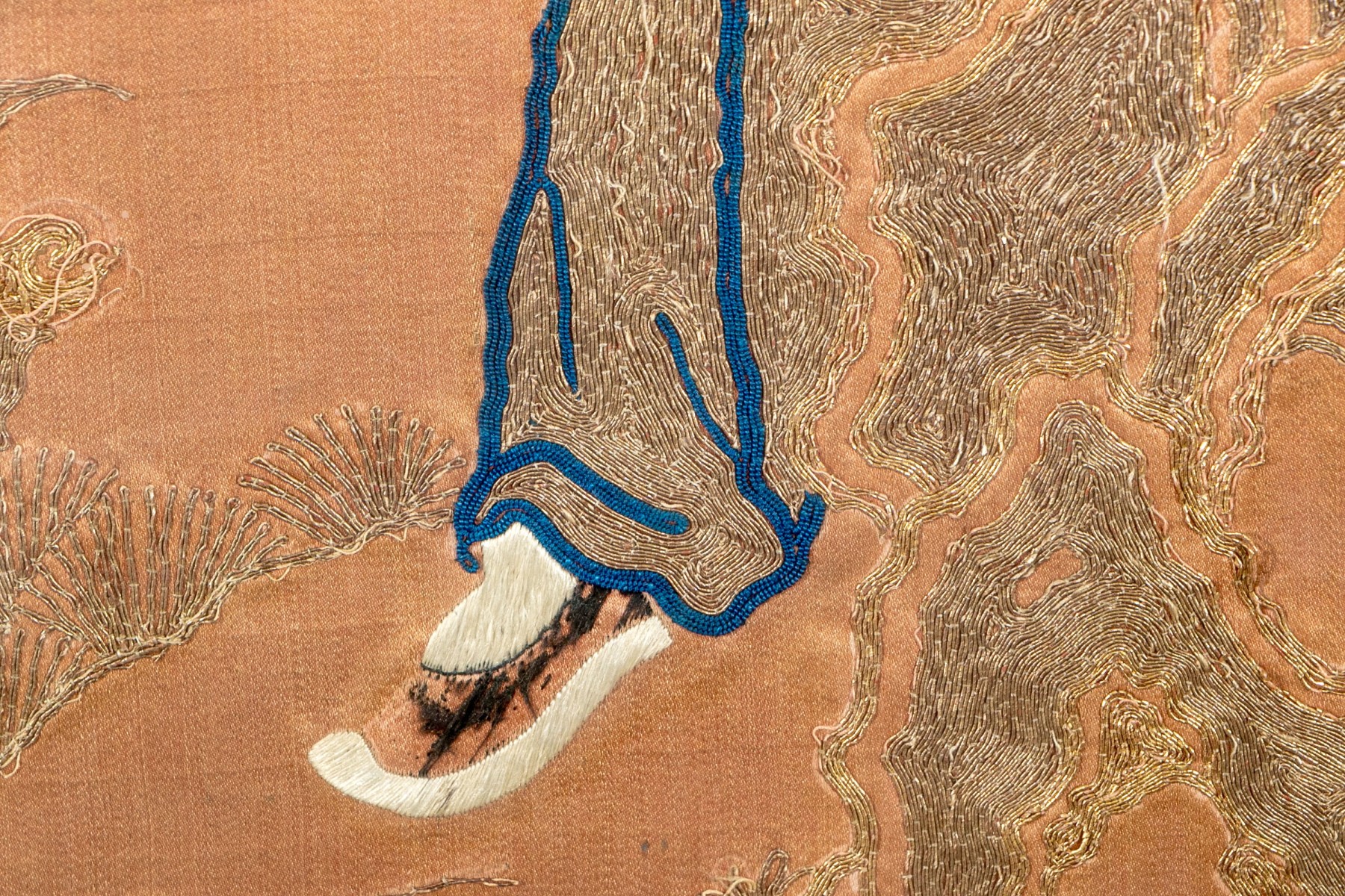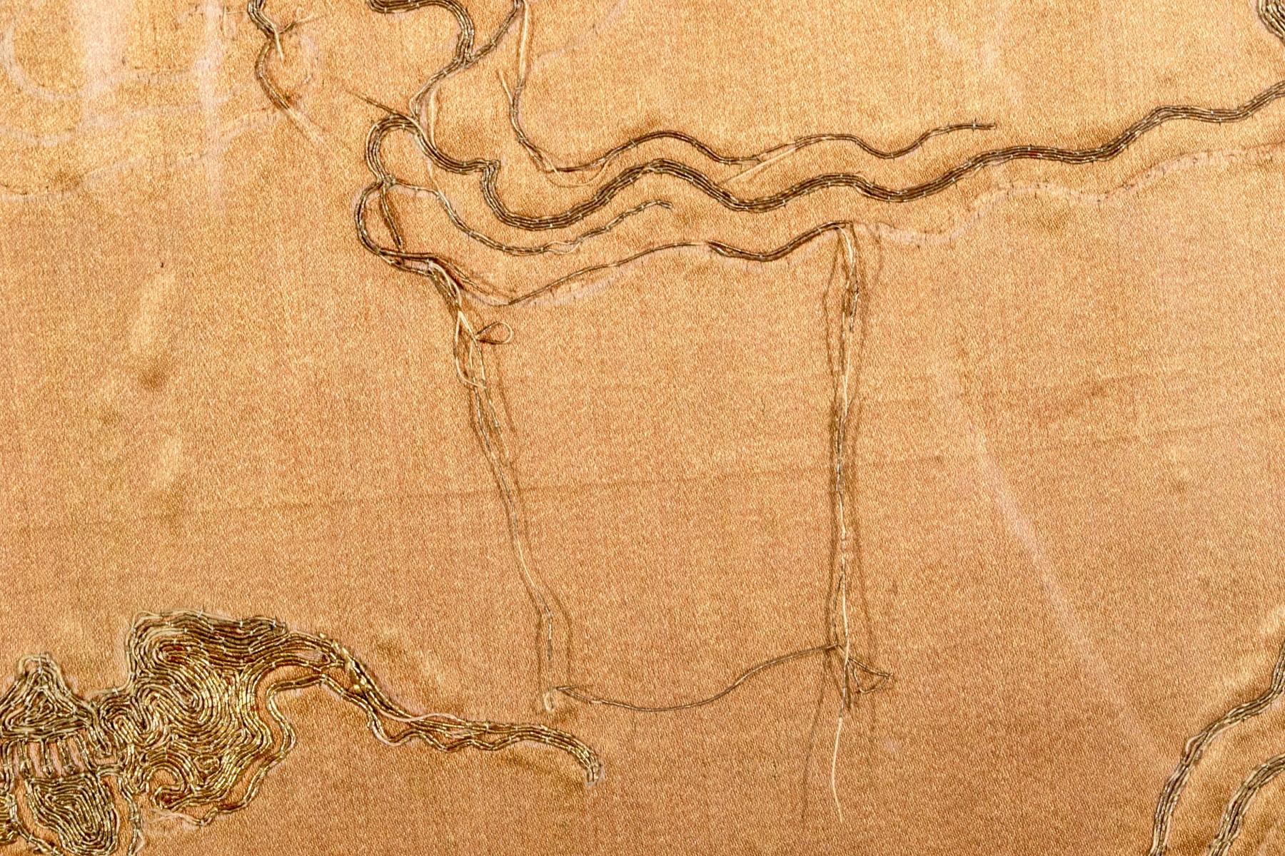 Some wear including broken and frayed embroidered strands with some wear to the silk backing all commensurate with age.