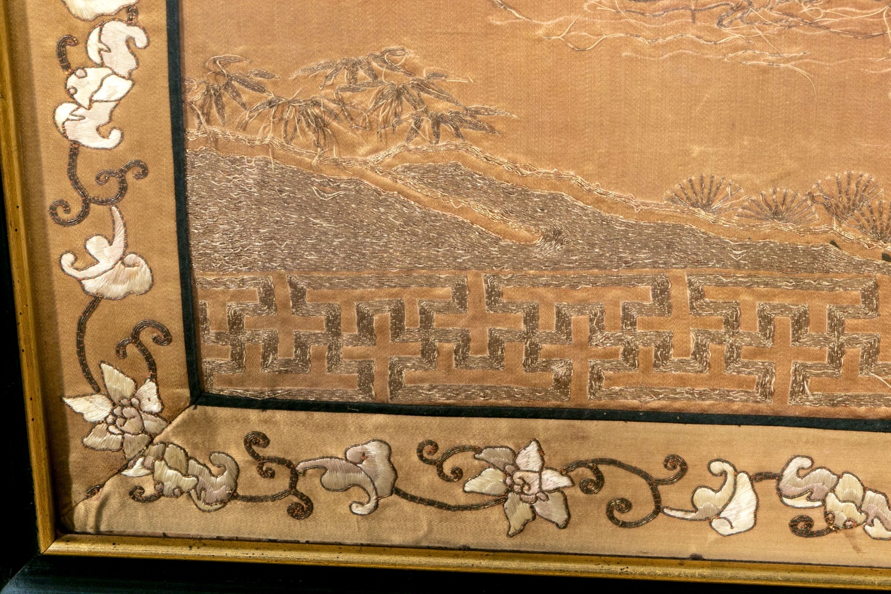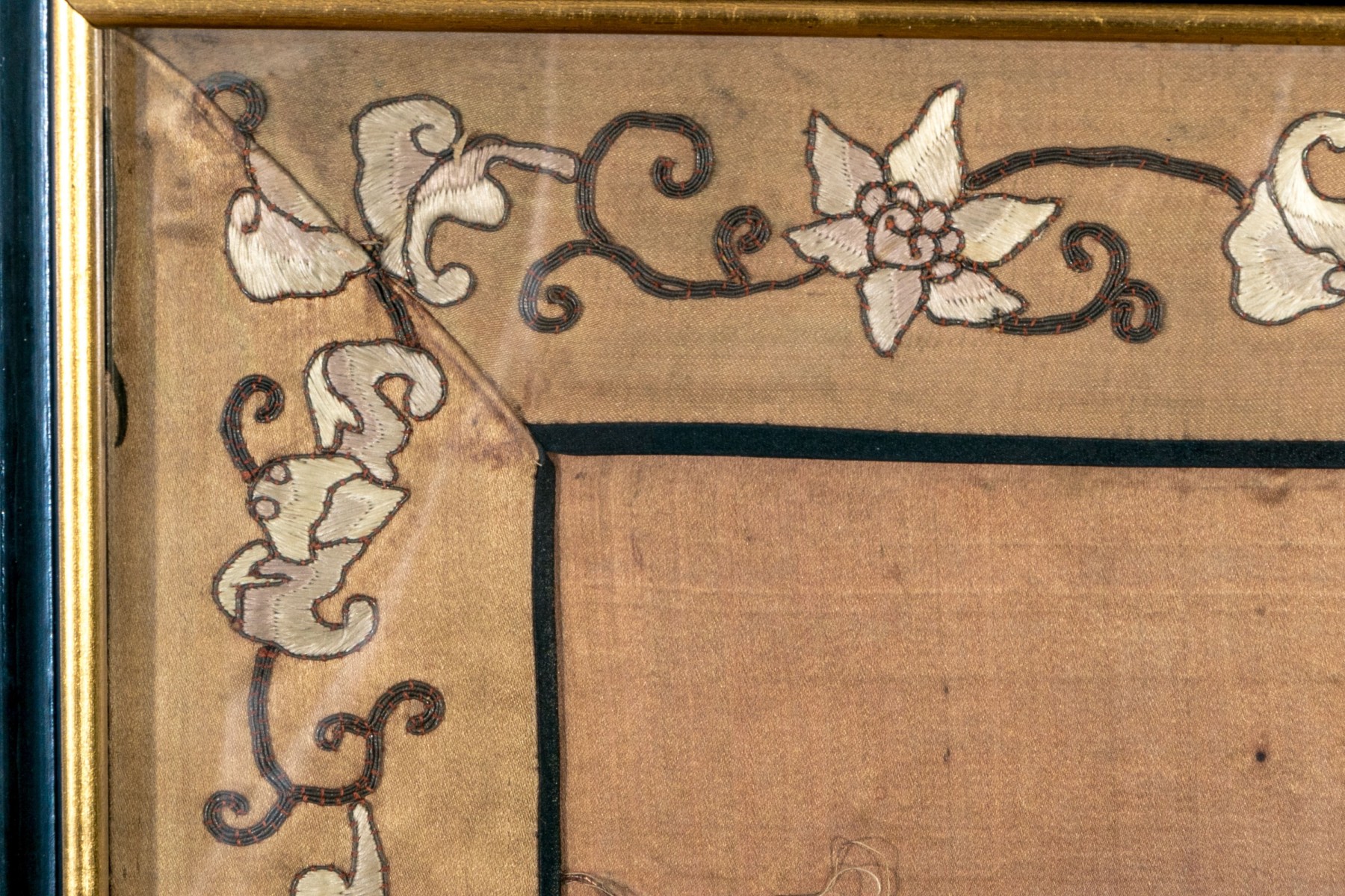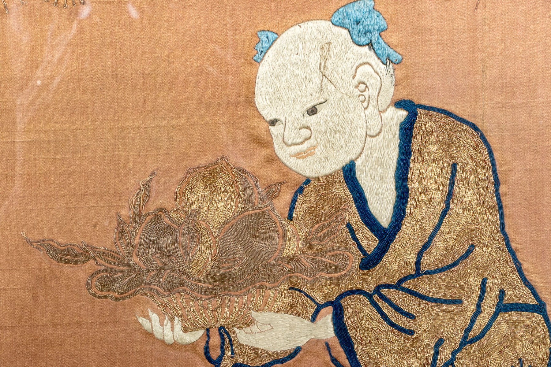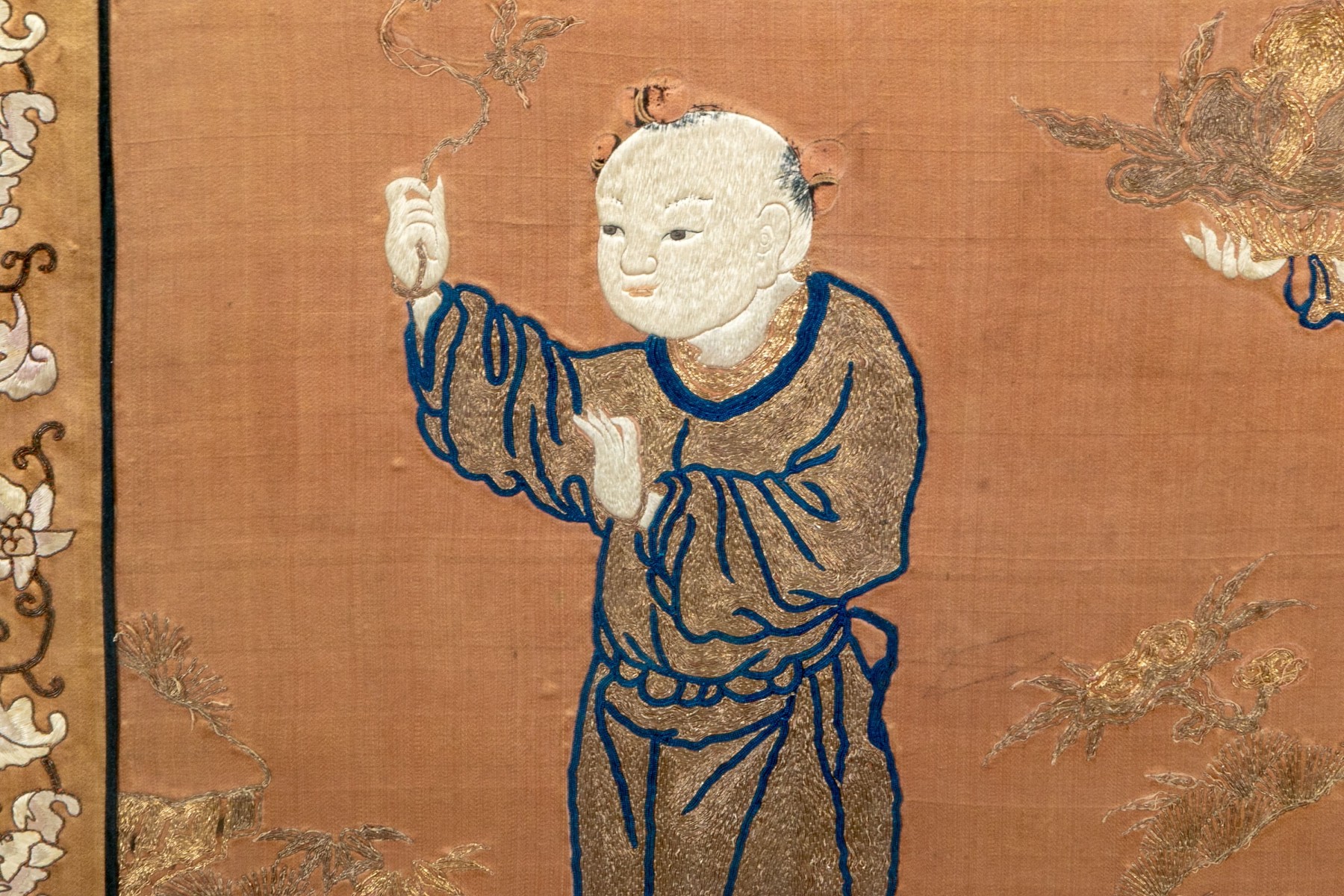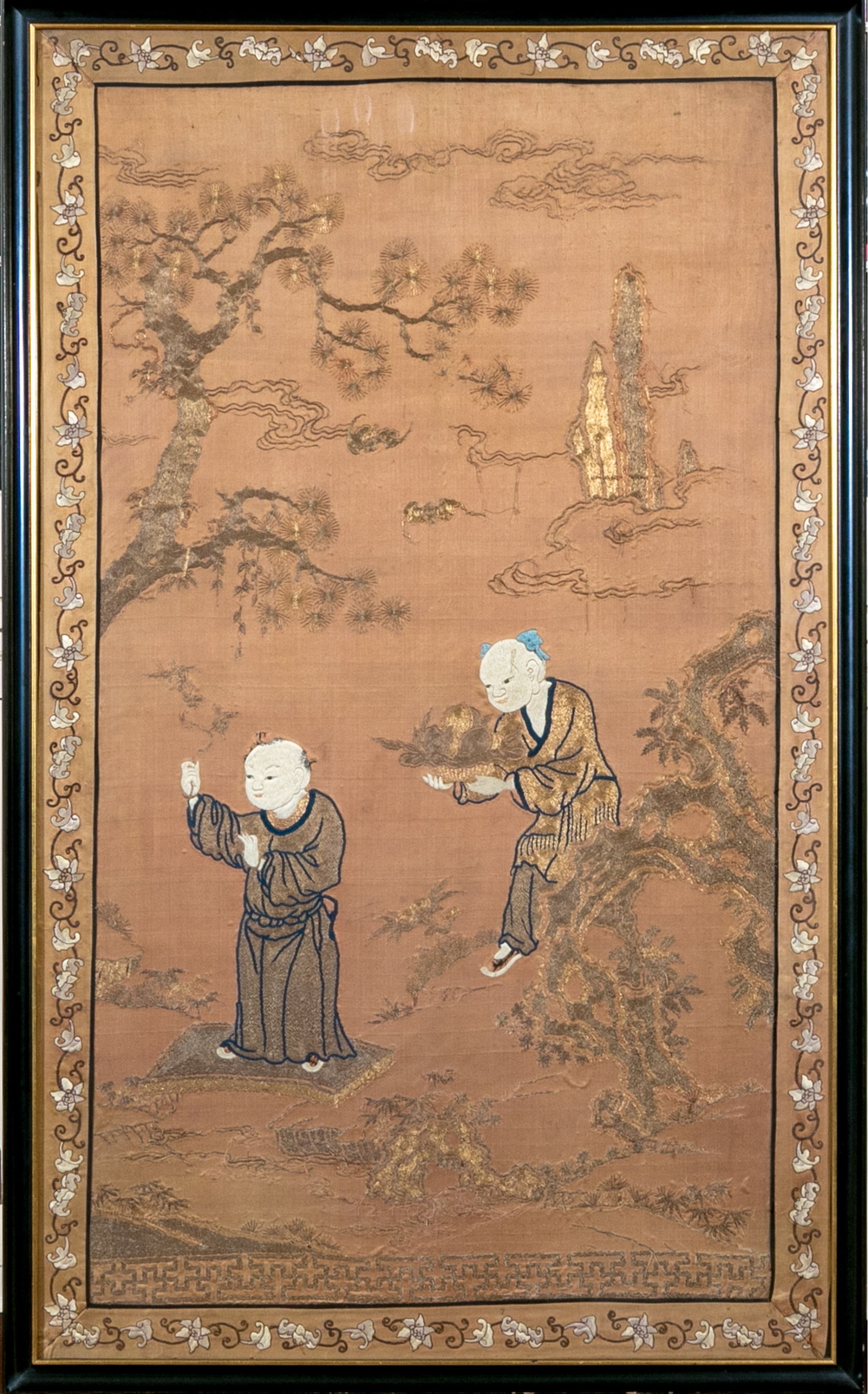 Beautifully embroidered silk panel depicting two boys in a landscape with prunus tree overhead. A decorative band around the trim with scrolled sprays. Presented framed and glazed with plexiglass.