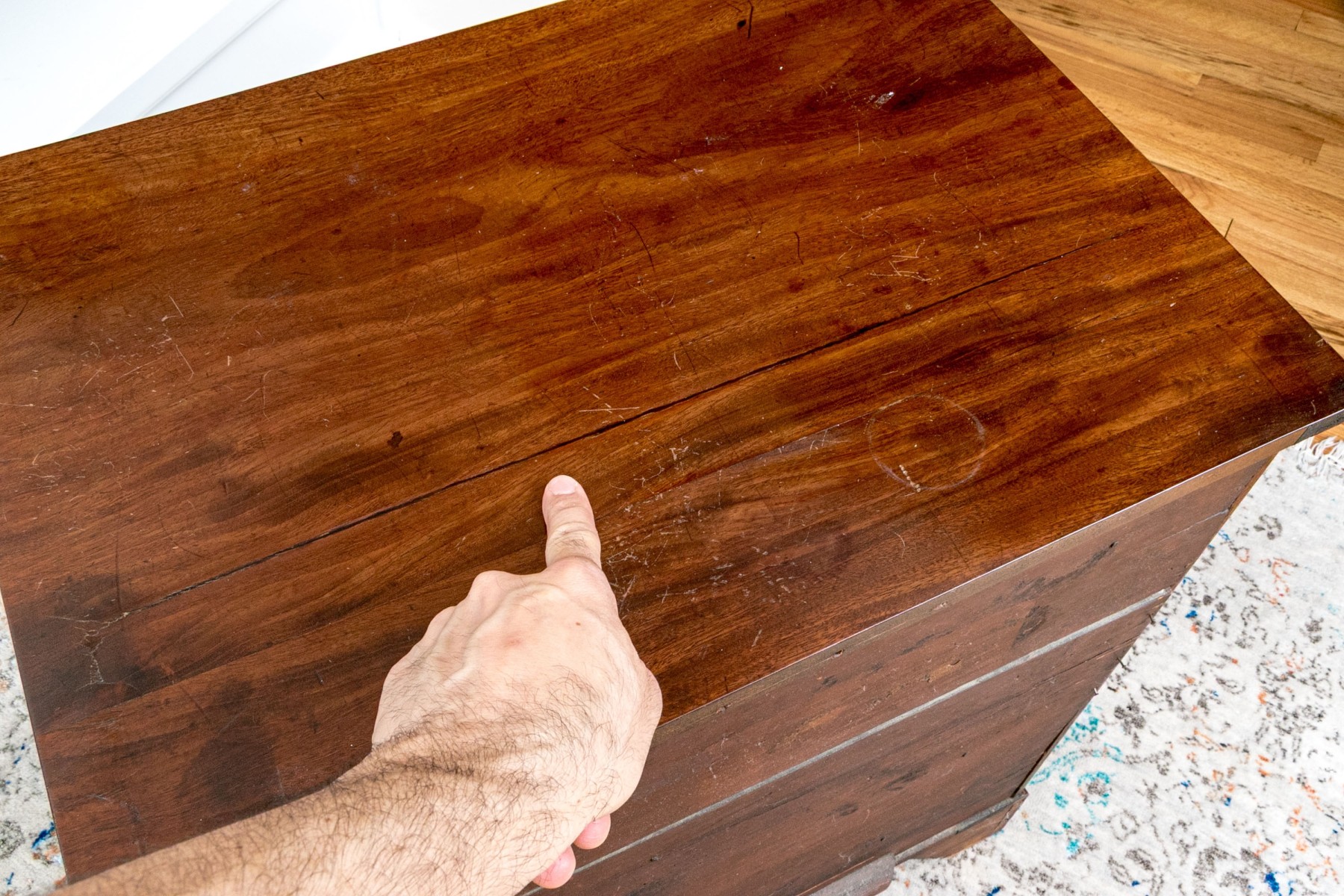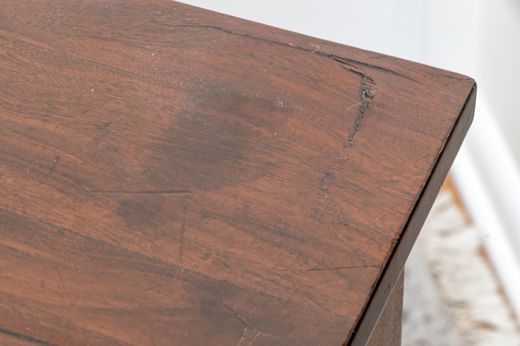 A handsome piece overall with wear commensurate with age and use including checking to the top and back, minor finish wear, scuffs, and nics around the edges.