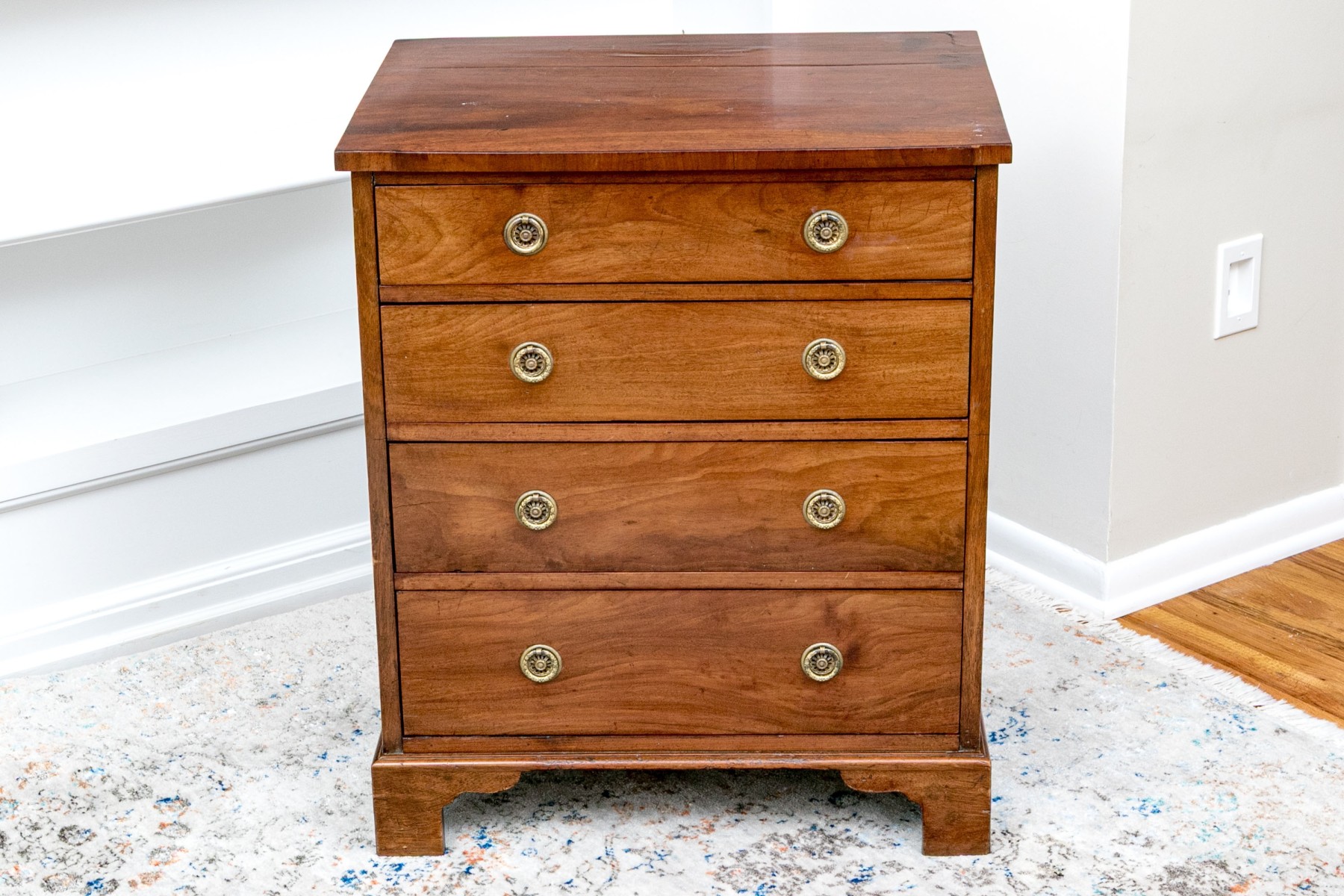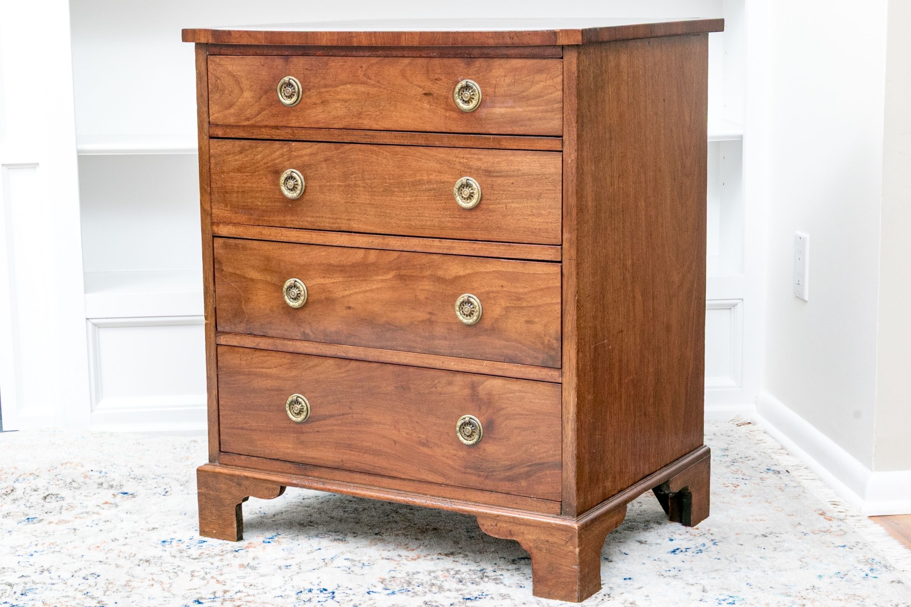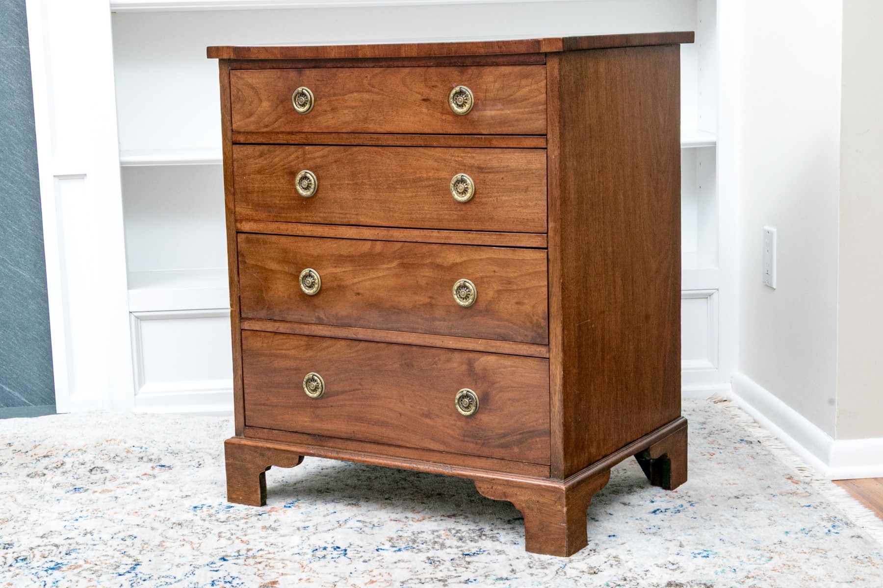 A lovely 19th century diminutive chest of drawers perfect for use as a bedside, end table, or space-saving bachelors chest. Finely crafted in richly hued, warm-toned medium brown mahogany with appealing wood grain. The chest features a simple rectangular top over four graduating drawers with double brass loop handles over rosette plaques, the whole raised on bracket feet with excellent Chippendale or Georgian charm.