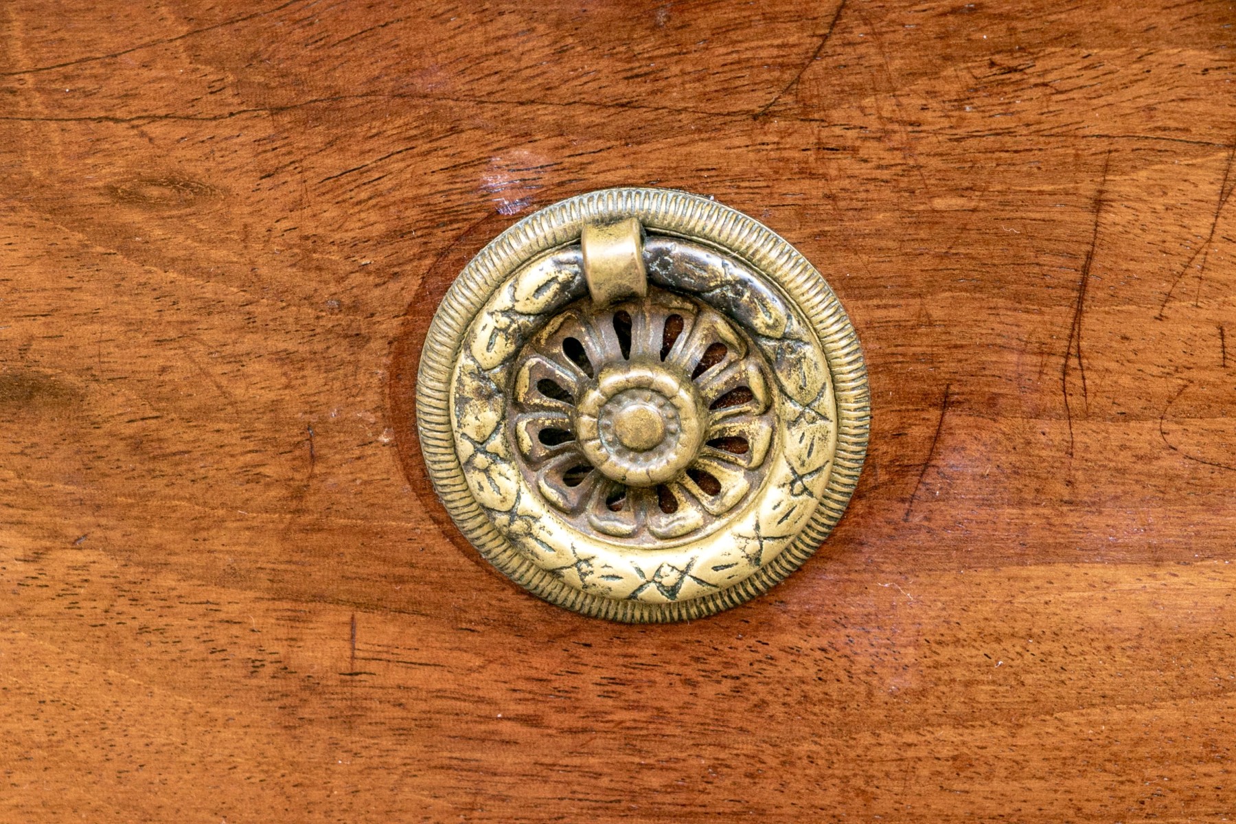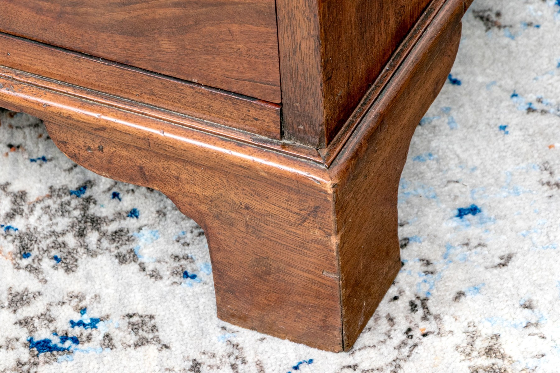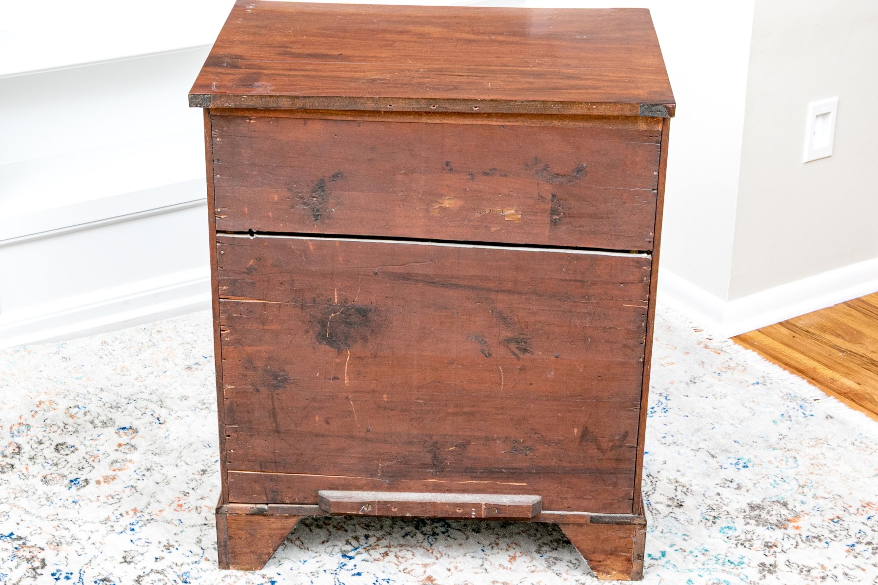 A lovely 19th century diminutive chest of drawers perfect for use as a bedside, end table, or space-saving bachelors chest. Finely crafted in richly hued, warm-toned medium brown mahogany with appealing wood grain. The chest features a simple rectangular top over four graduating drawers with double brass loop handles over rosette plaques, the whole raised on bracket feet with excellent Chippendale or Georgian charm.