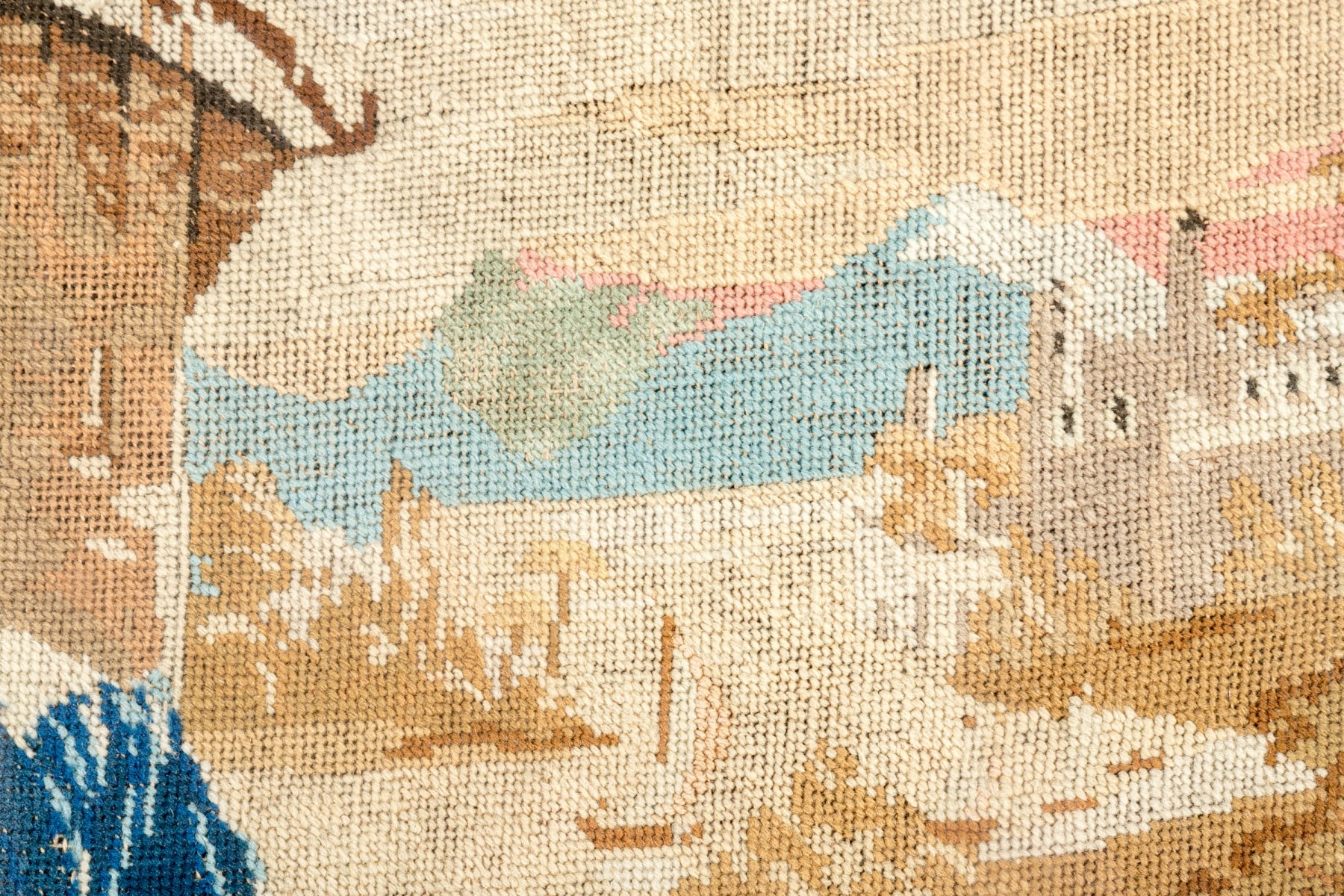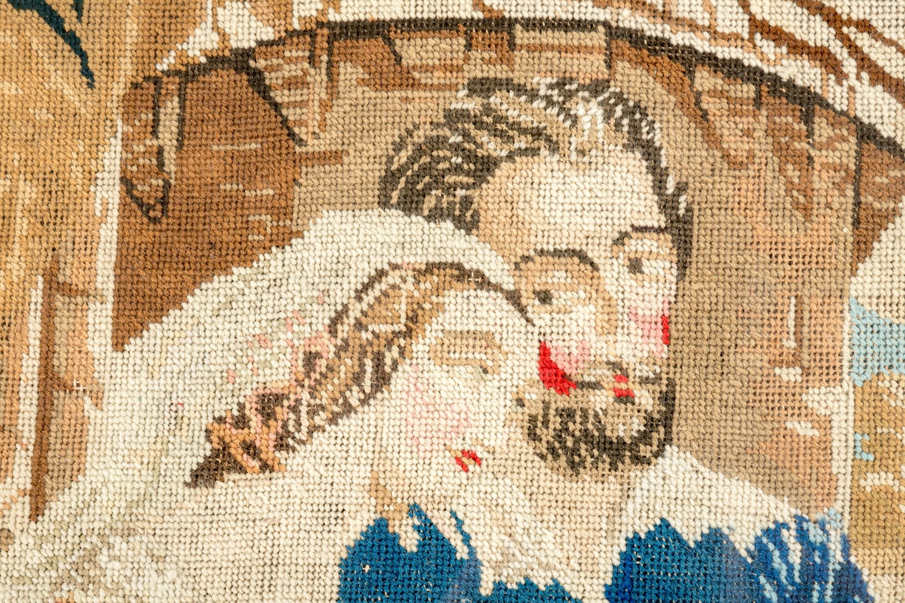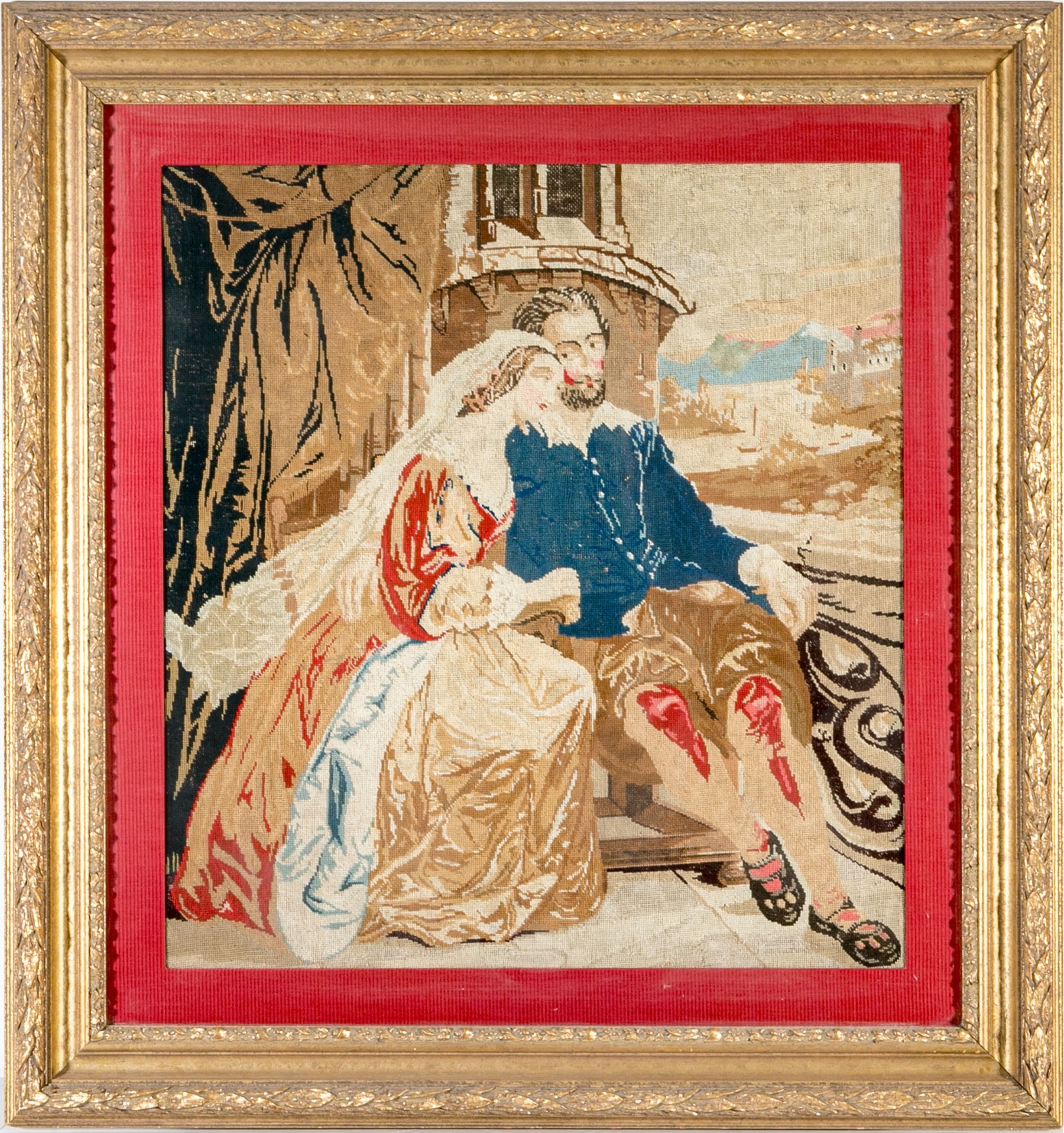 A wonderfully crafted antique 19th C. needlepoint genre scene depicting a man and woman seating in loving embrace upon an architectural balcony with a wonderful landscape abound.