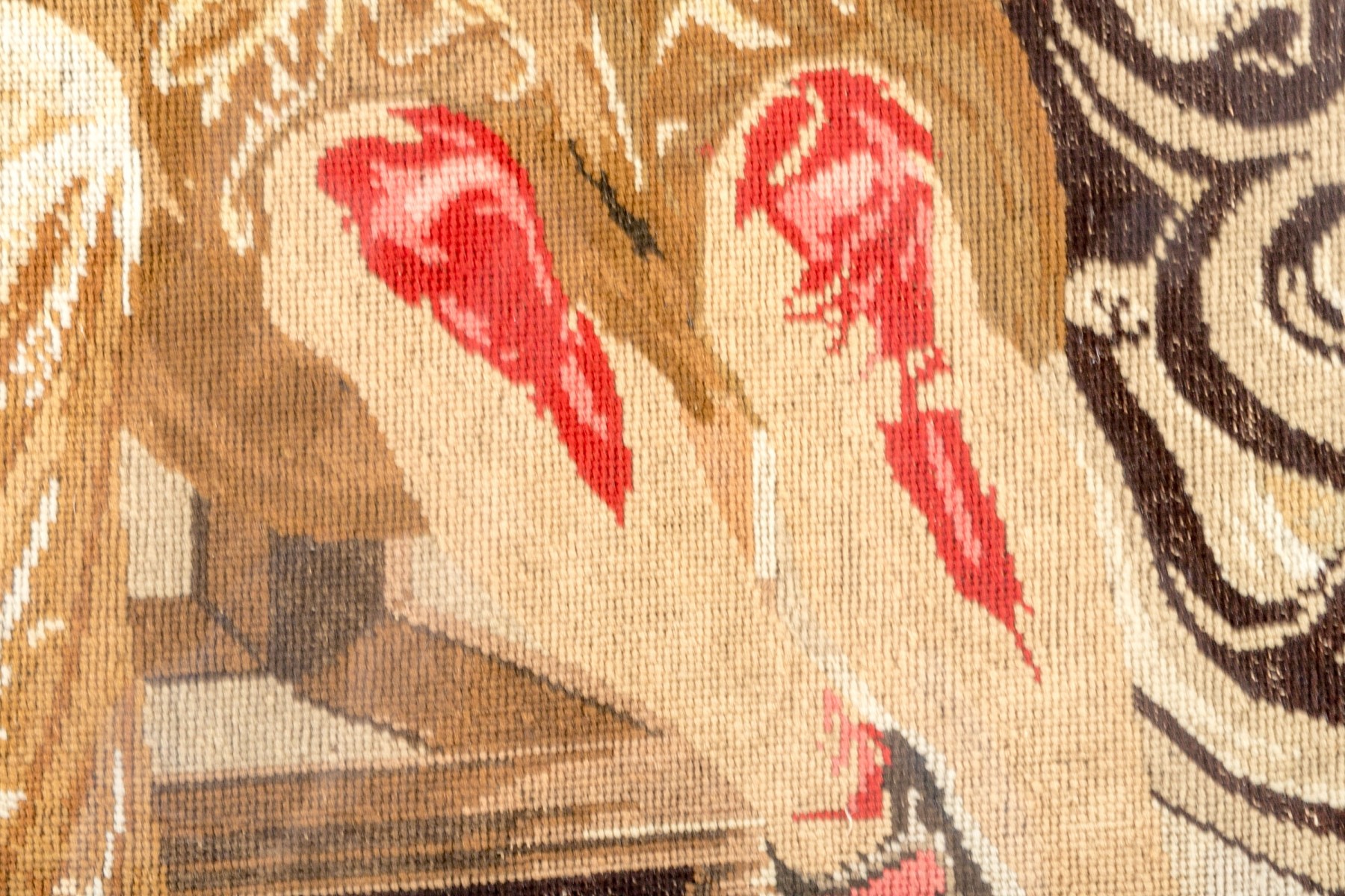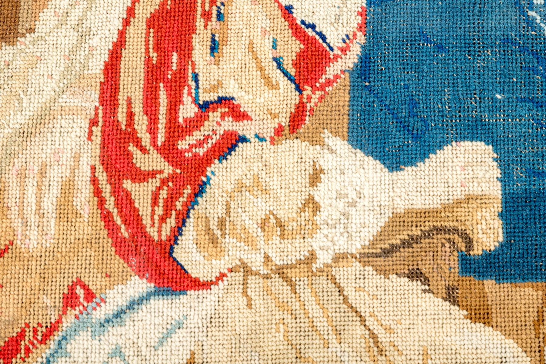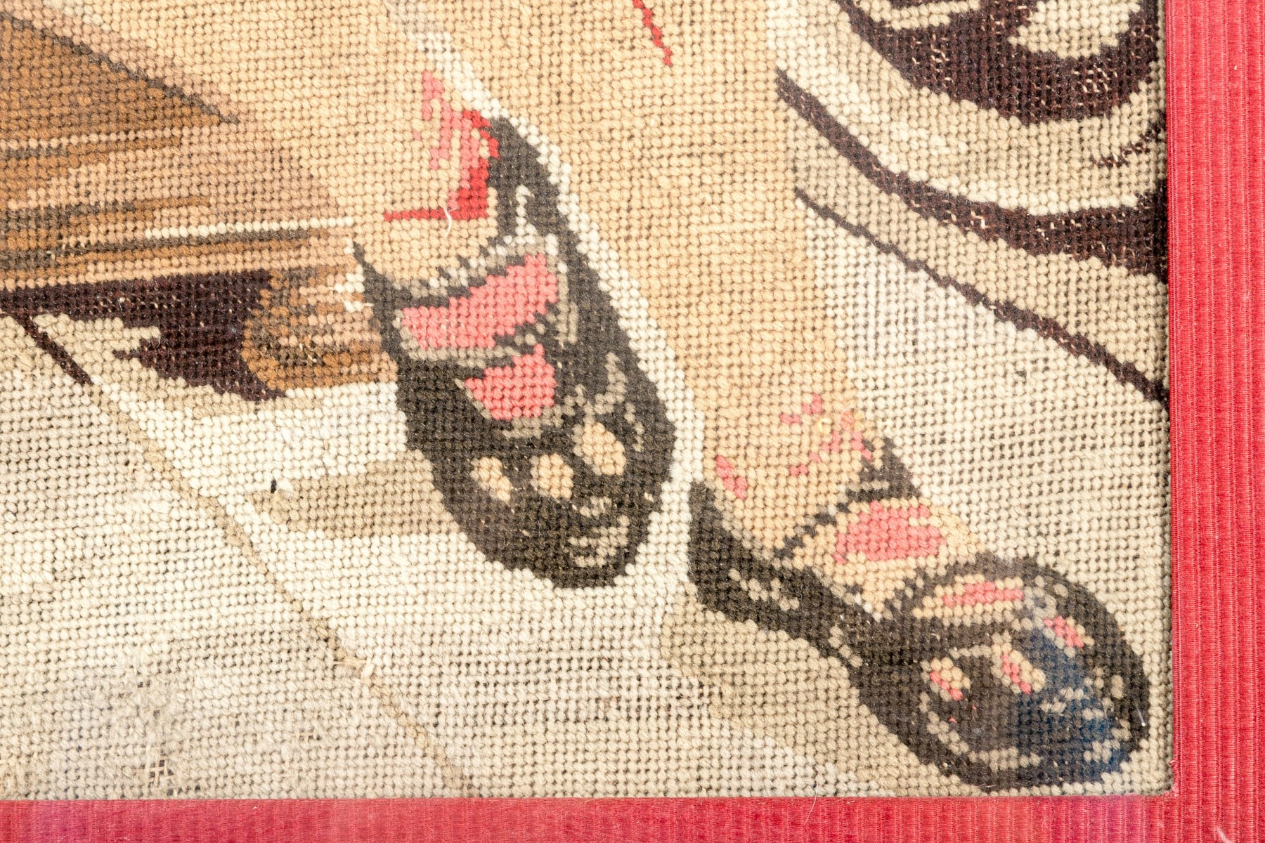 A wonderfully crafted antique 19th C. needlepoint genre scene depicting a man and woman seating in loving embrace upon an architectural balcony with a wonderful landscape abound.