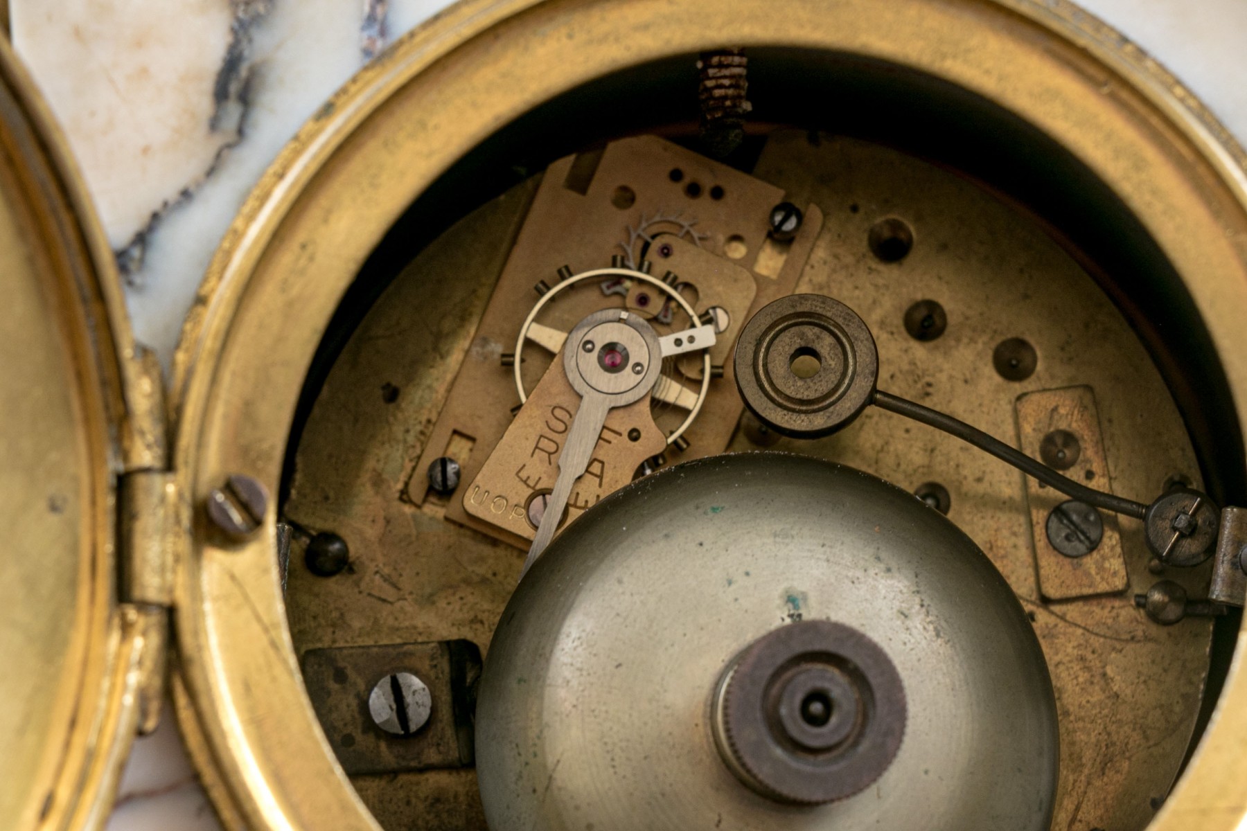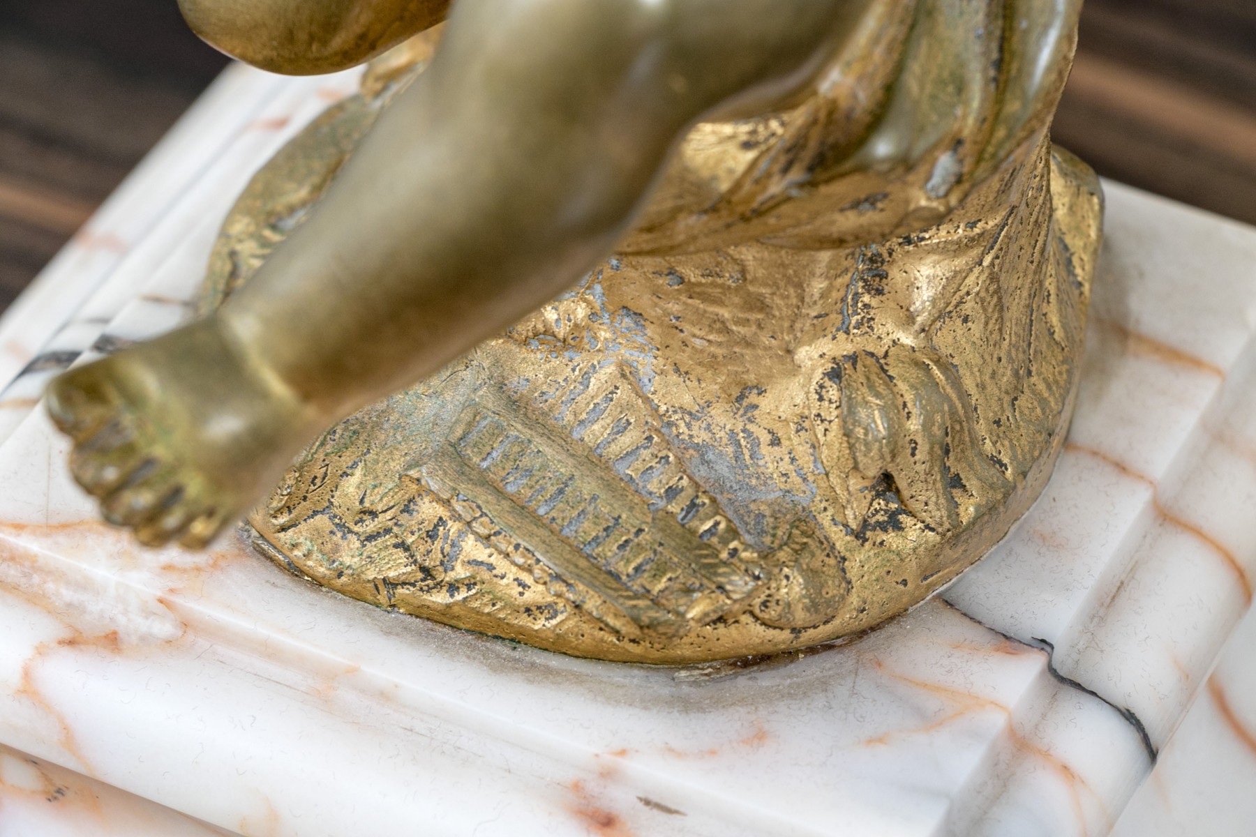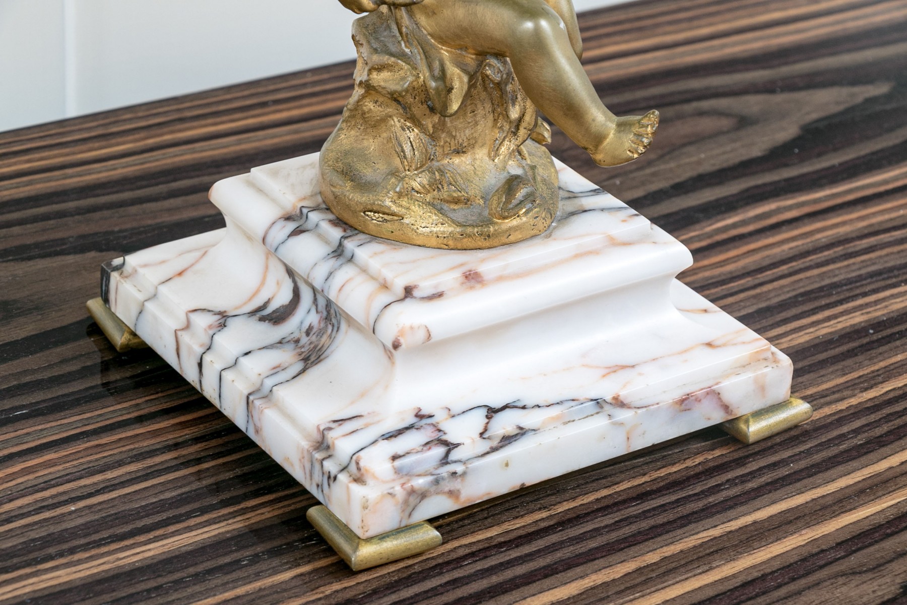 Condition: No key present, not tested on site. Presents exceptionally well overall with minor wear to the gilding and one of the mounted feet underneath the marble base is loose and needs to be re-affixed.