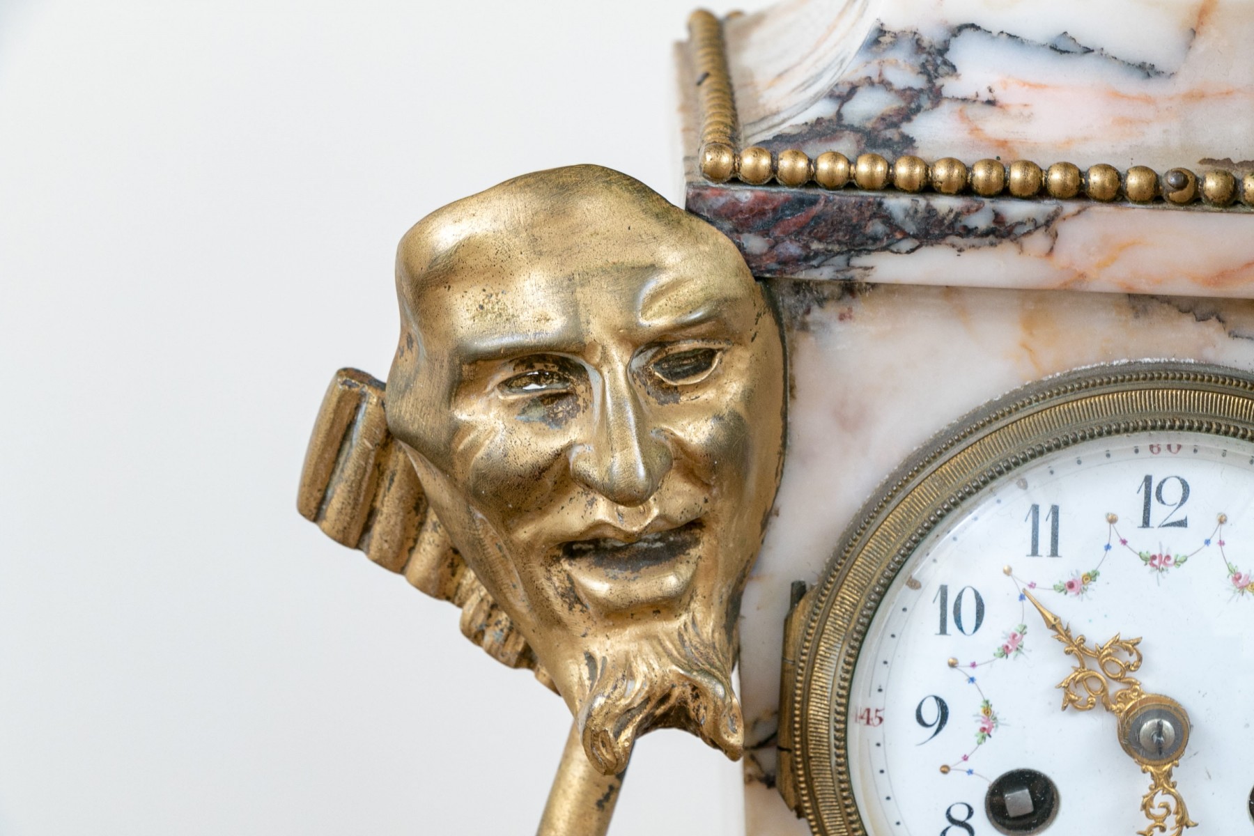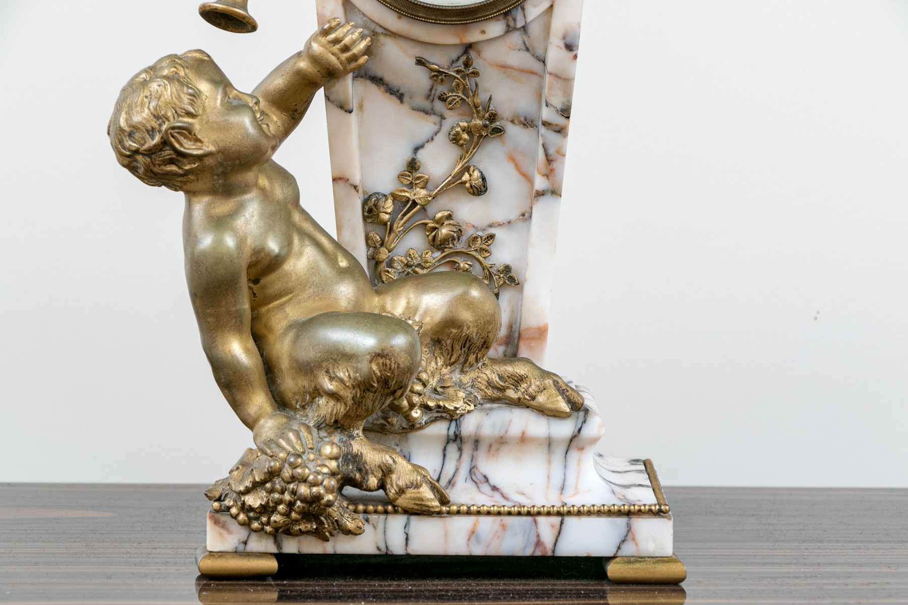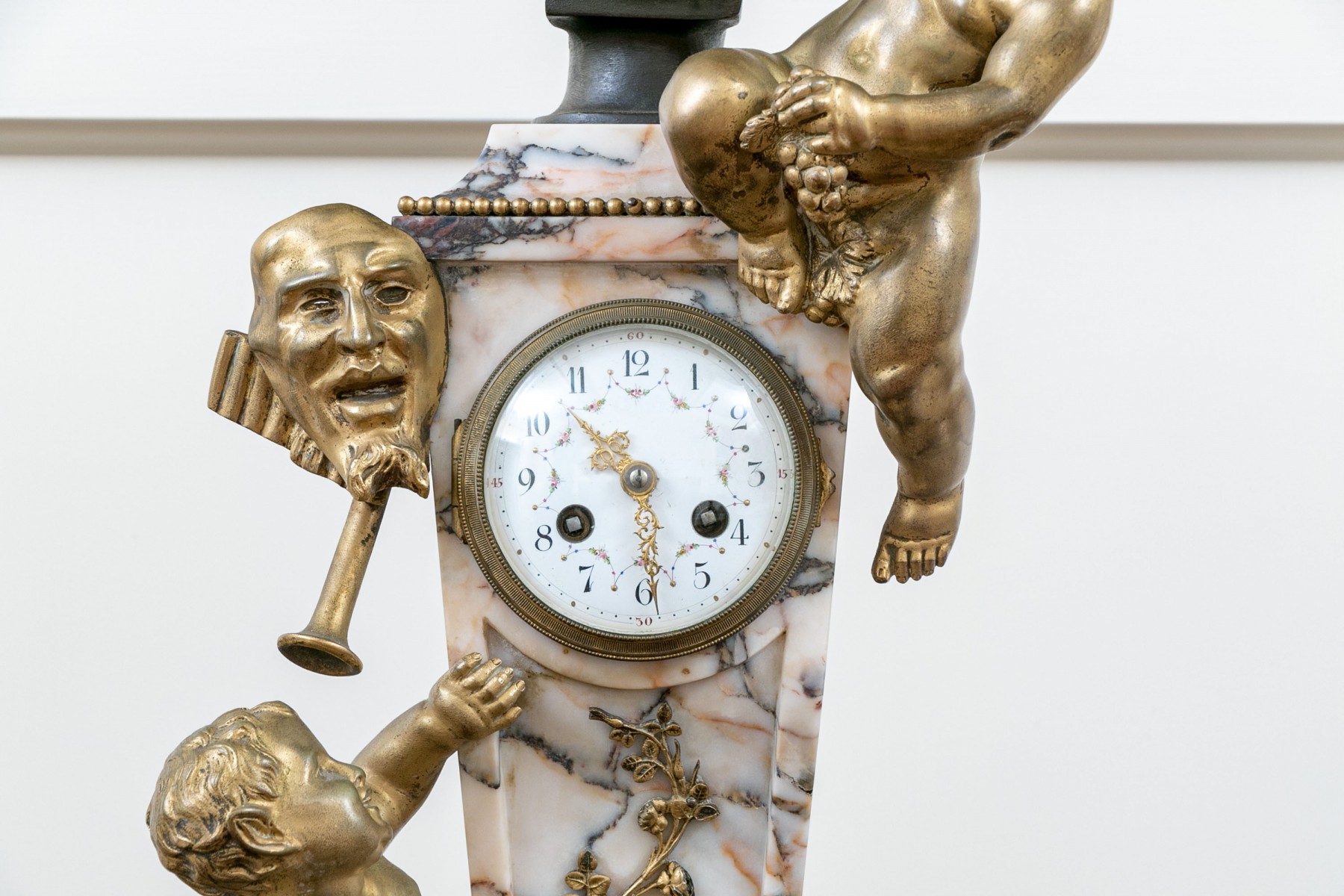 Wonderfully comprised of a mantle clock, mounted in a marble pedestal with striking movement. The clock's pedestal is wonderfully embellished with a bust of a satyr along with two cherubs.
