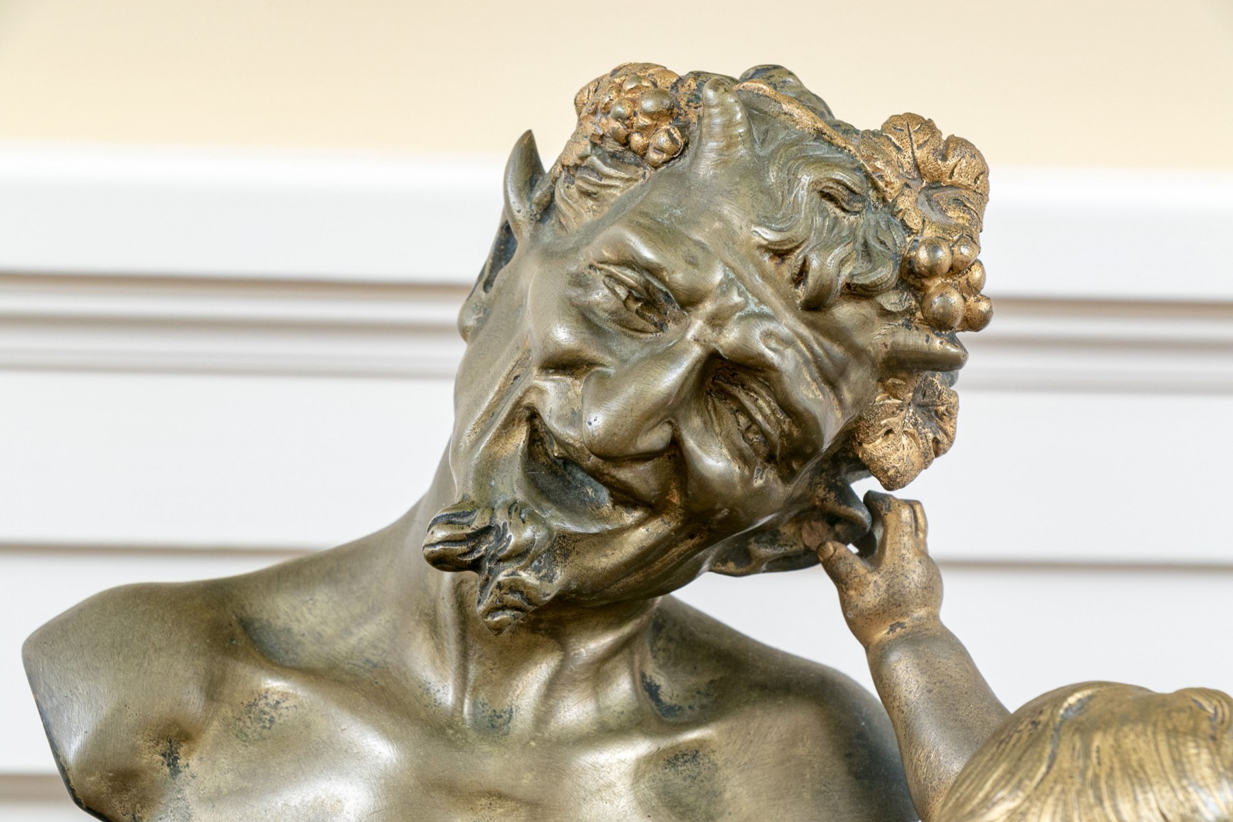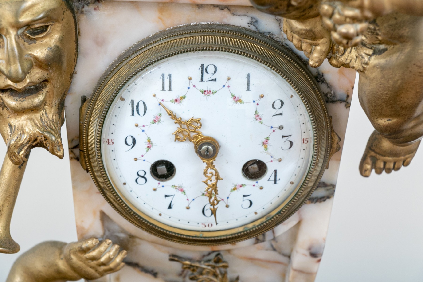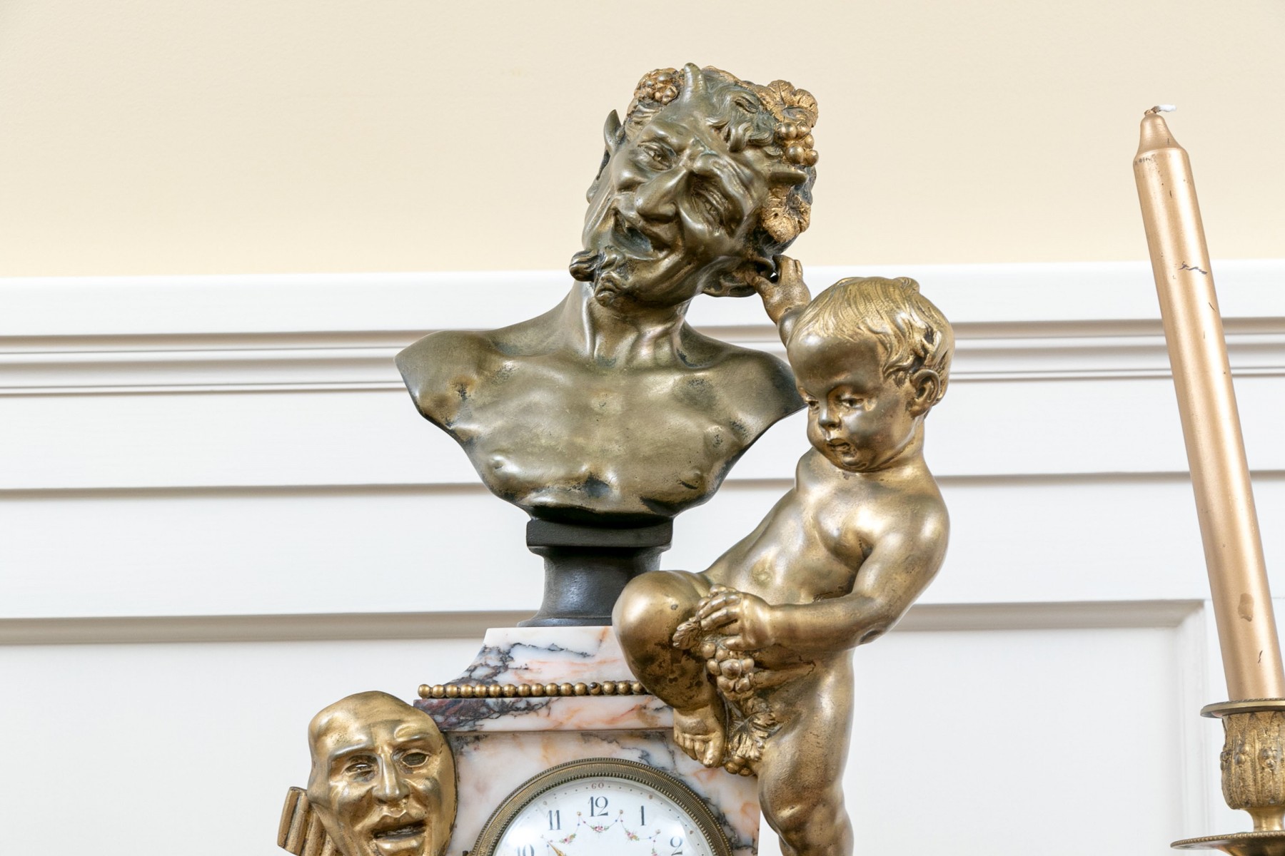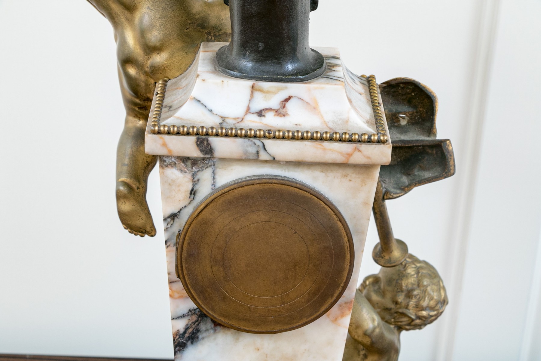 Wonderfully comprised of a mantle clock, mounted in a marble pedestal with striking movement. The clock's pedestal is wonderfully embellished with a bust of a satyr along with two cherubs.