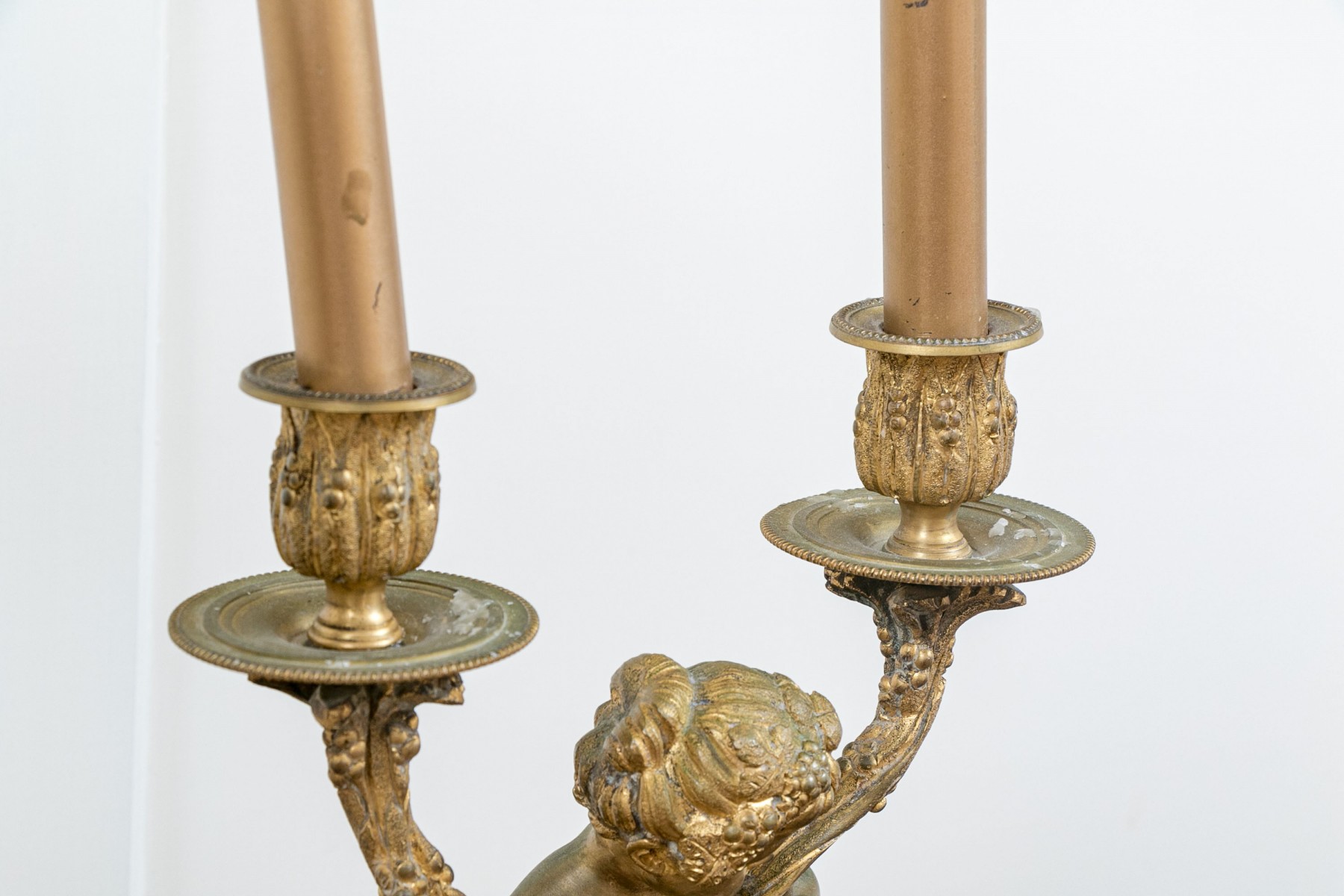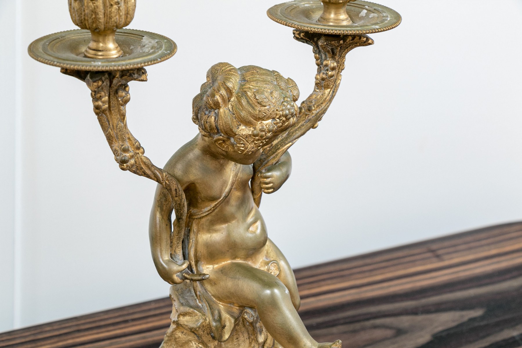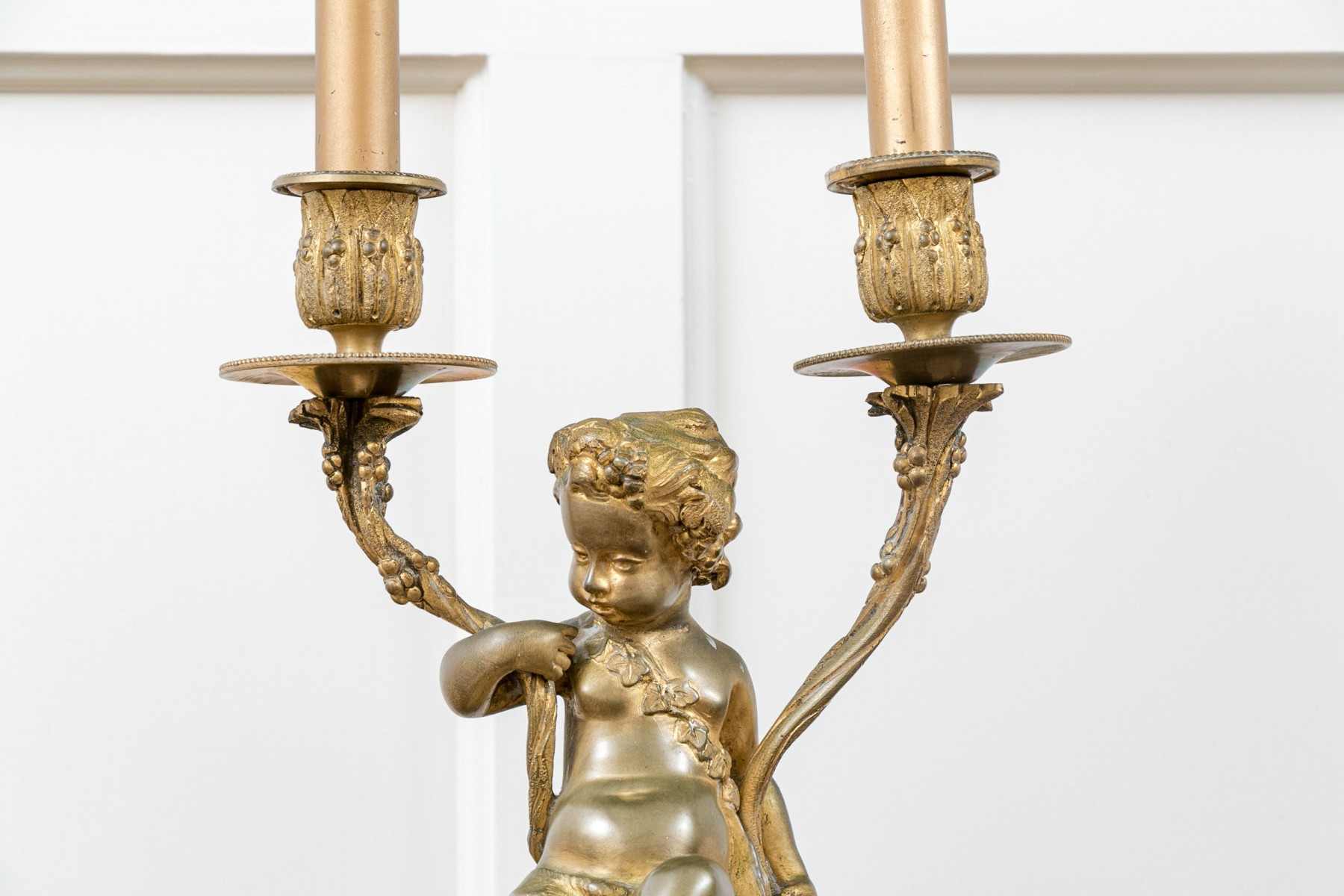 Together with the clock is the pair of twin branch candelabra, Each appear to be supported by a seated cherub on stepped marble bases.