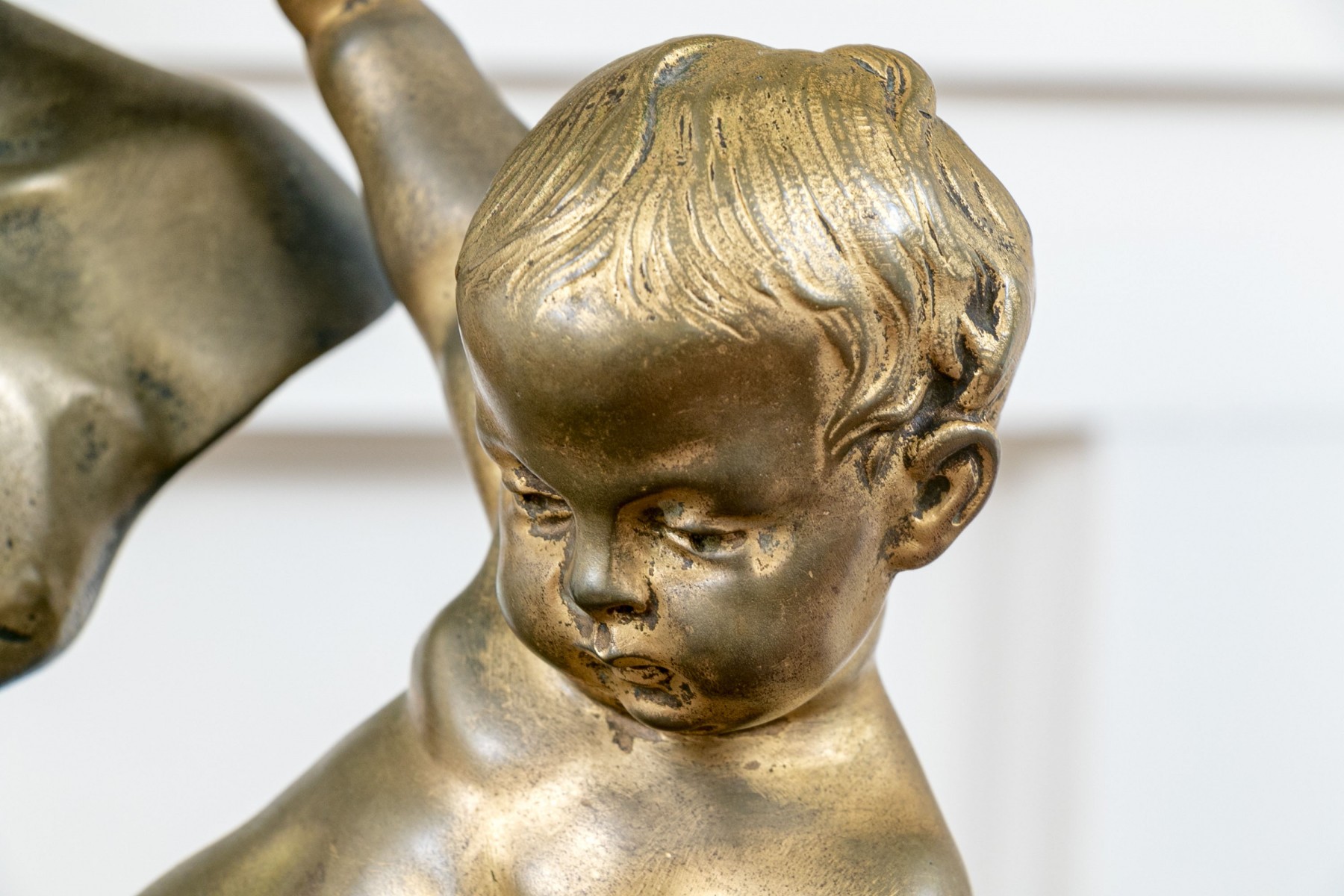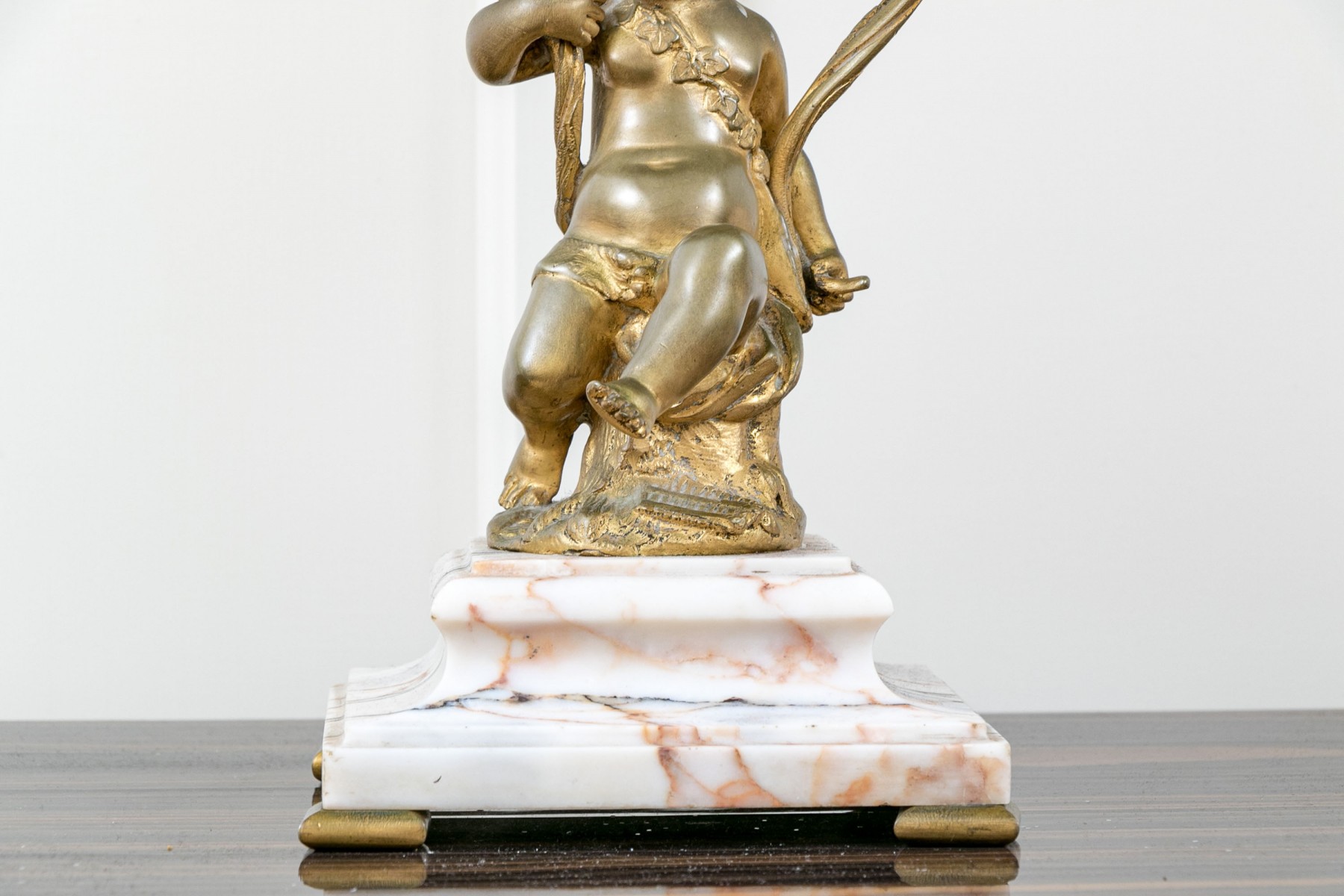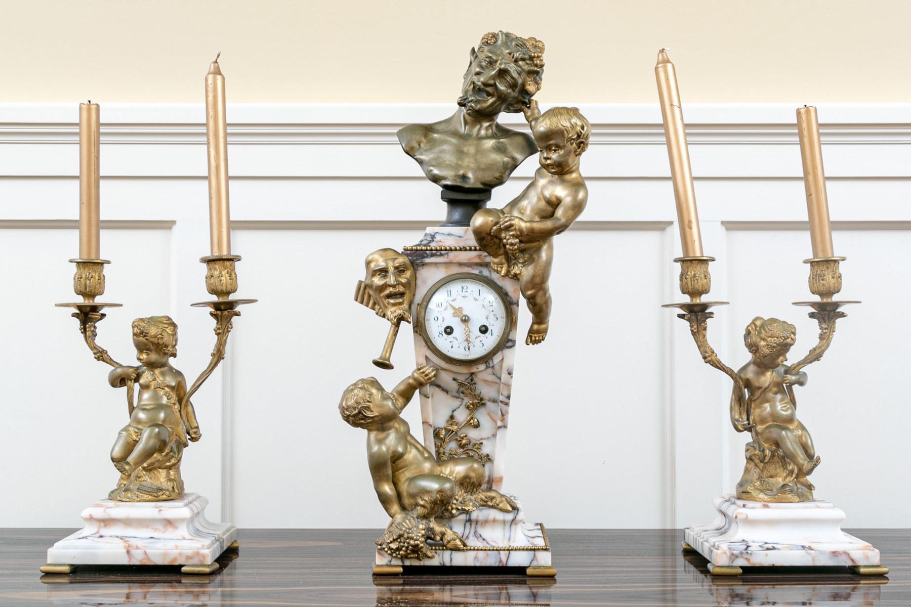 Together with the clock is the pair of twin branch candelabra, Each appear to be supported by a seated cherub on stepped marble bases.
