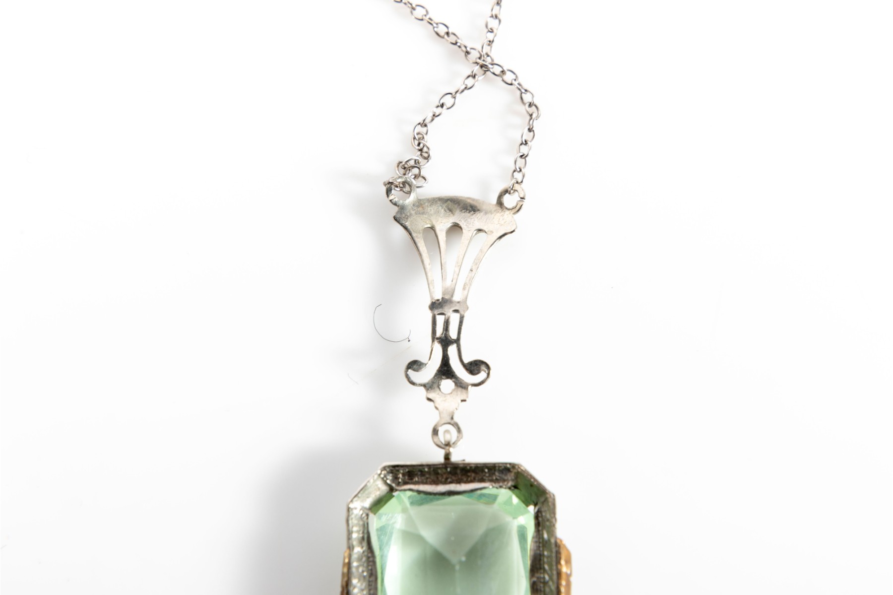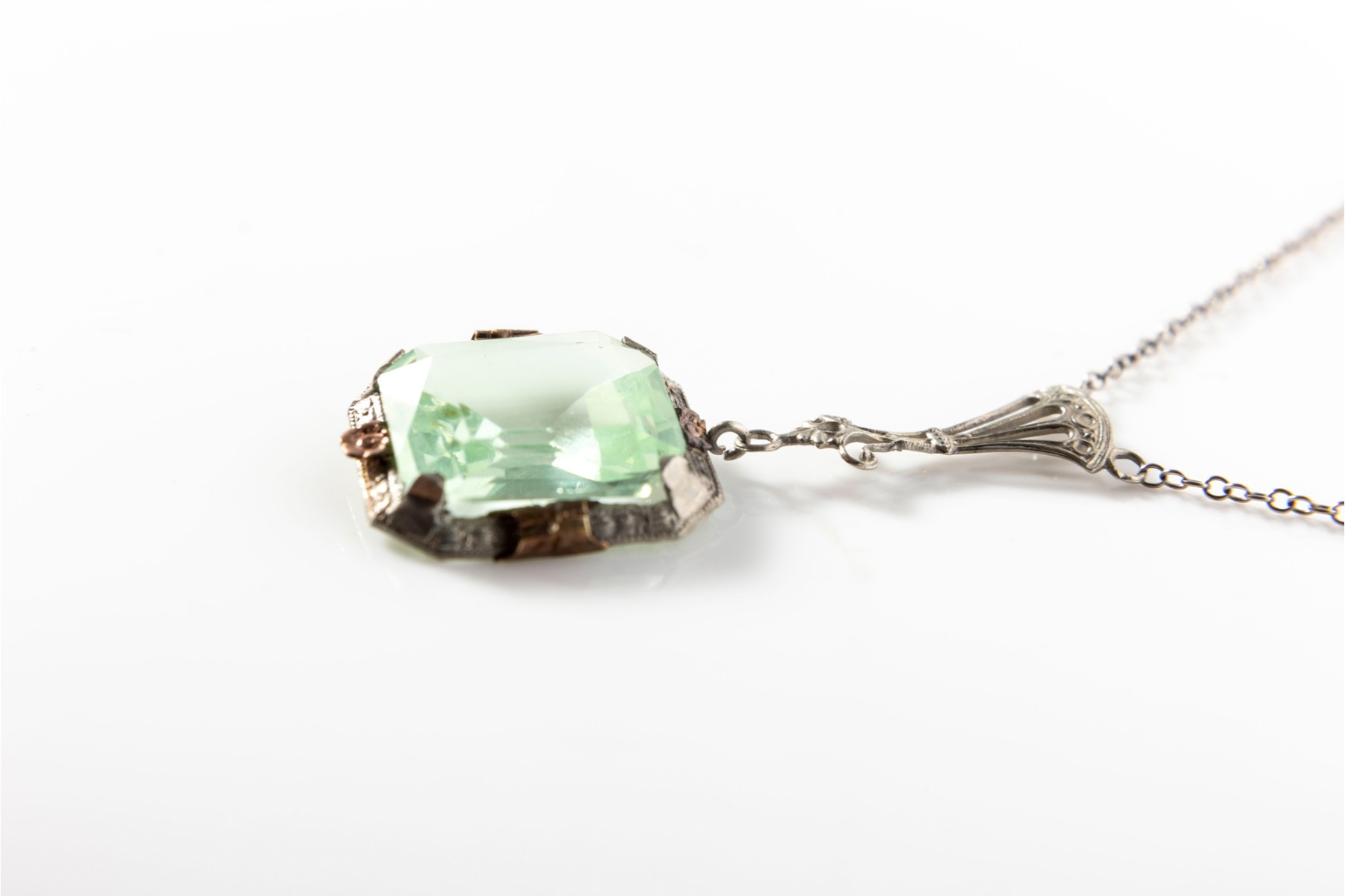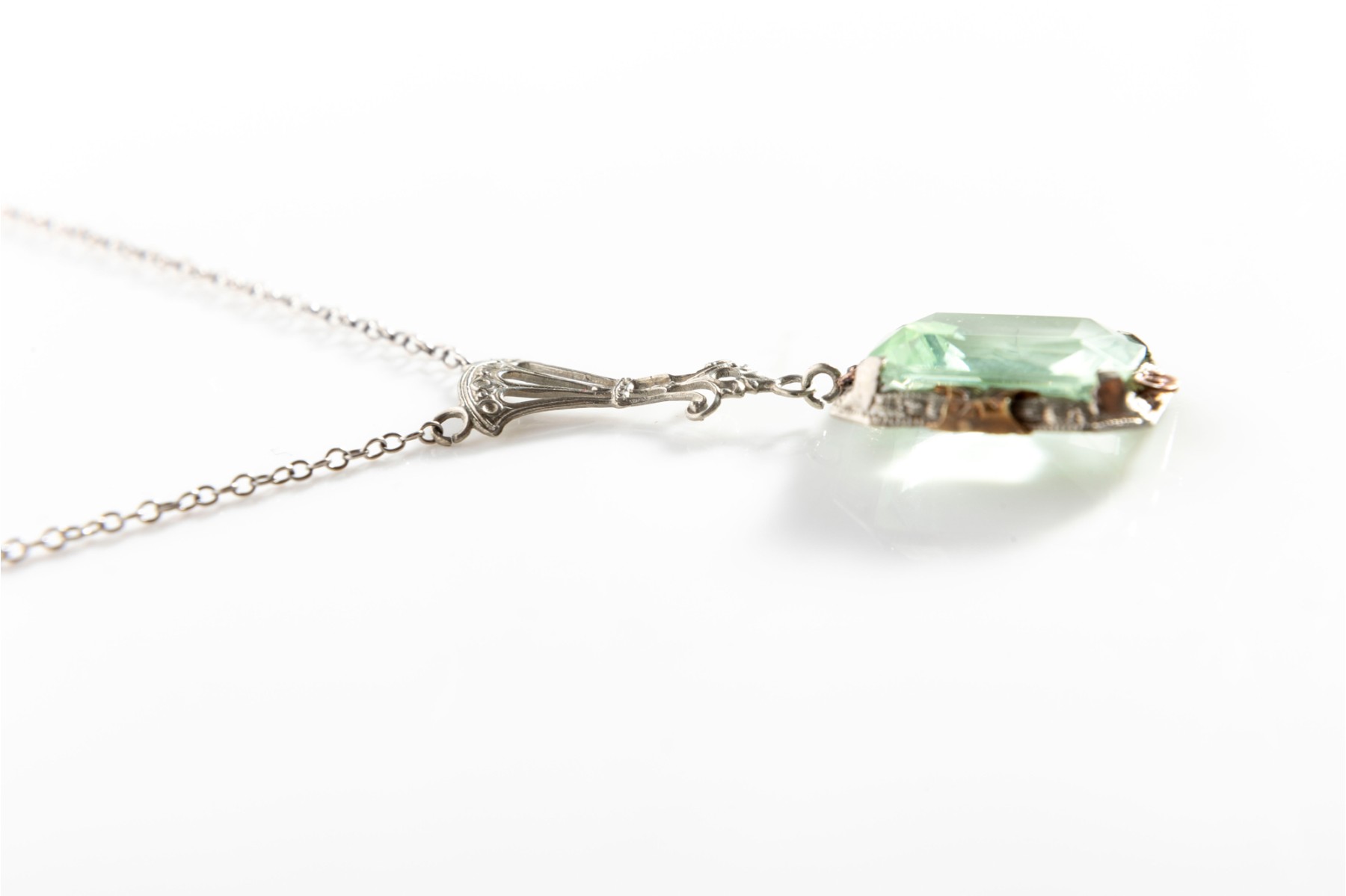An antique 9K white gold necklace. The centered pendant is set between cable link chains and set with a rectangular faceted uranium glass piece. Spring ring clasp.