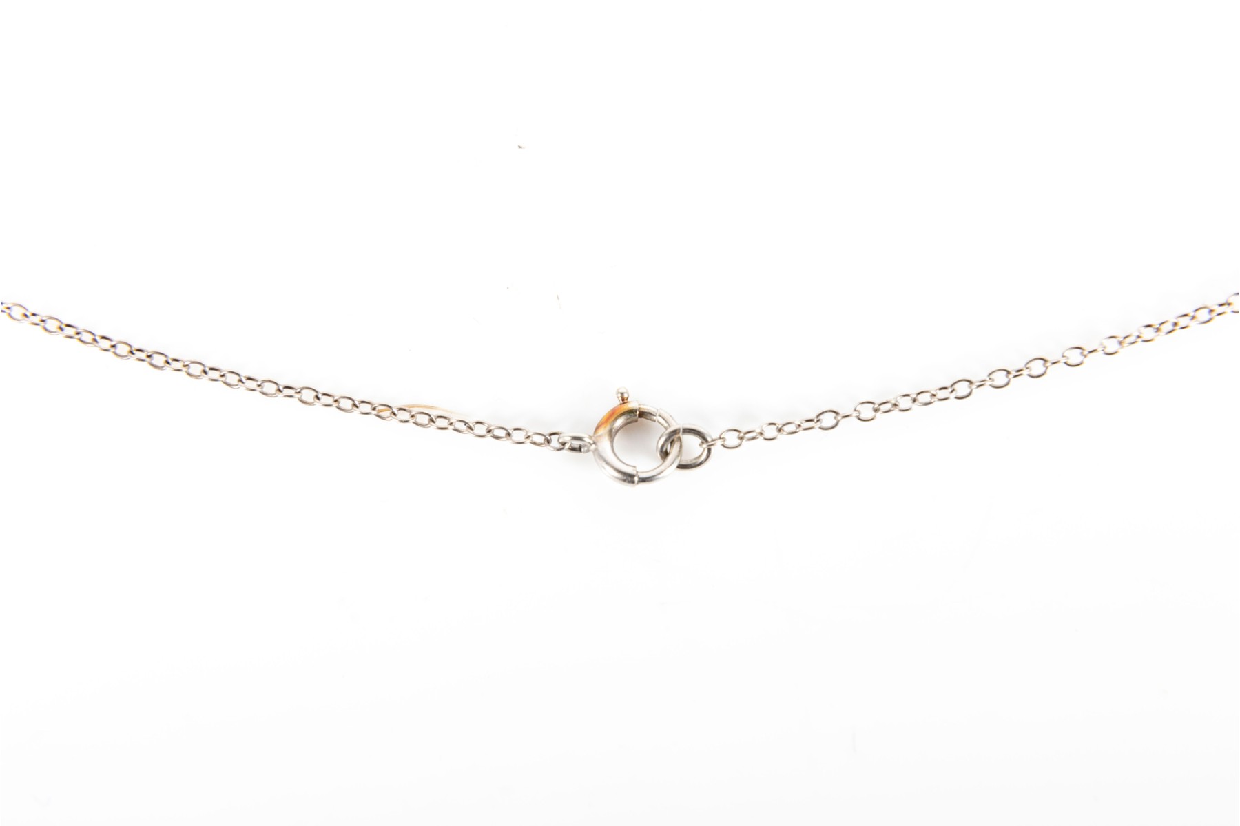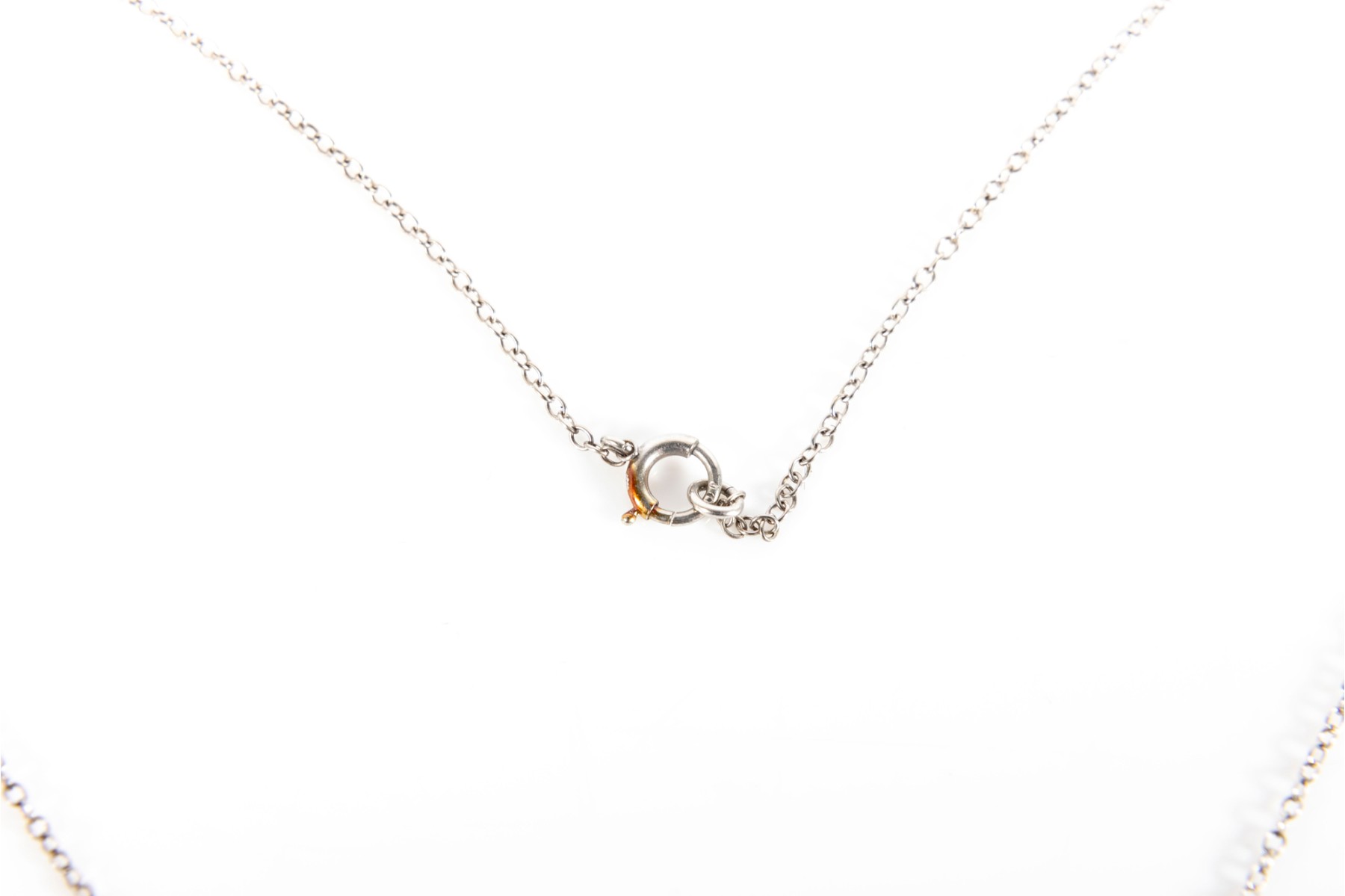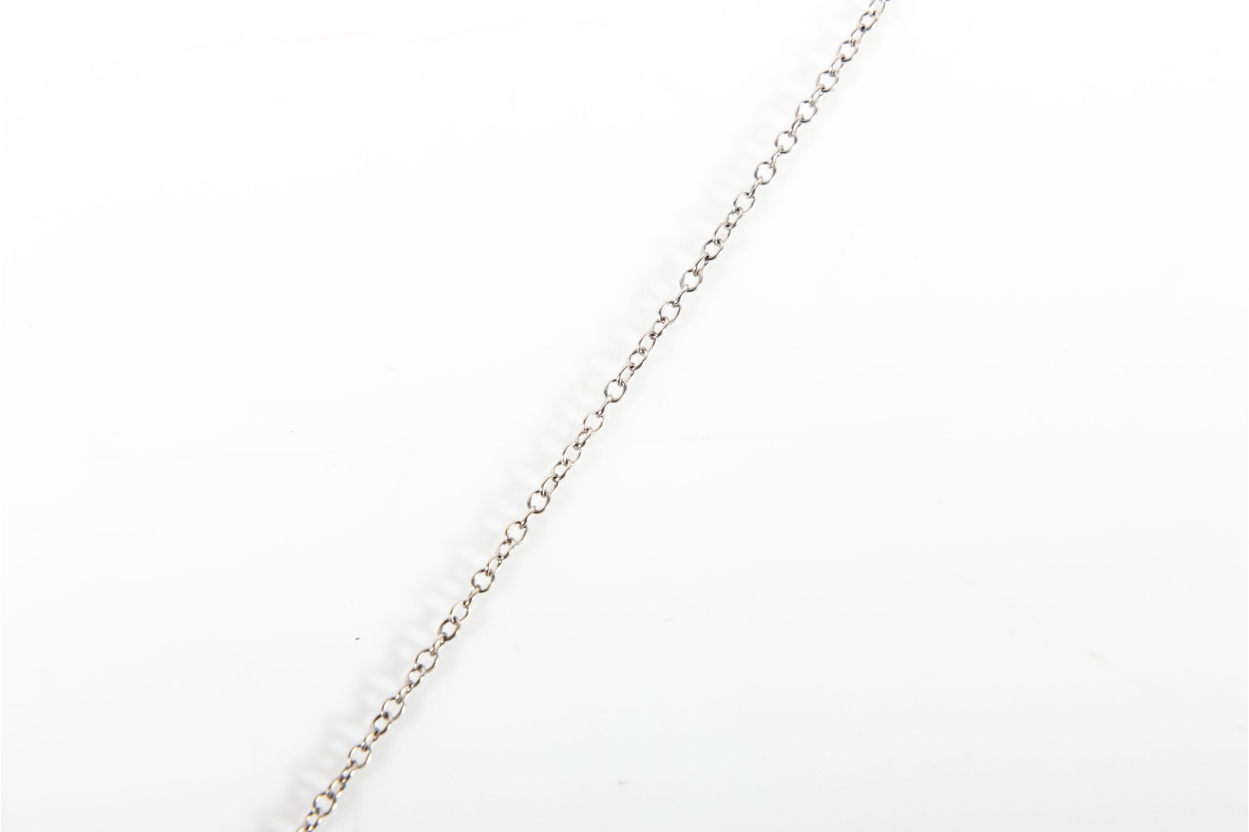 An antique 9K white gold necklace. The centered pendant is set between cable link chains and set with a rectangular faceted uranium glass piece. Spring ring clasp.