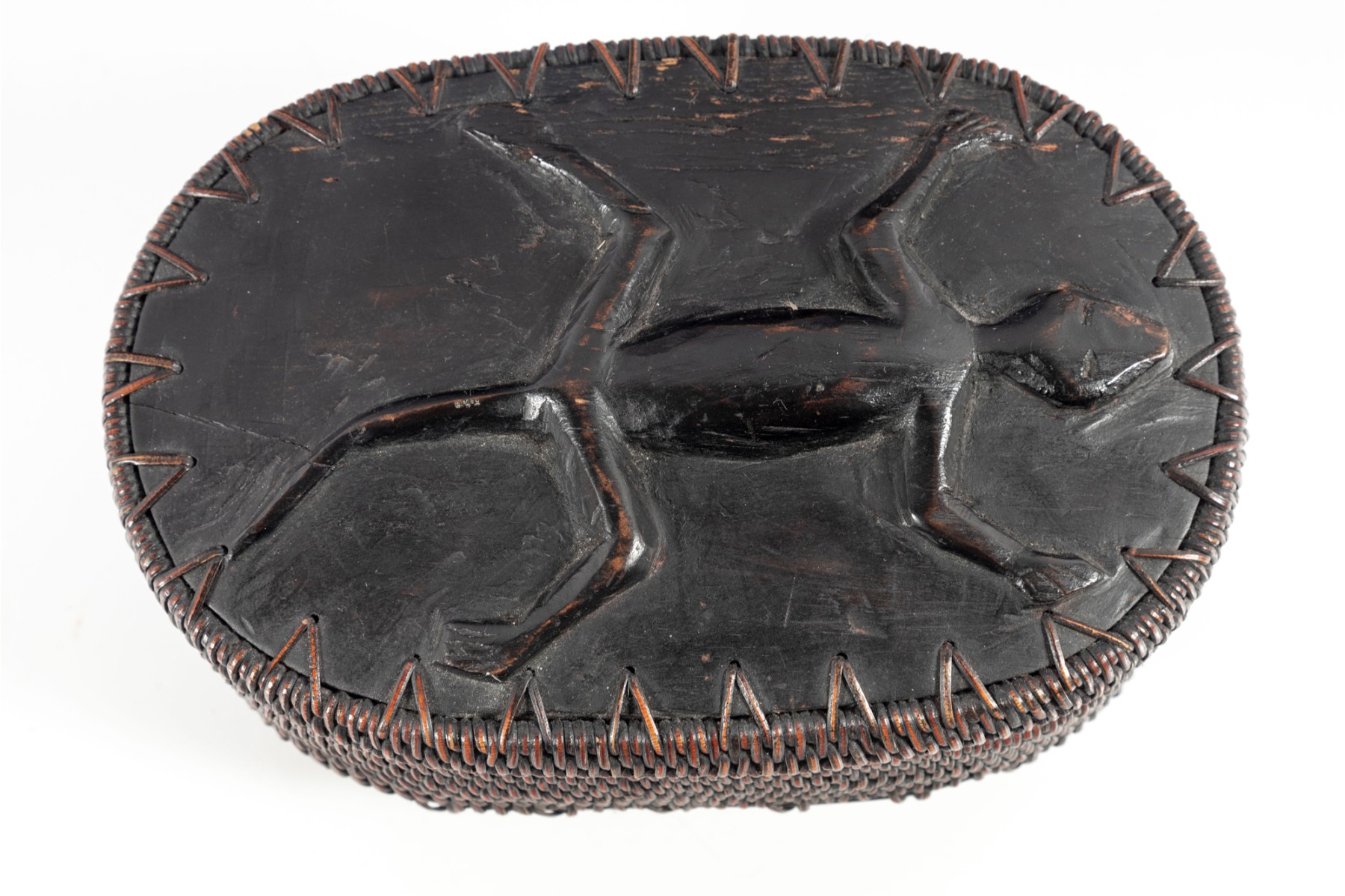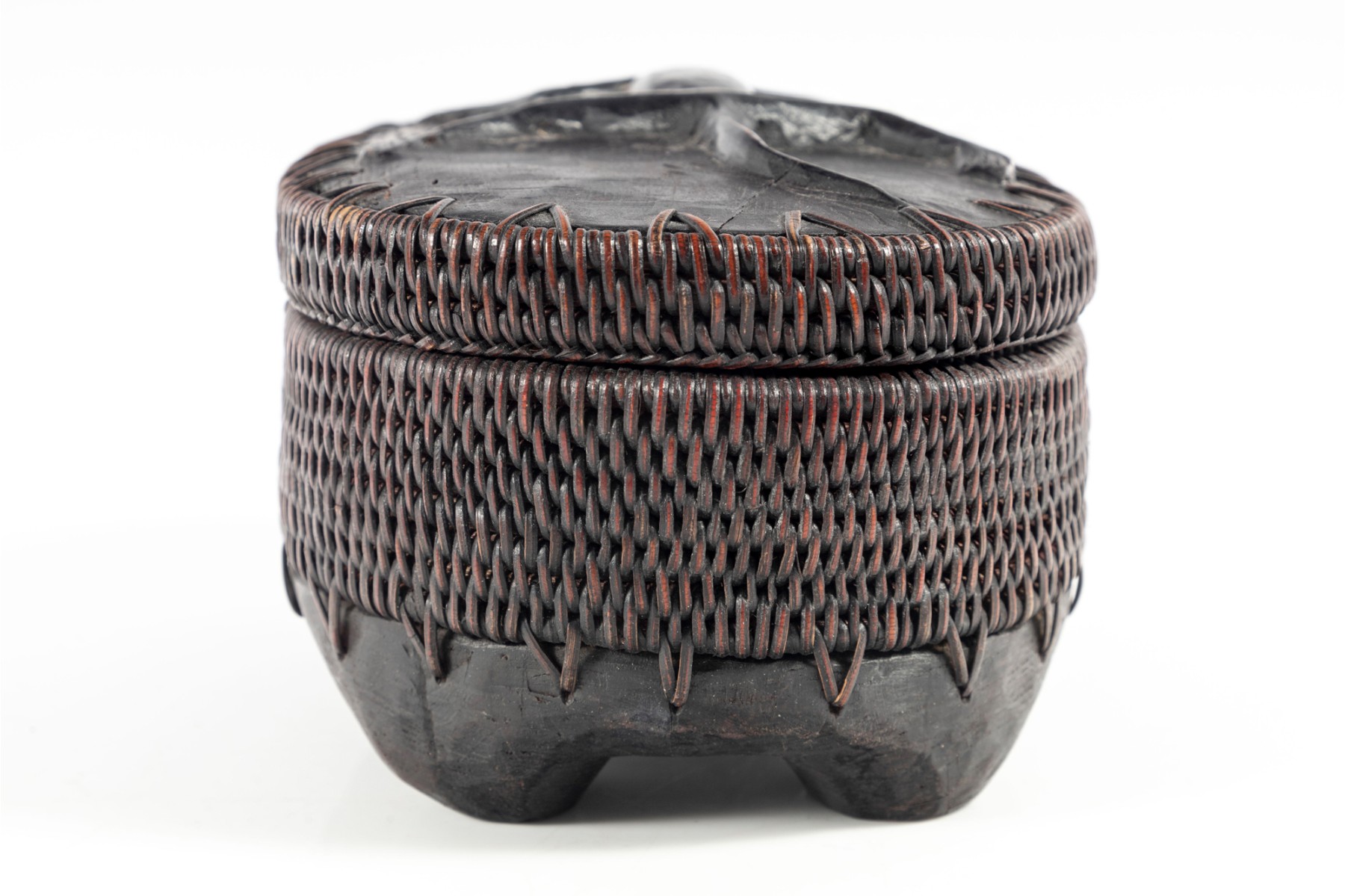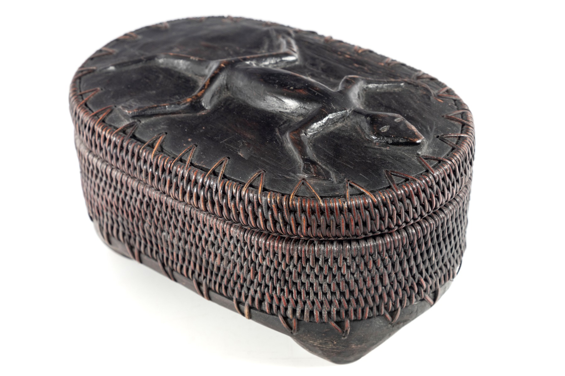A wooden folk art capsule with carved salamander relief. The wood is bound together with dense rattan -- African in origin.