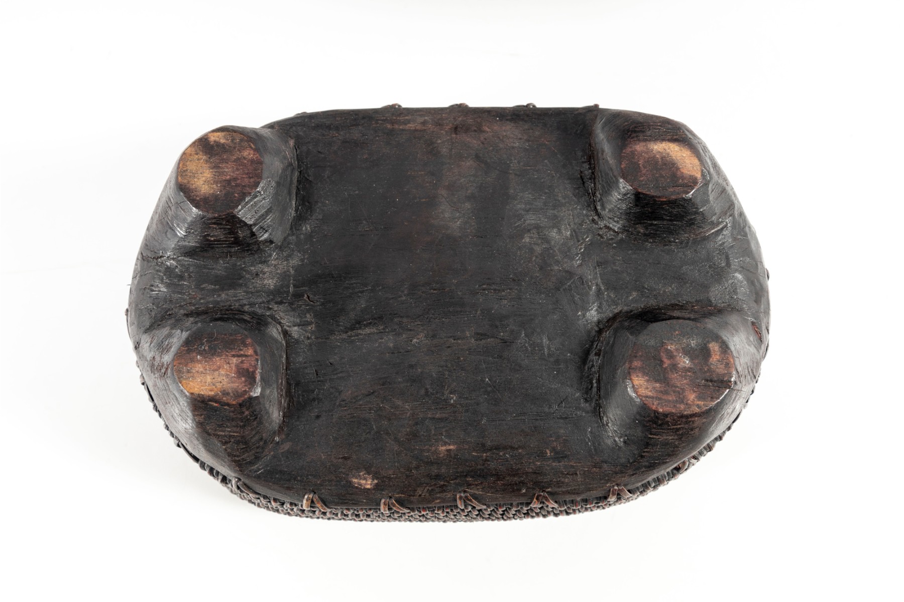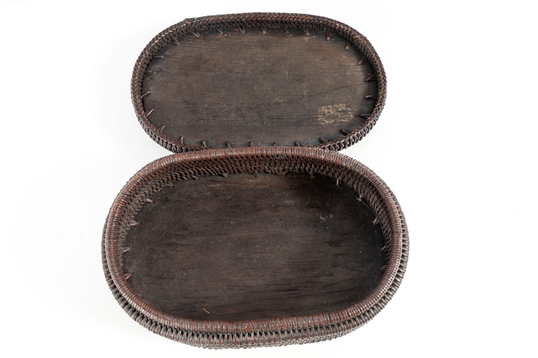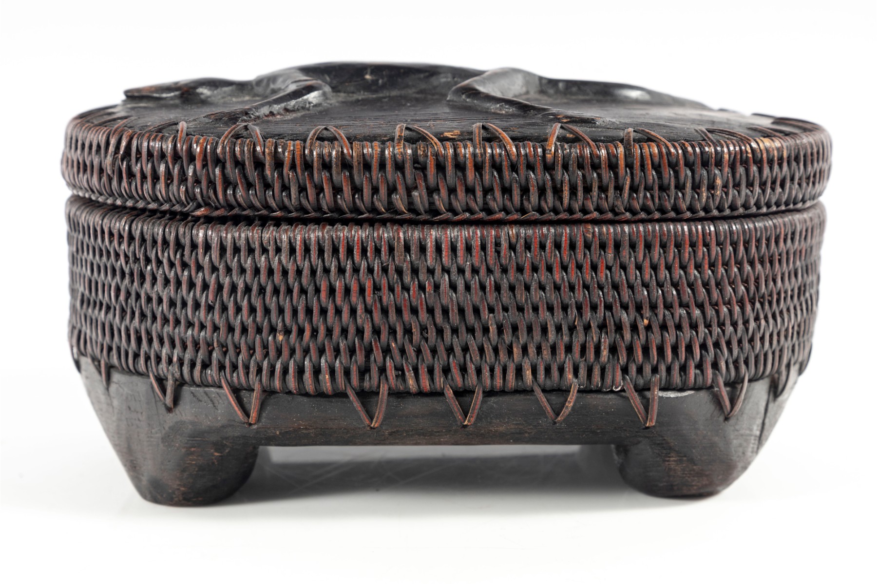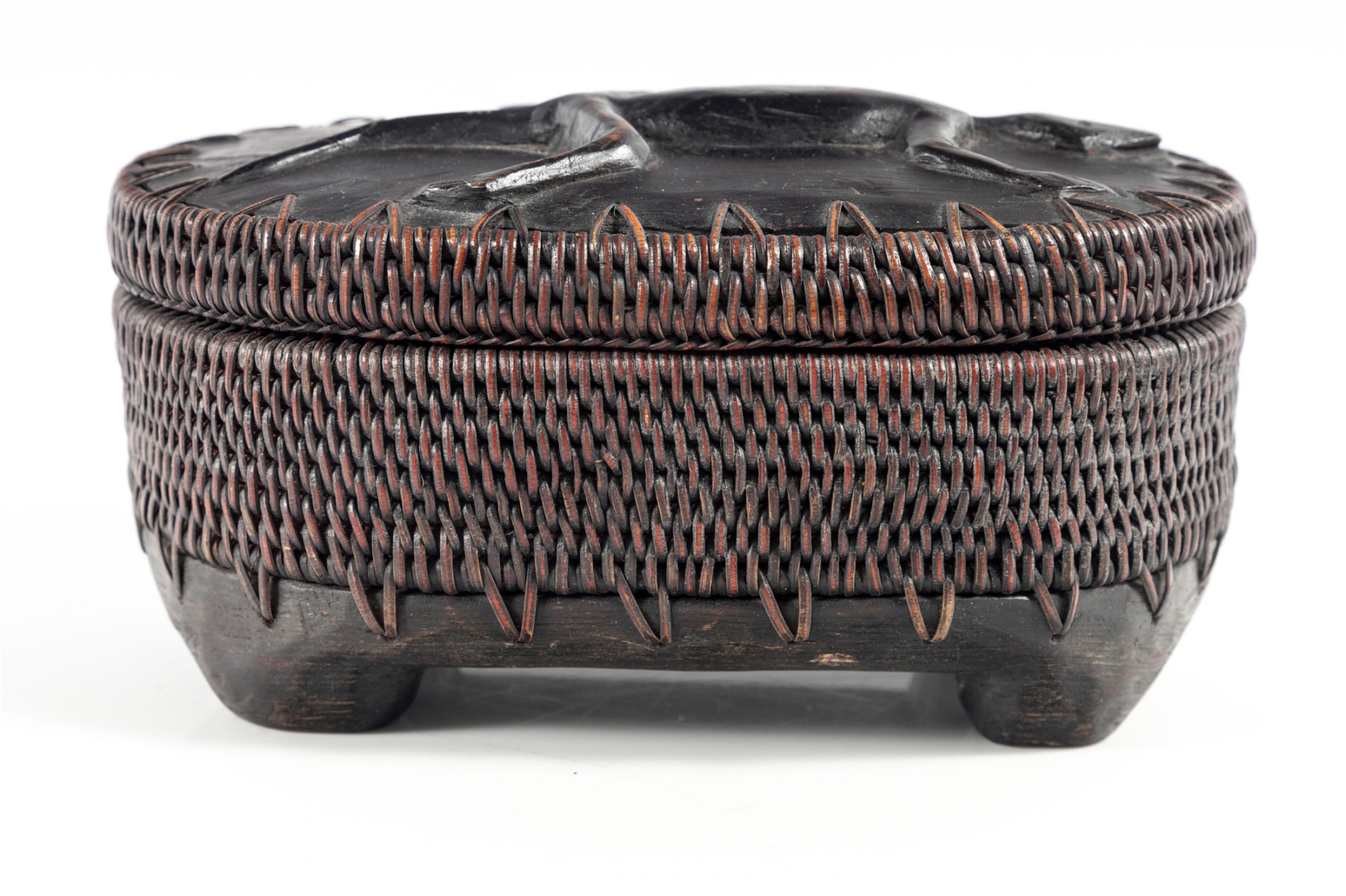 A wooden folk art capsule with carved salamander relief. The wood is bound together with dense rattan -- African in origin.