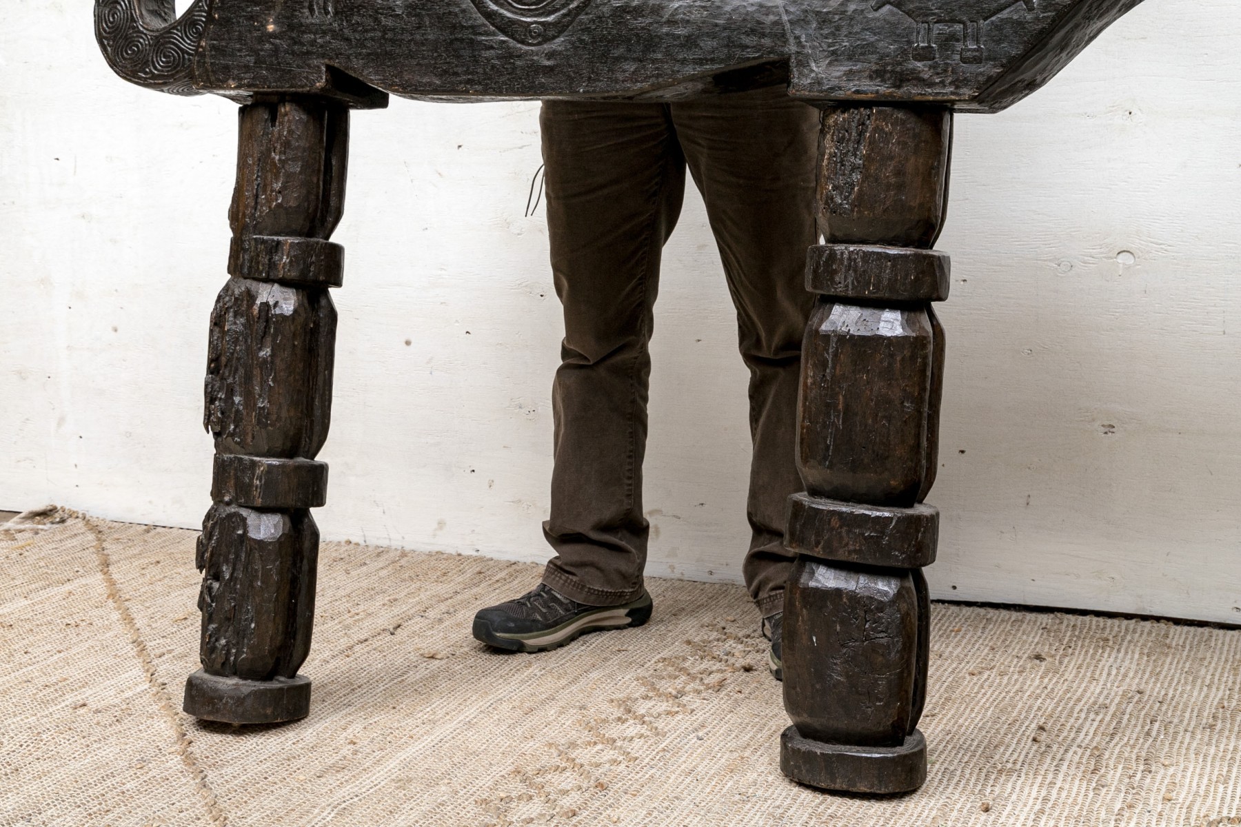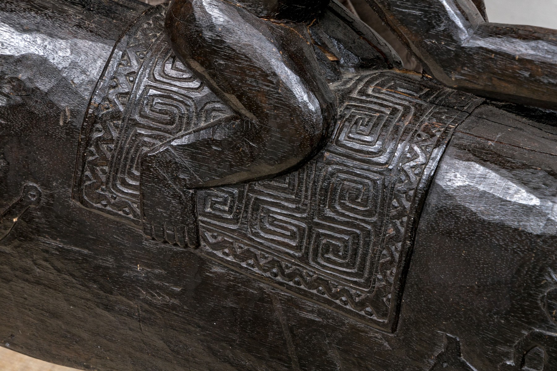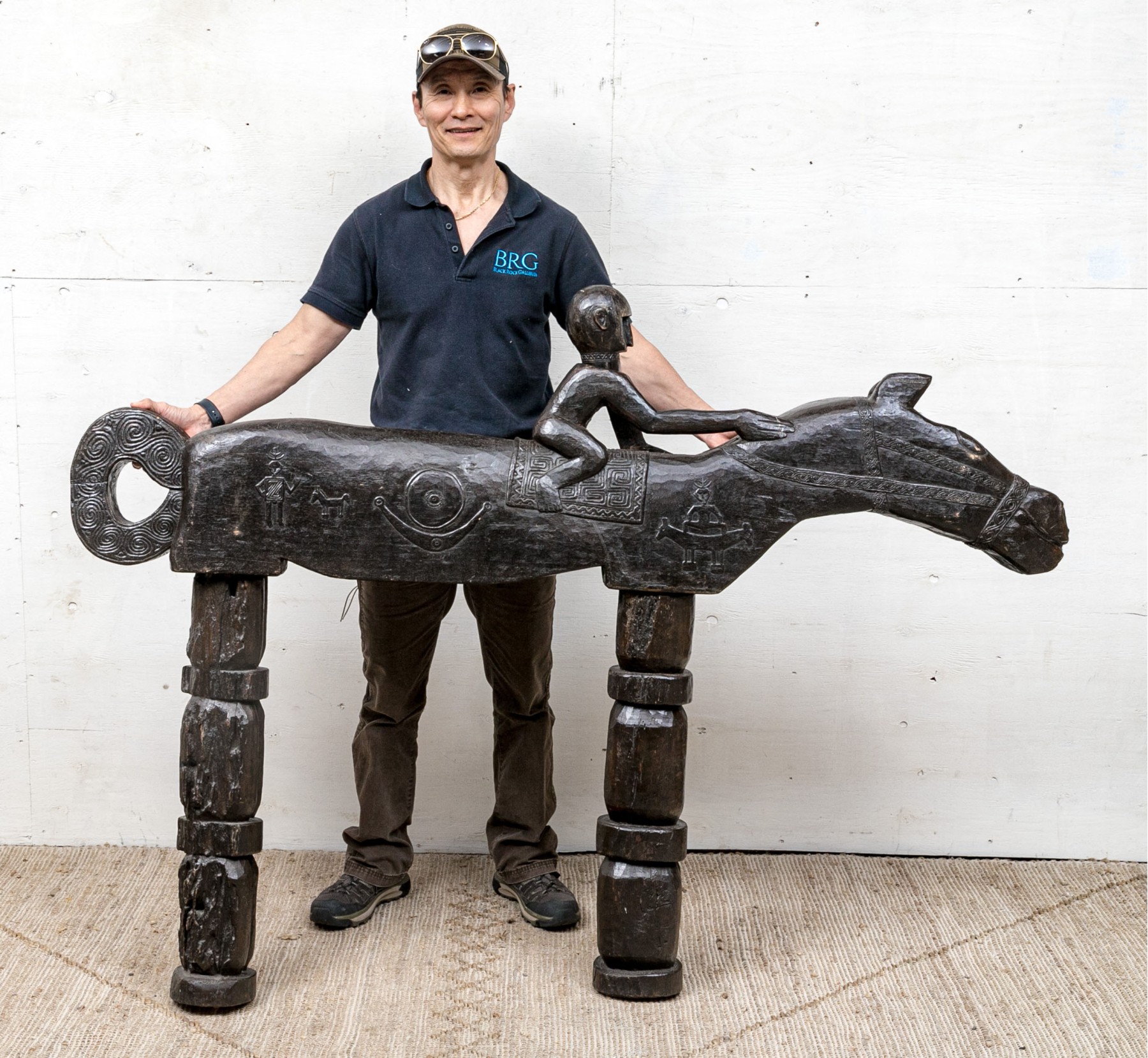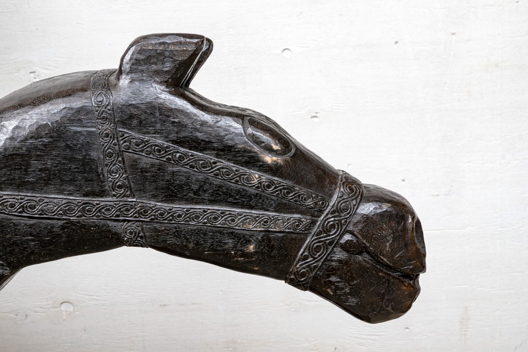A large scale dark stained carved wooden tribal sculpture of a figure on horseback. The figure wears a carved necklace, the horse has a carved bridle, blanket and a curled decorated tail. Its sides are decorated with figures and animals in low relief. Raised on heavy carved three part legs.