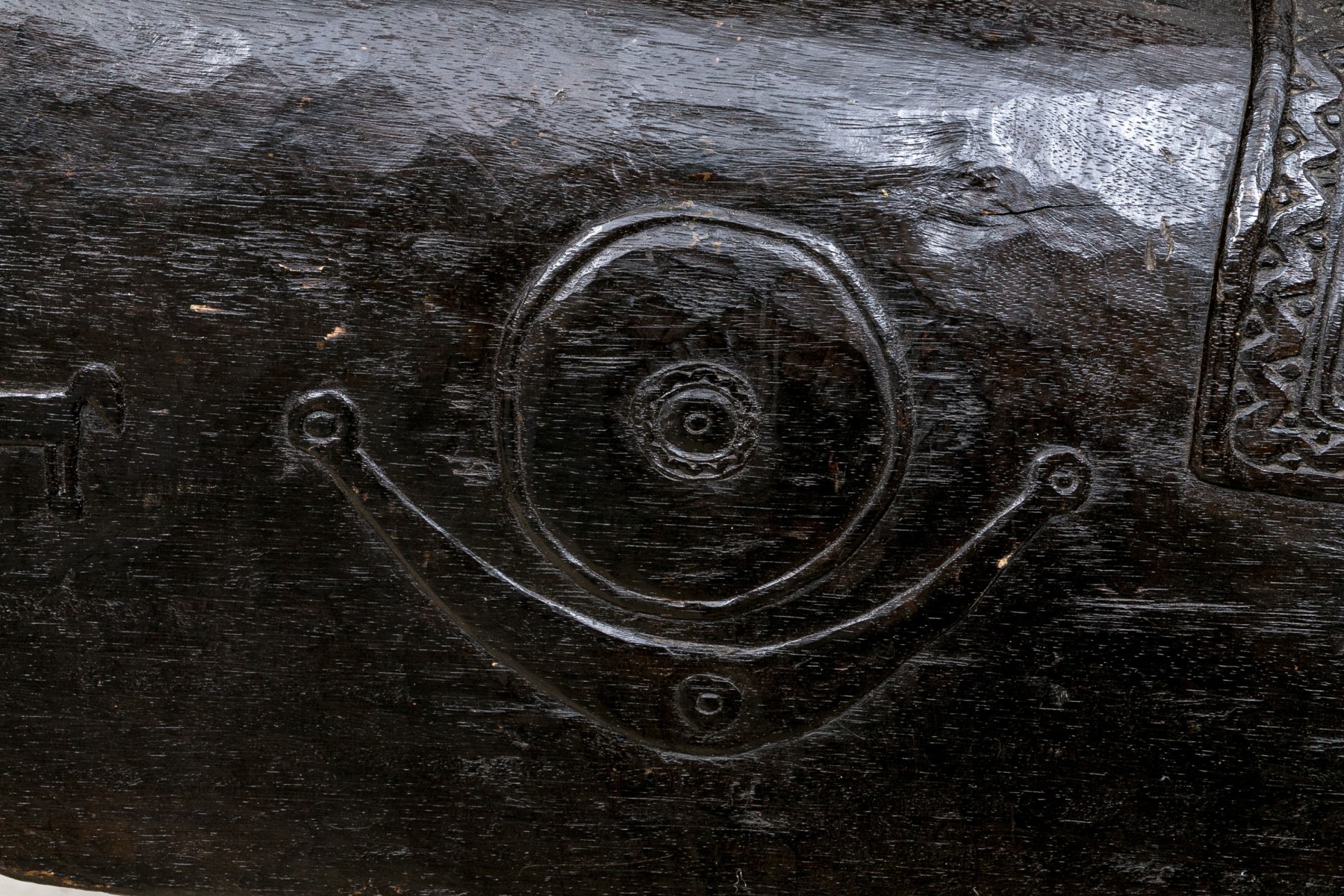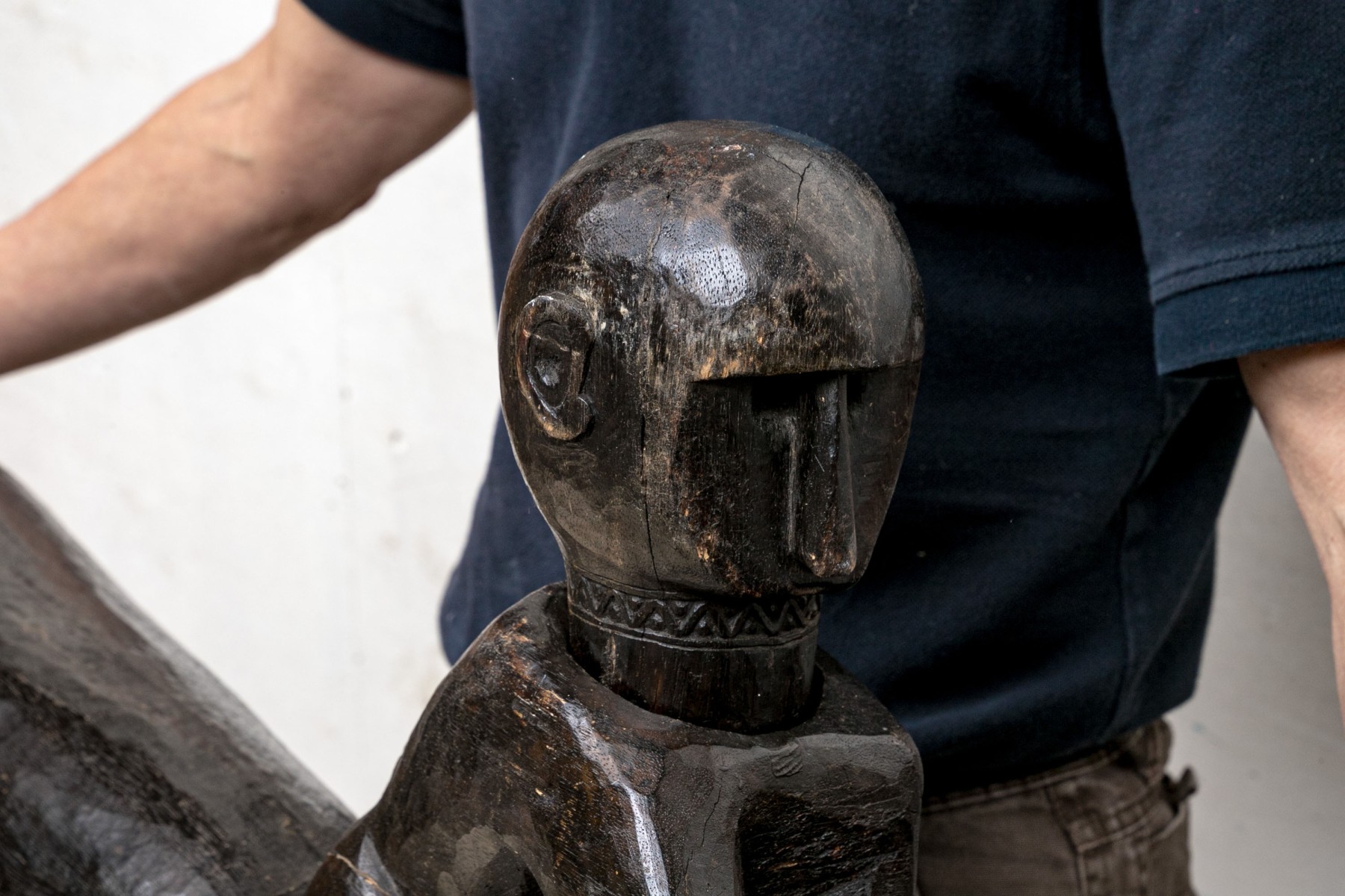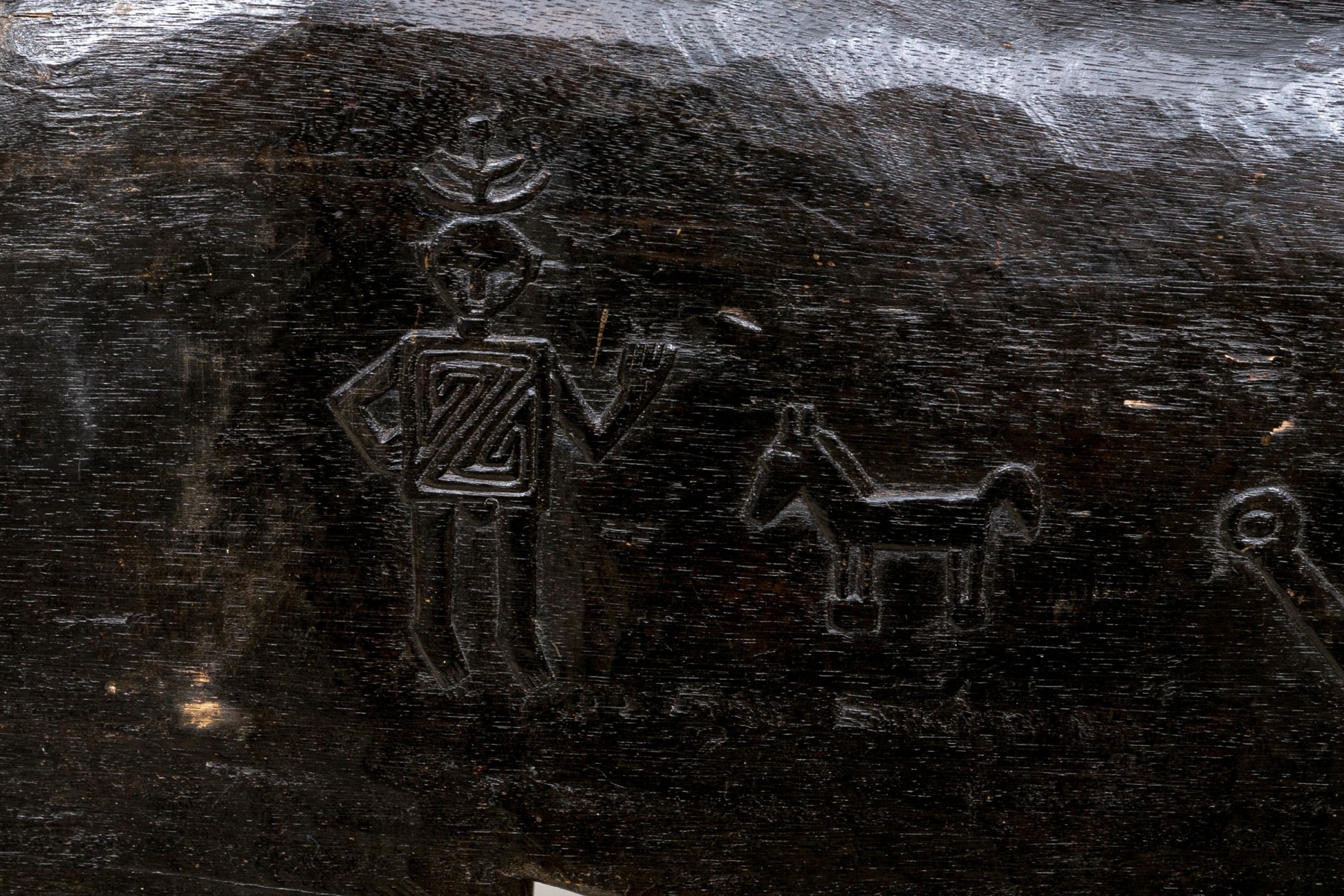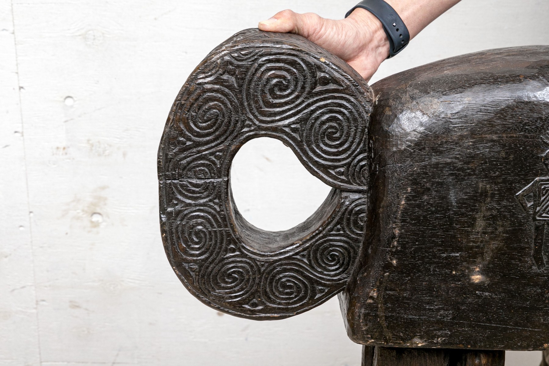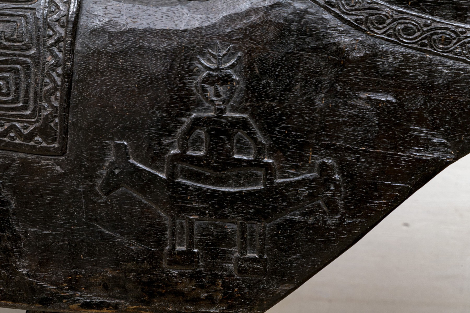 A large scale dark stained carved wooden tribal sculpture of a figure on horseback. The figure wears a carved necklace, the horse has a carved bridle, blanket and a curled decorated tail. Its sides are decorated with figures and animals in low relief. Raised on heavy carved three part legs.
