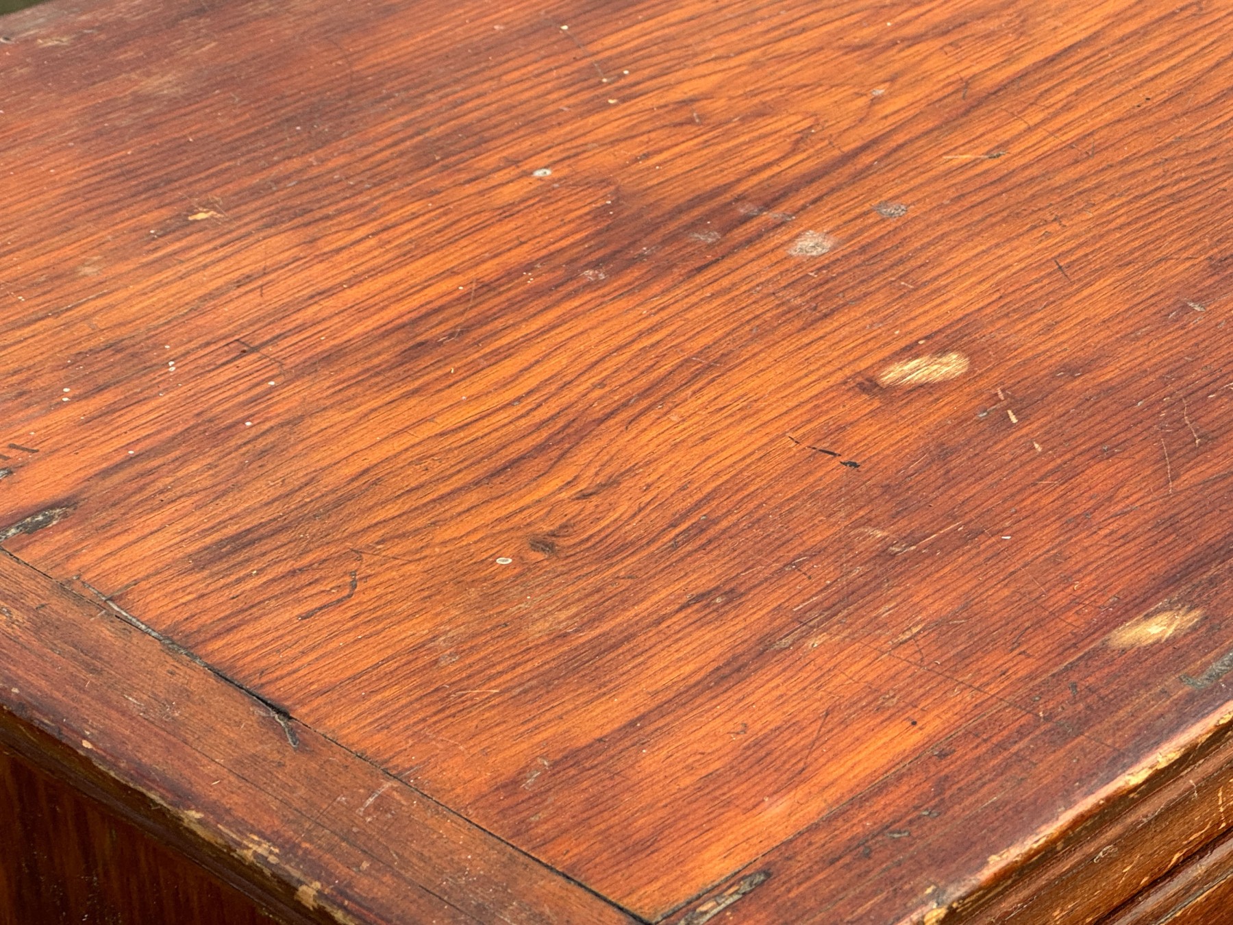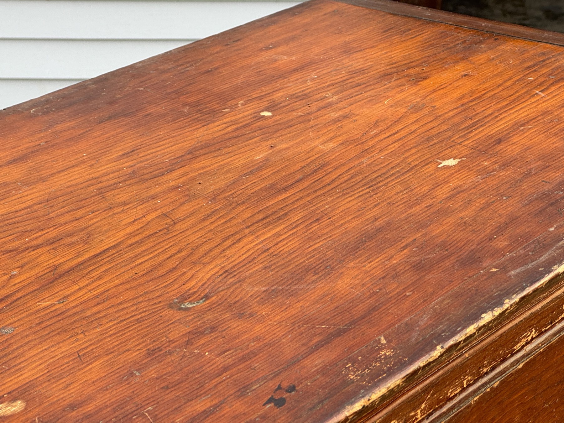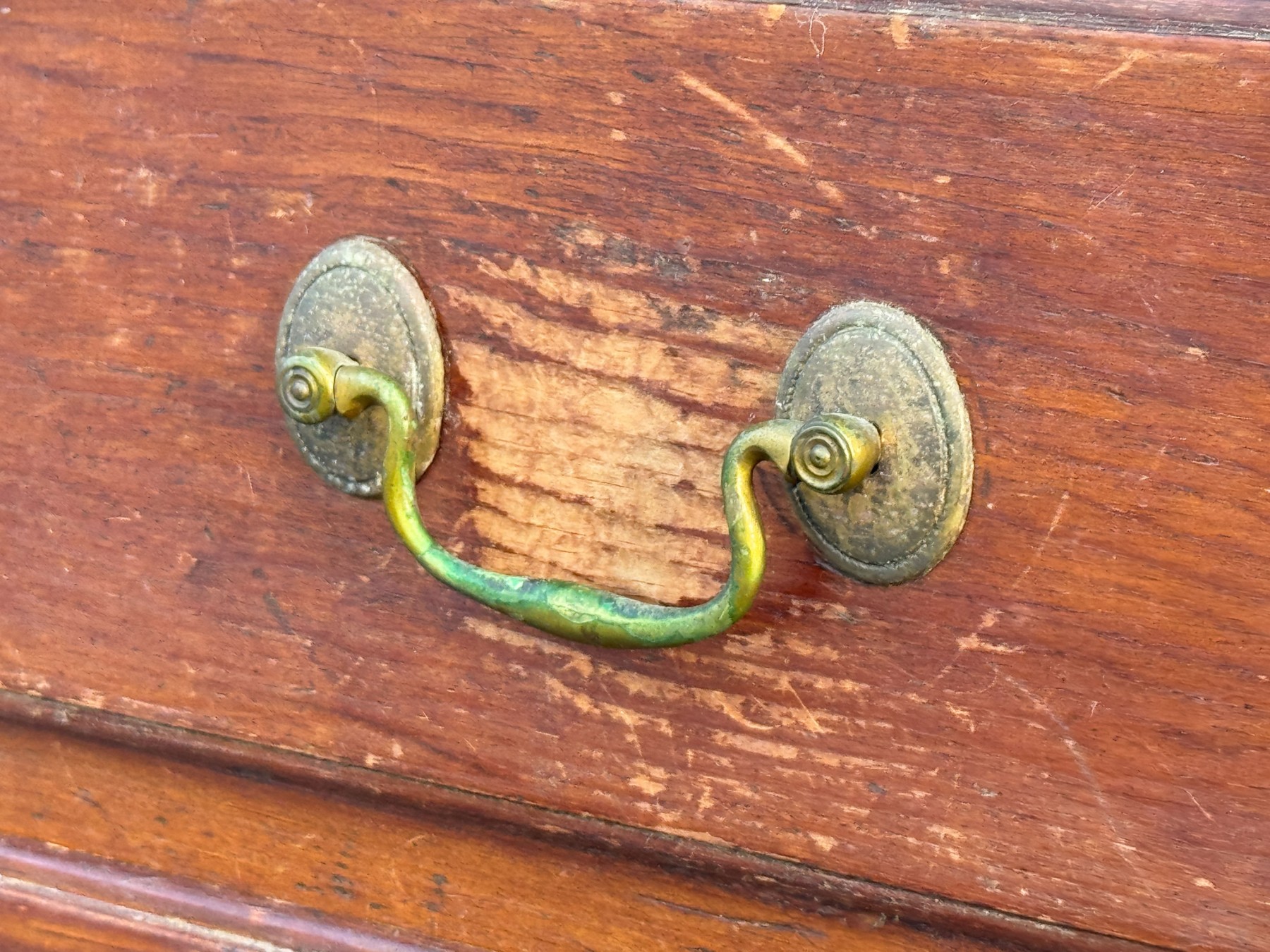 Presents well overall, especially for its age. With wear commensurate with age and use, including finish rubbing, scuffs, nicks, and a chipped loss to the scalloped detail on the left front bracket foot that does not significantly detract from the overall appearance.