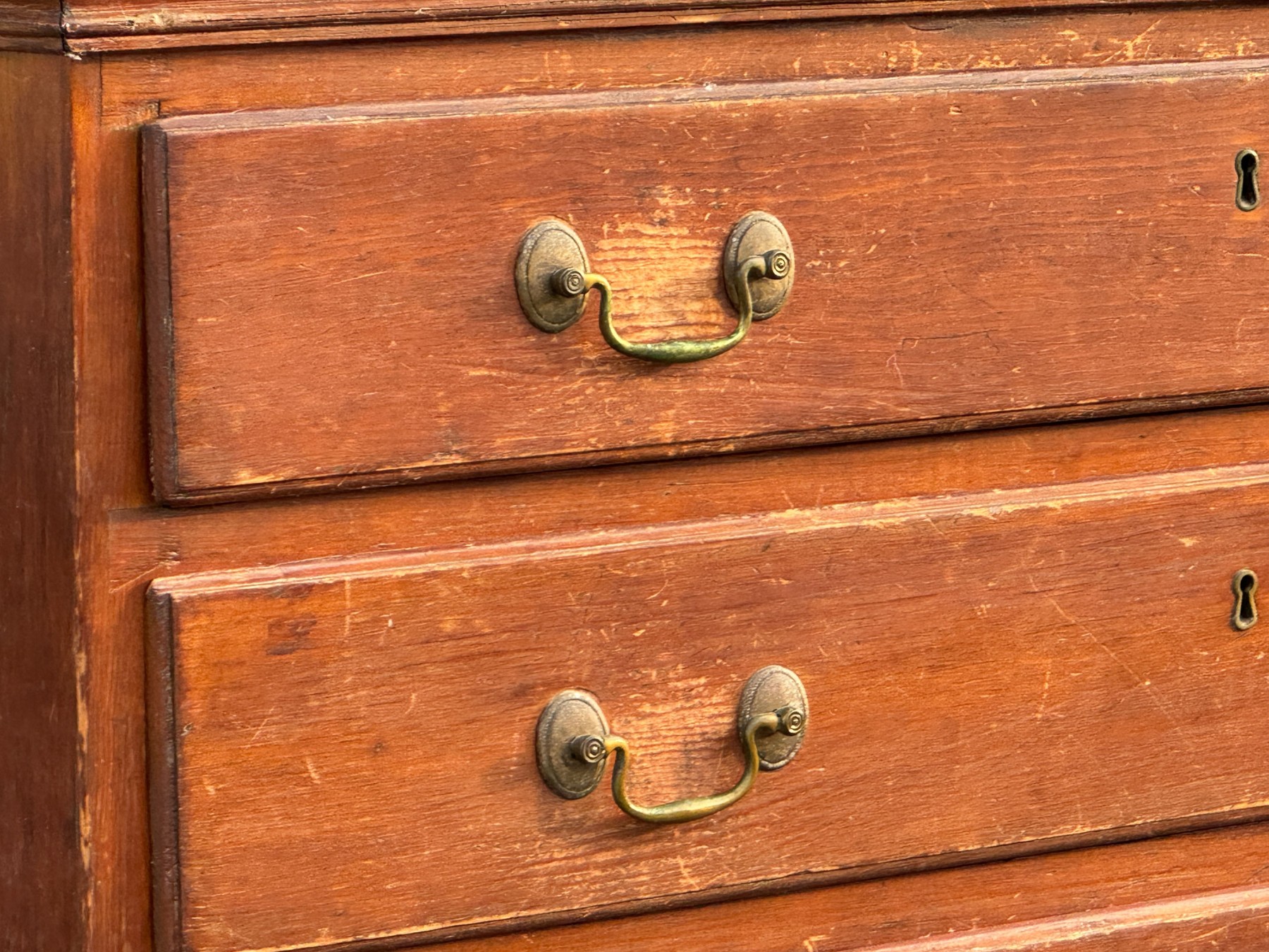 A wonderful antique American chest of drawers circa 1790-1820, finely constructed in pine with a rich cherry finish. In traditional form with a touch of Chippendale elegance, showcasing a rectangular top with a beveled underside overhanging six graduated drawers each adorned with double brass handles. Raised on bracket feet with scalloped details along the inner edges.