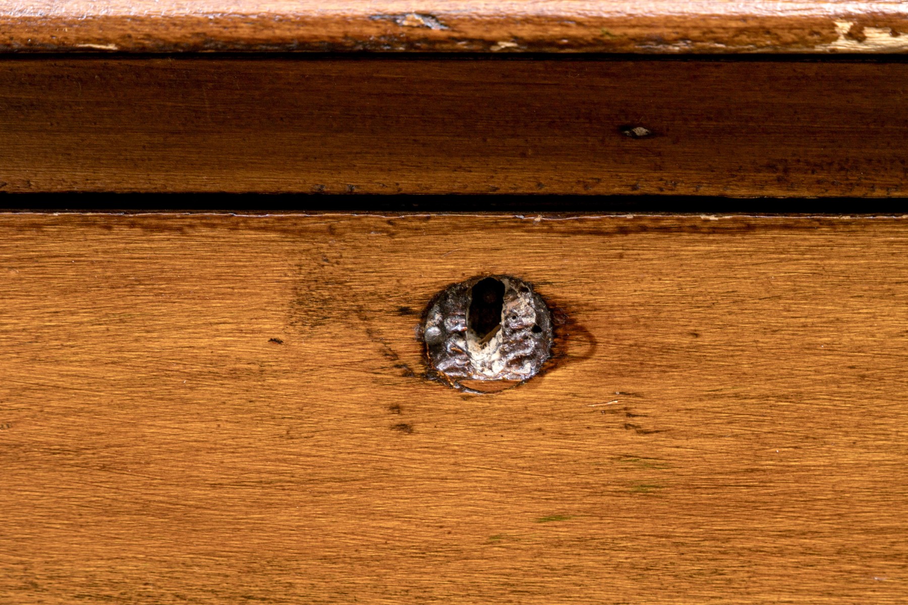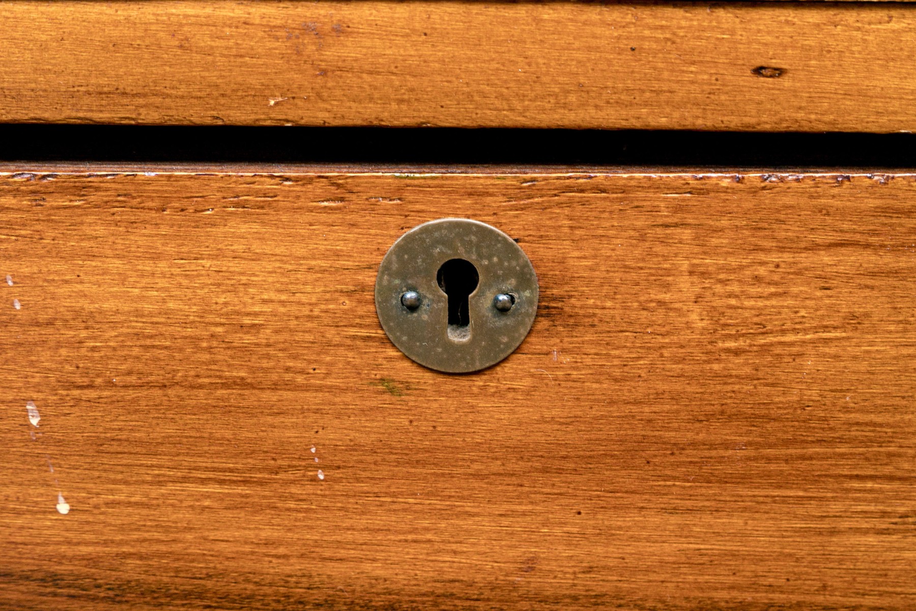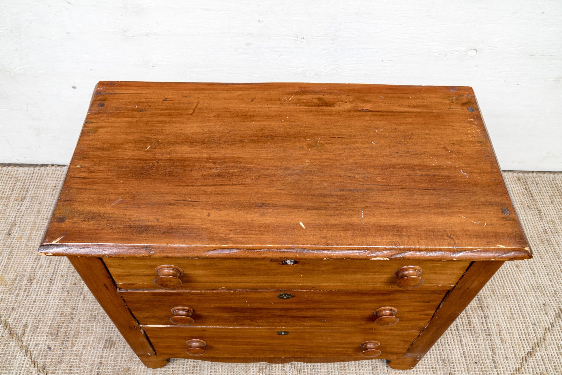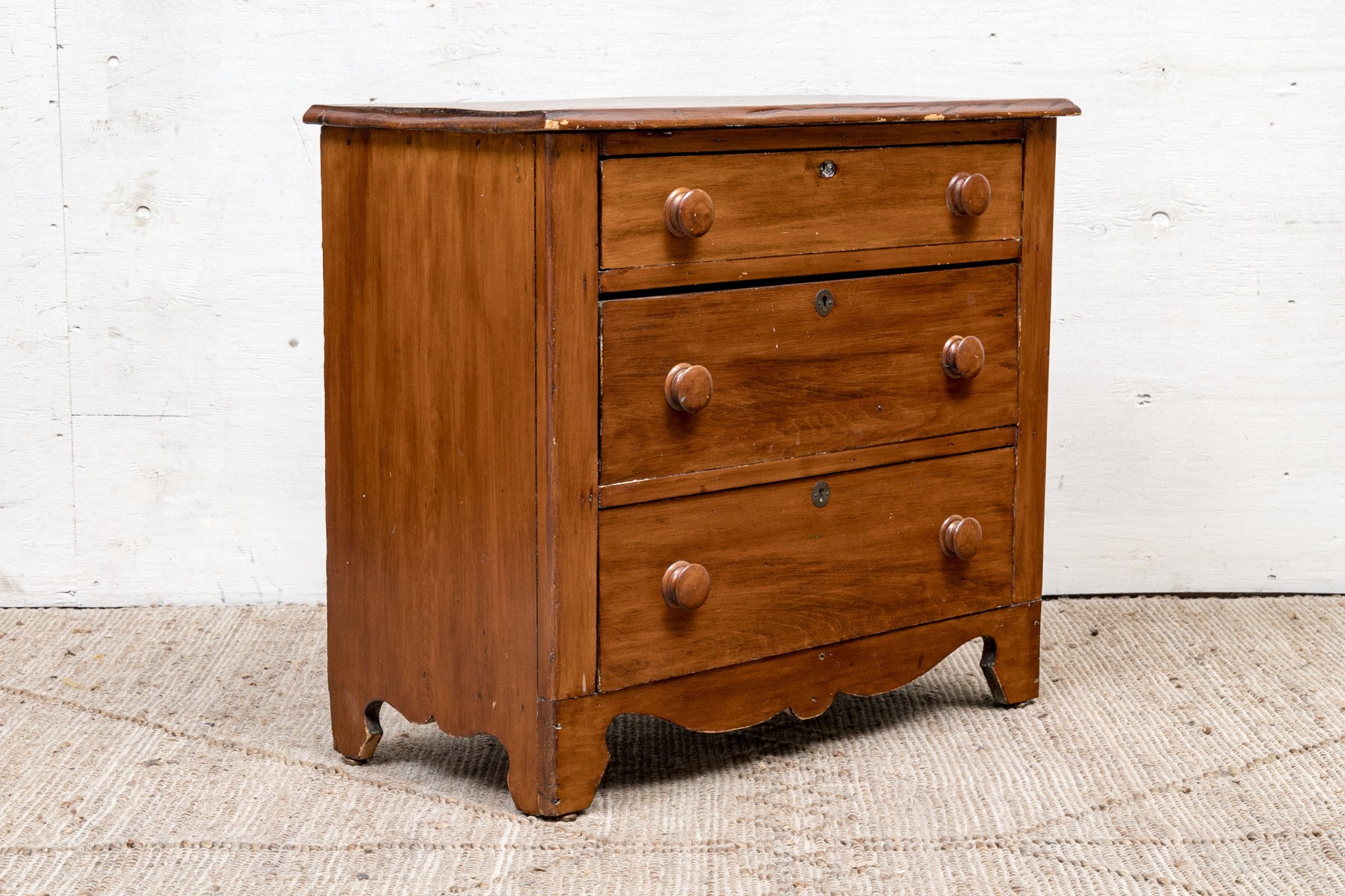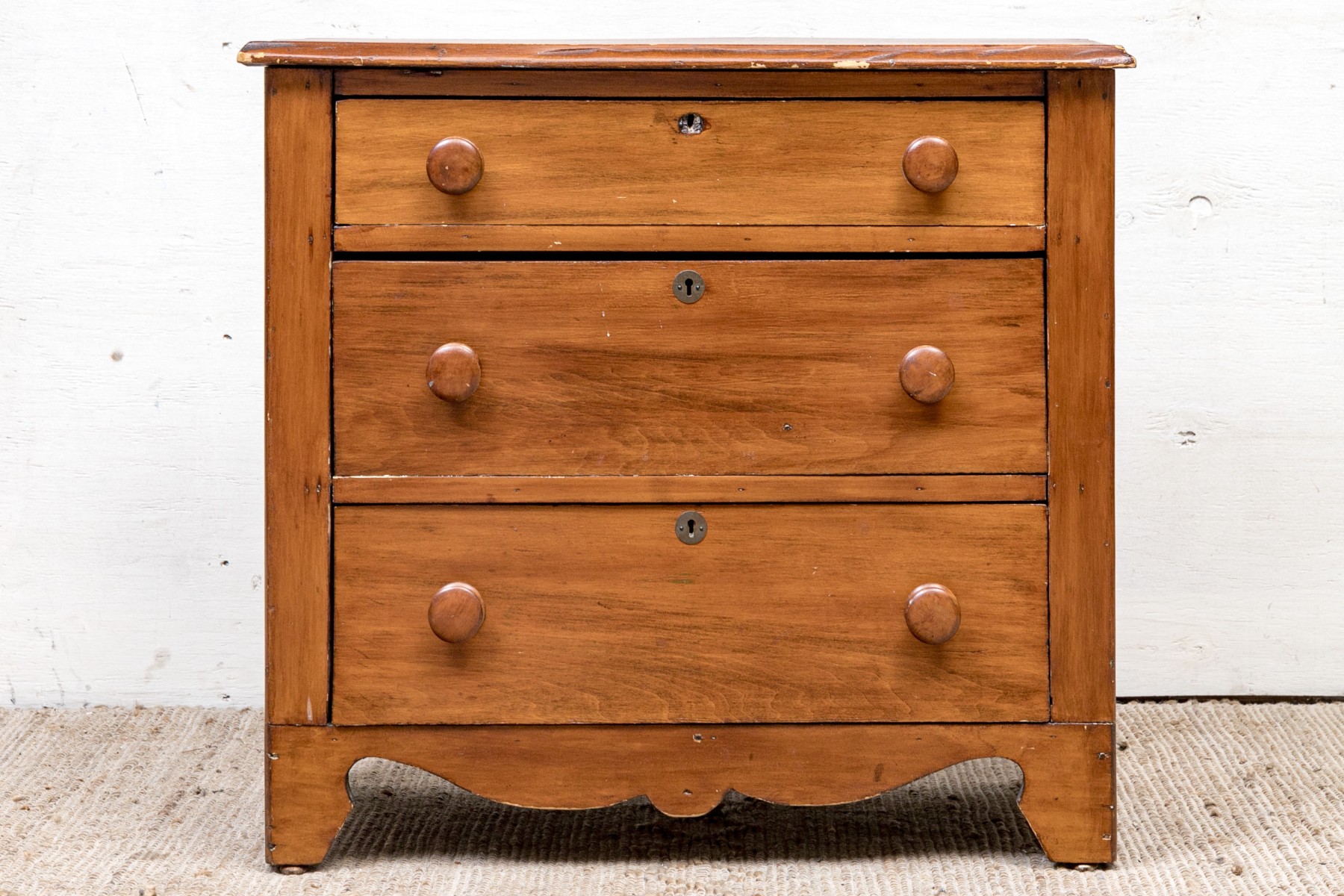 A three- drawer chest with knob pulls and metal escutcheons (lacking a key). With recessed side panels and raised on a shaped skirt rail front and sides.