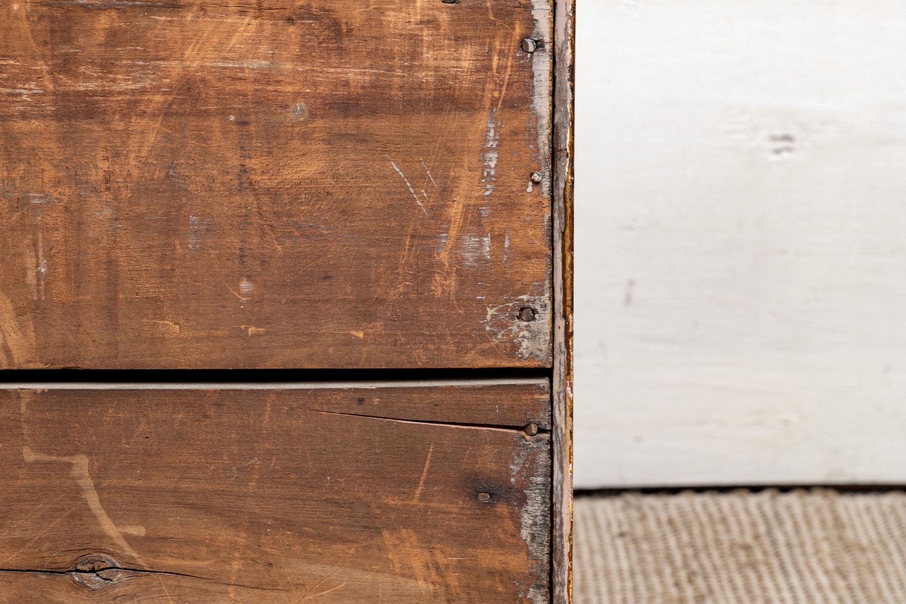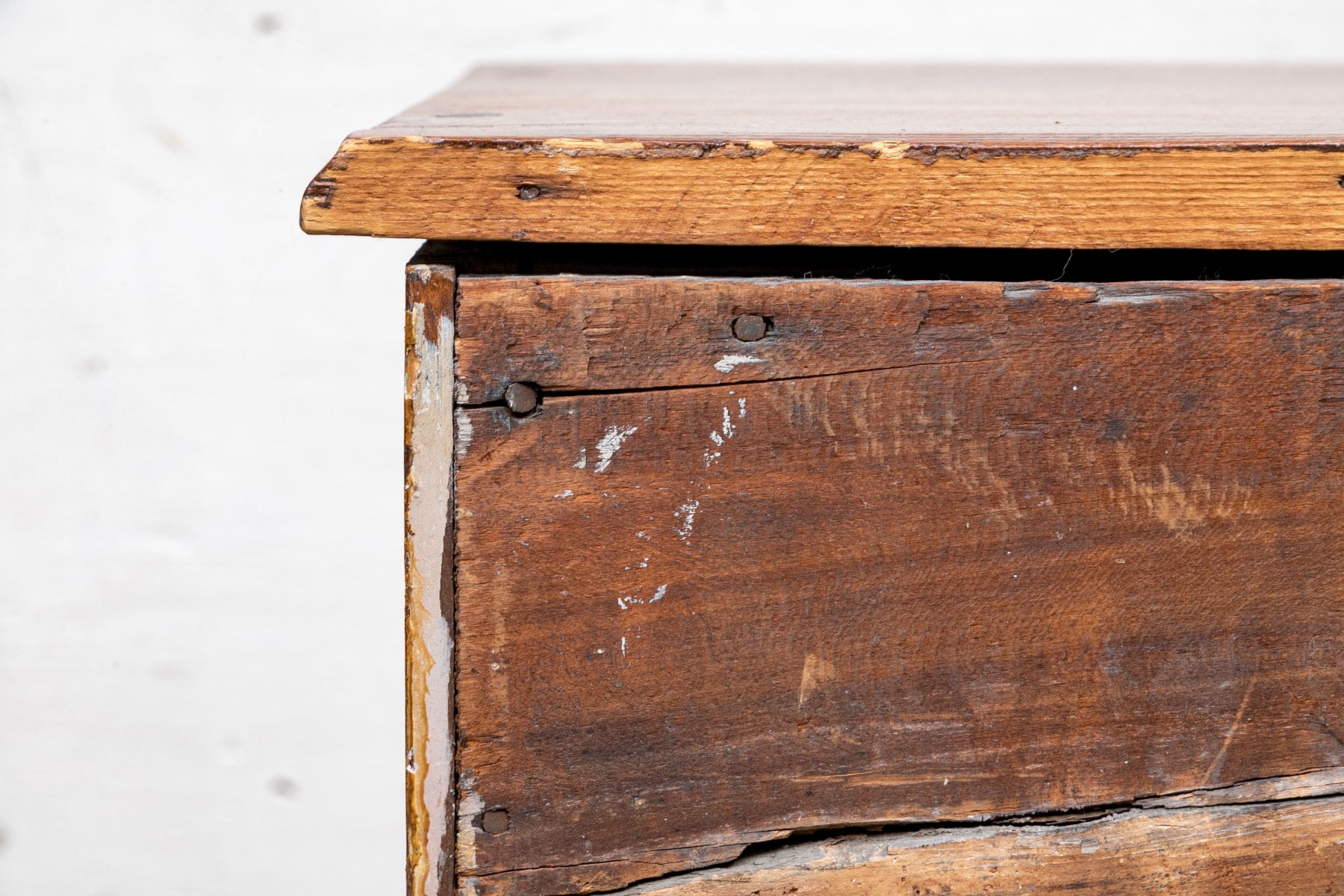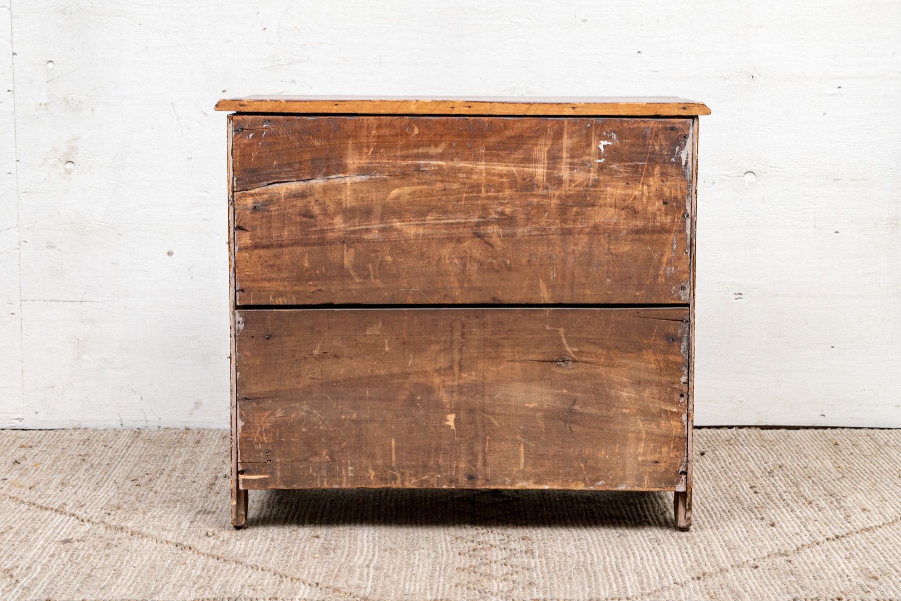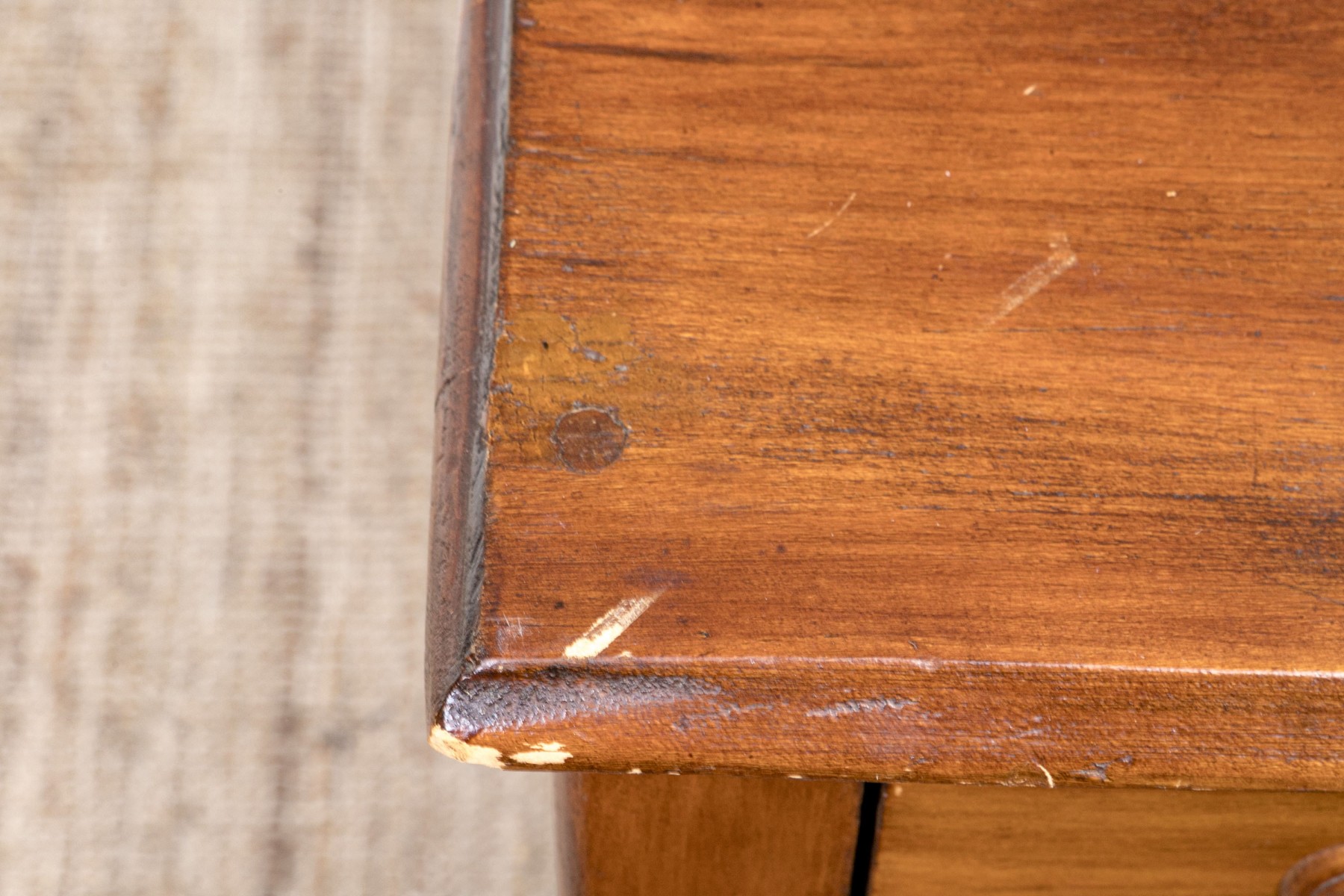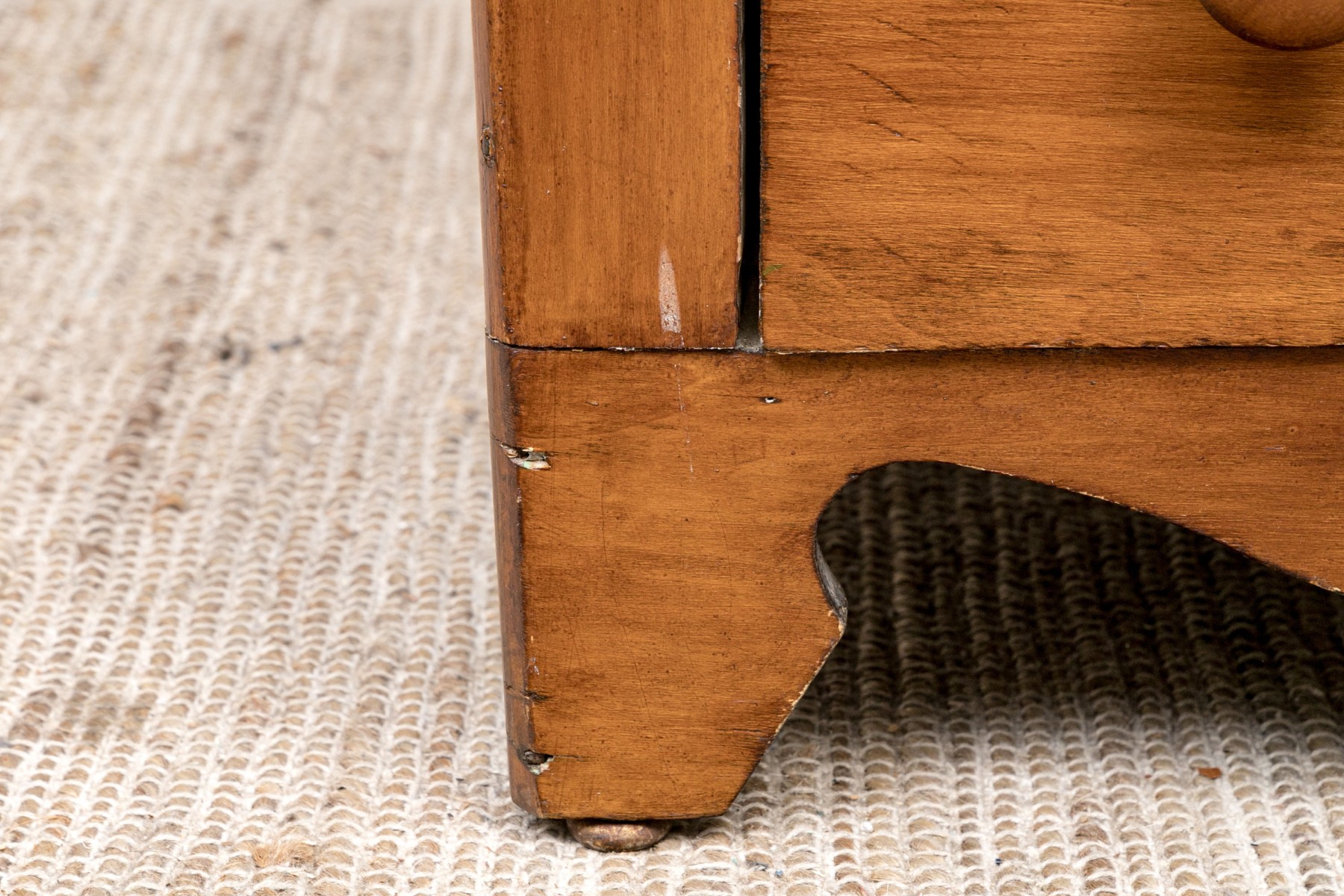 A three- drawer chest with knob pulls and metal escutcheons (lacking a key). With recessed side panels and raised on a shaped skirt rail front and sides.