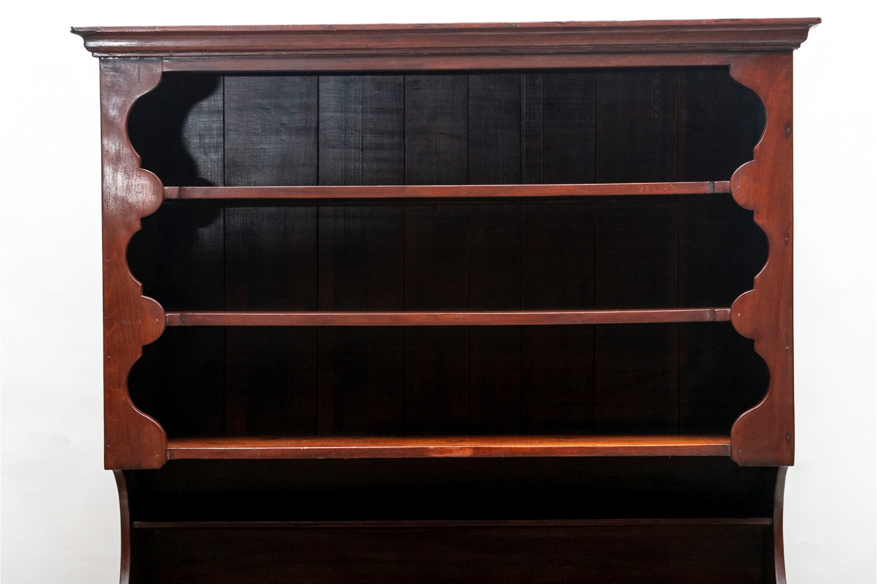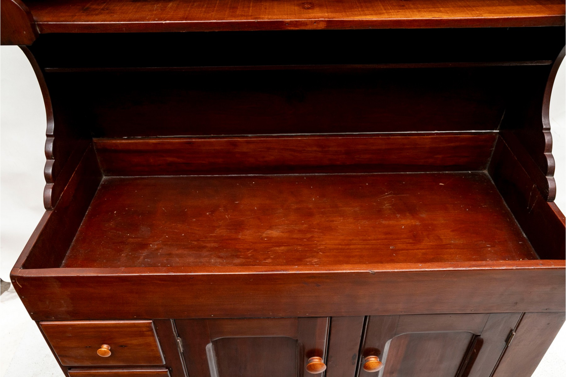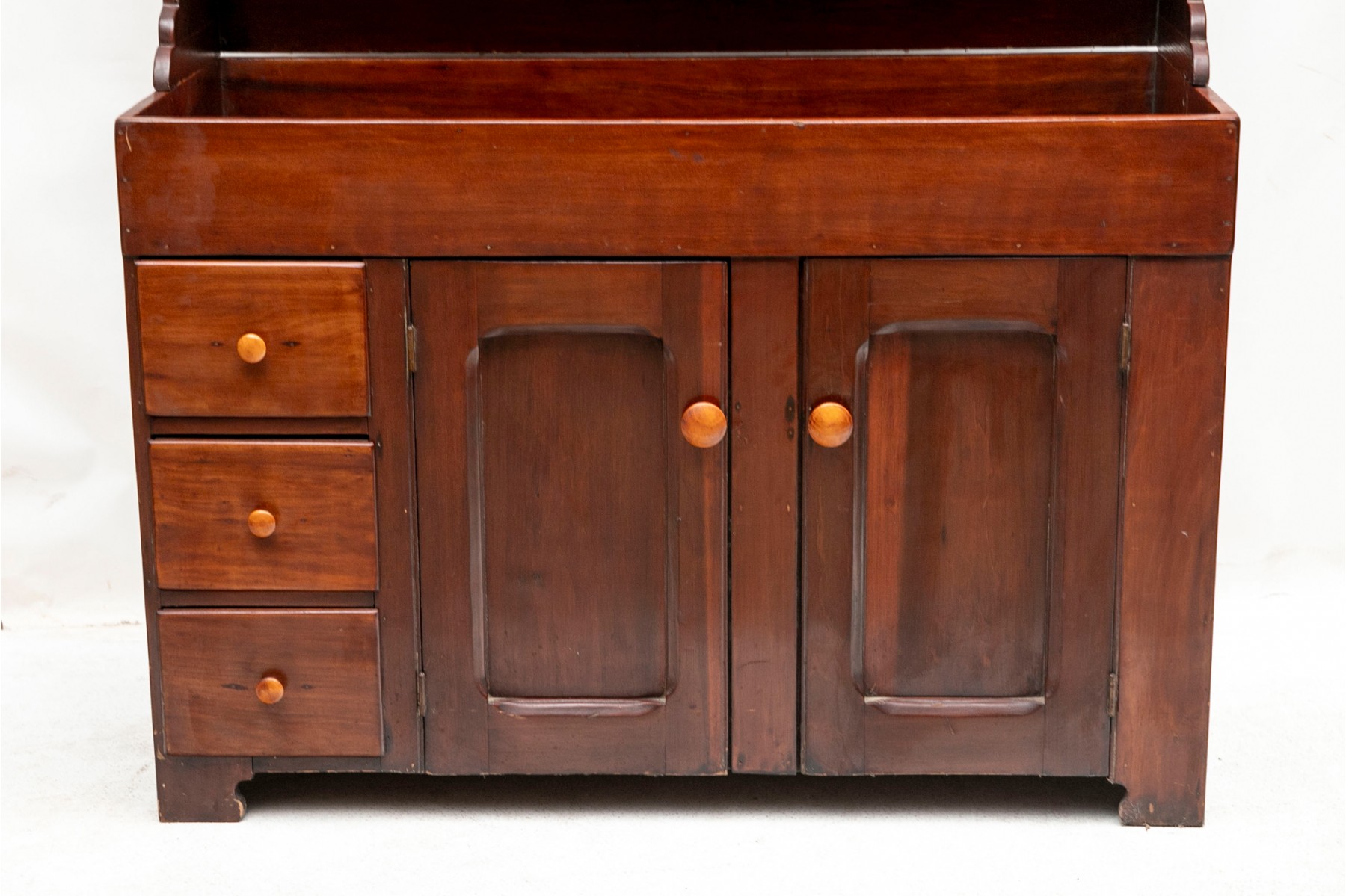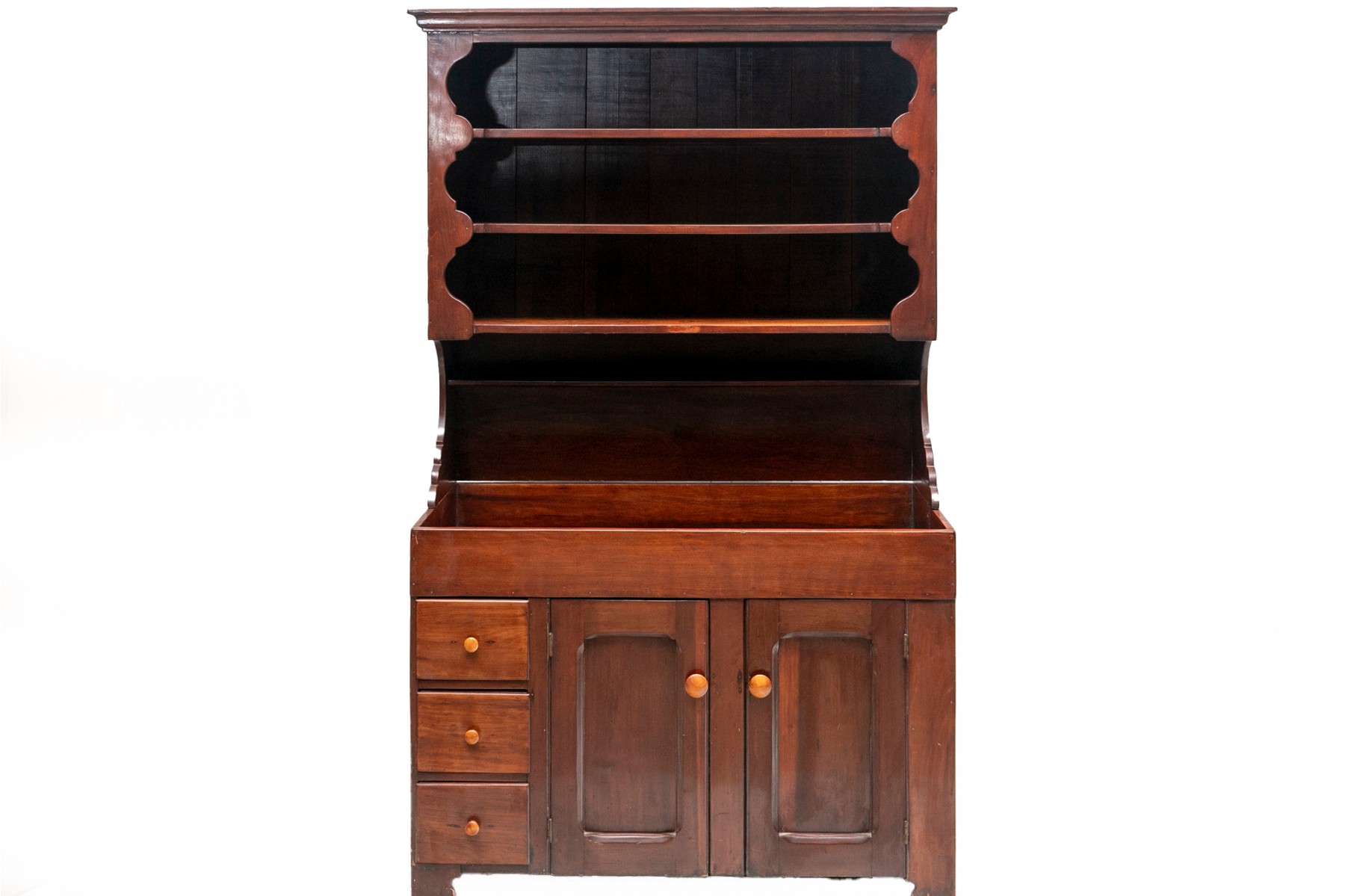A lovely 19th/20th century American dry sink or hutch cabinet in a gorgeous warm-toned brown finish, displaying three wood shelves with serpentine brackets, overhanging a rectangular top with raised sides. The lower unit features a double door cabinet with a single shelf within, and three dovetail drawers along the left.