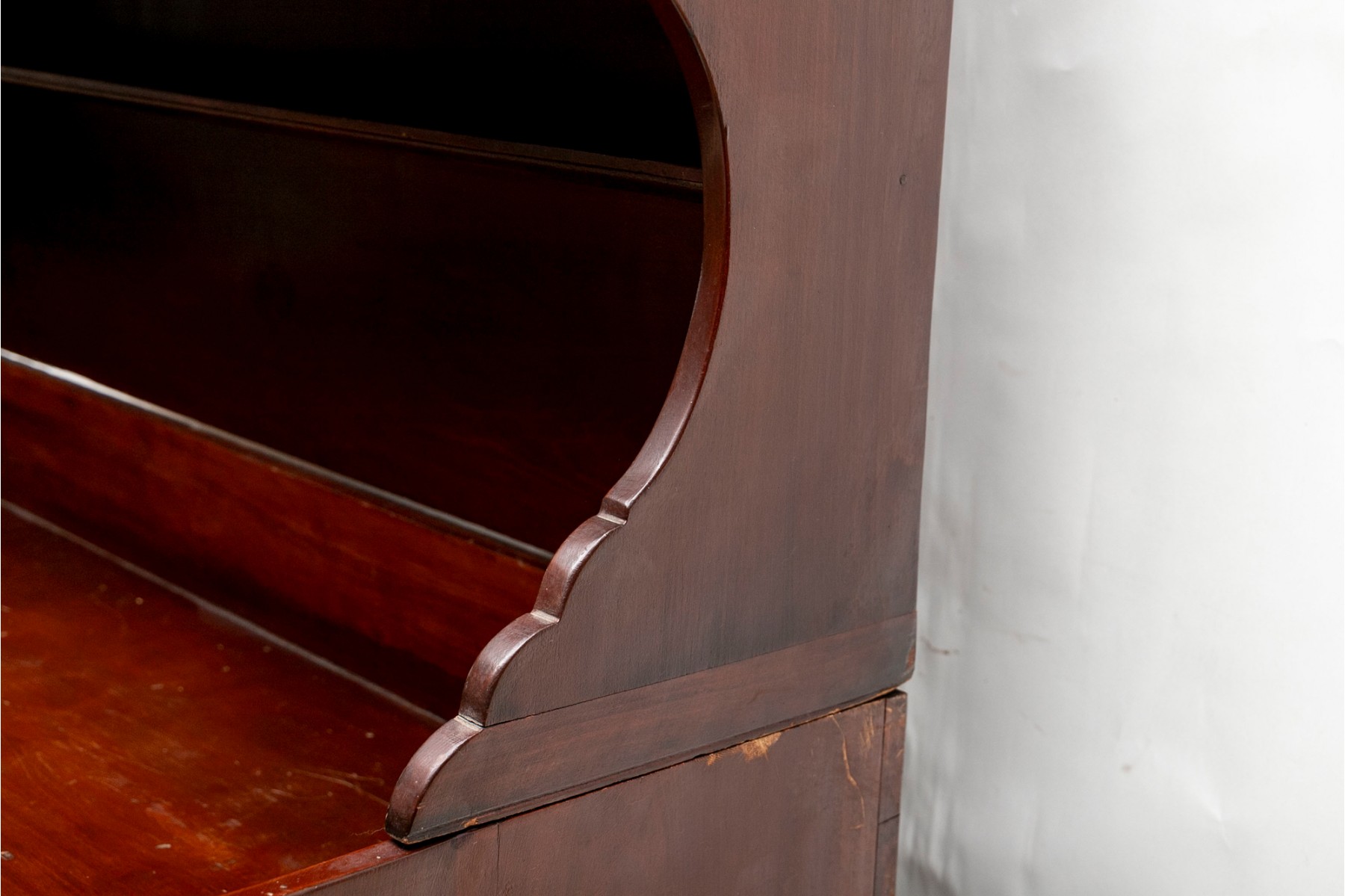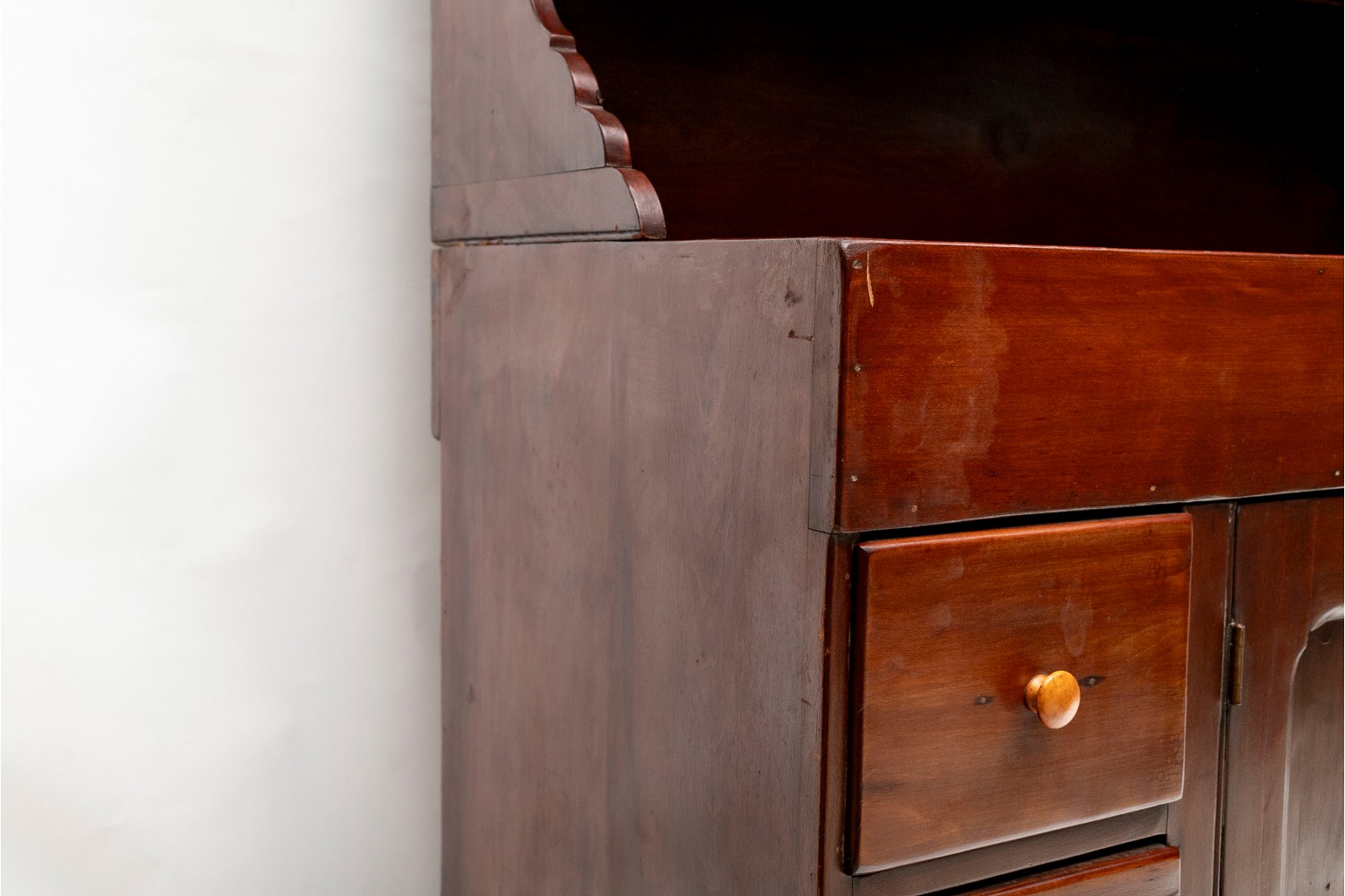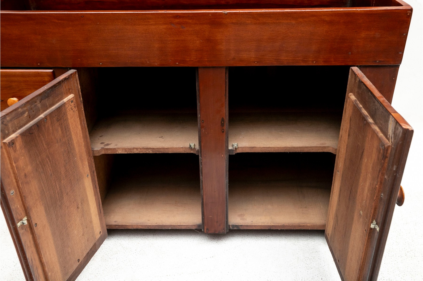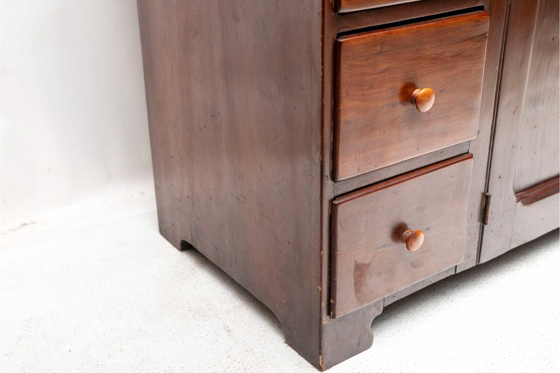 A lovely 19th/20th century American dry sink or hutch cabinet in a gorgeous warm-toned brown finish, displaying three wood shelves with serpentine brackets, overhanging a rectangular top with raised sides. The lower unit features a double door cabinet with a single shelf within, and three dovetail drawers along the left.
