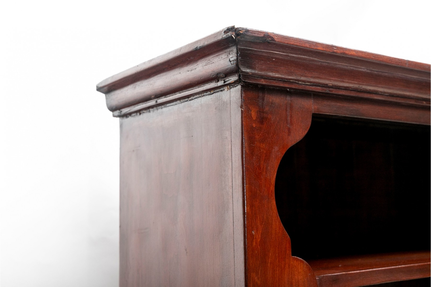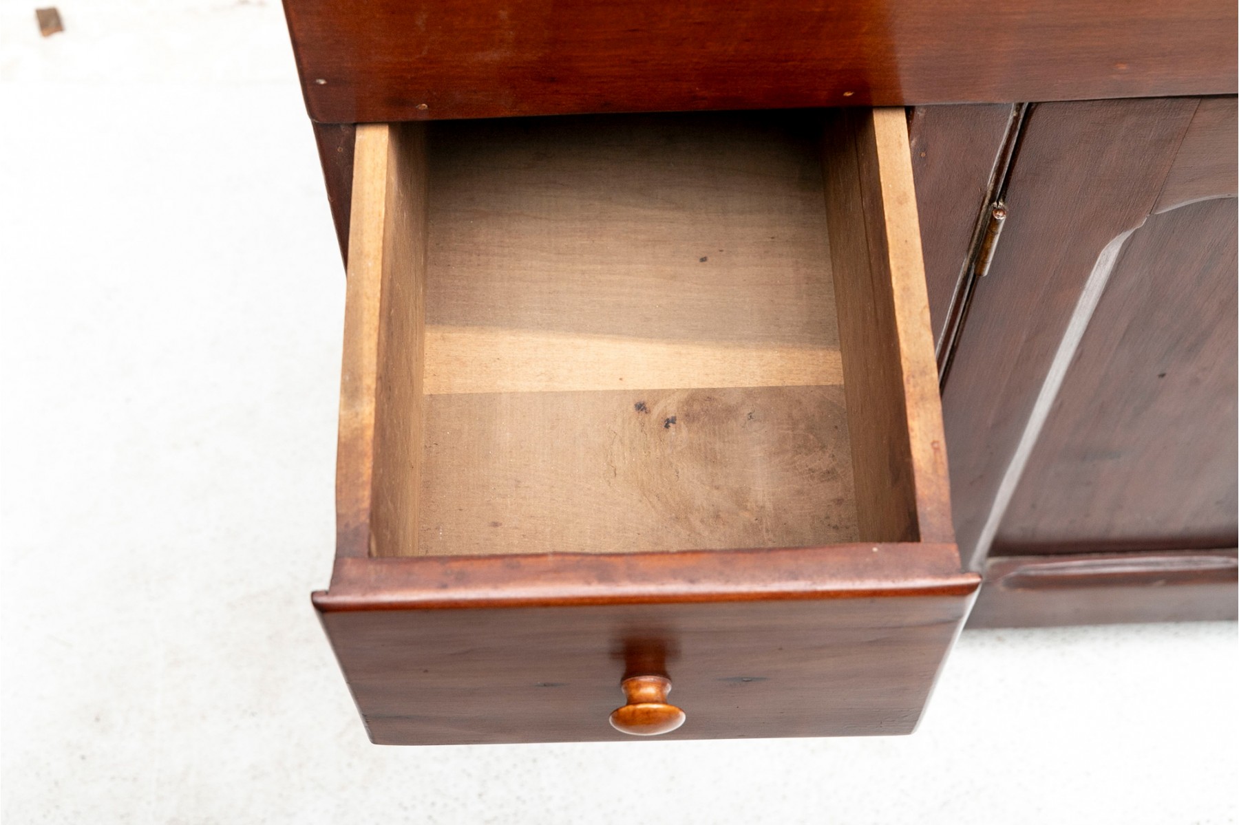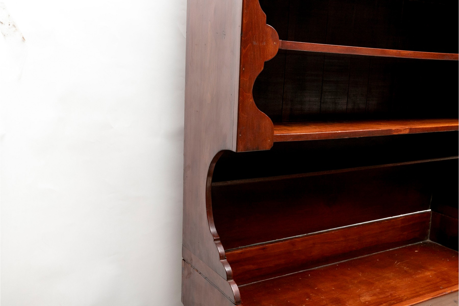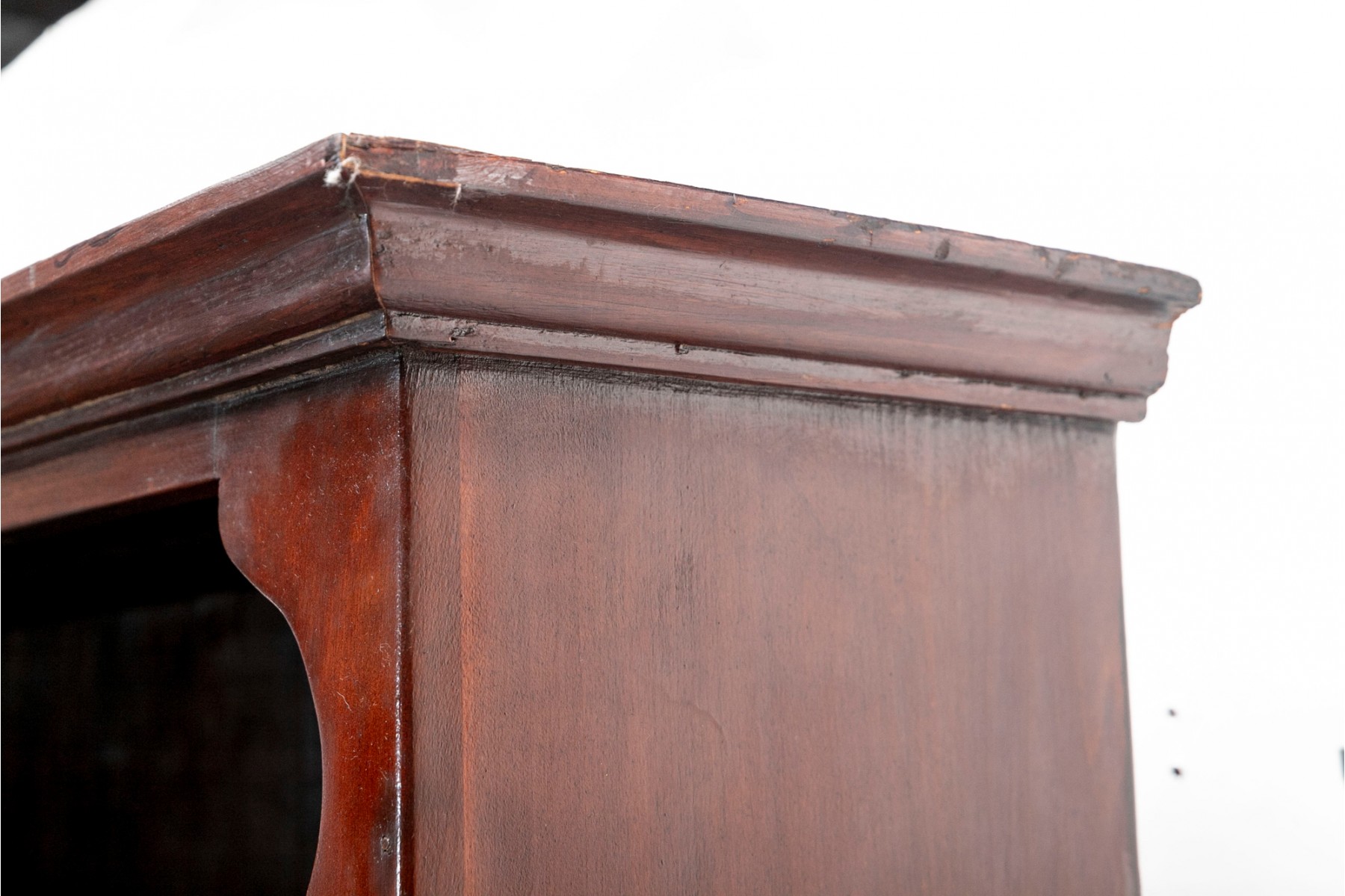 A lovely 19th/20th century American dry sink or hutch cabinet in a gorgeous warm-toned brown finish, displaying three wood shelves with serpentine brackets, overhanging a rectangular top with raised sides. The lower unit features a double door cabinet with a single shelf within, and three dovetail drawers along the left.