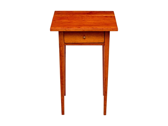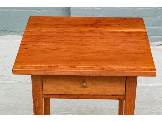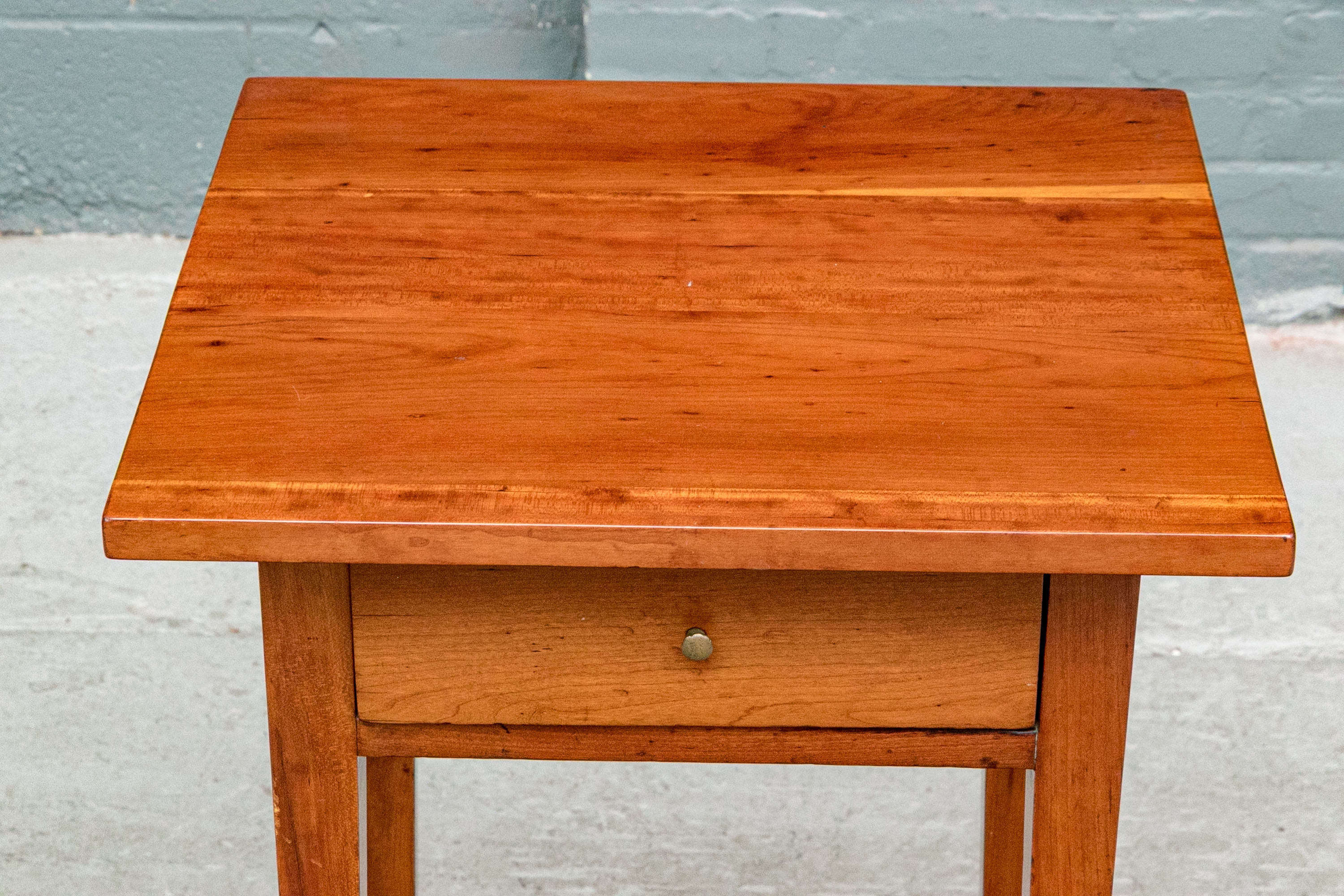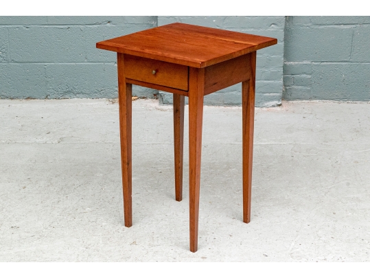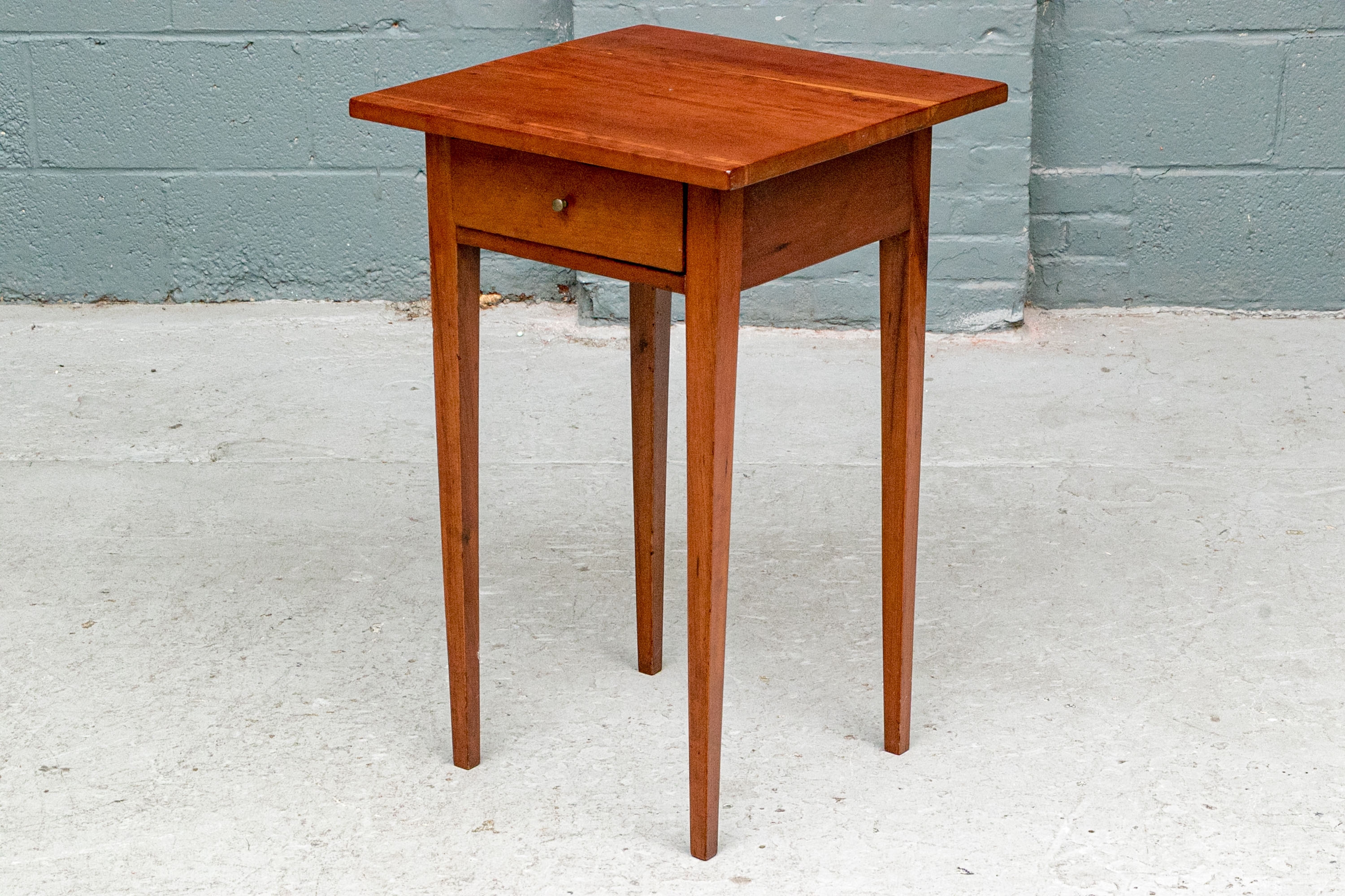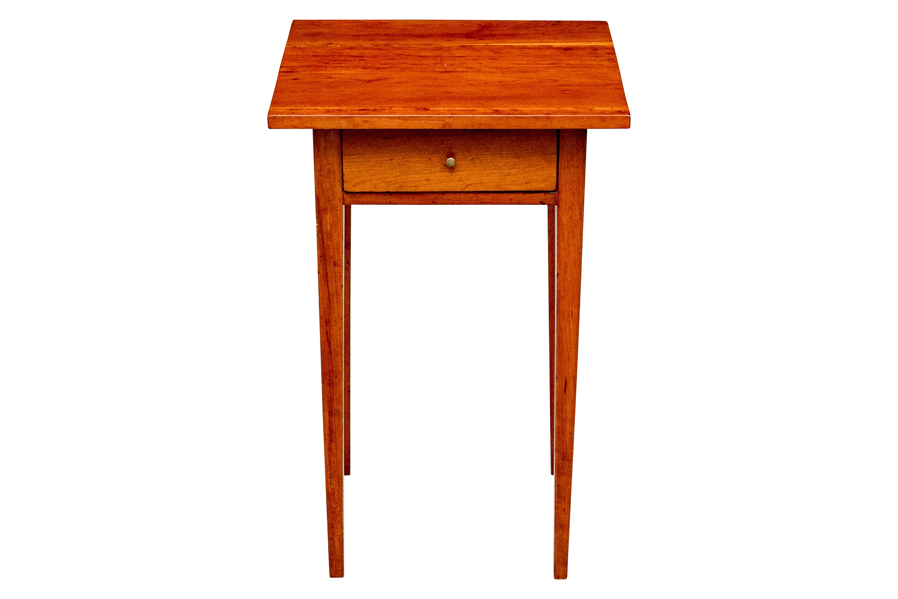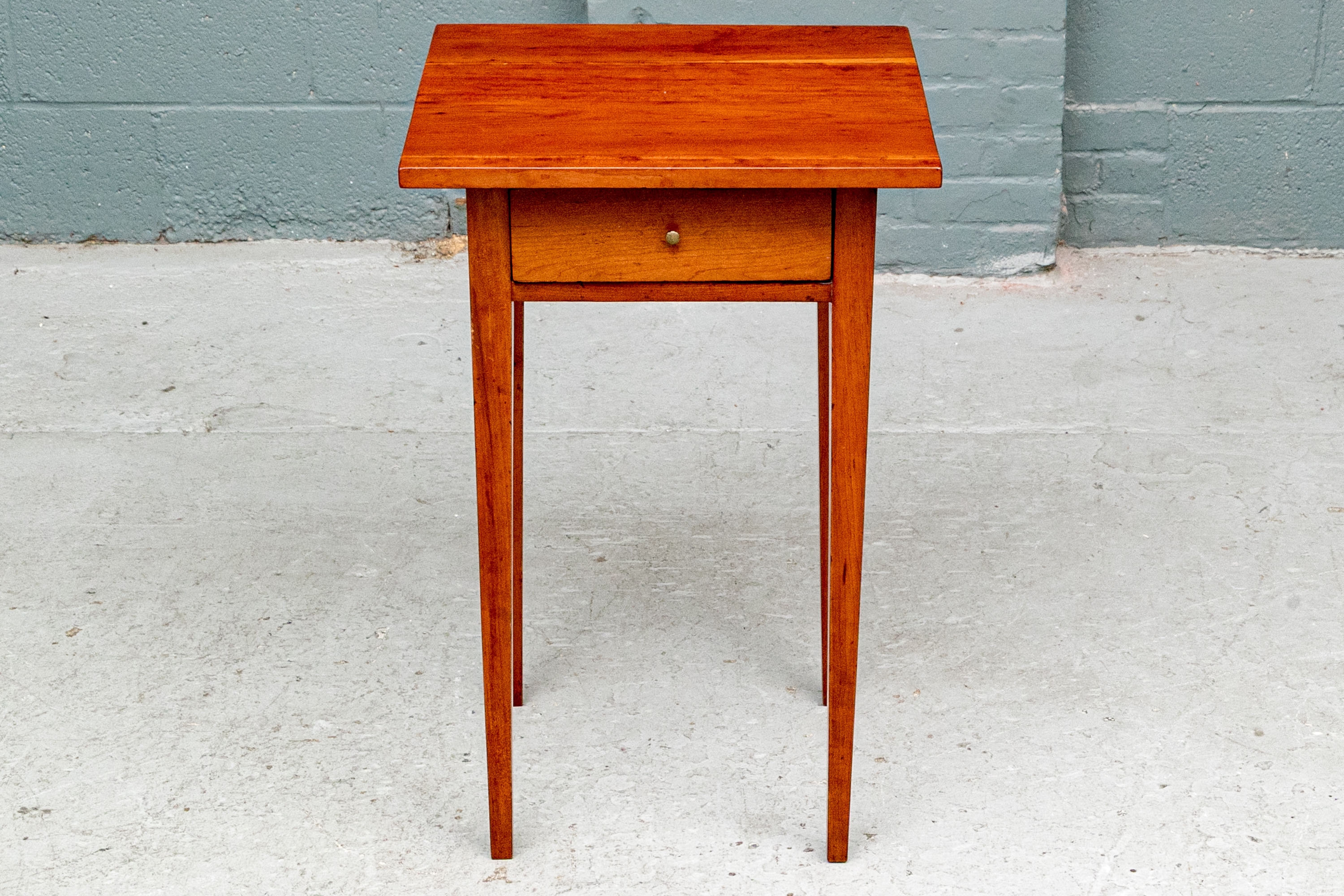 A classic American Federal stand here in cherry. With an overhanging square plank constructed top over a single frieze drawer with a small metal knob pull. Raised on square tapering legs.