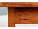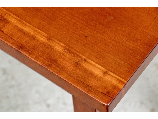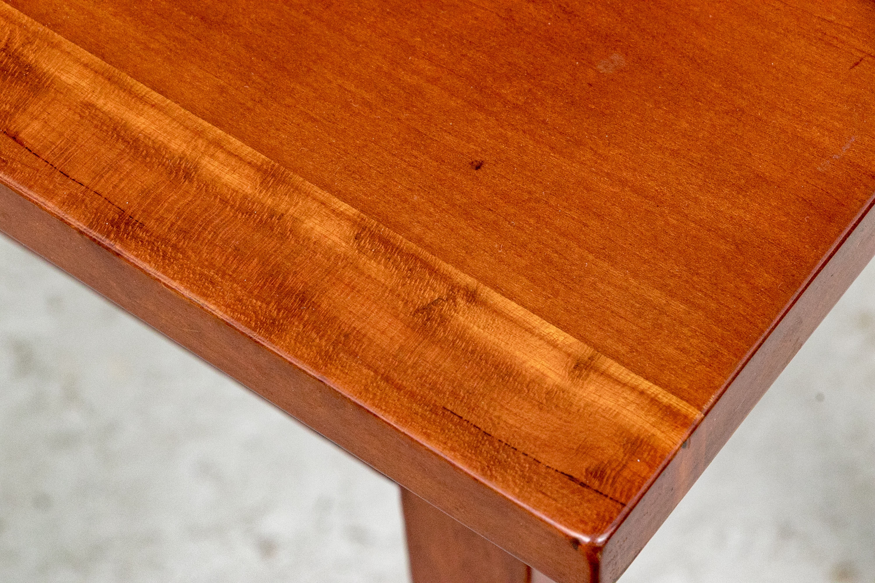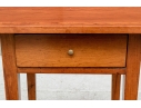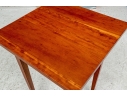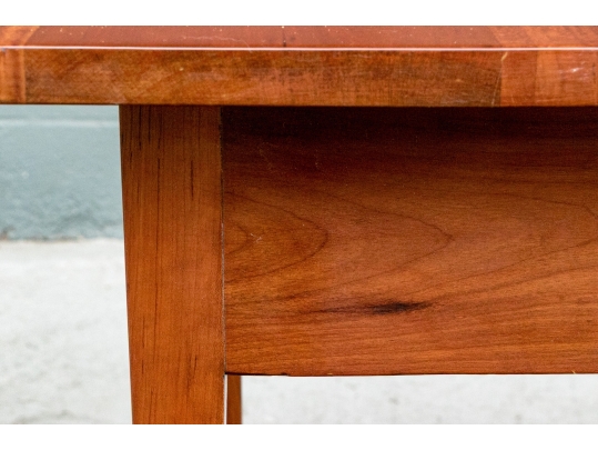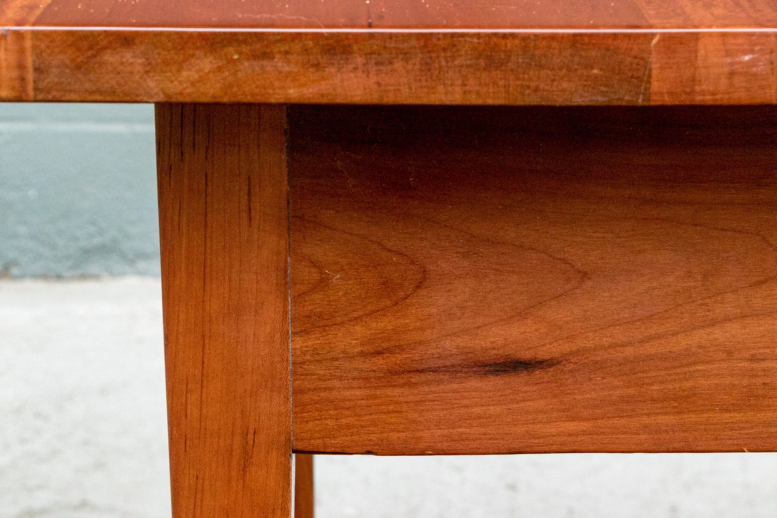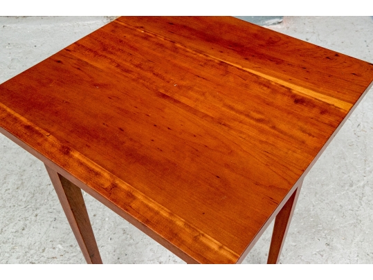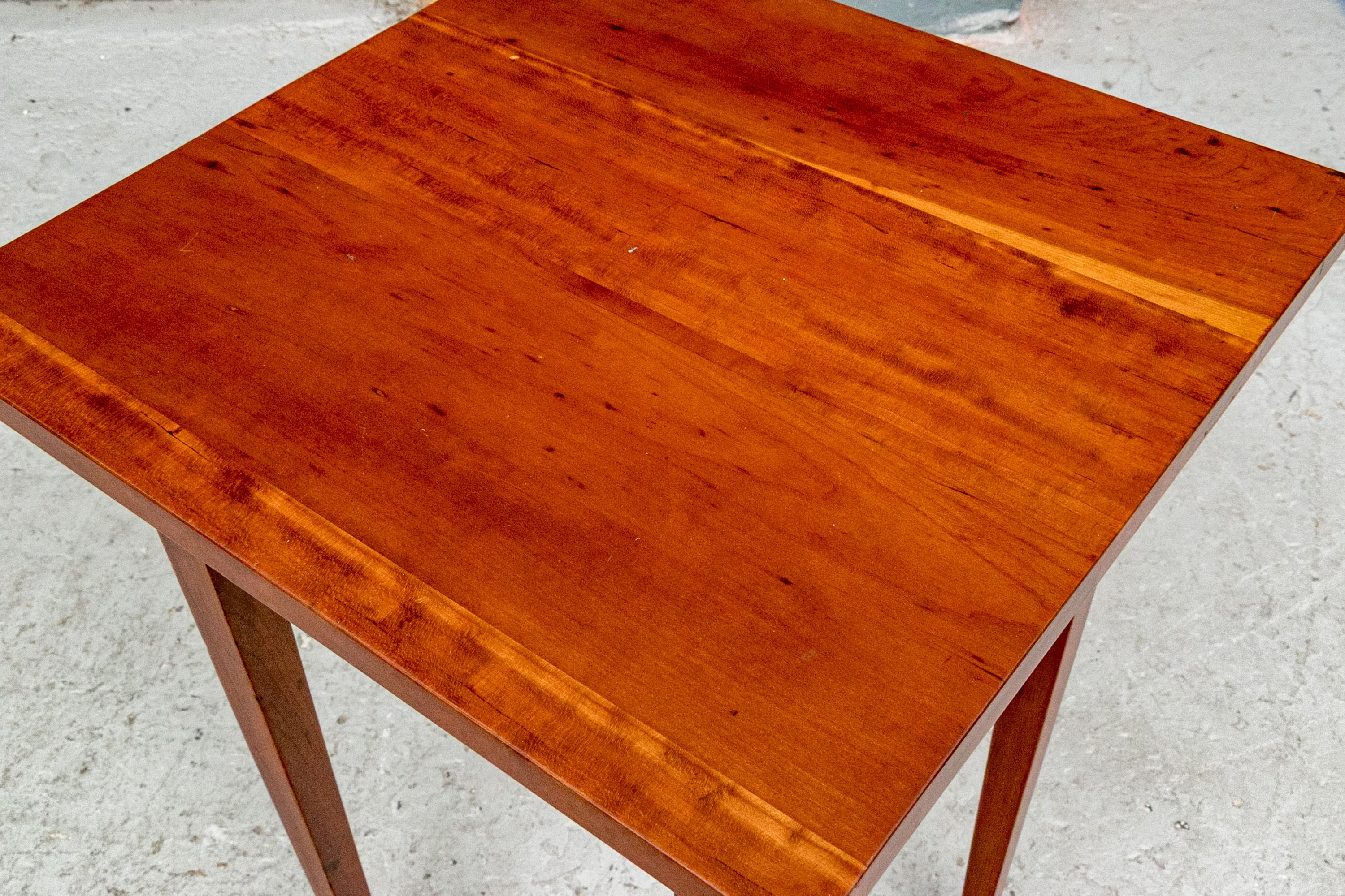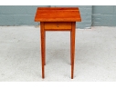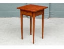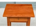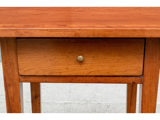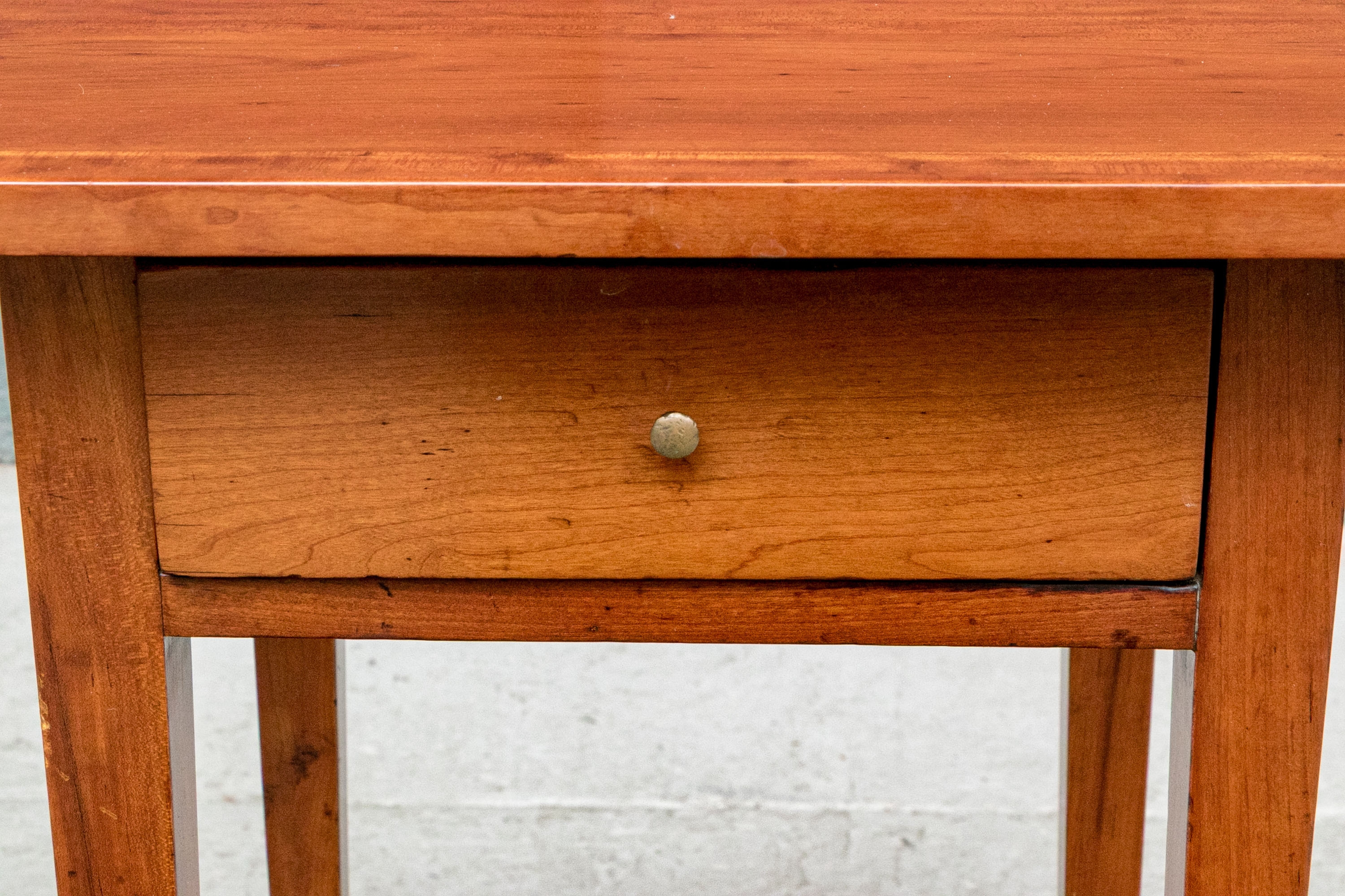 A classic American Federal stand here in cherry. With an overhanging square plank constructed top over a single frieze drawer with a small metal knob pull. Raised on square tapering legs.