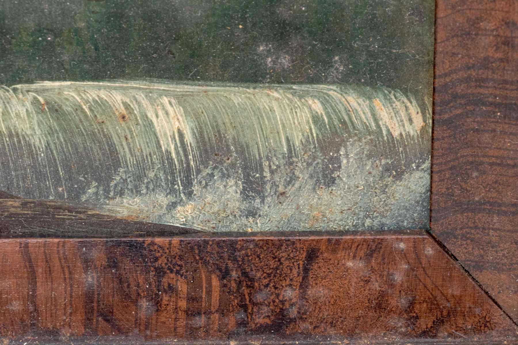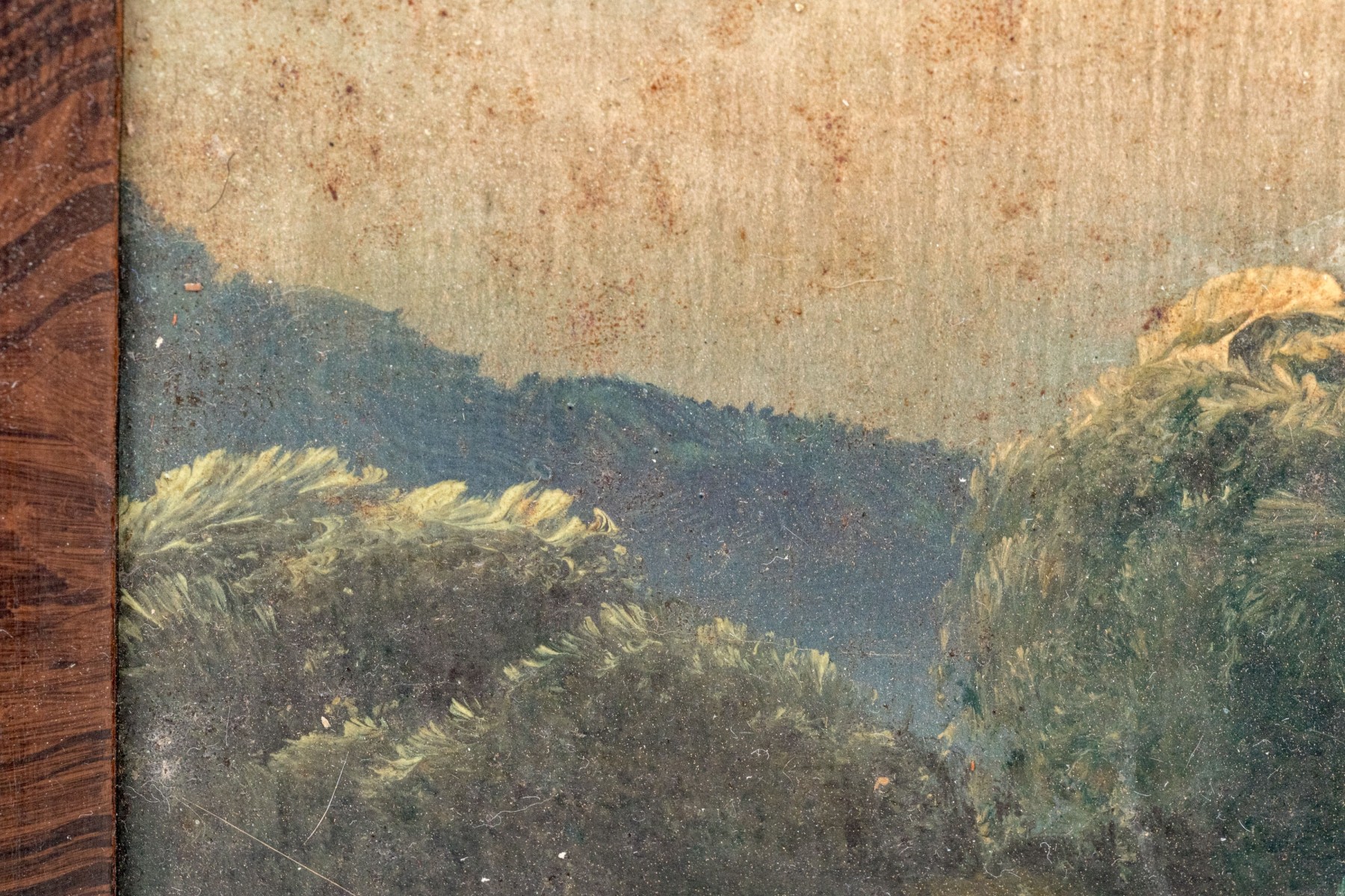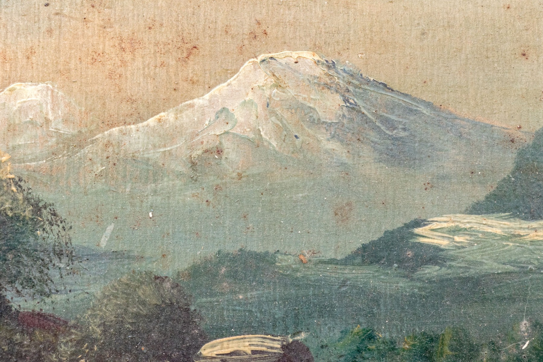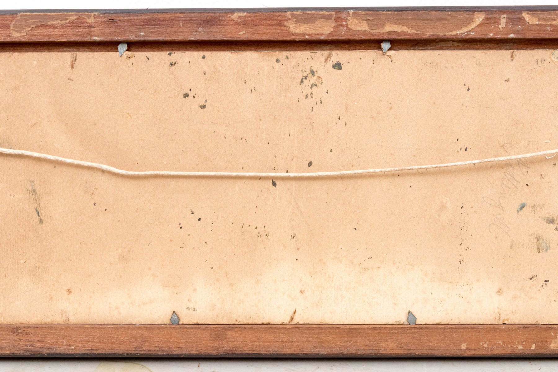 Discoloration and minor paint loss to the painting but beautiful nonetheless. A loss at upper left corner and wear to the frame.
