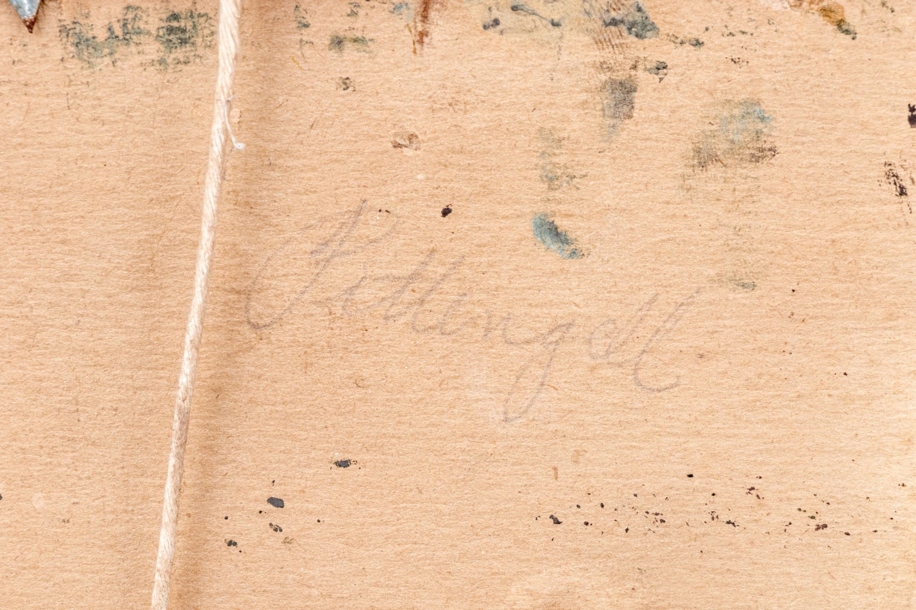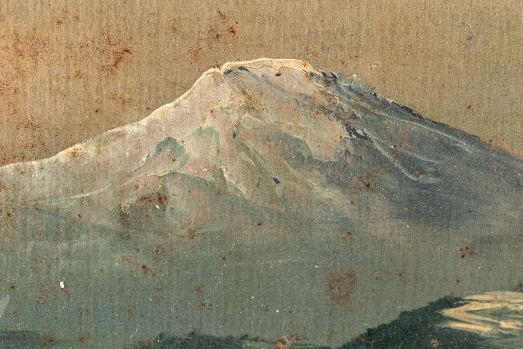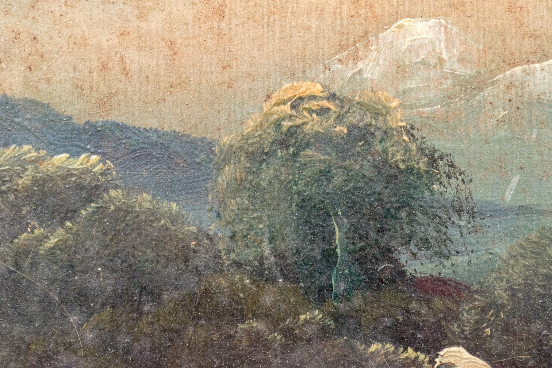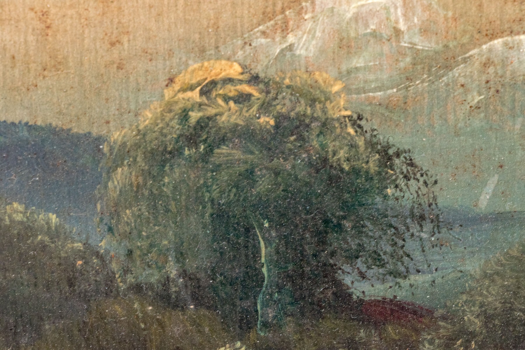 Discoloration and minor paint loss to the painting but beautiful nonetheless. A loss at upper left corner and wear to the frame.
