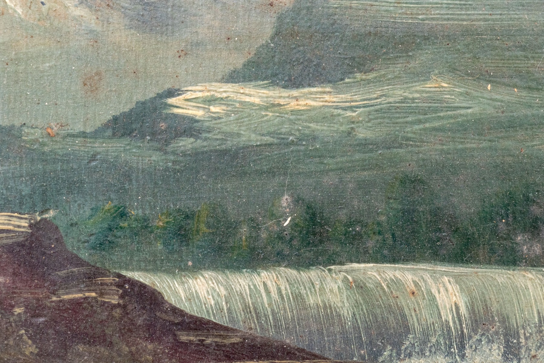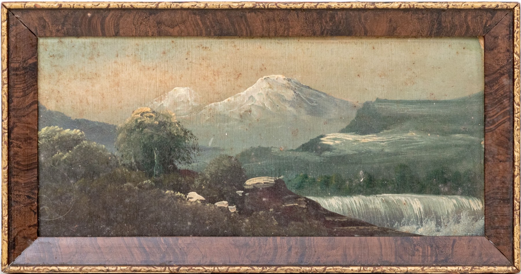 A nicely rendered antique American school oil painting on board depicting a natural landscape with lush forests flanking a waterfall leading to a view of snow-capped mountains in the background. Pencil marked indistinctly on the board verso.