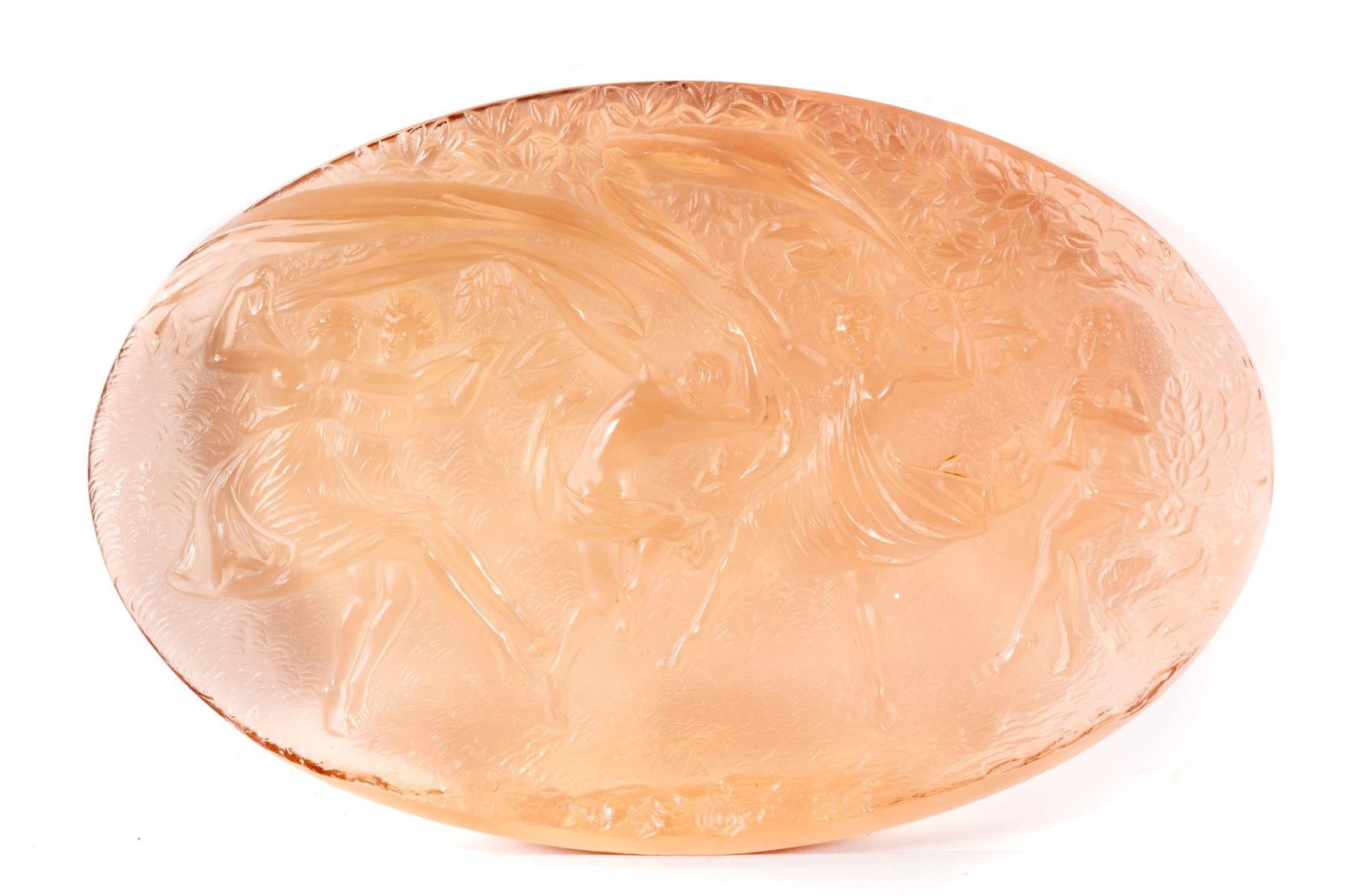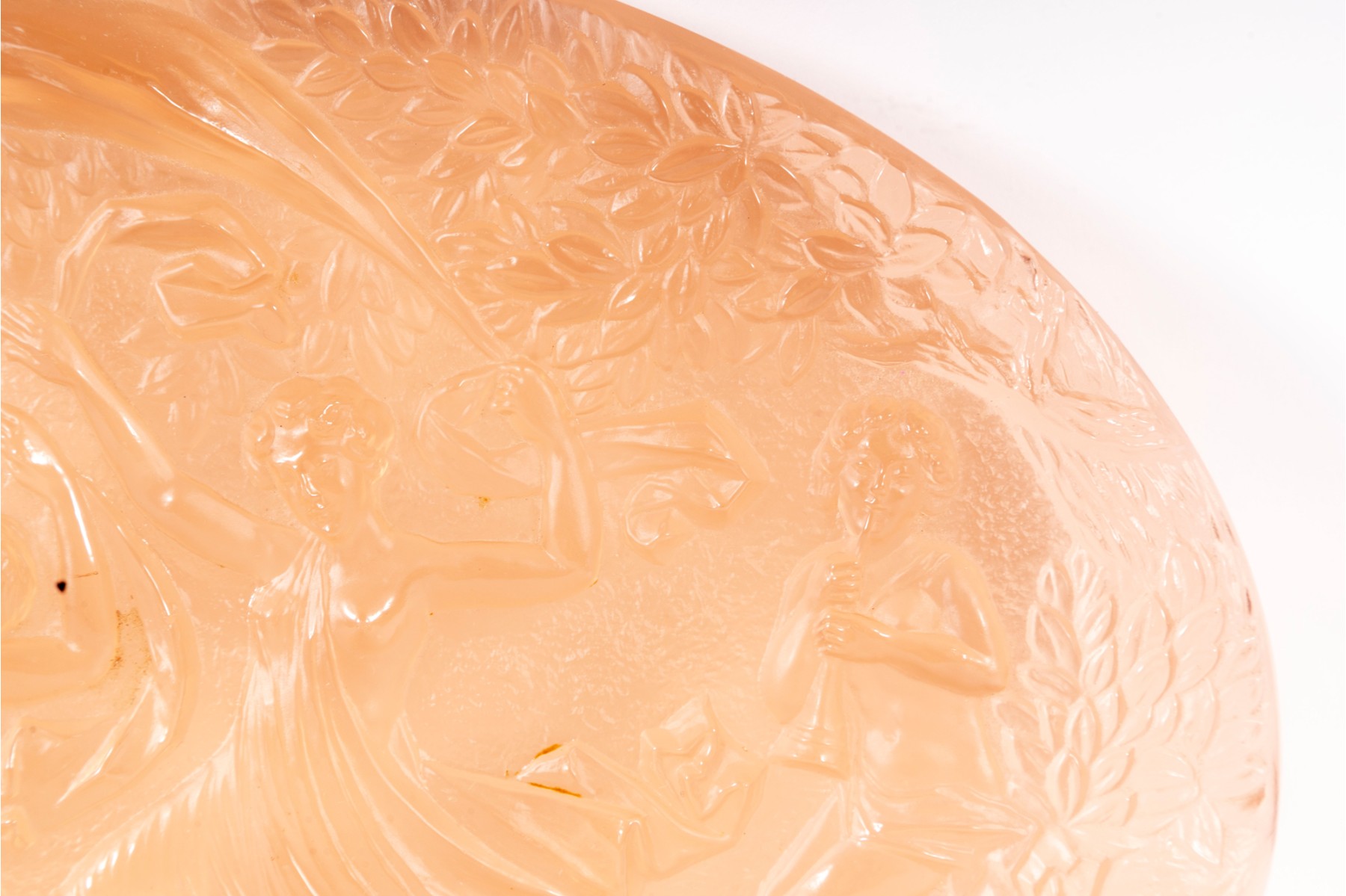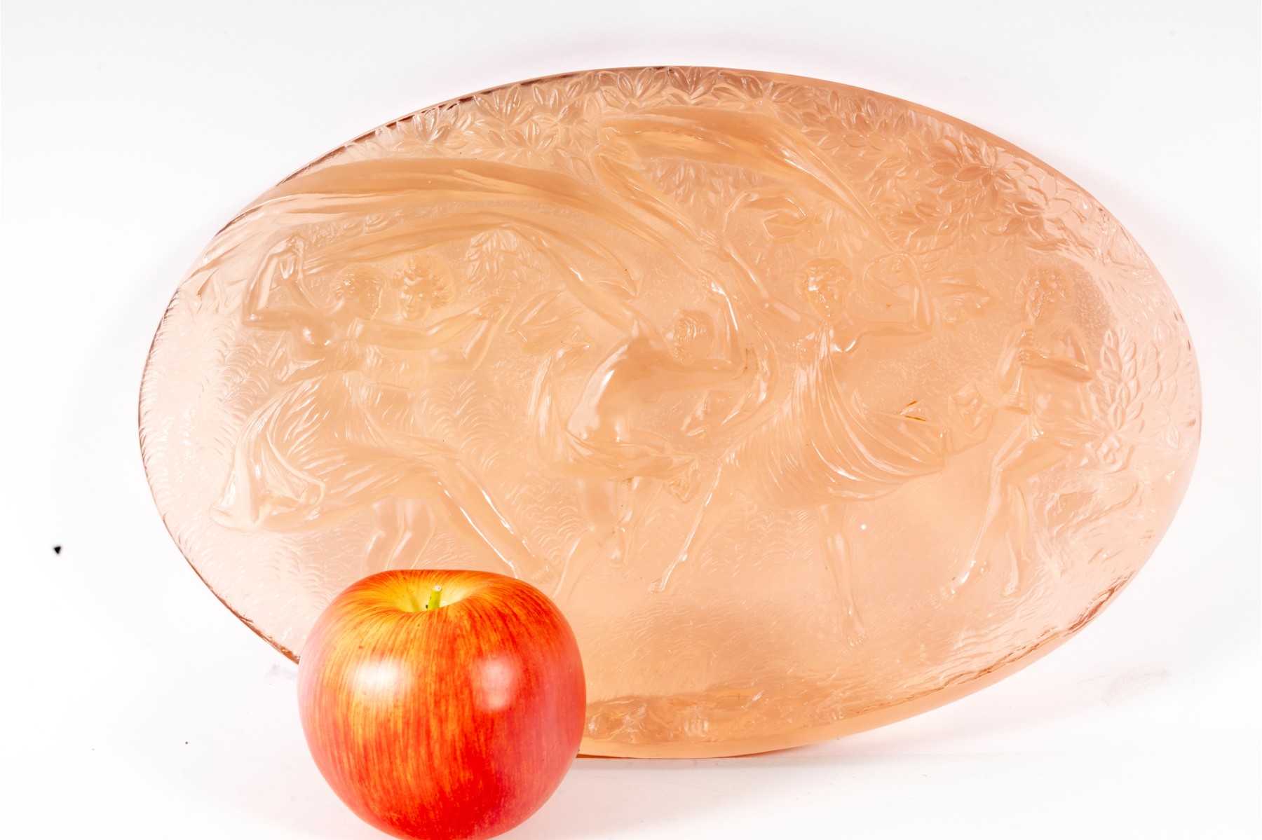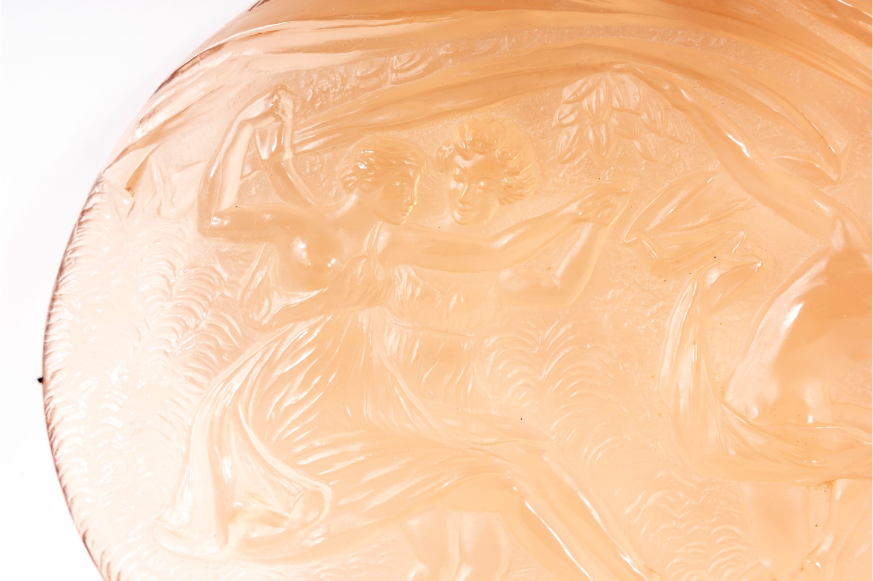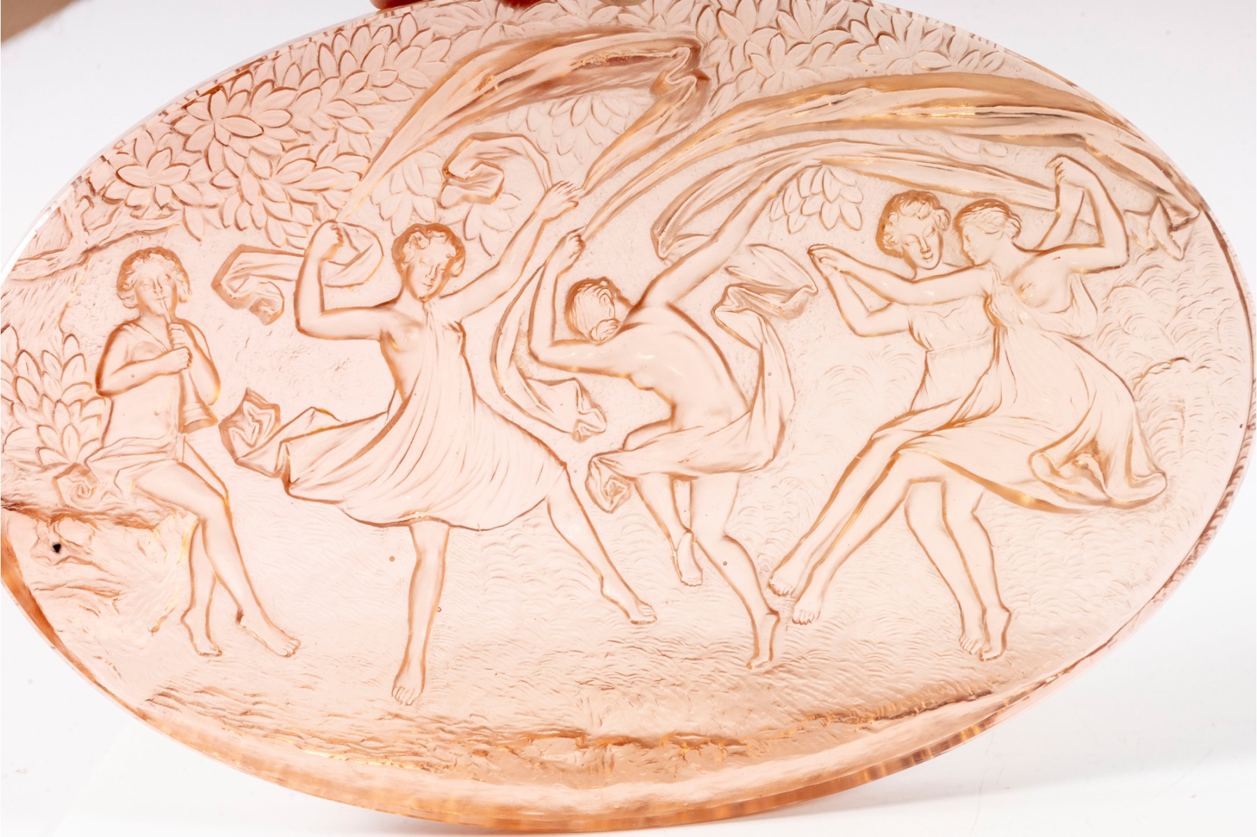A small oval plaque composed of rose-colored glass -- pressed with Greek dancing nymphs outlined in relief. Many of these examples were produced in Germany in the early 1900's.