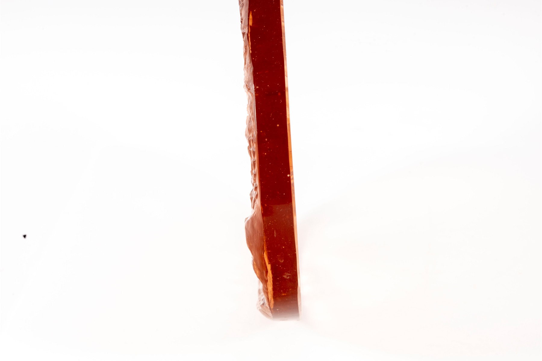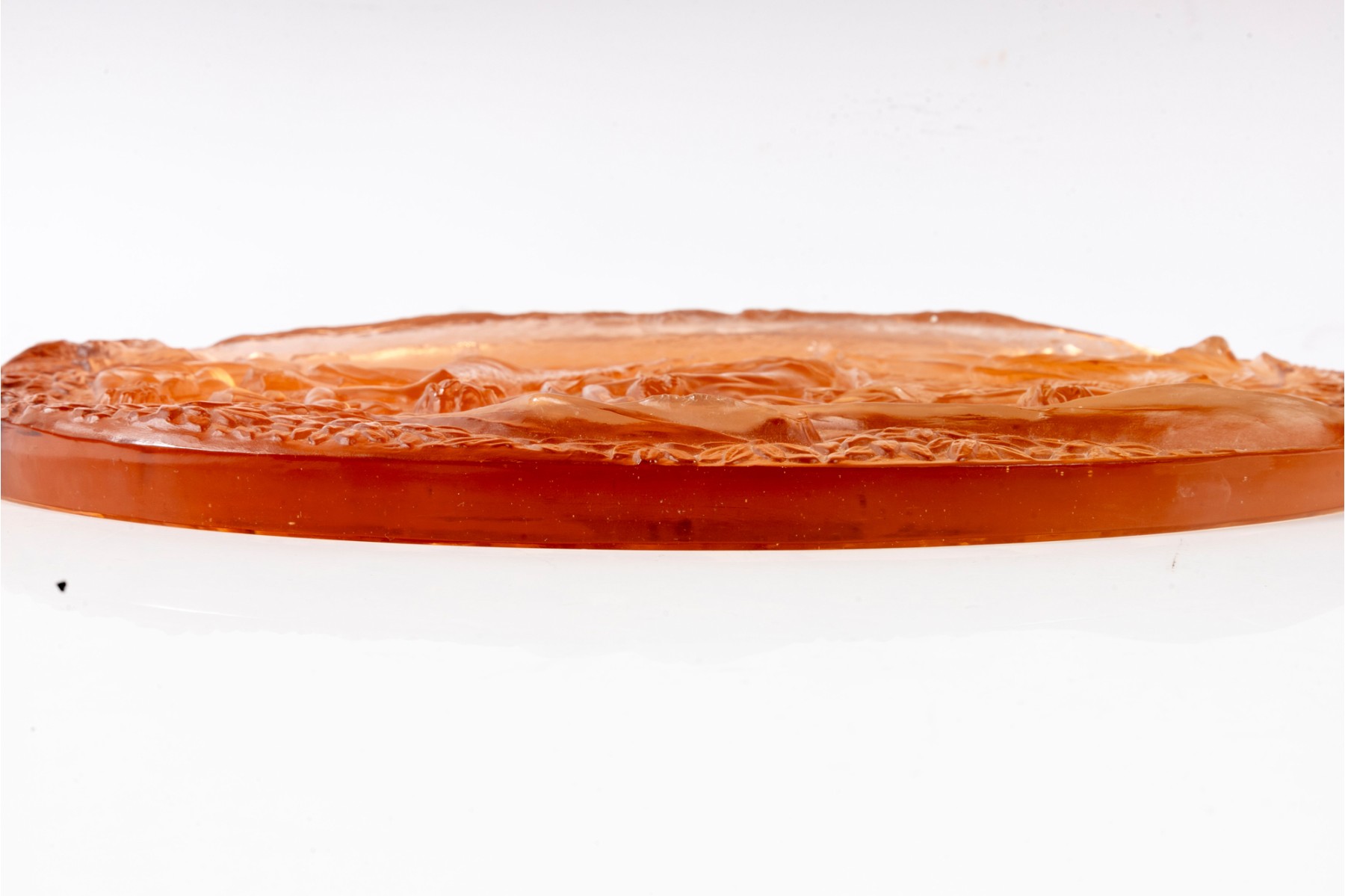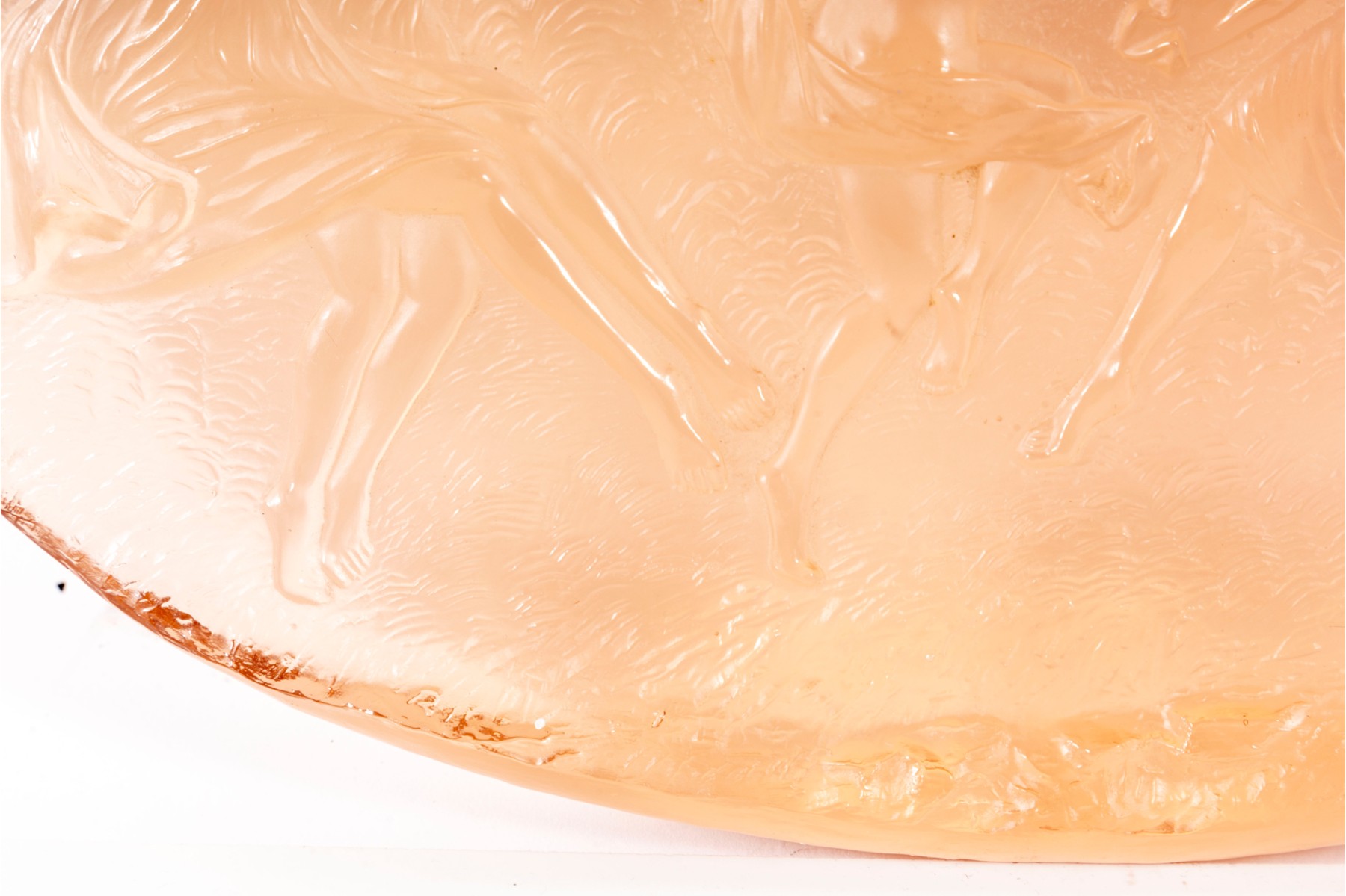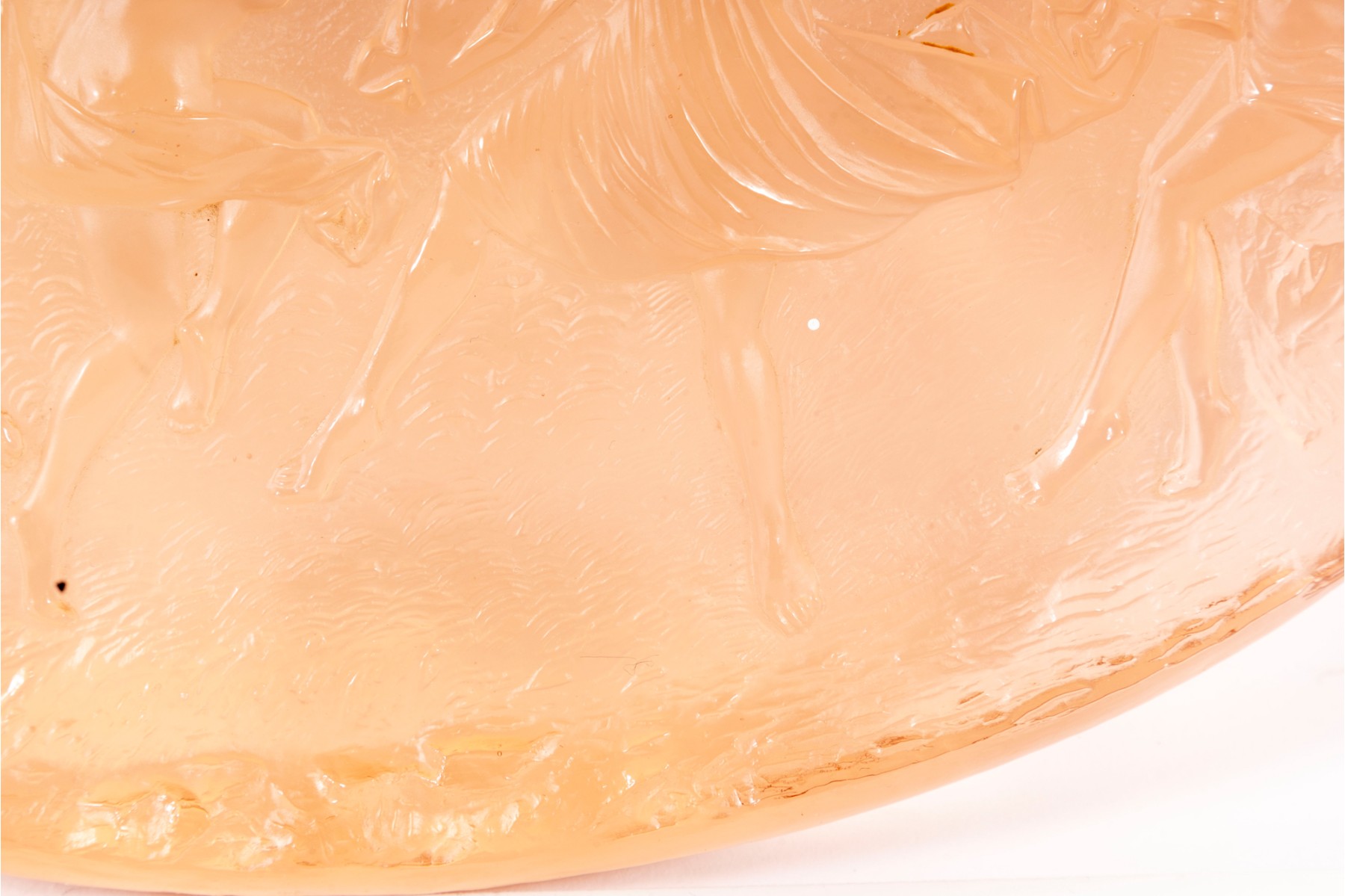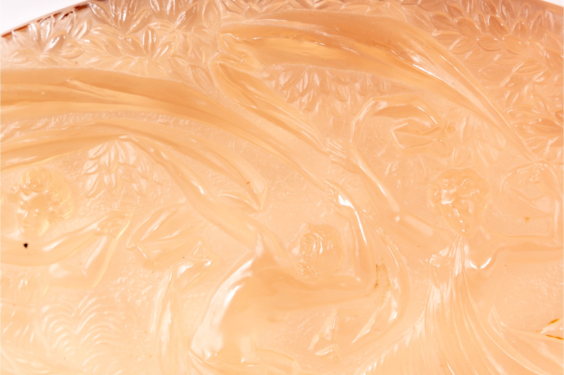 A small oval plaque composed of rose-colored glass -- pressed with Greek dancing nymphs outlined in relief. Many of these examples were produced in Germany in the early 1900's.