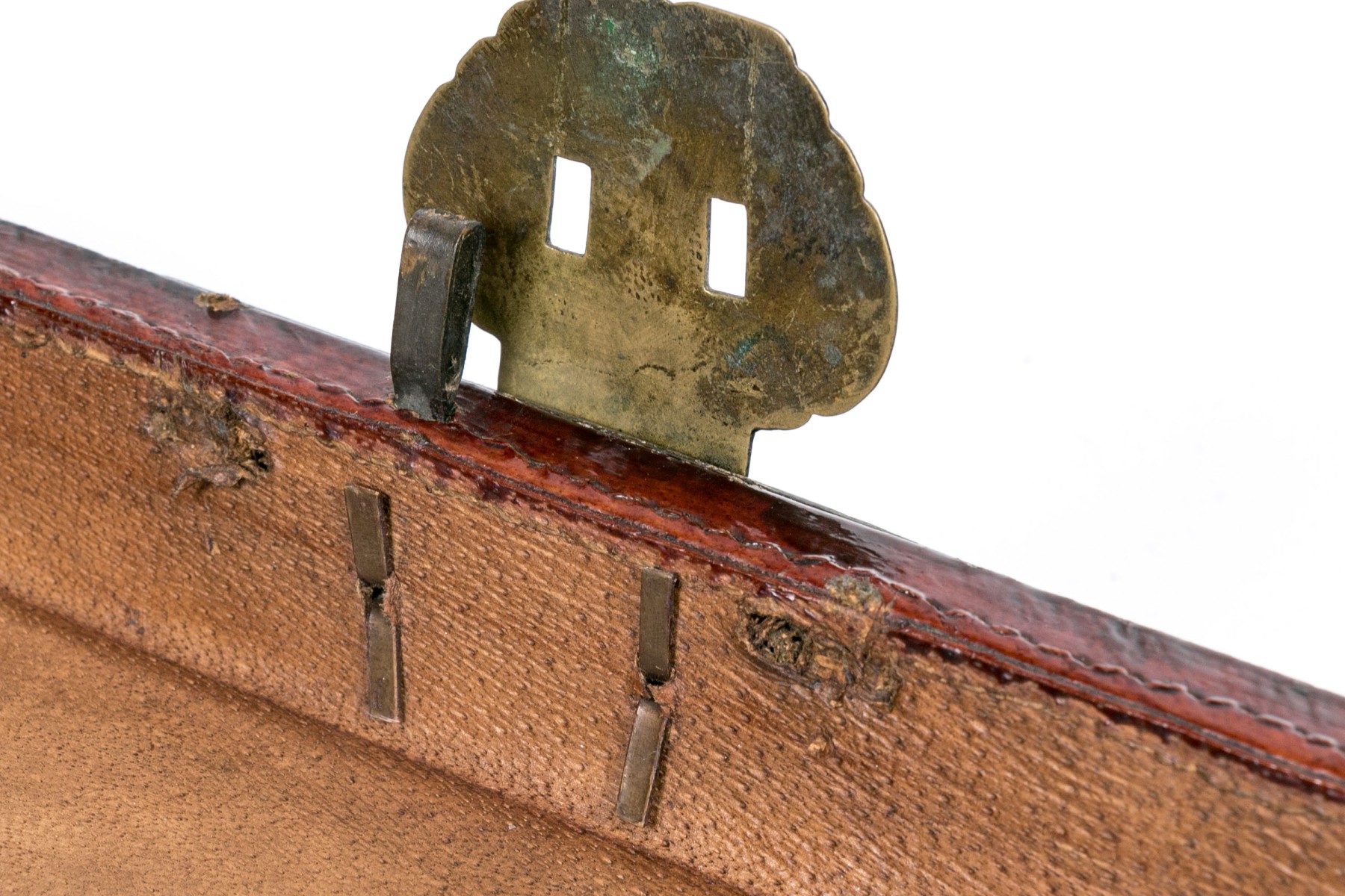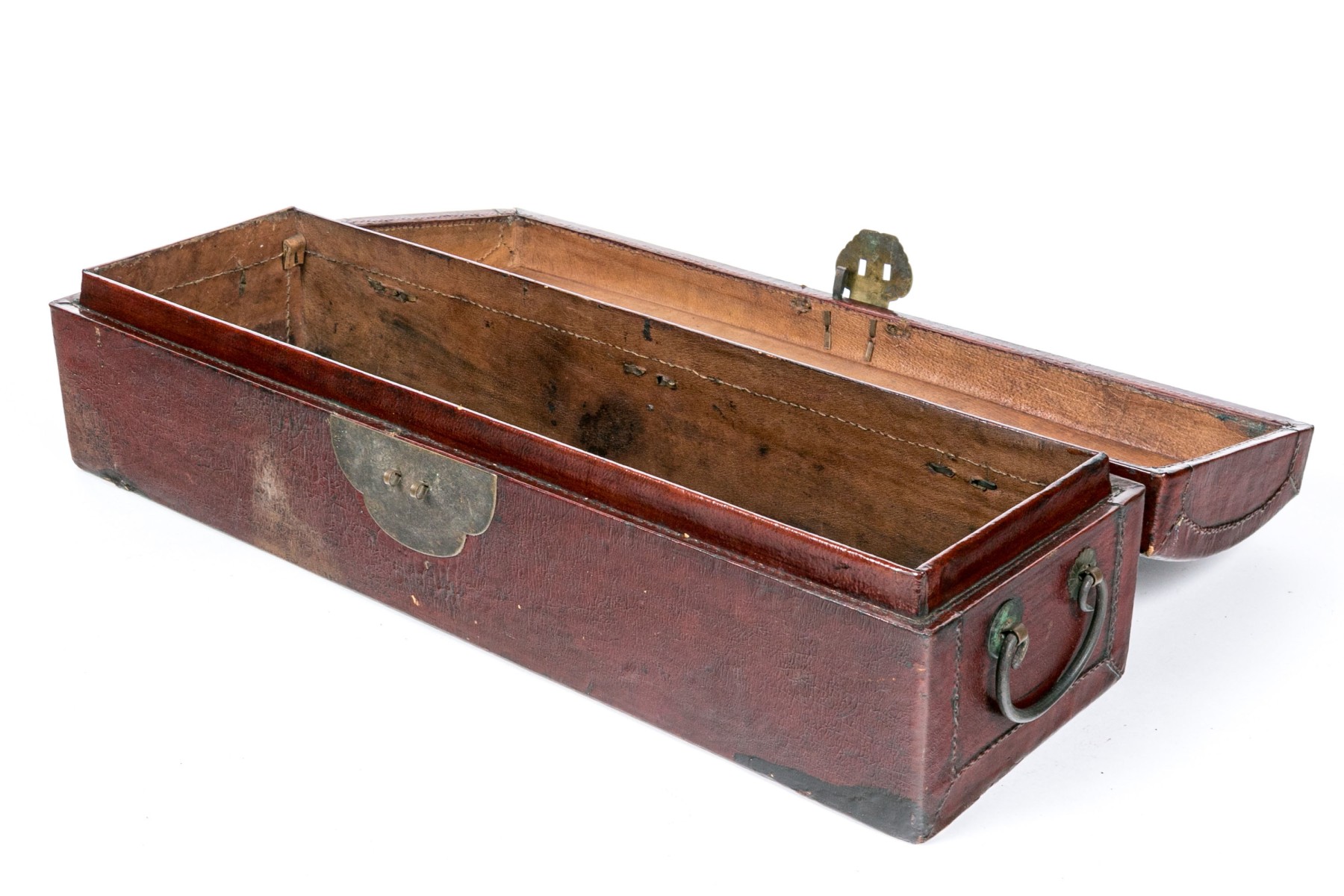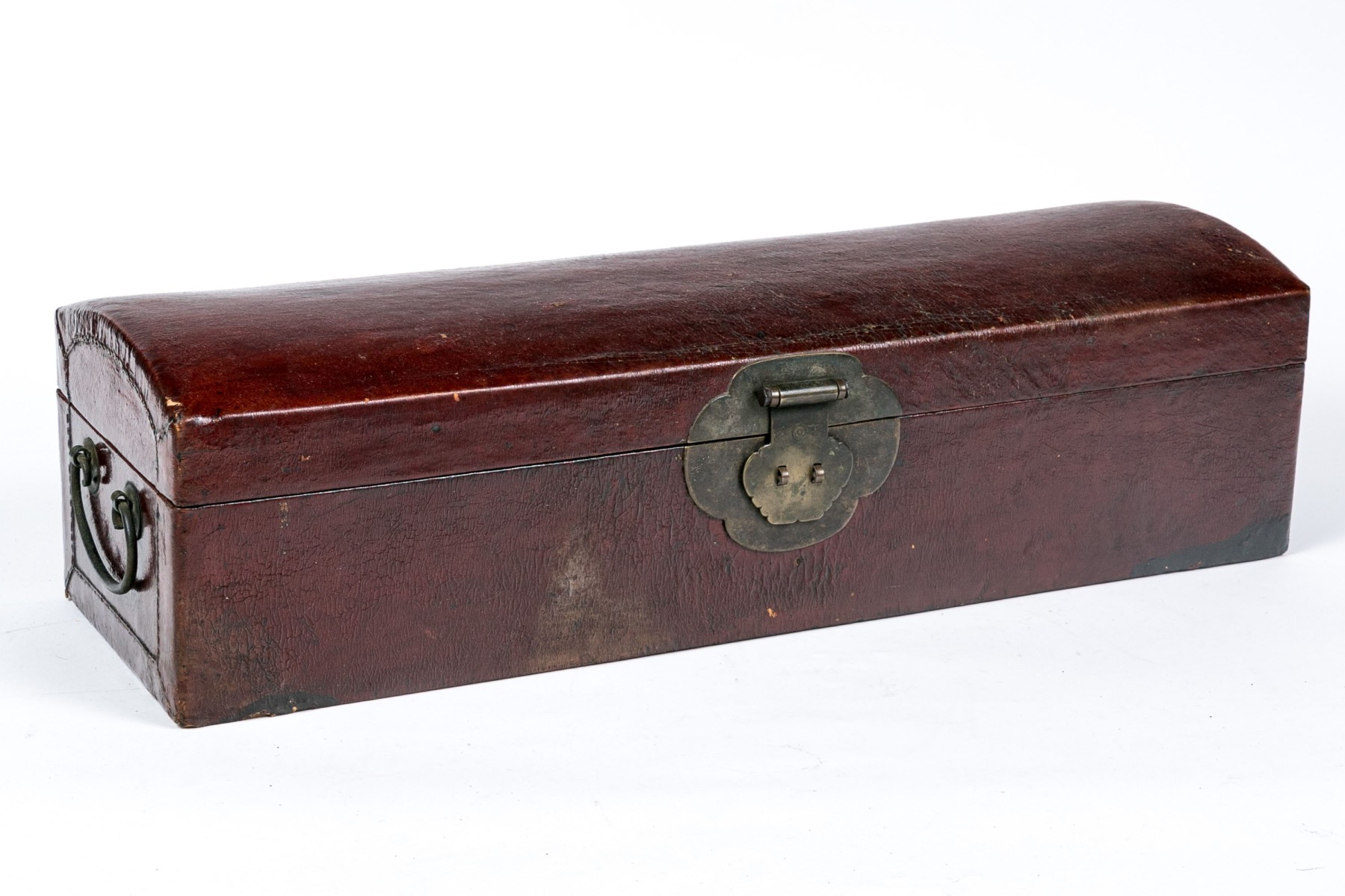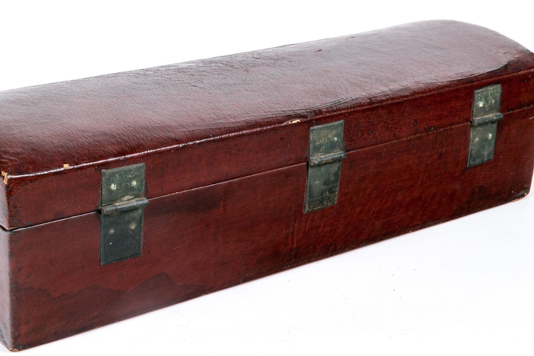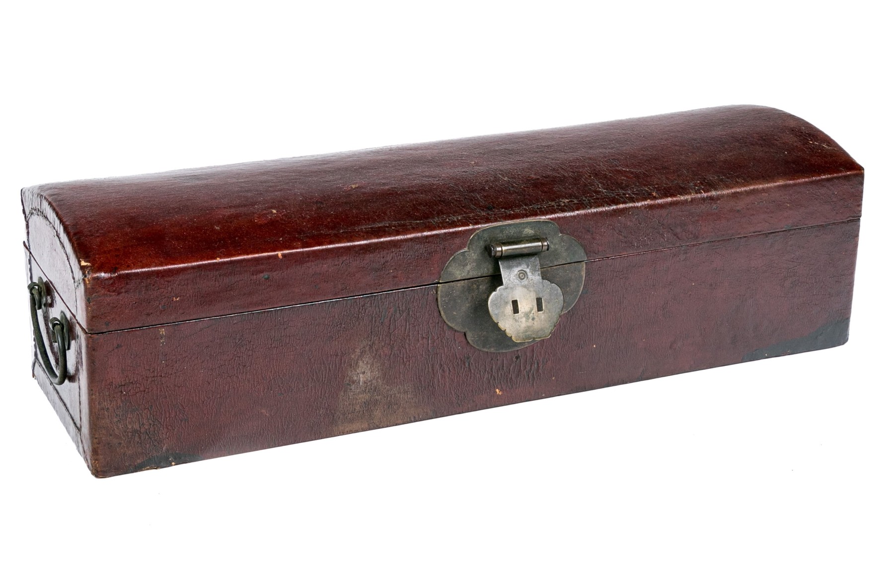 A long rectangular box covered in oxblood tone stained leather. With metal tin handles and front lock mount (lacking the pin). Inside the lid is an attached leather strip with inscription.