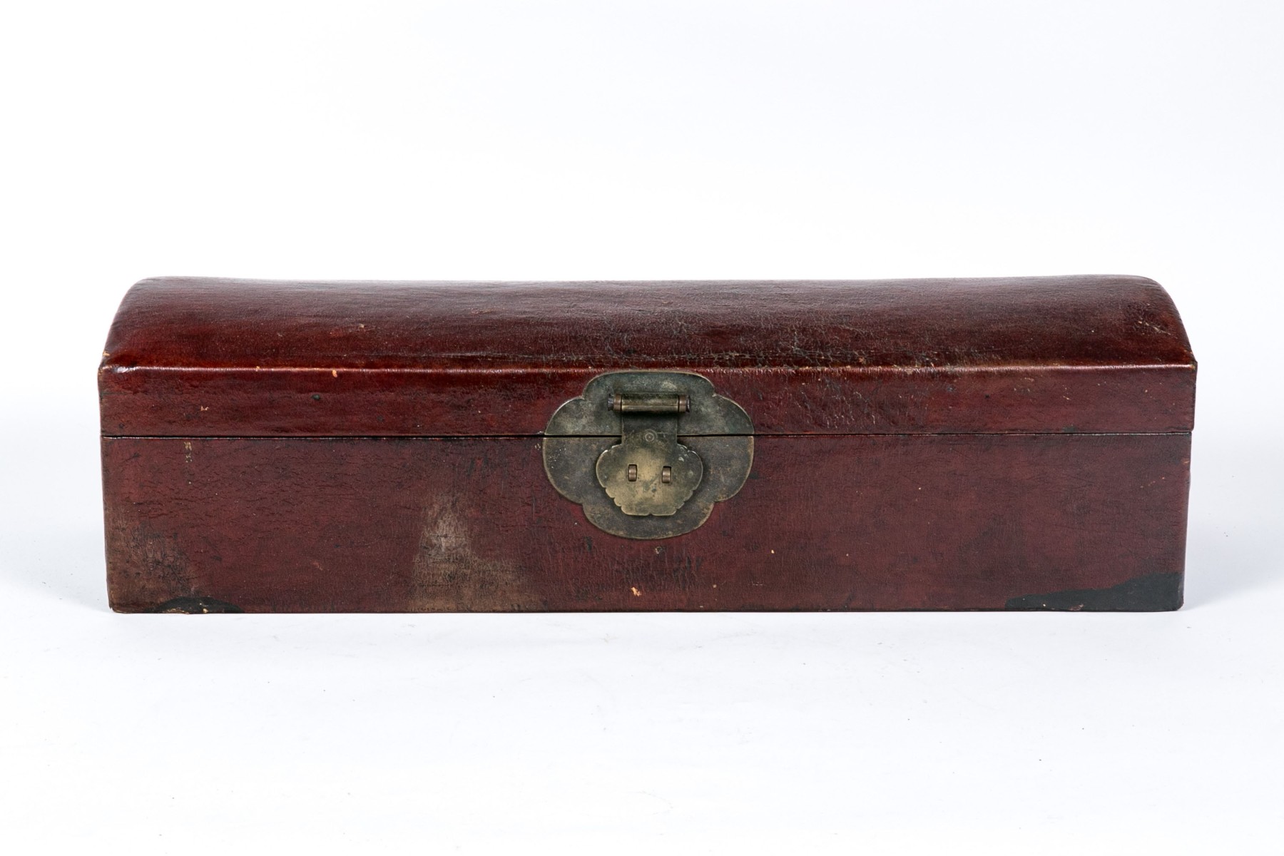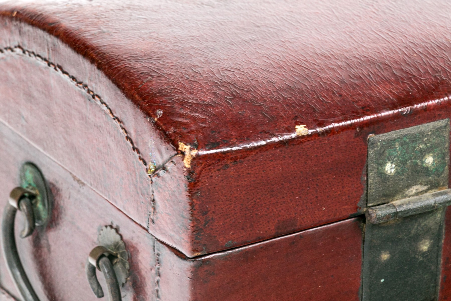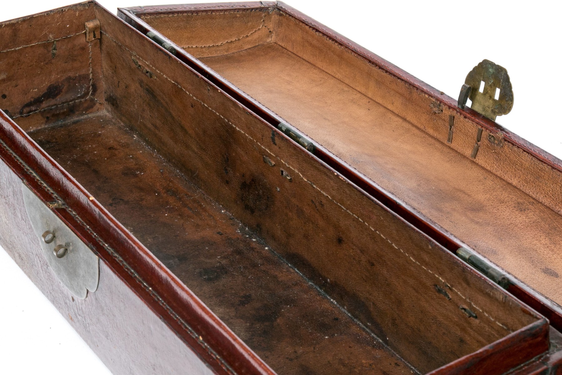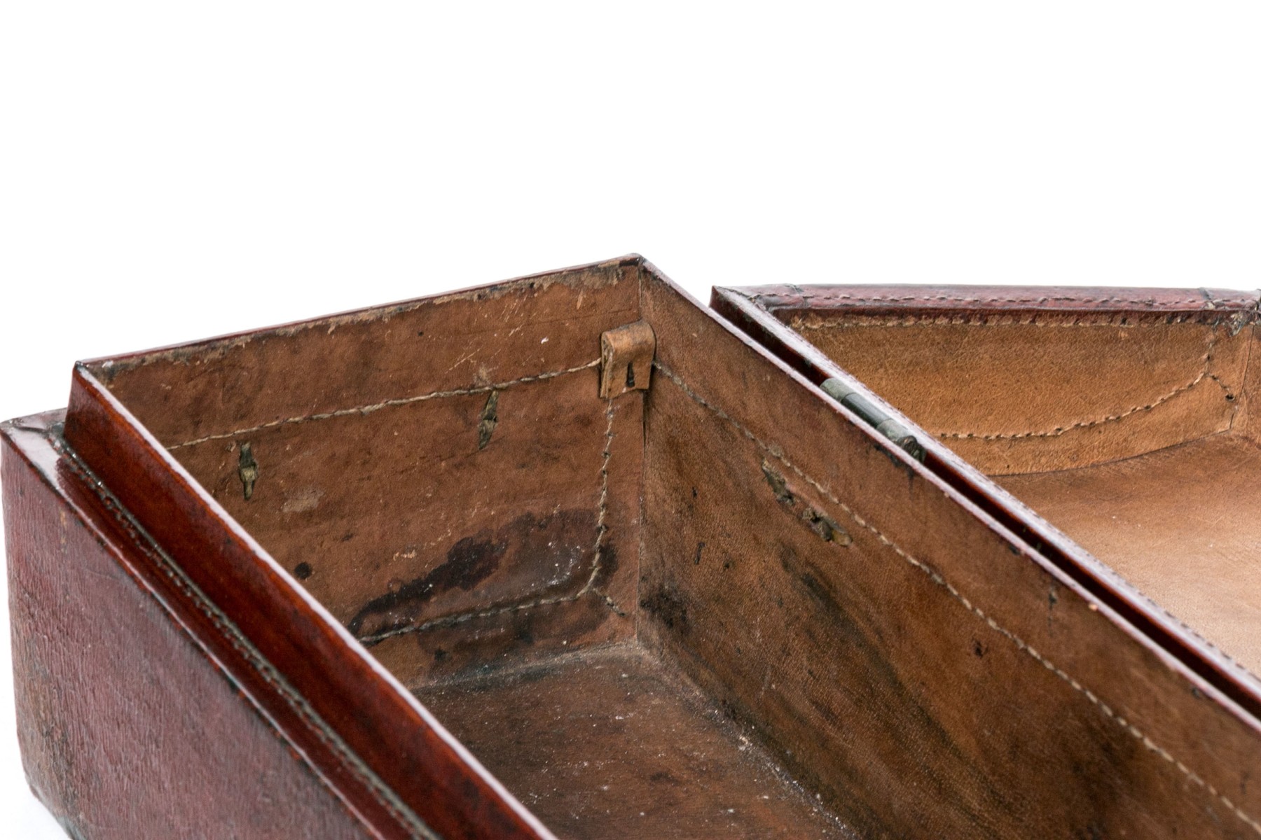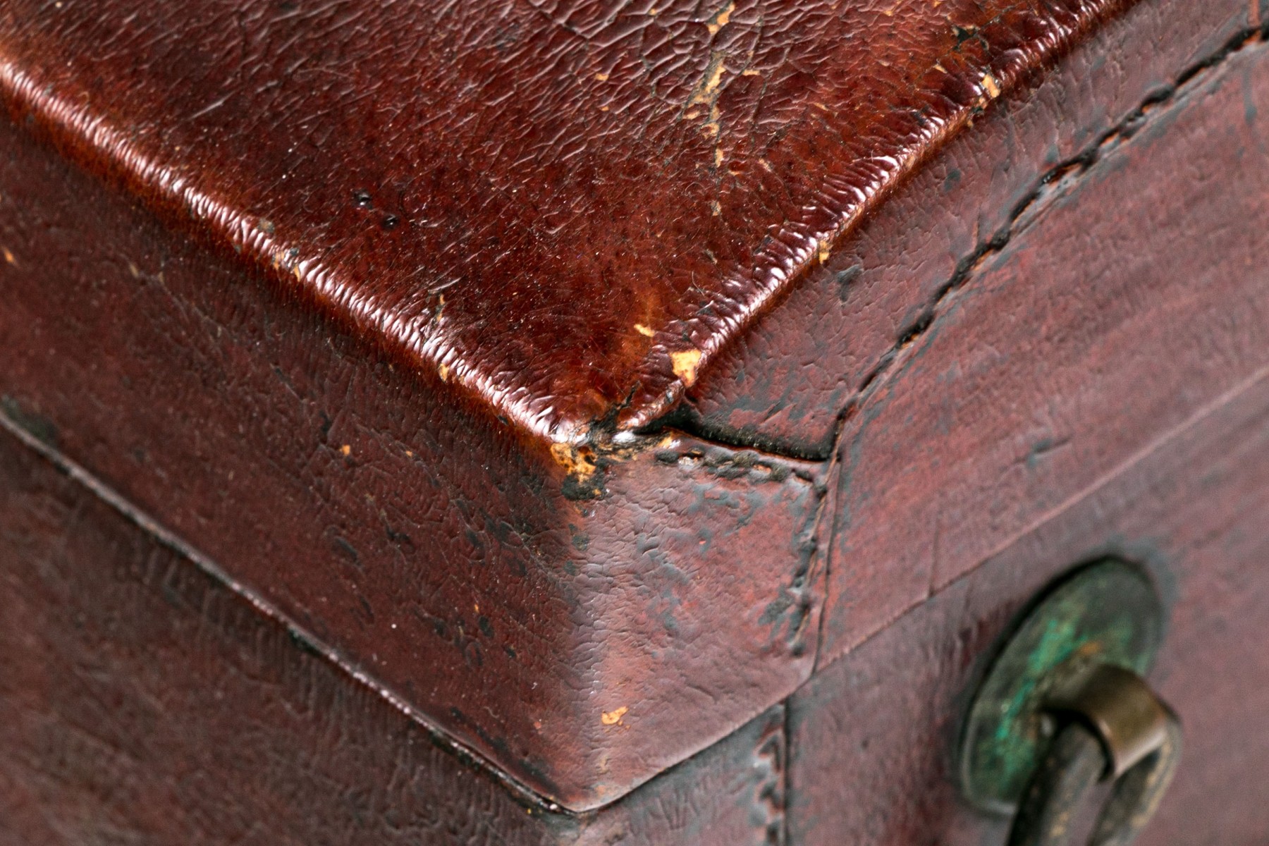 A long rectangular box covered in oxblood tone stained leather. With metal tin handles and front lock mount (lacking the pin). Inside the lid is an attached leather strip with inscription.
