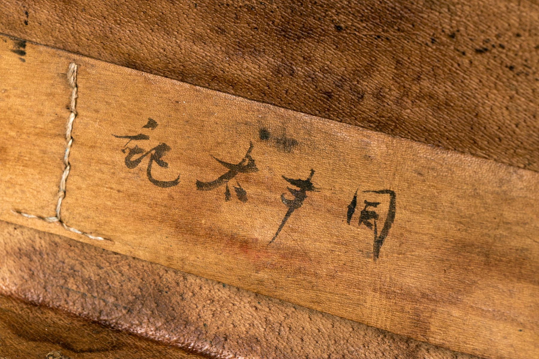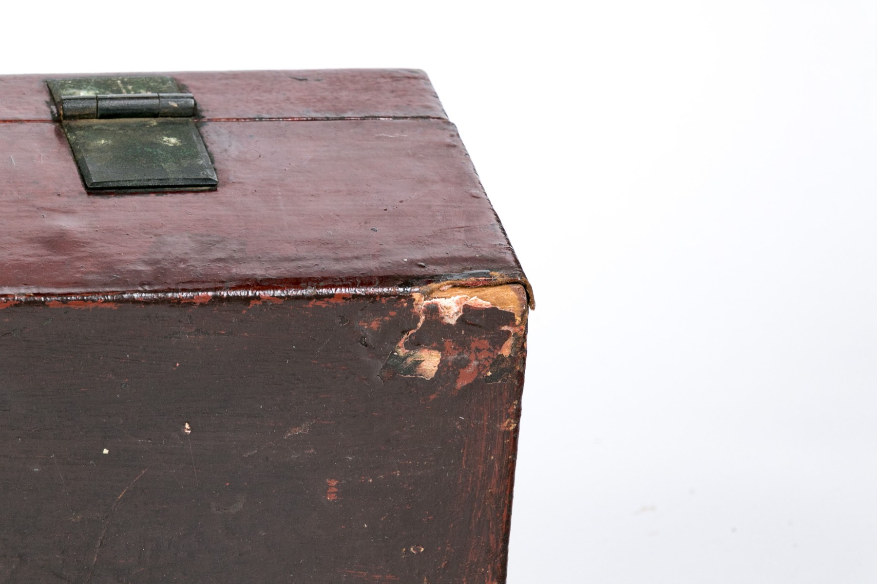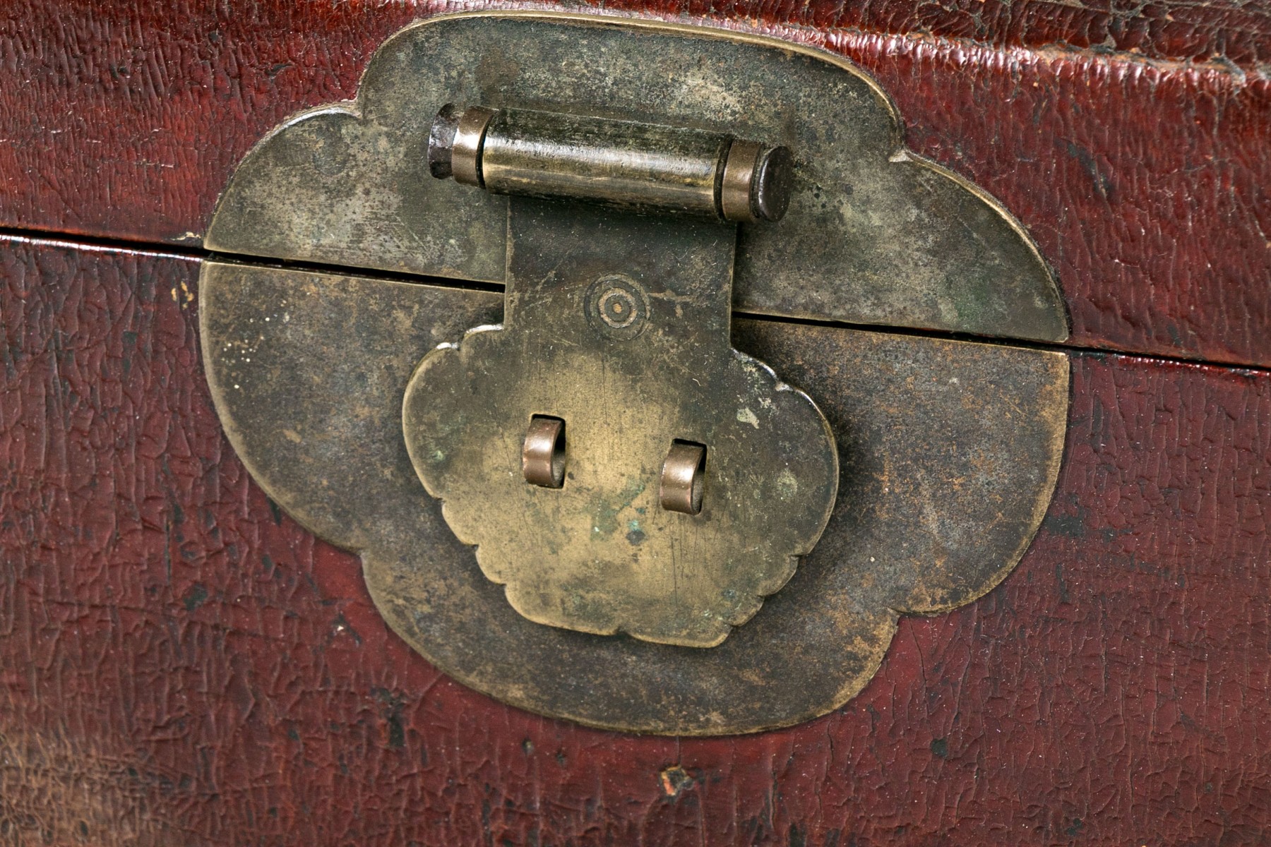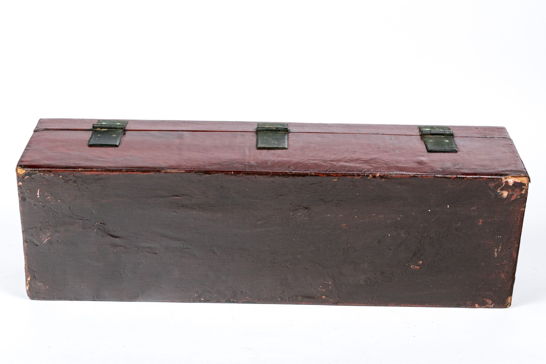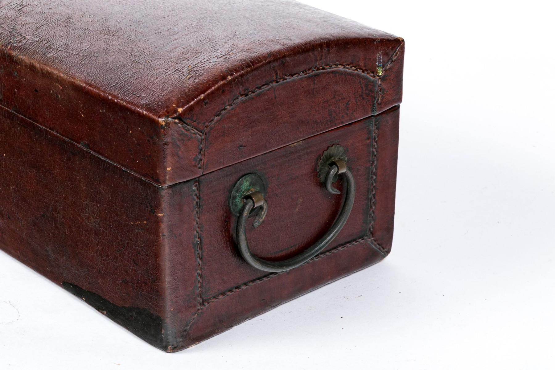 A long rectangular box covered in oxblood tone stained leather. With metal tin handles and front lock mount (lacking the pin). Inside the lid is an attached leather strip with inscription.