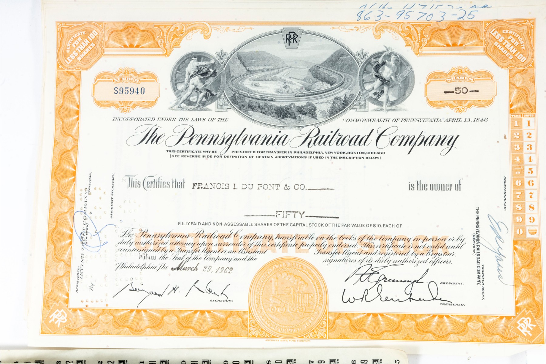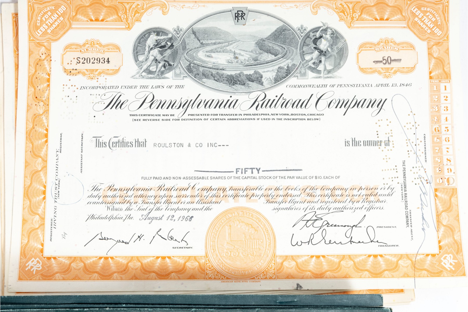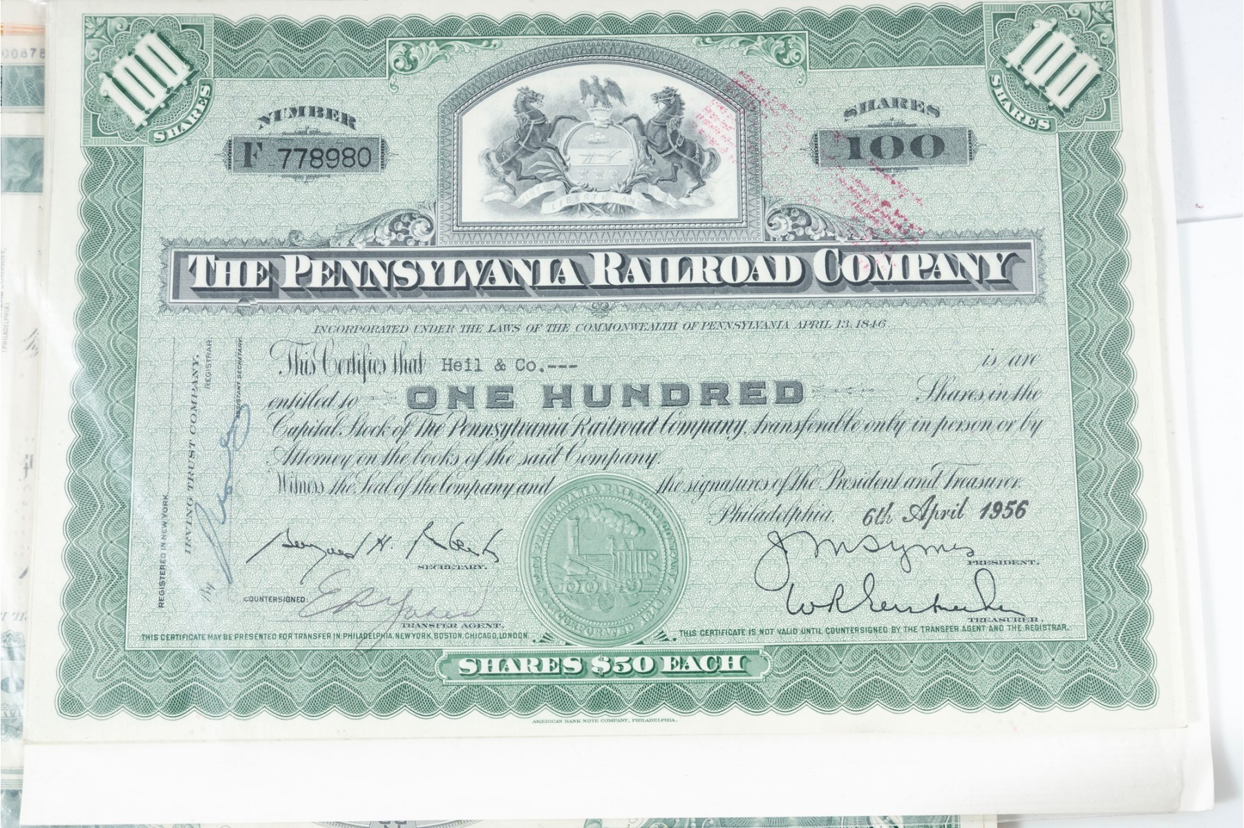 Antique assorted lot of Pennsylvania railroad common stock certificates from the late 19th Century. Hand signed and sealed. Presented within a box, loosely mixed.
