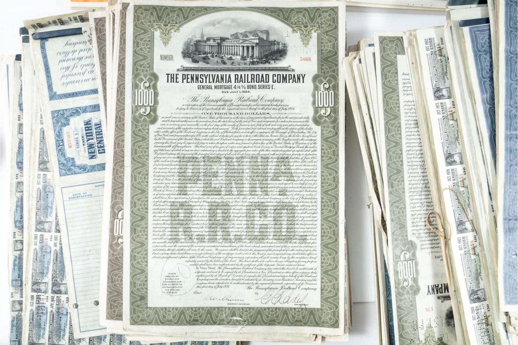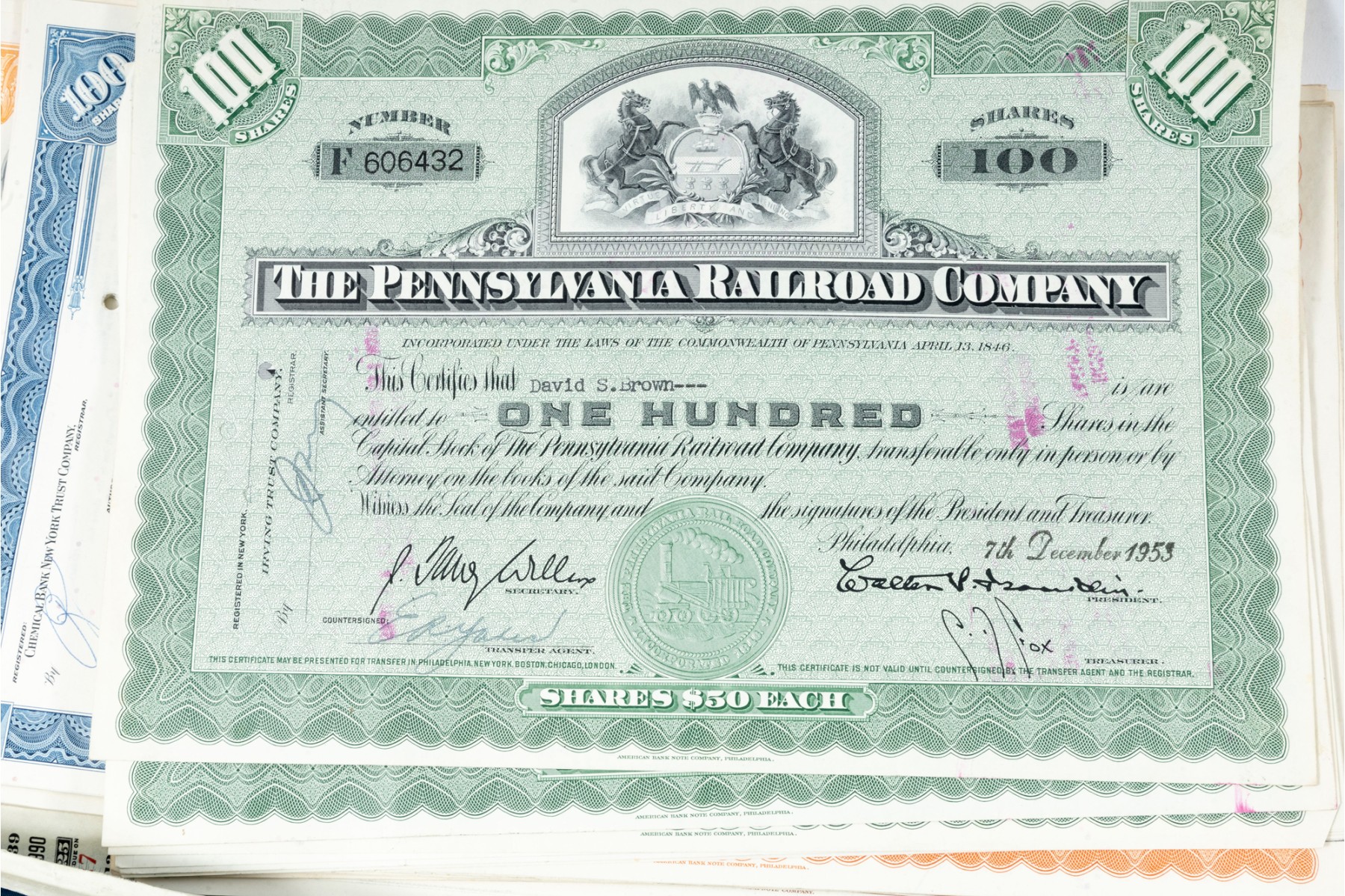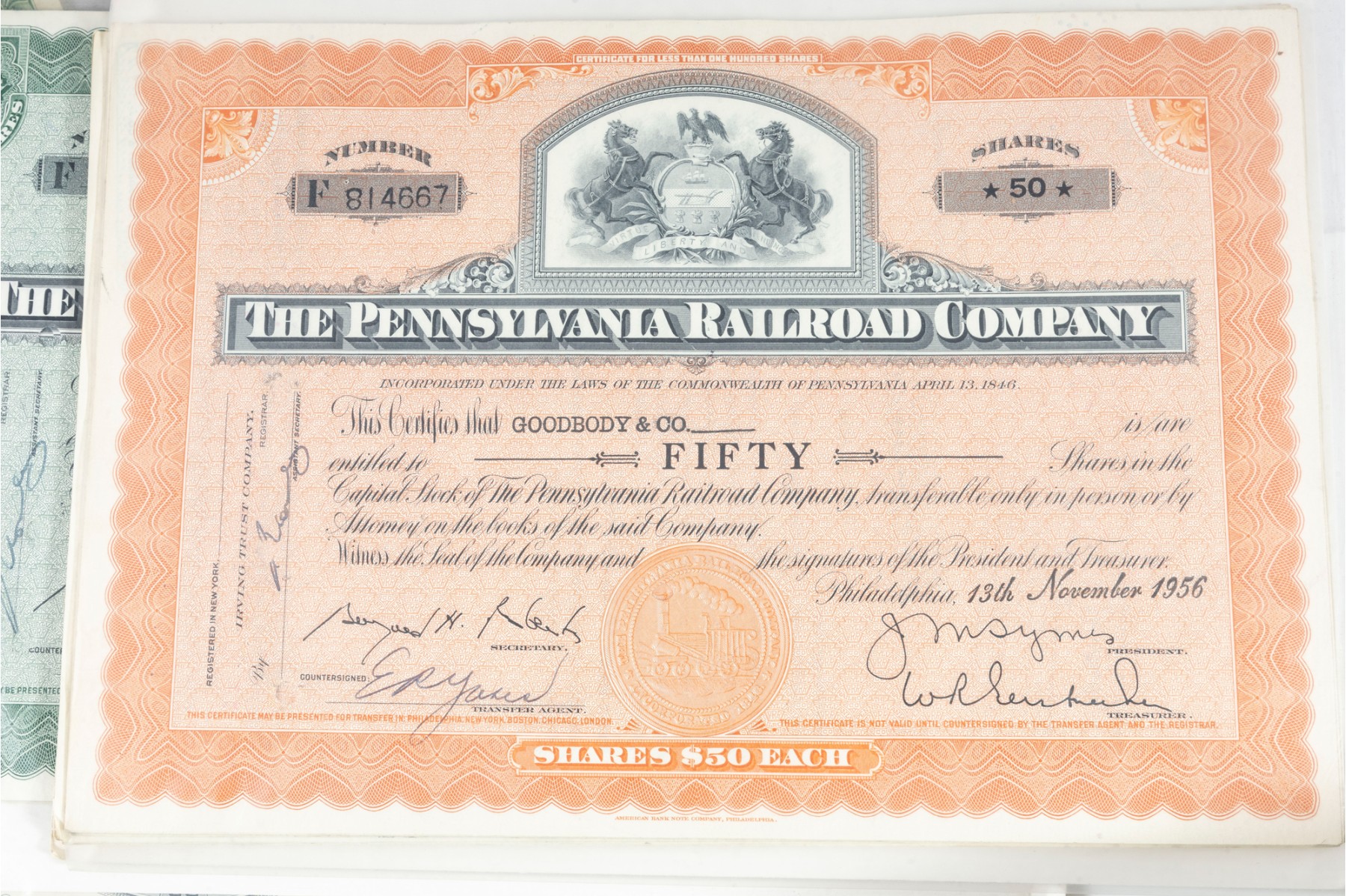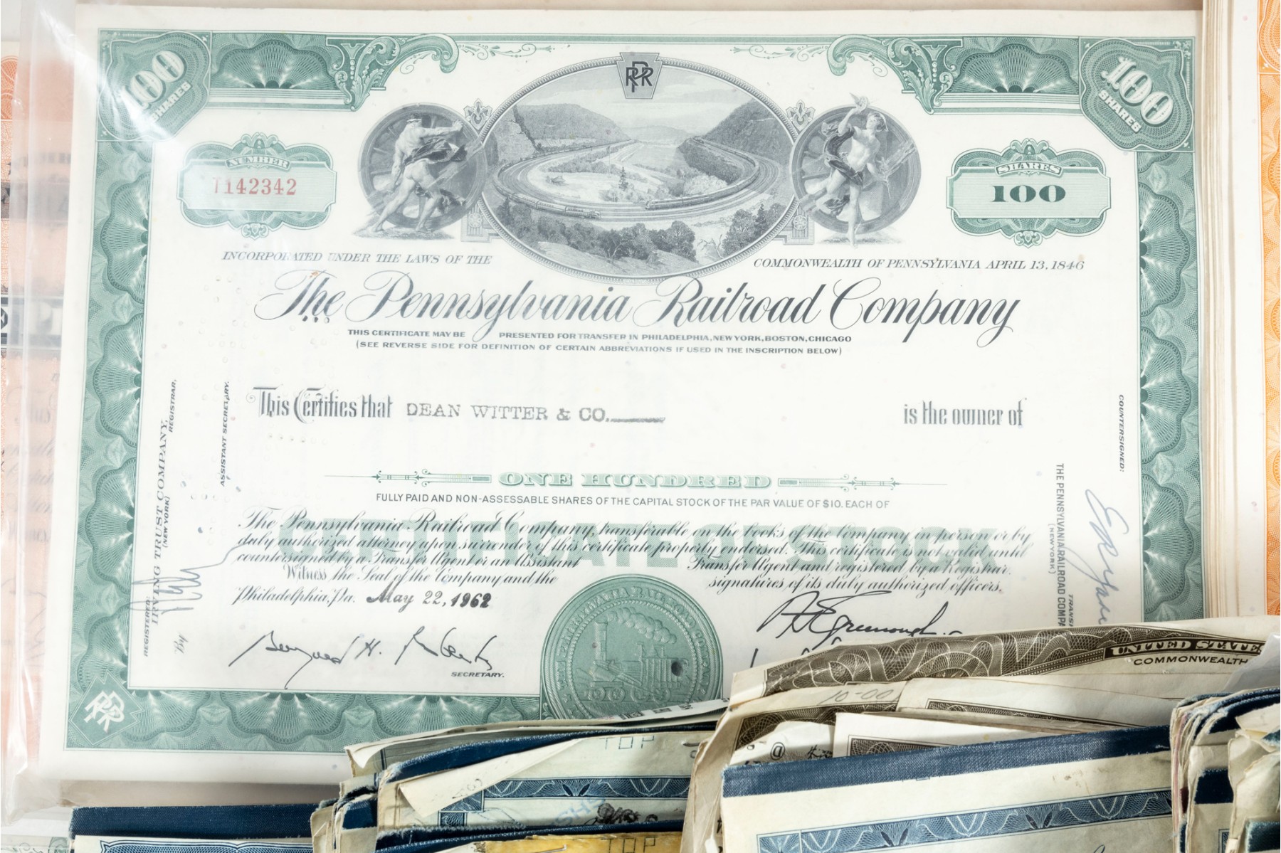 Antique assorted lot of Pennsylvania railroad common stock certificates from the late 19th Century. Hand signed and sealed. Presented within a box, loosely mixed.