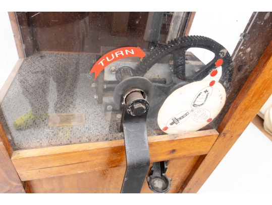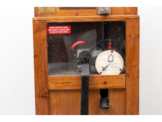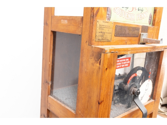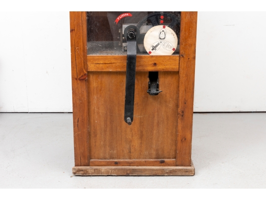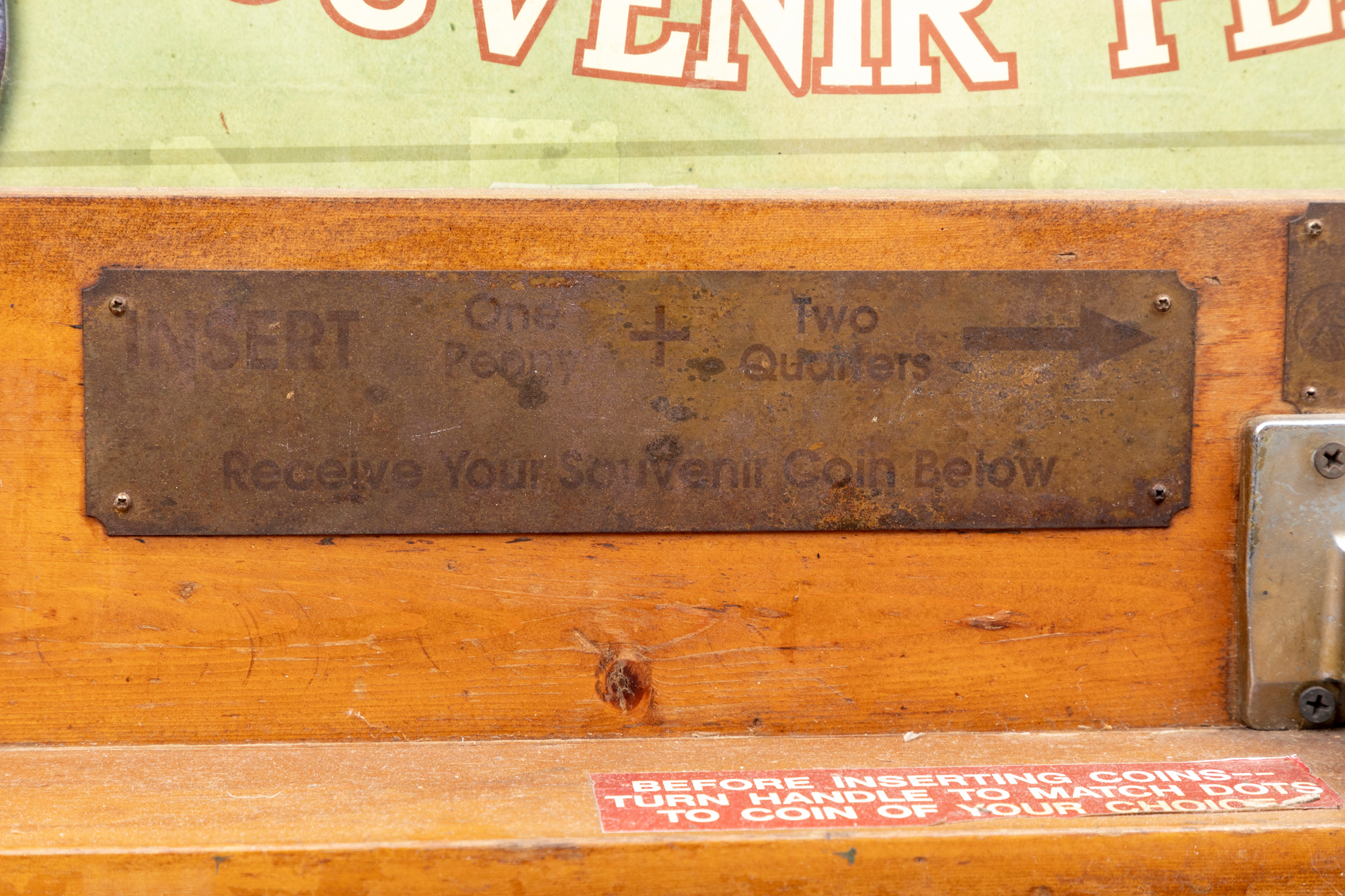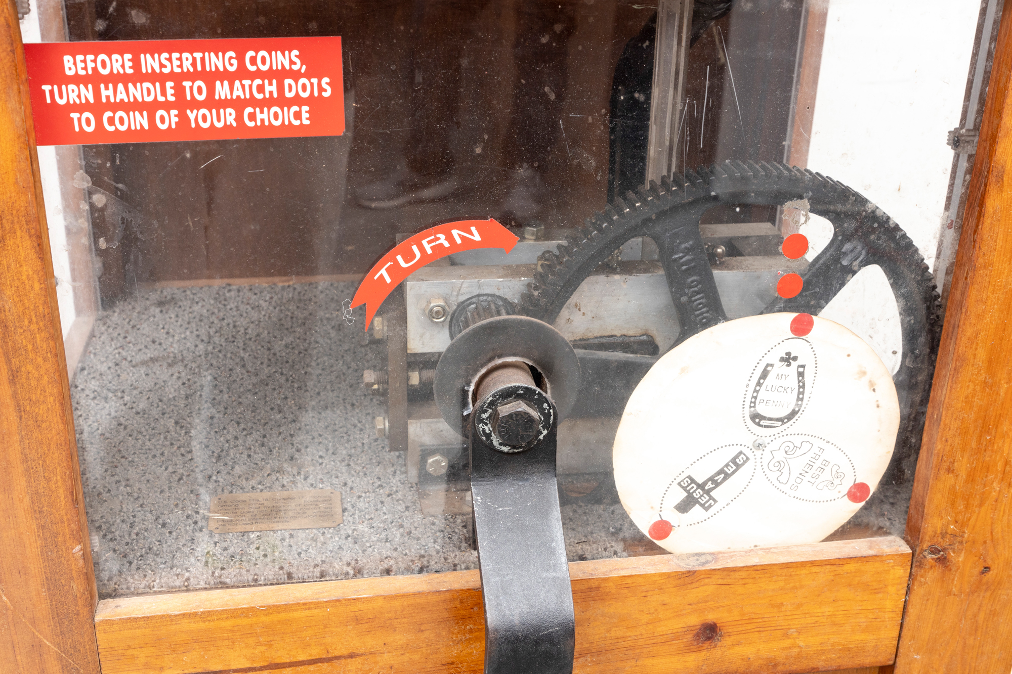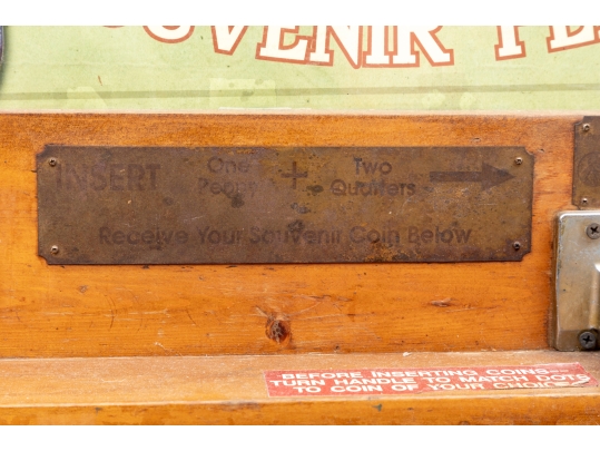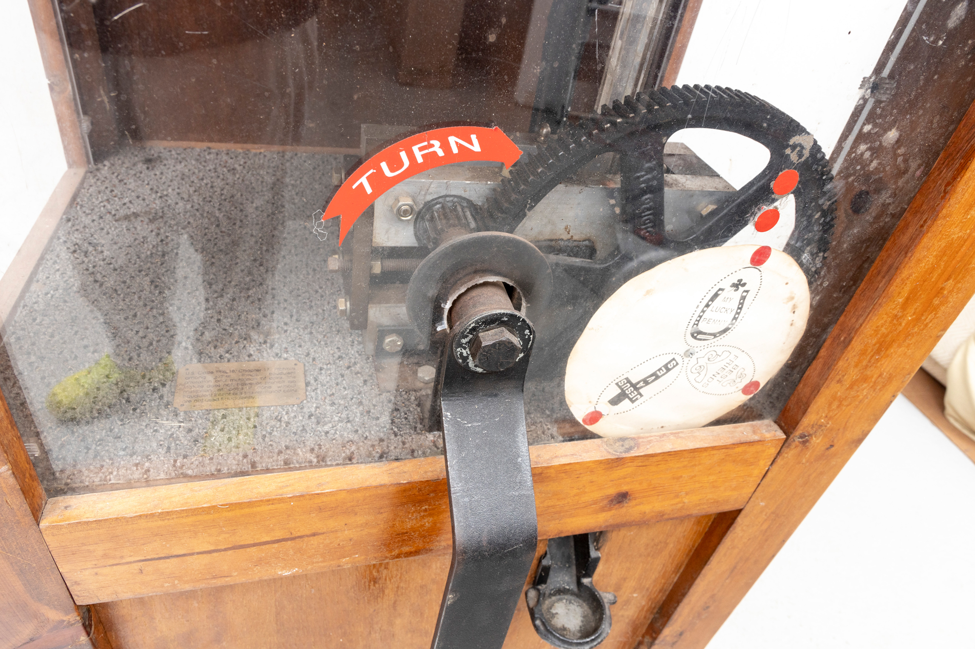Maple cabinet with brass plaques and painted iron mechanism. Costing two quarters and a penny to play. Not tested for working condition.