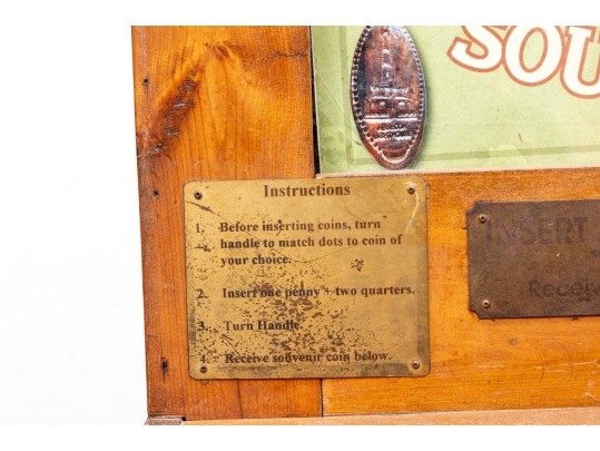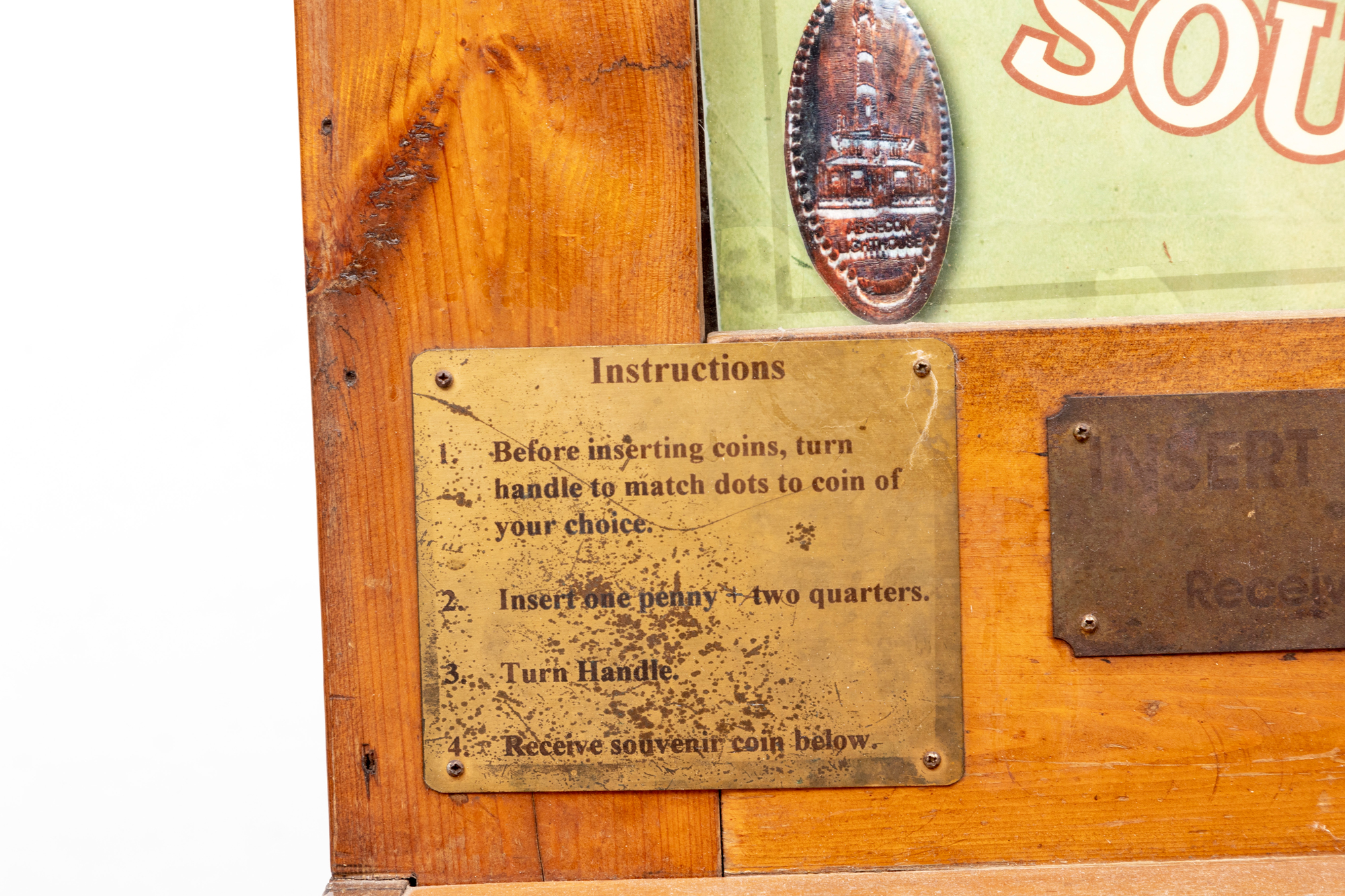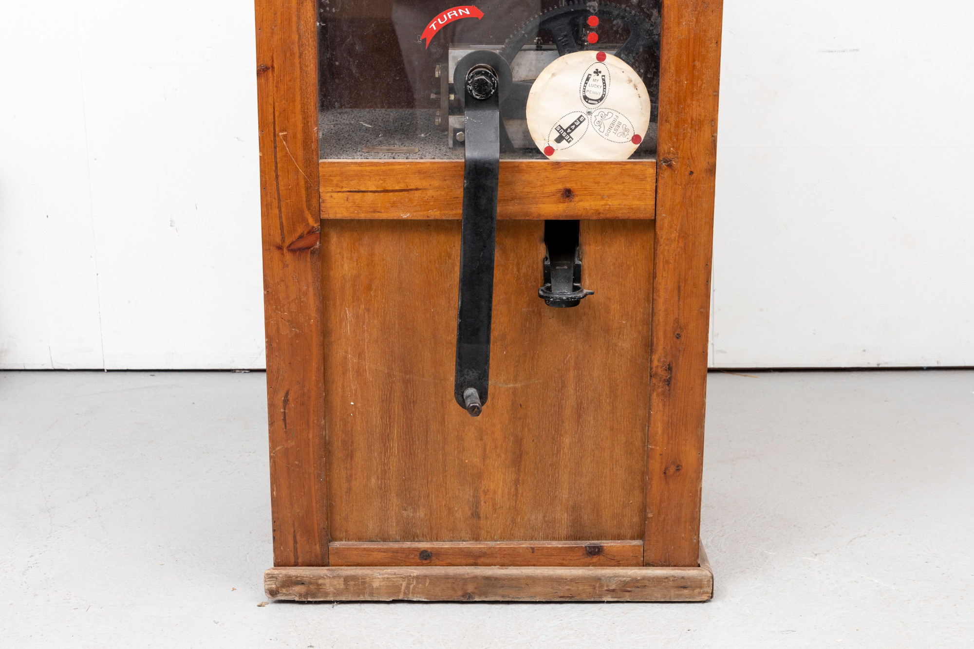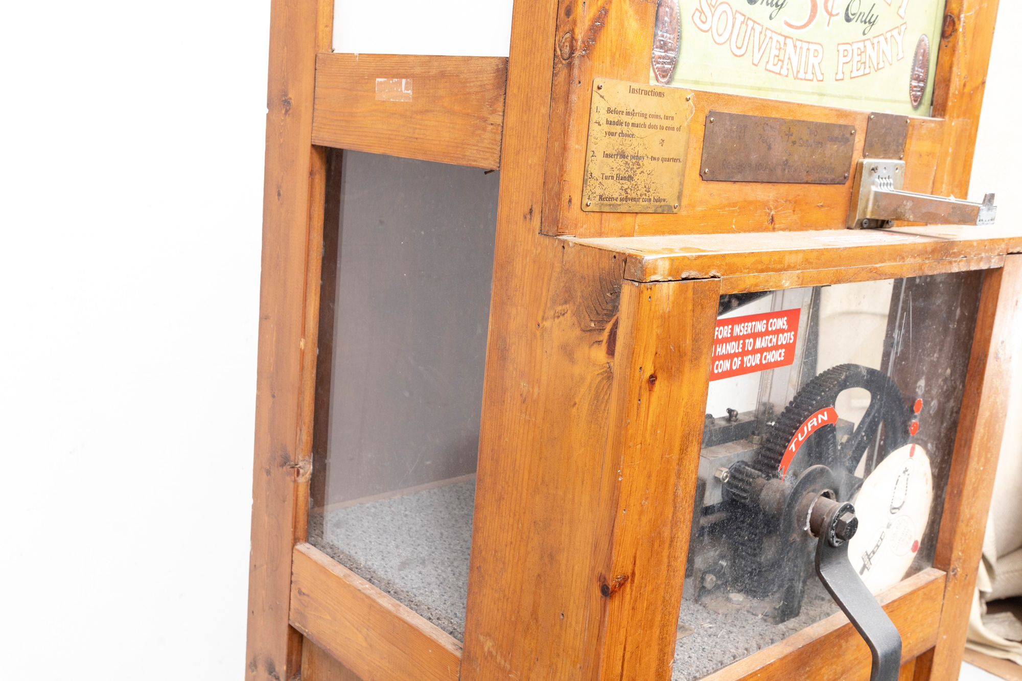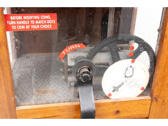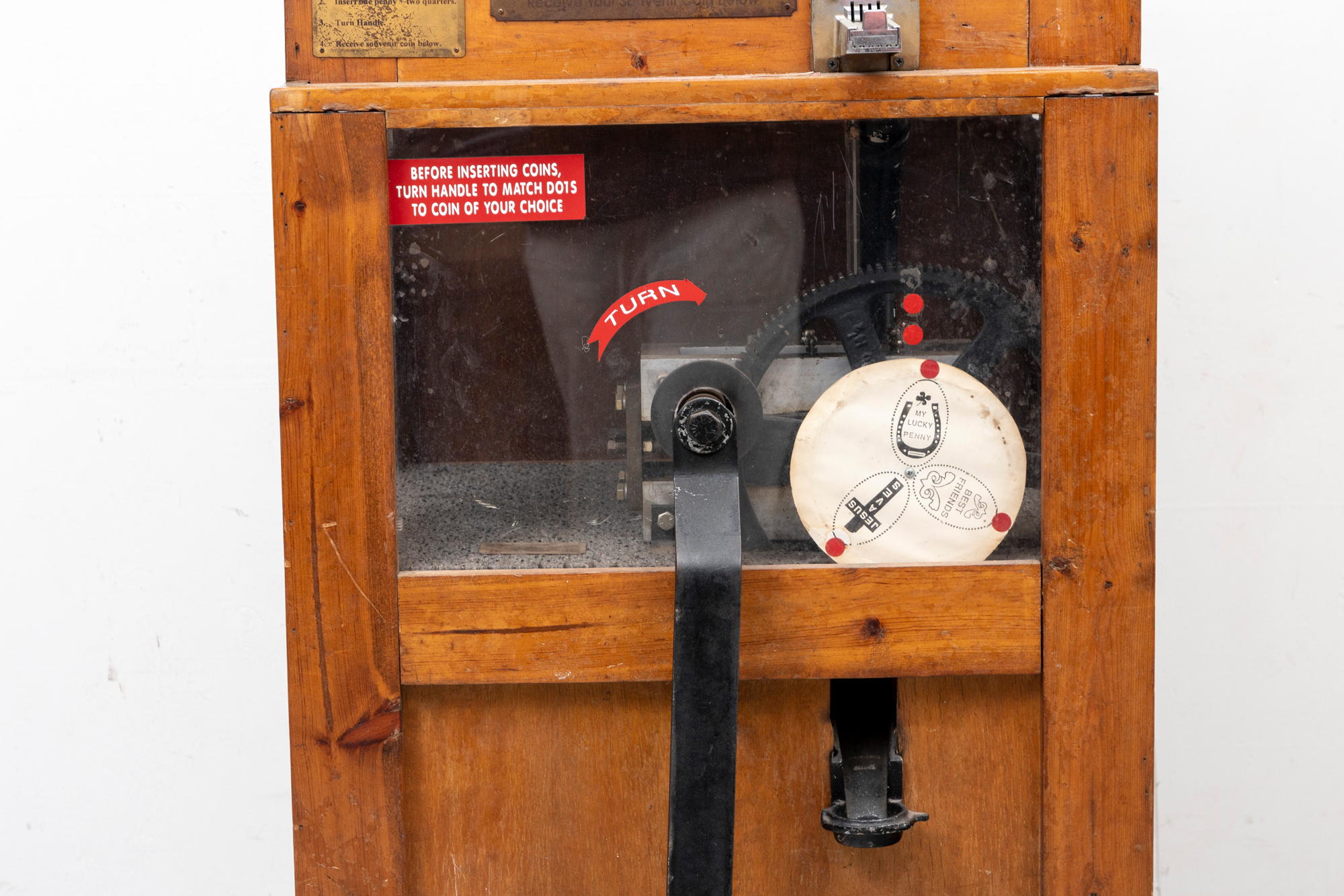 Maple cabinet with brass plaques and painted iron mechanism. Costing two quarters and a penny to play. Not tested for working condition.