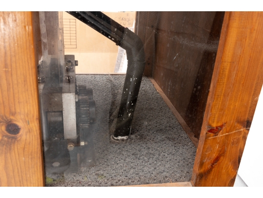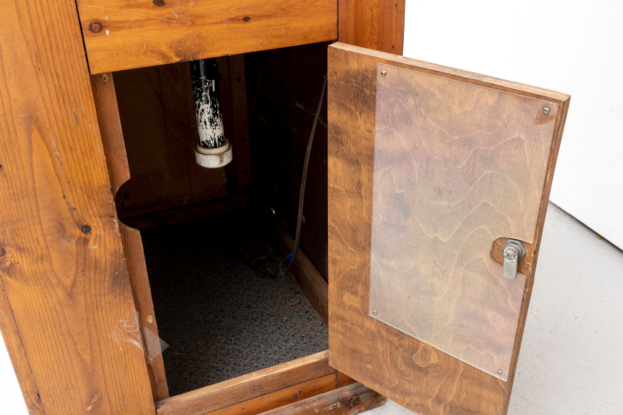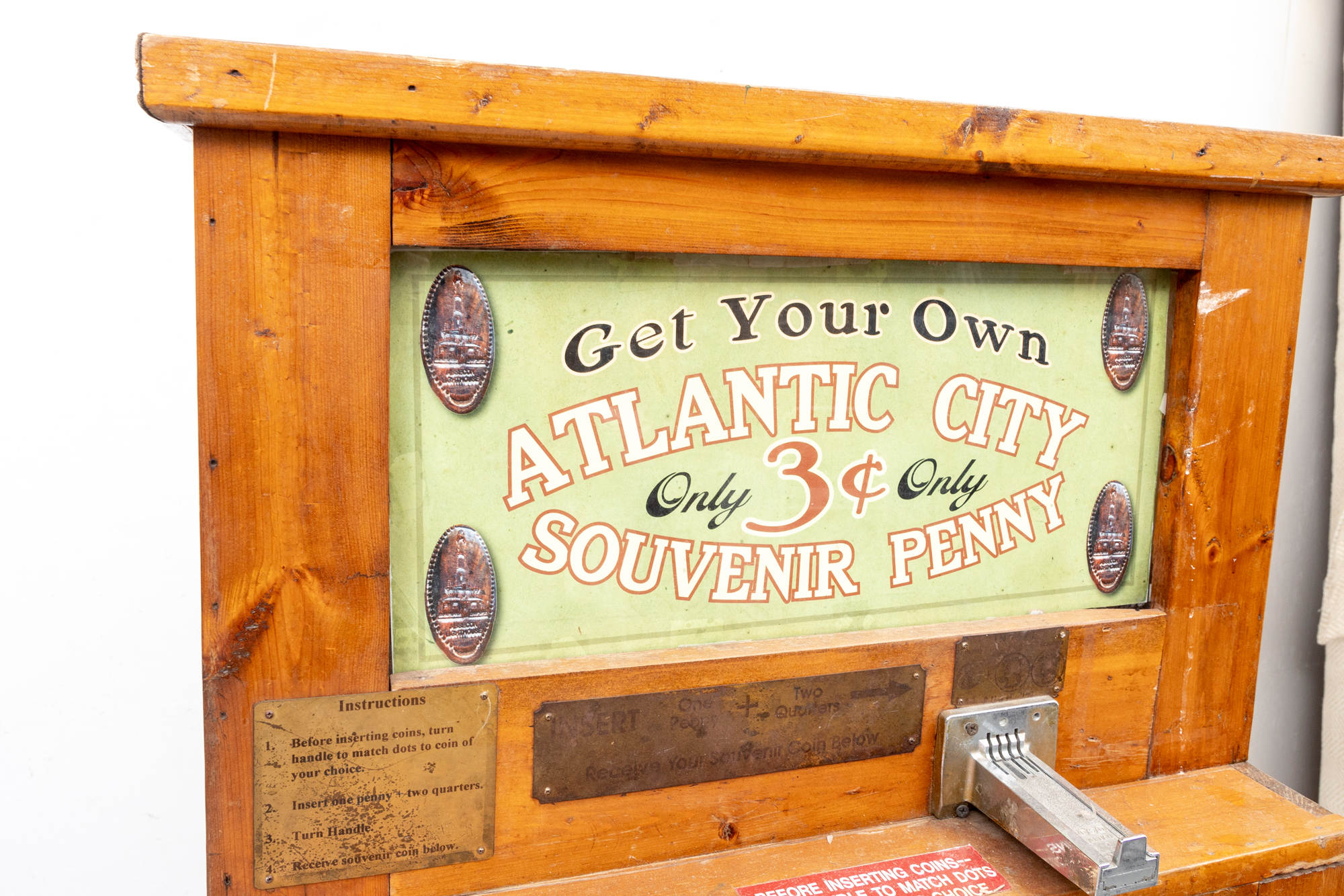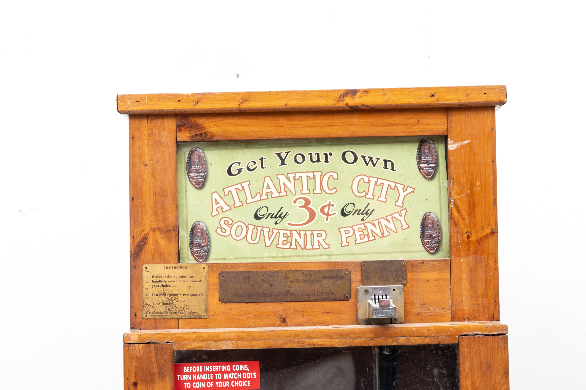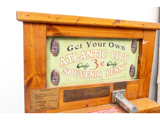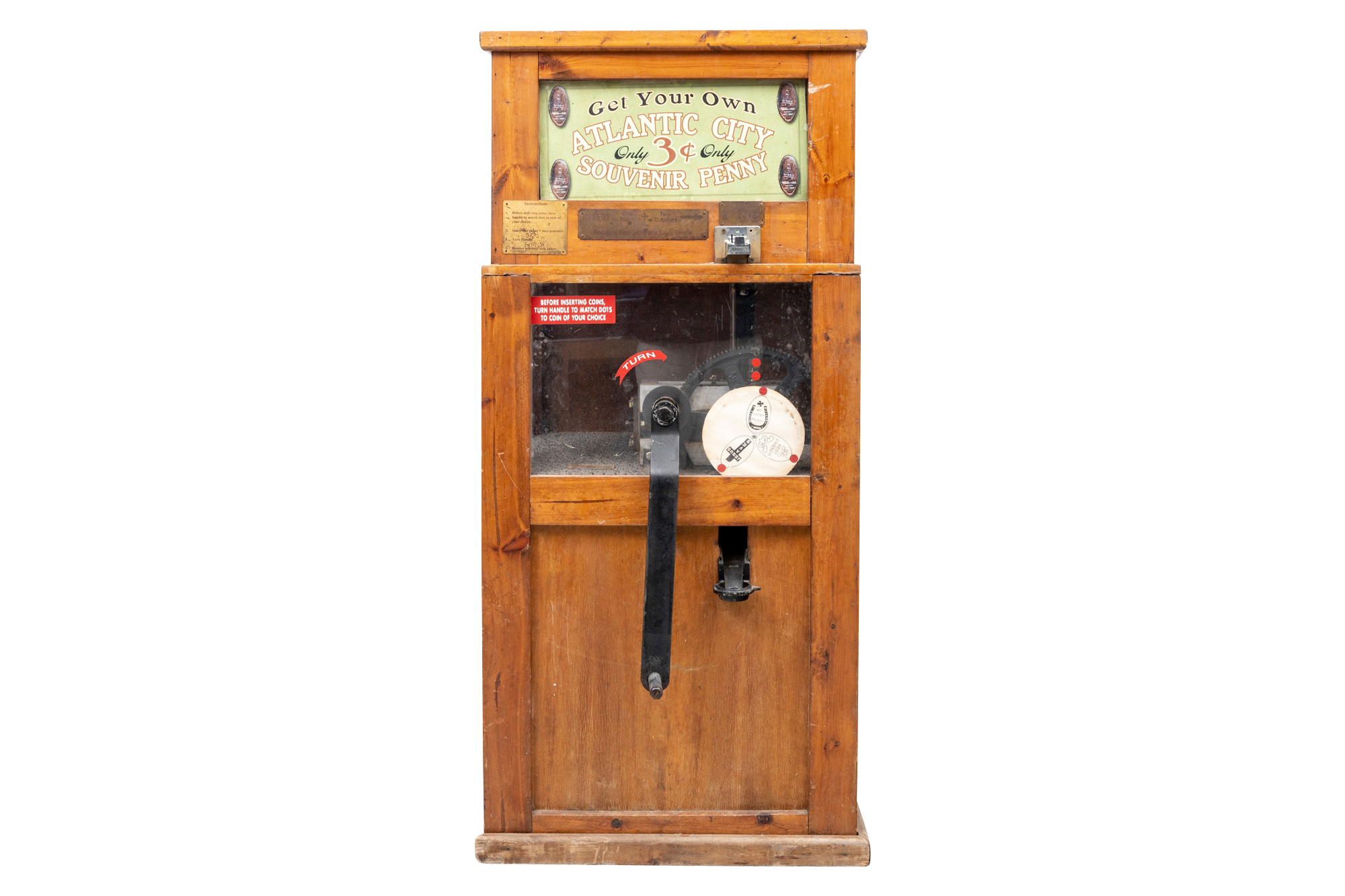 Maple cabinet with brass plaques and painted iron mechanism. Costing two quarters and a penny to play. Not tested for working condition.