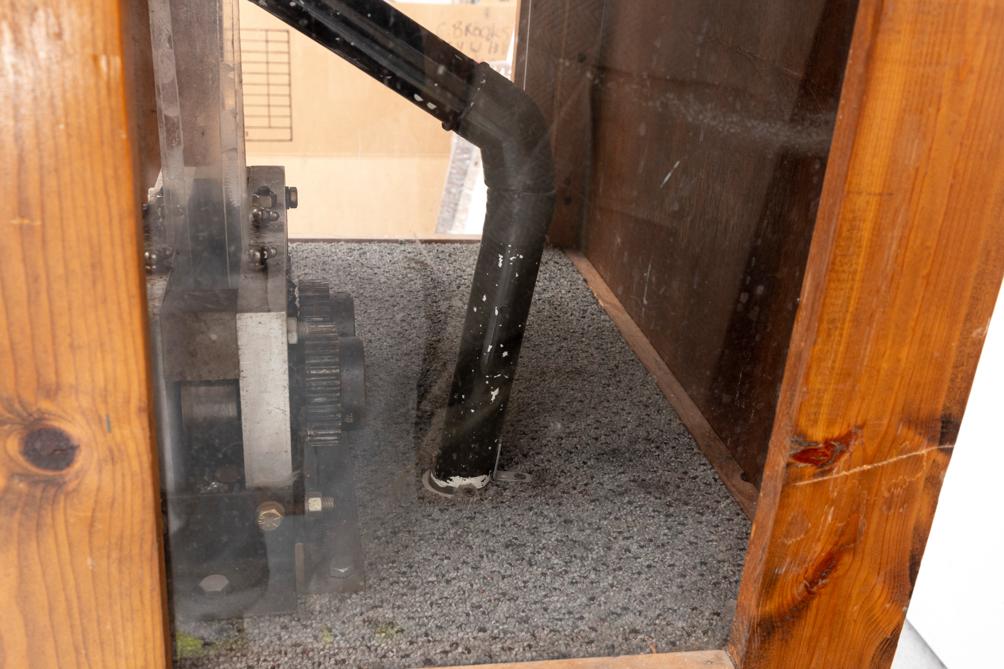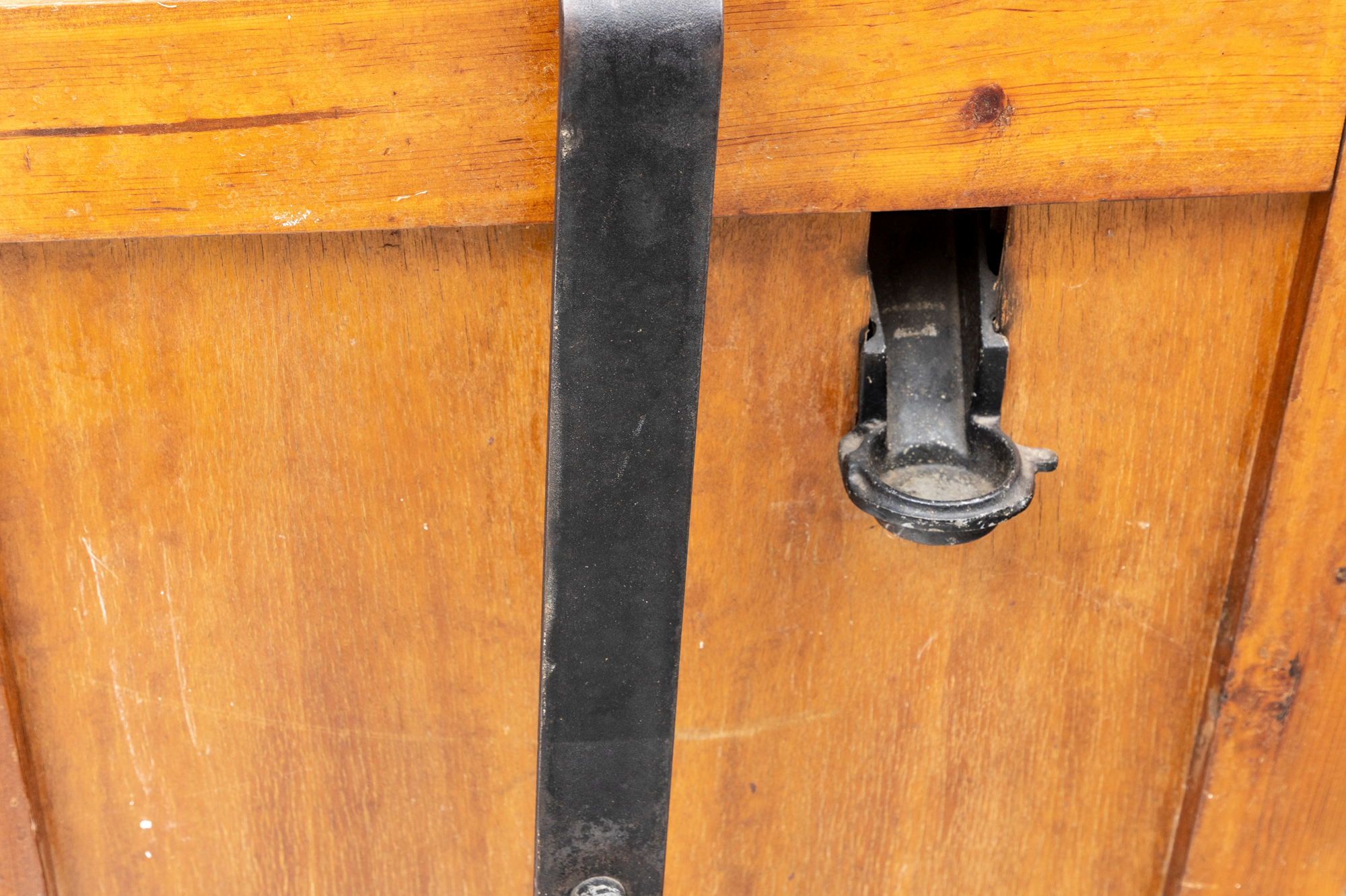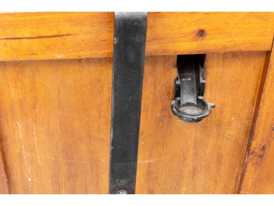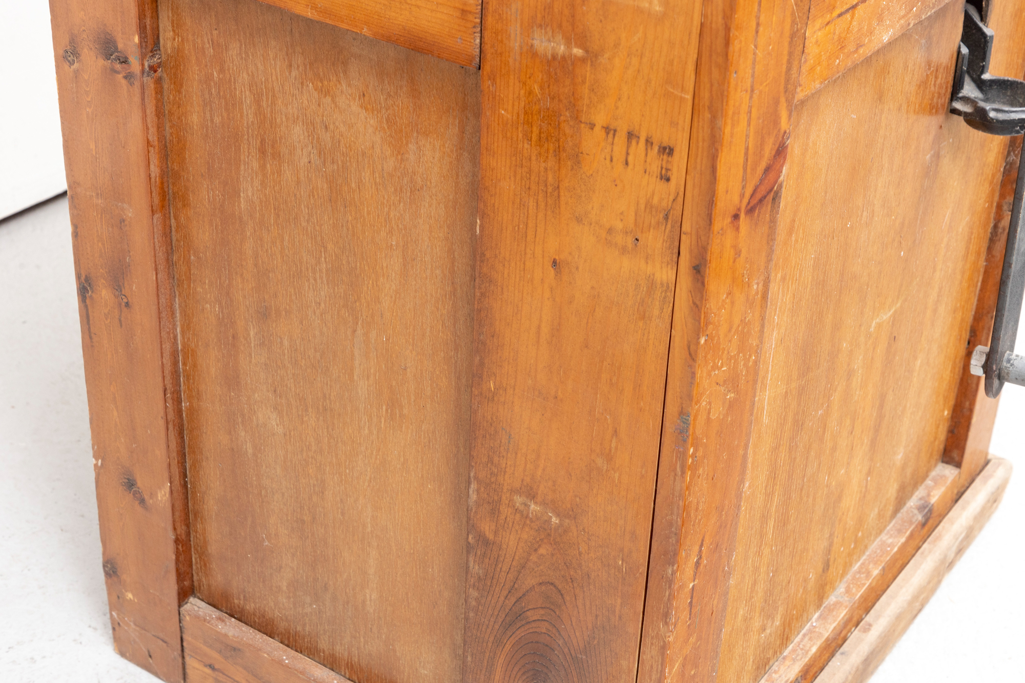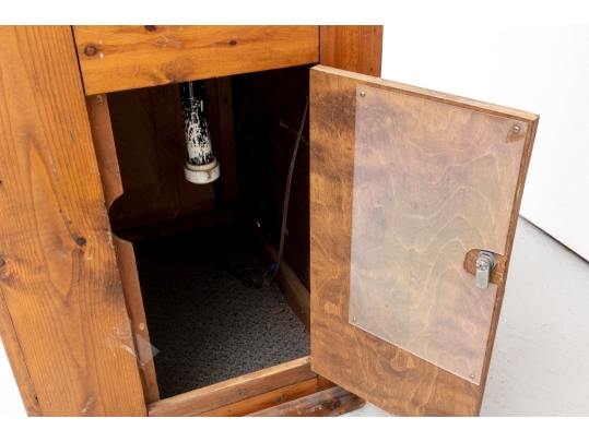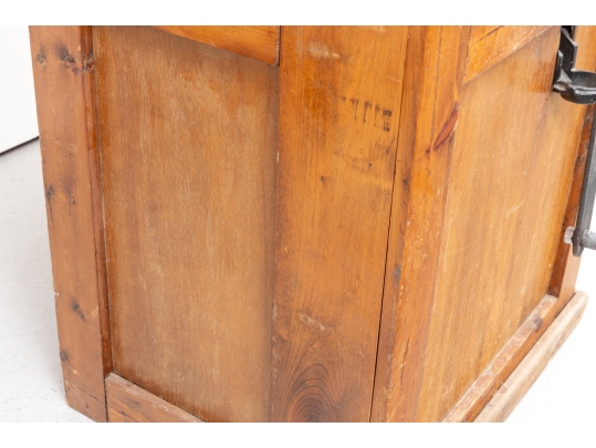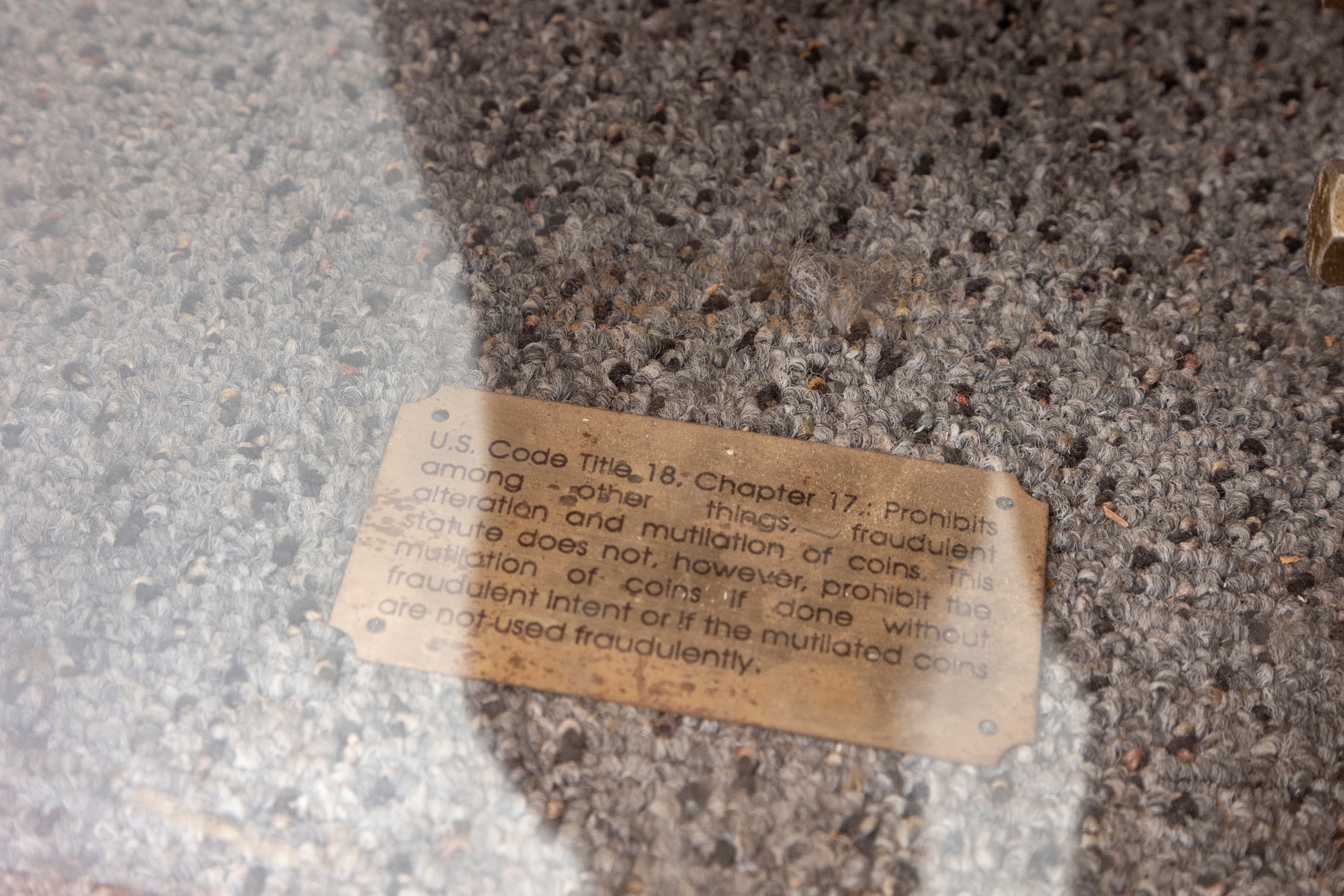 Maple cabinet with brass plaques and painted iron mechanism. Costing two quarters and a penny to play. Not tested for working condition.