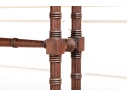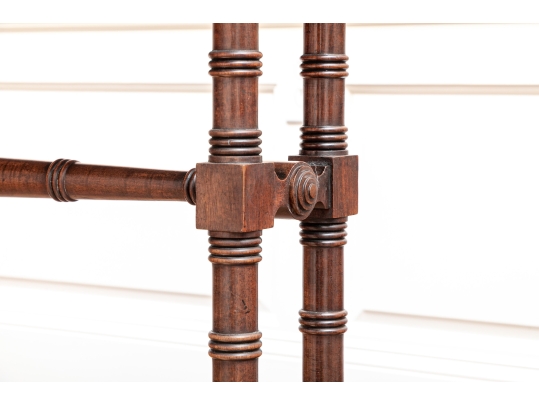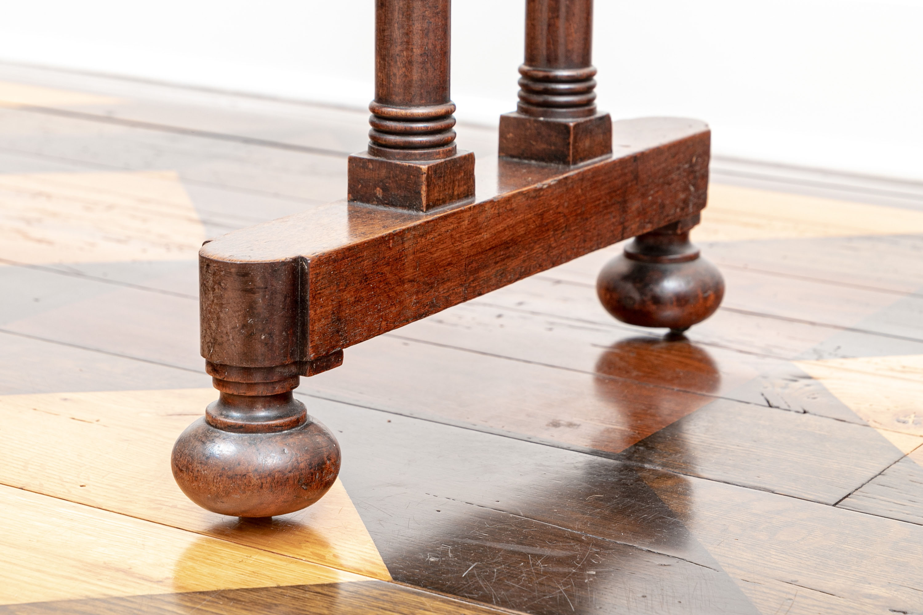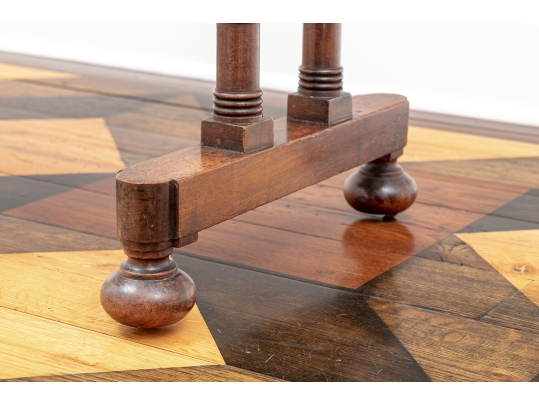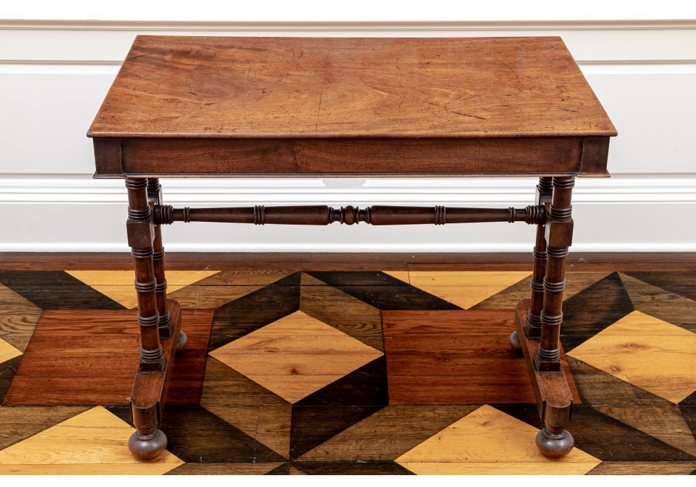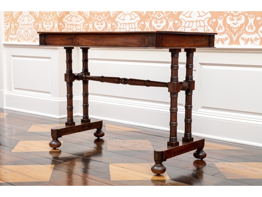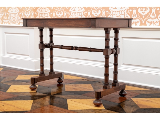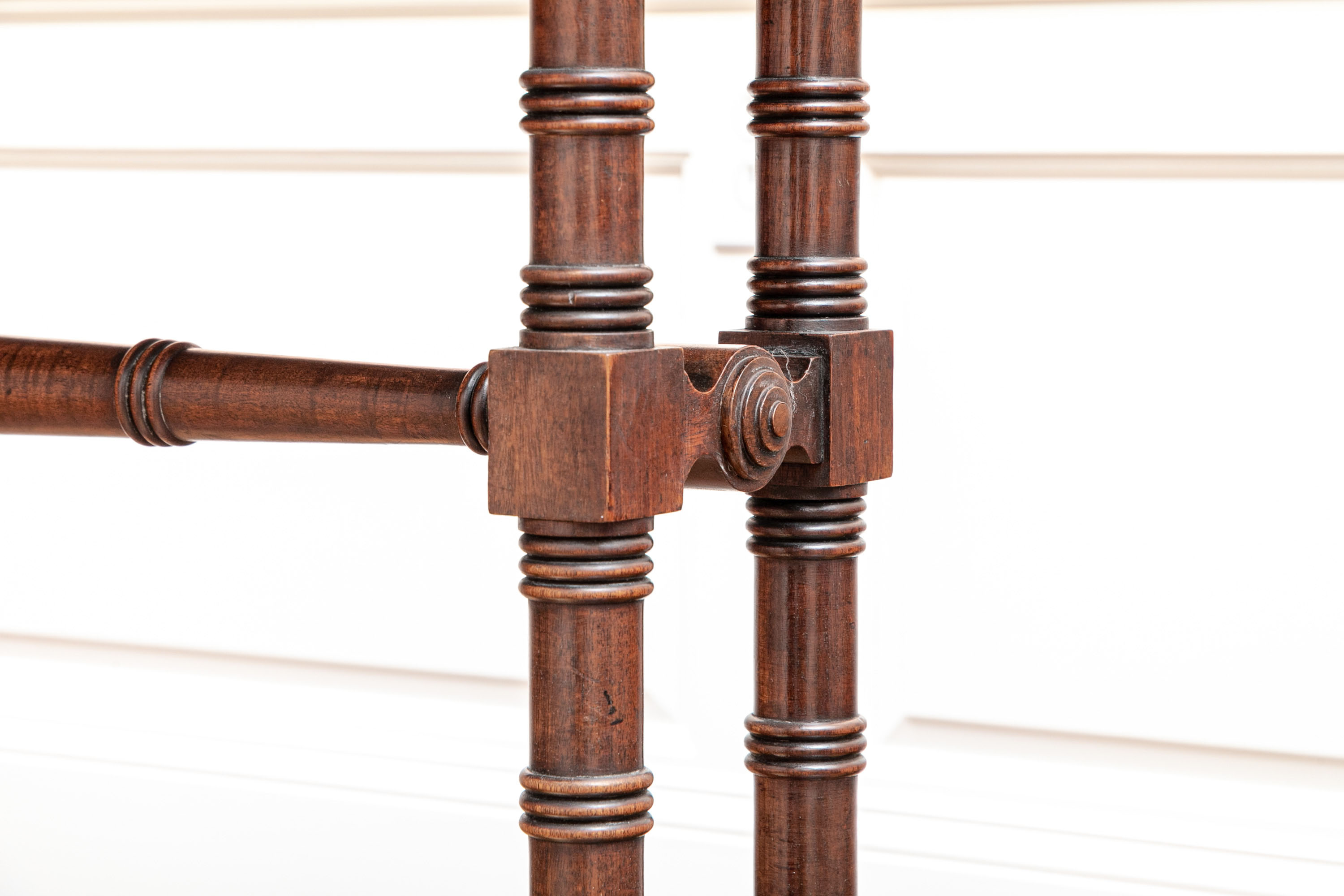 An antique console table with finely turned bamboo form legs, conjoined with an upper turned stretcher, paneled frieze and resting on trestle form legs with bun feet.