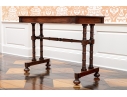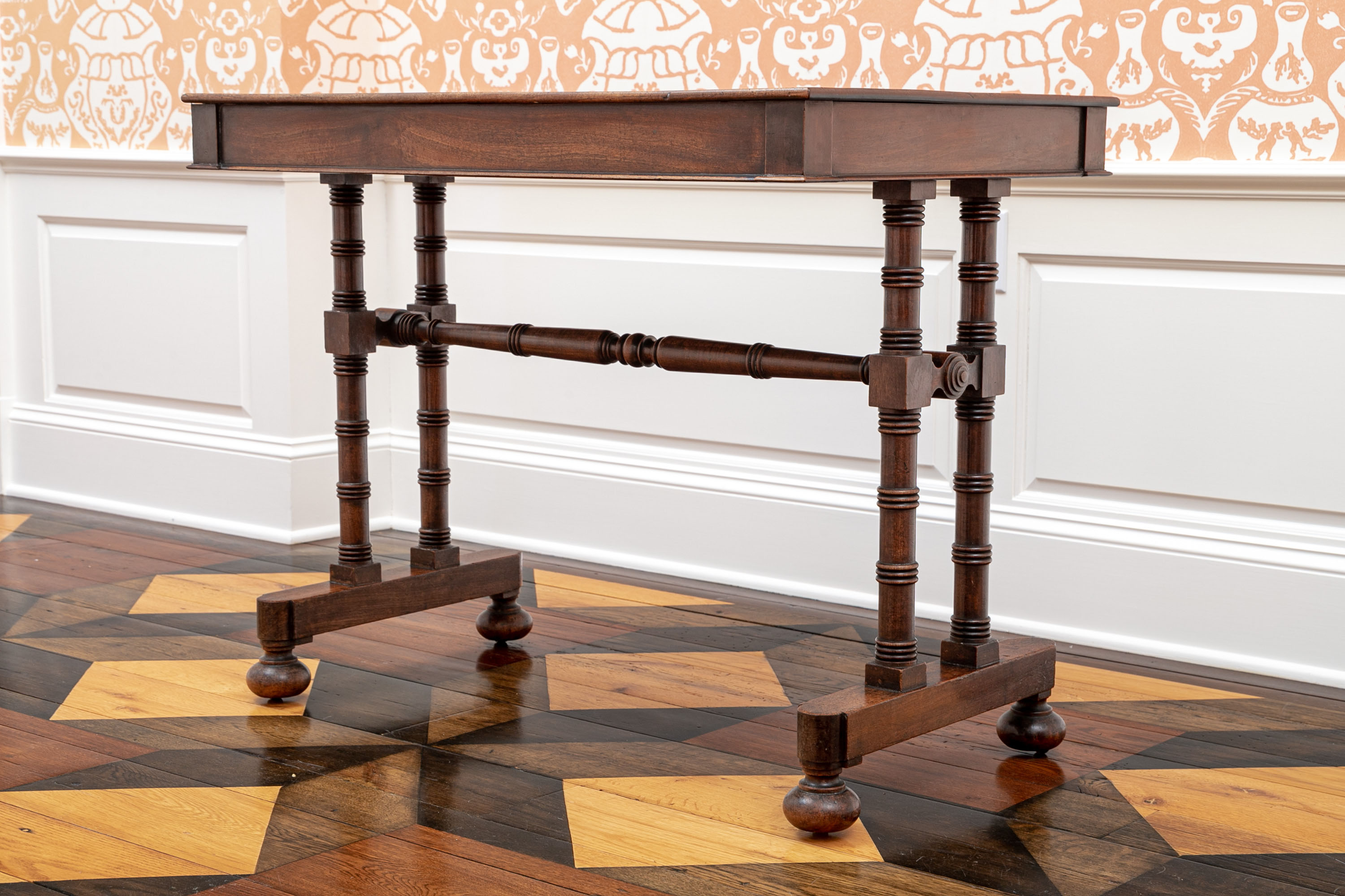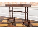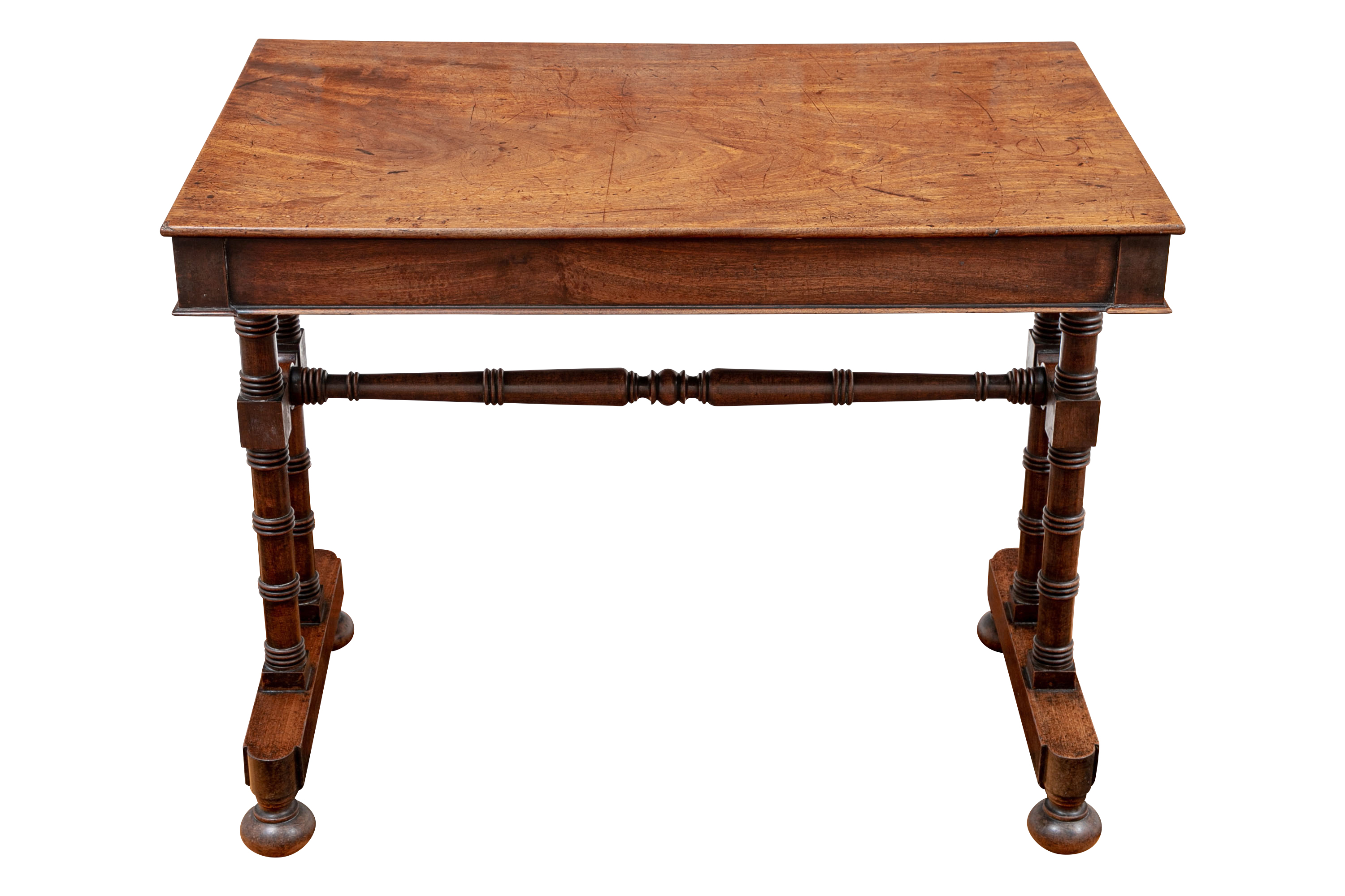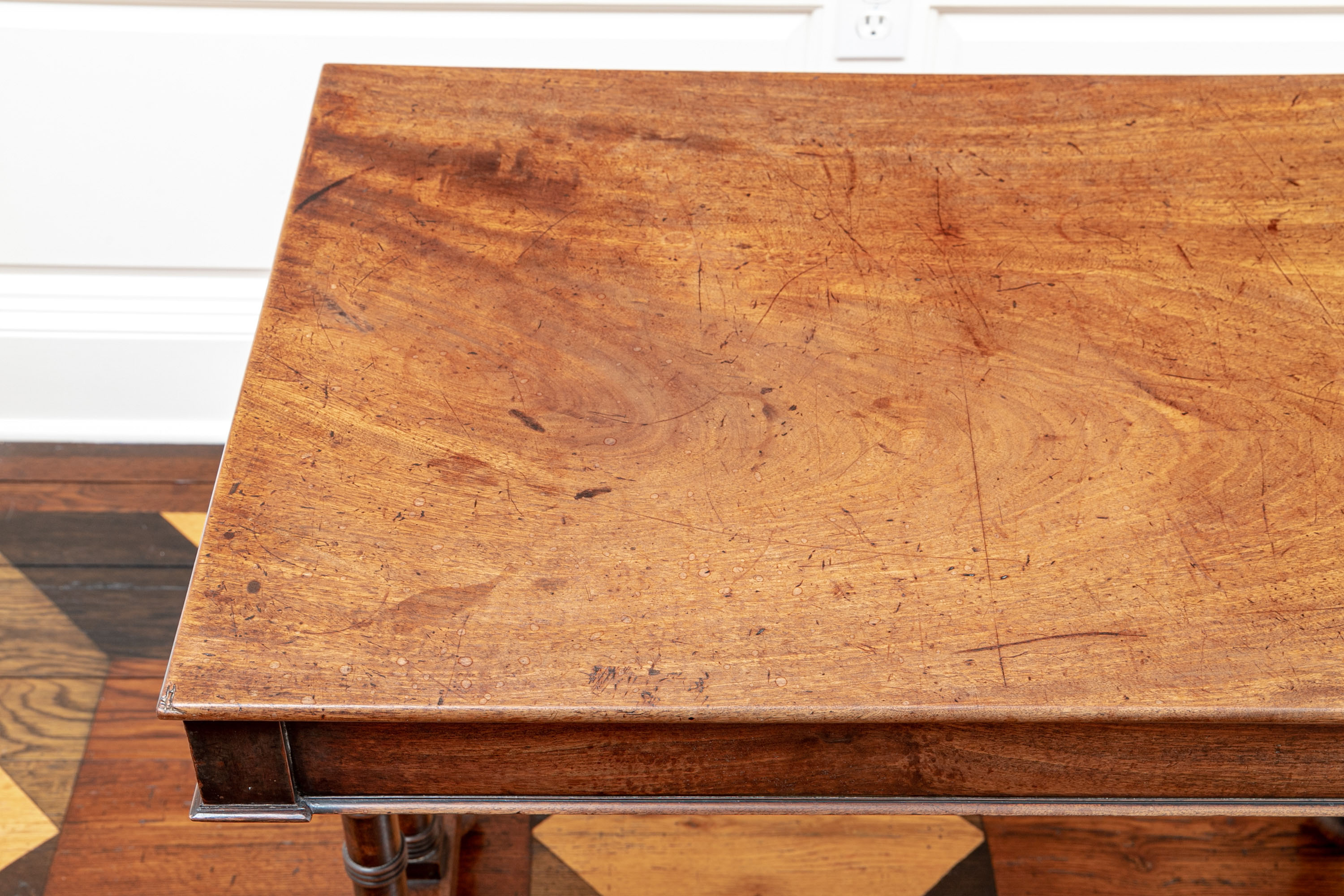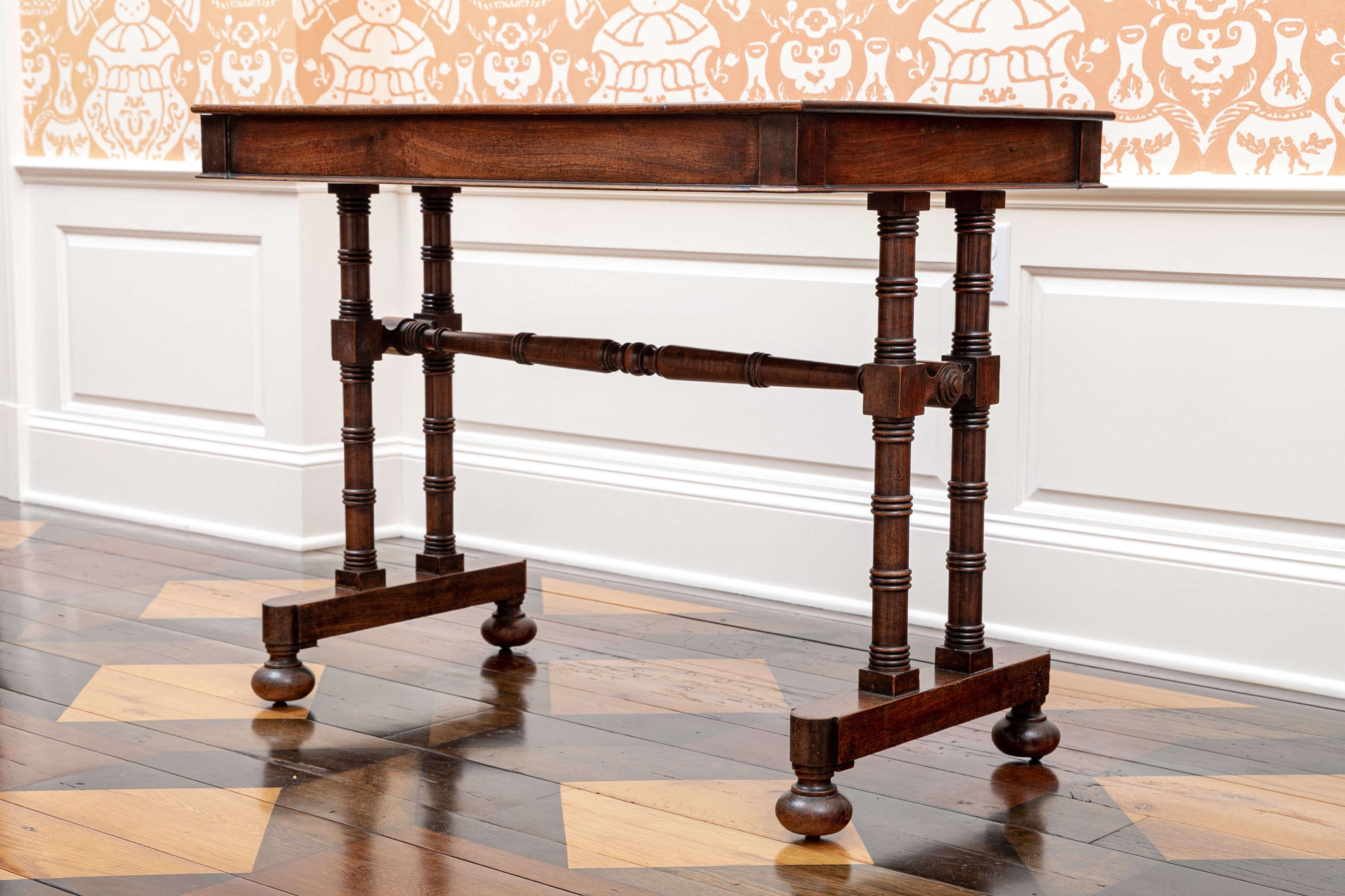 An antique console table with finely turned bamboo form legs, conjoined with an upper turned stretcher, paneled frieze and resting on trestle form legs with bun feet.